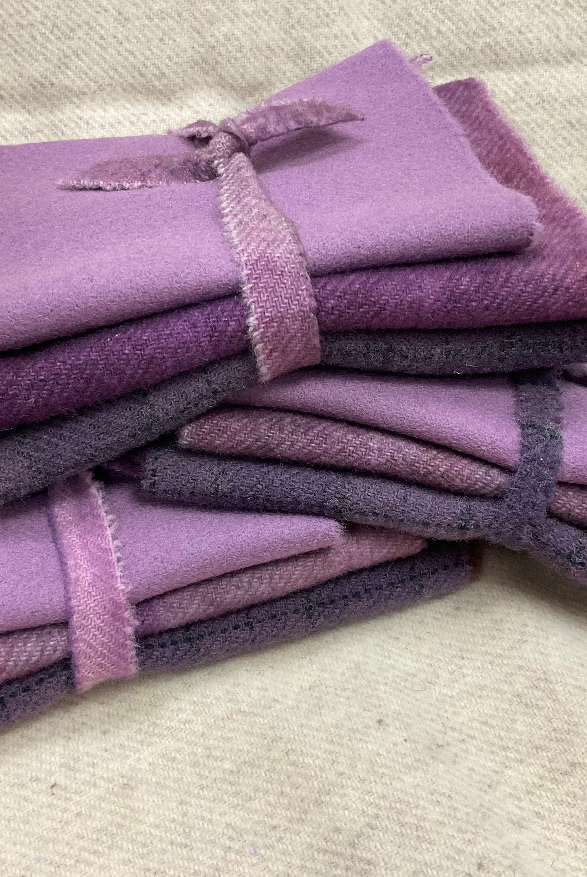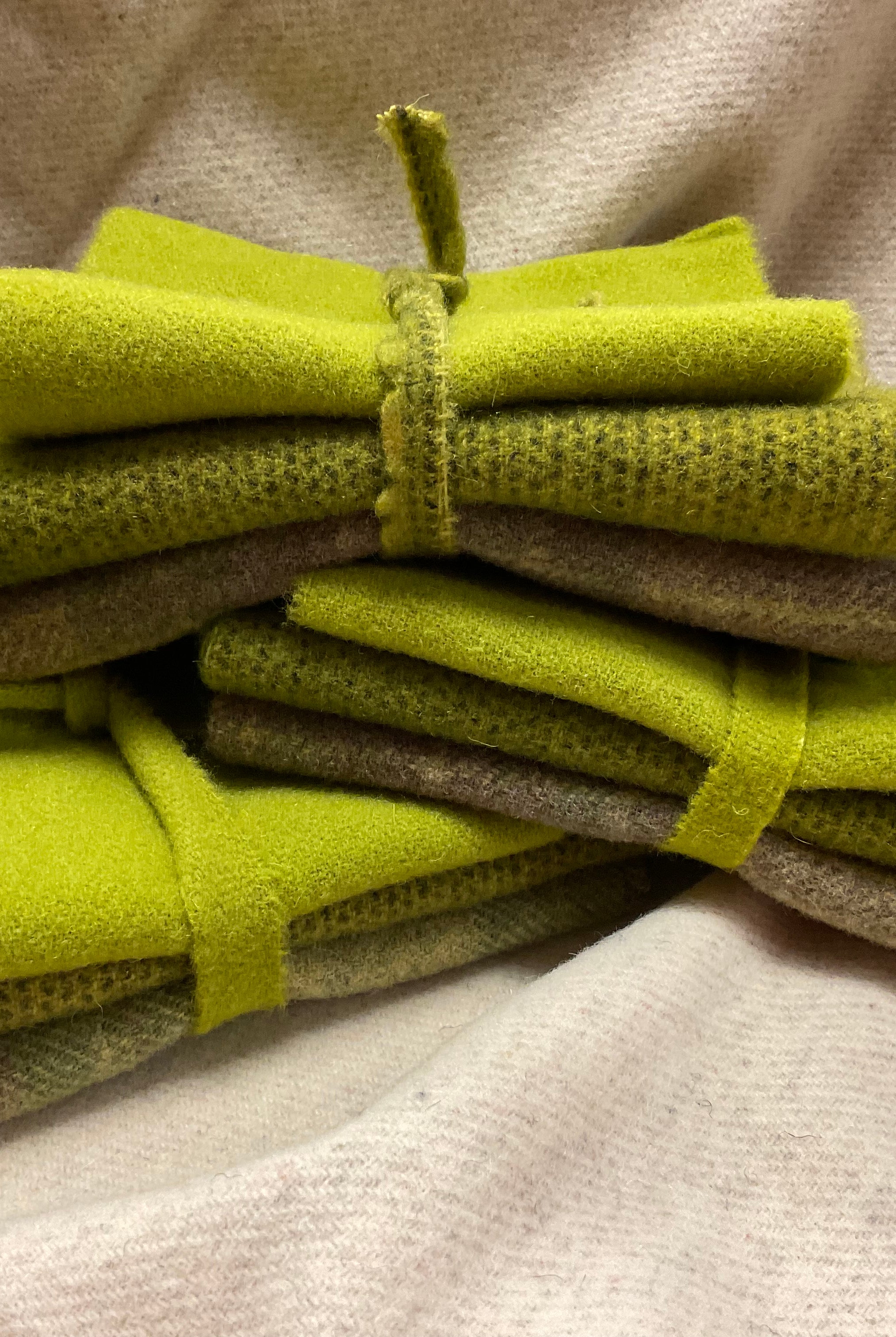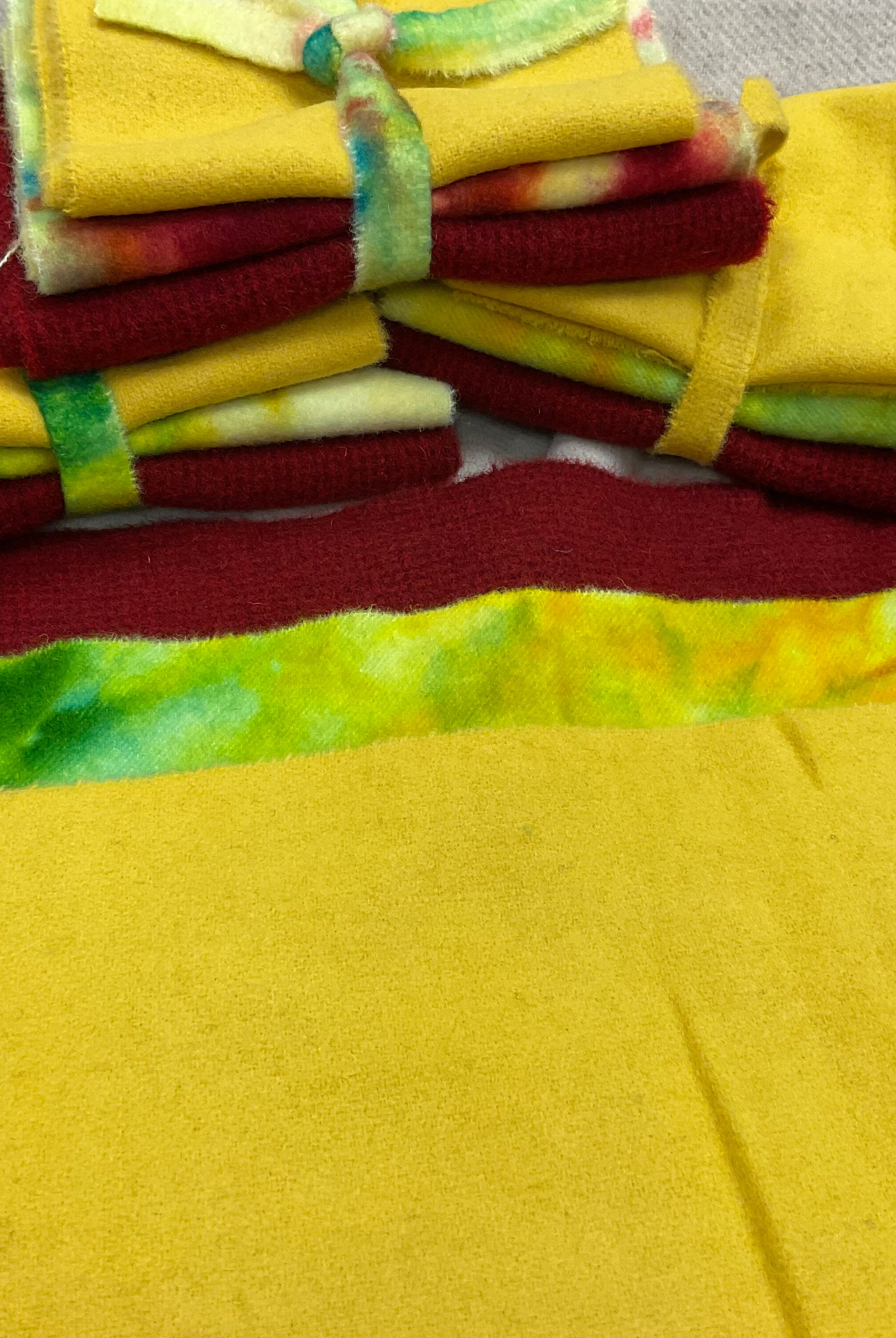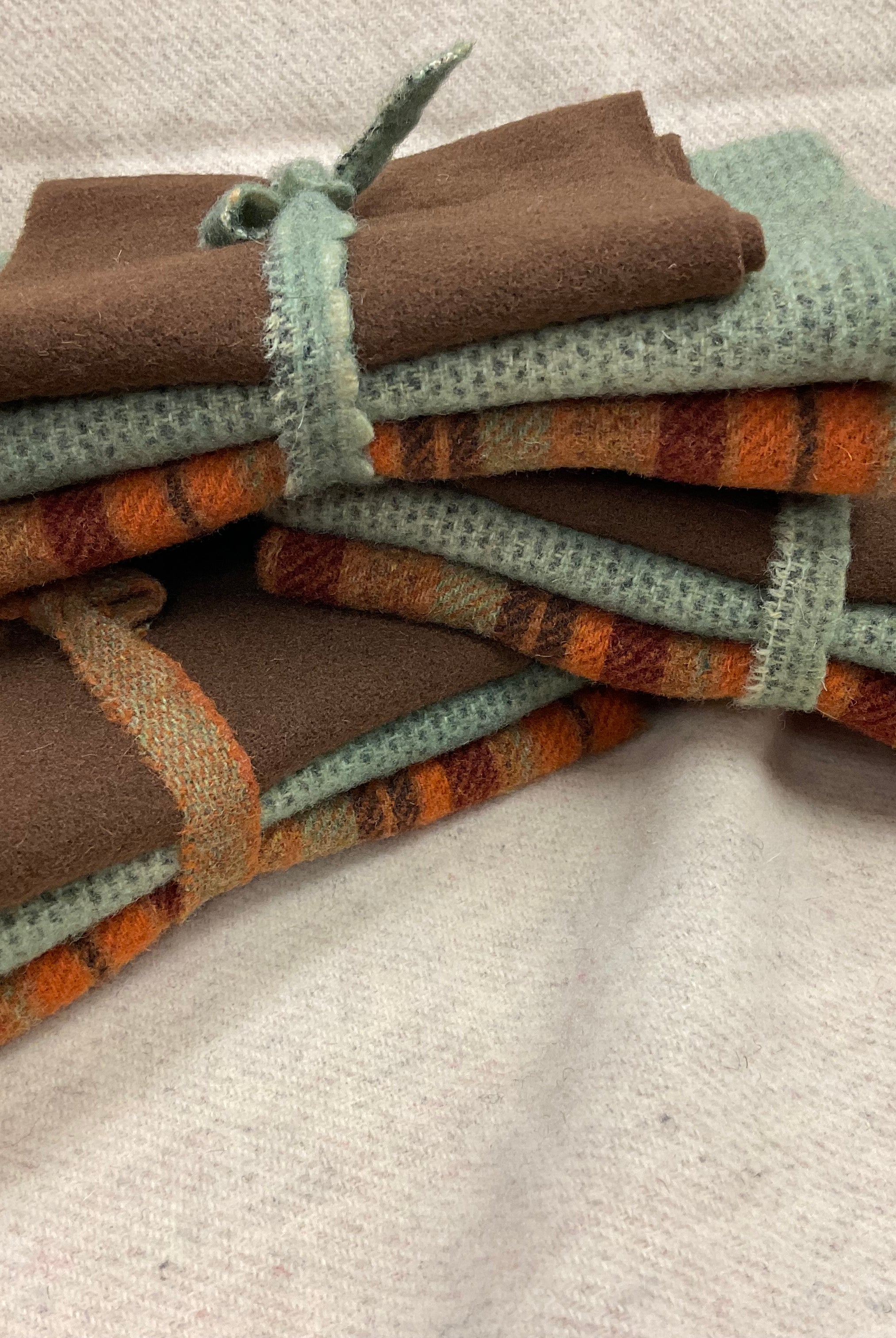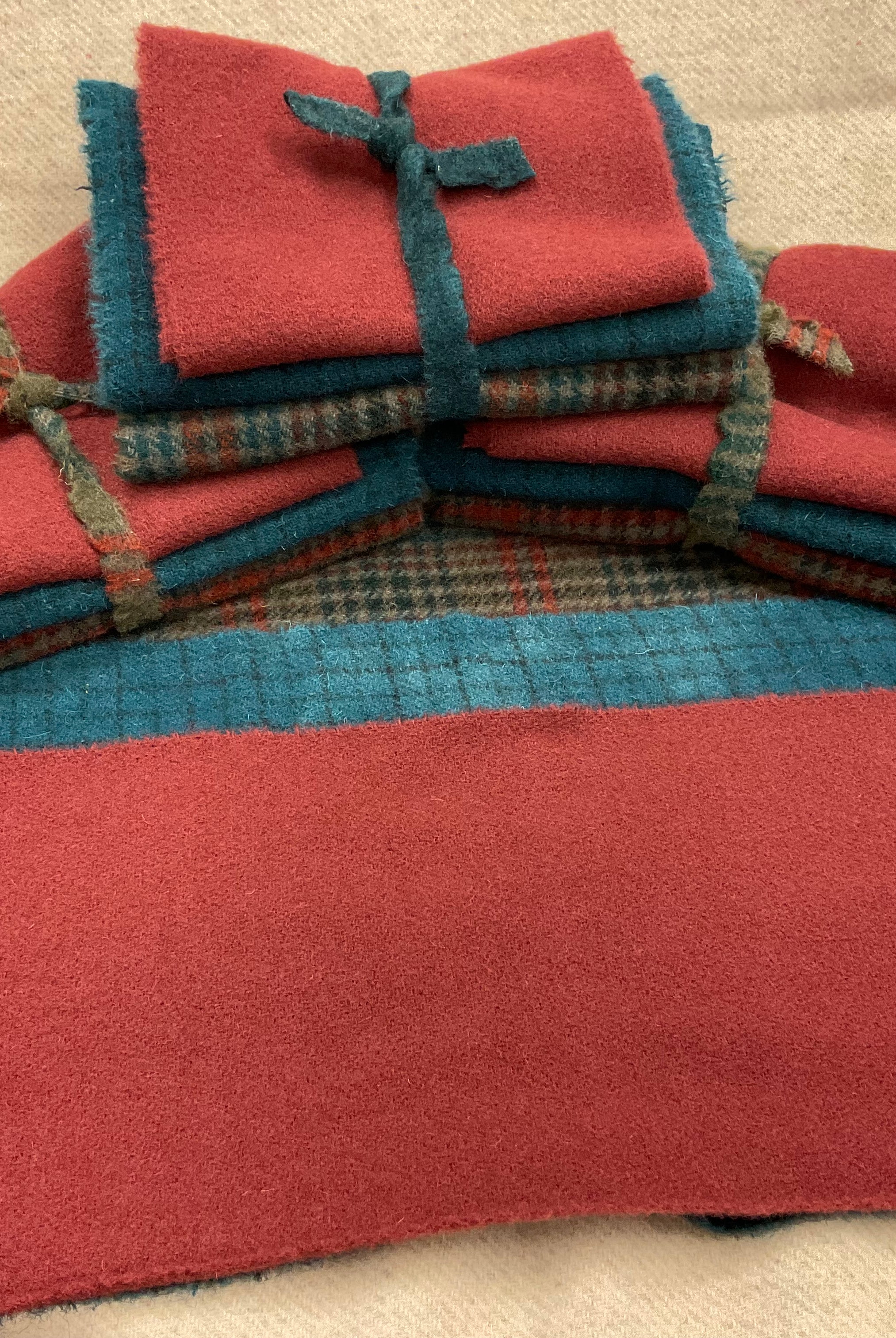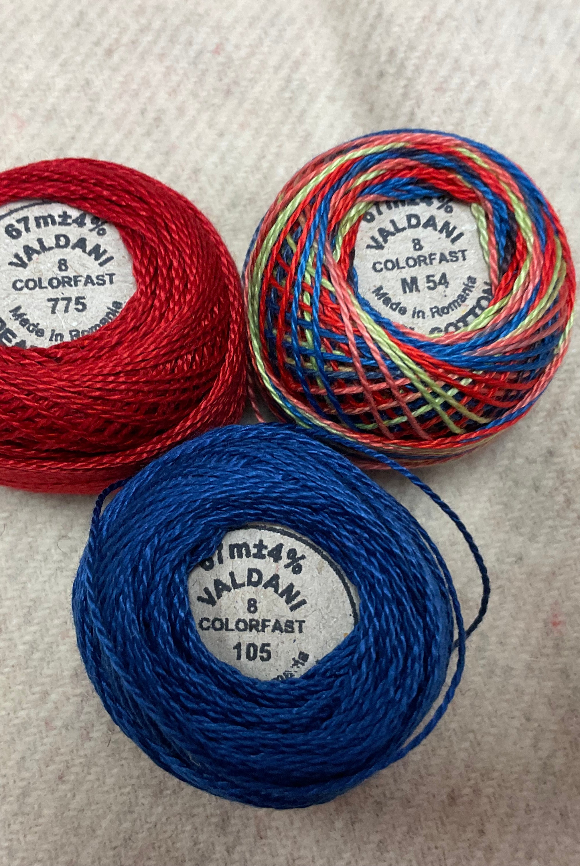 These fun bundles are all washed and ready to work with, they are a fat 1/16 of a washed as is wool 7.5x17, an over dyed wool roughly 7.5x17 and a solid 5.5x17 from the Rebekah Smith wools. We have picked 3 coordinating Vadani threads in #8 to go with your stitching if you like. Threads will be chosen to coordinate with the wools in the bundles.
