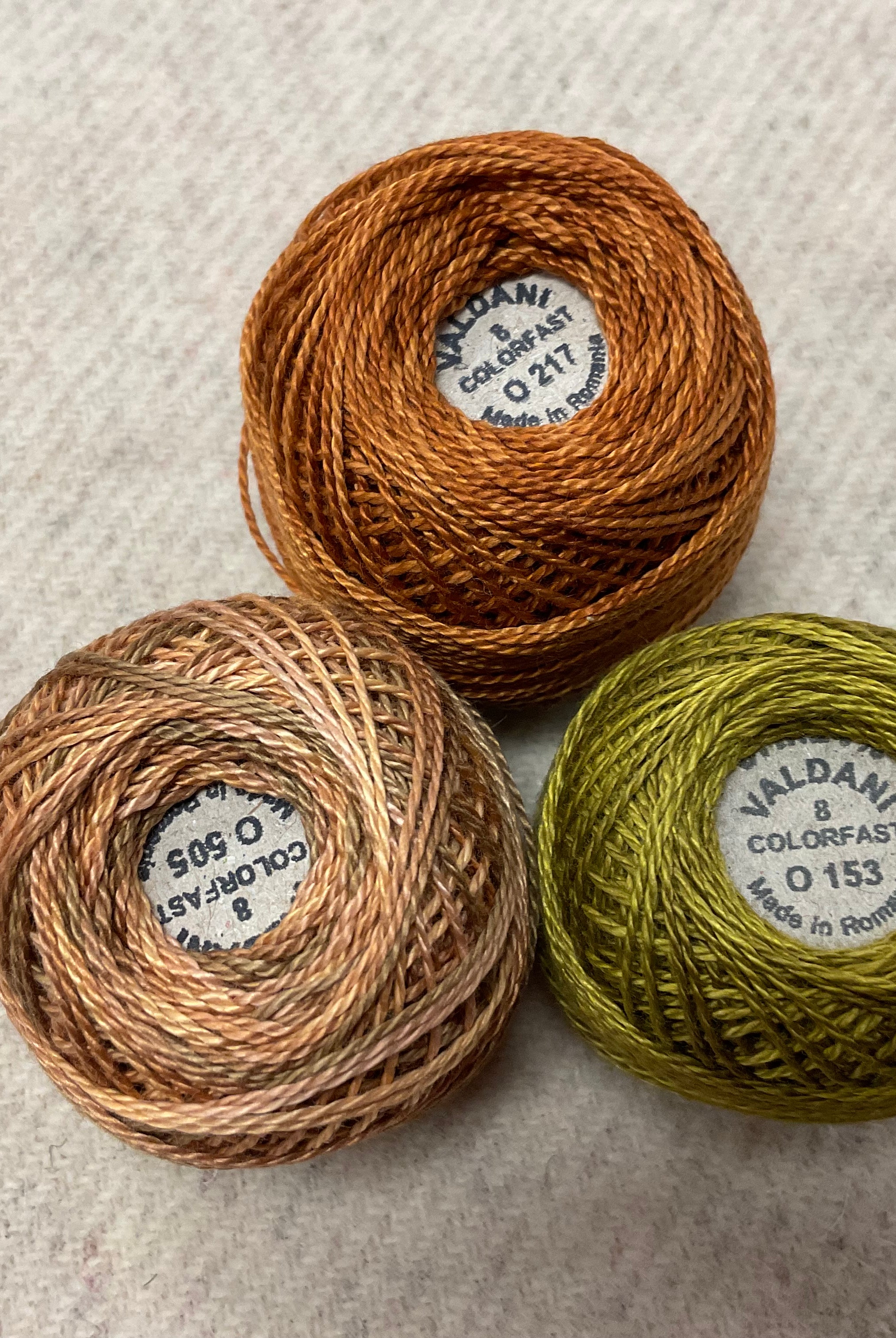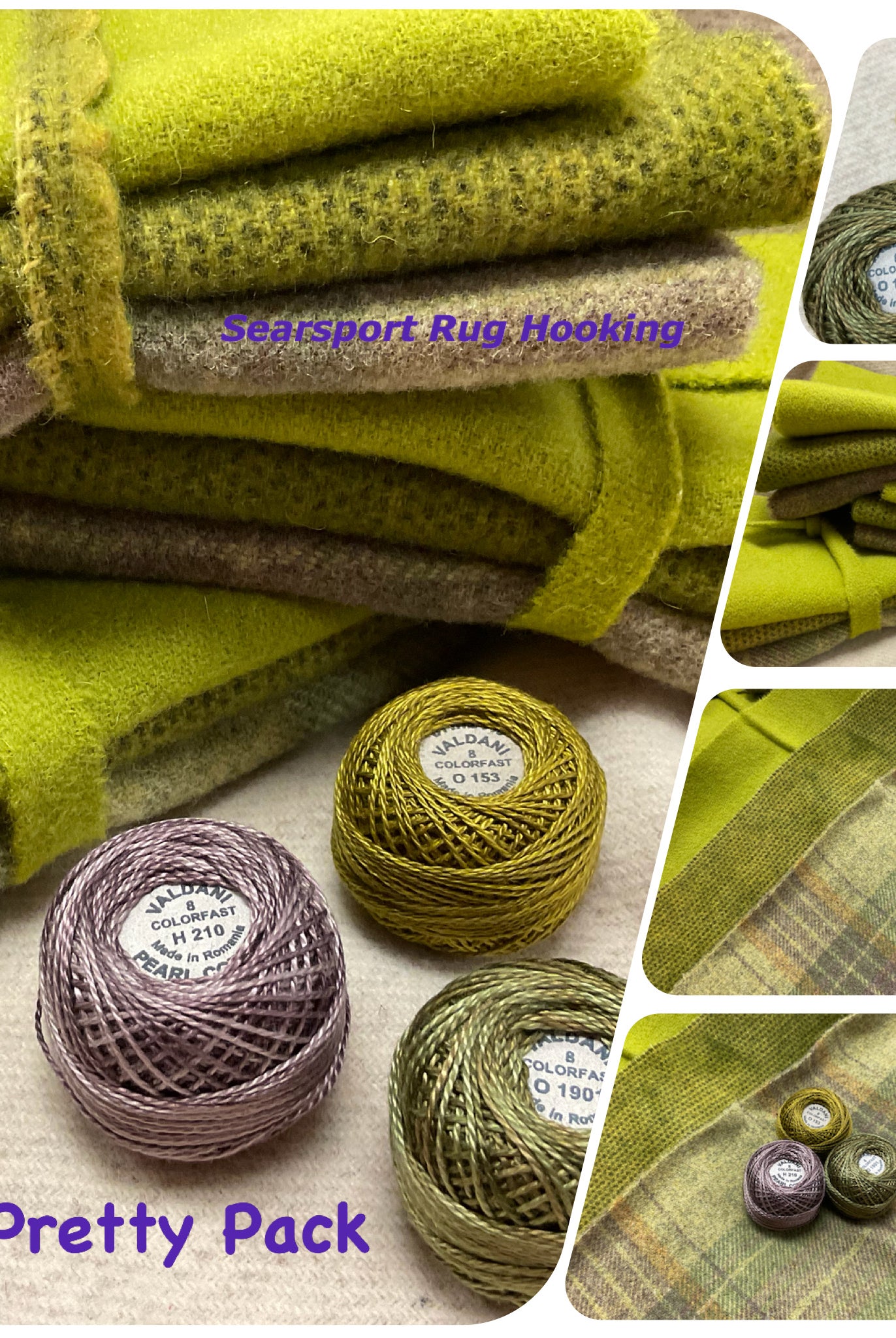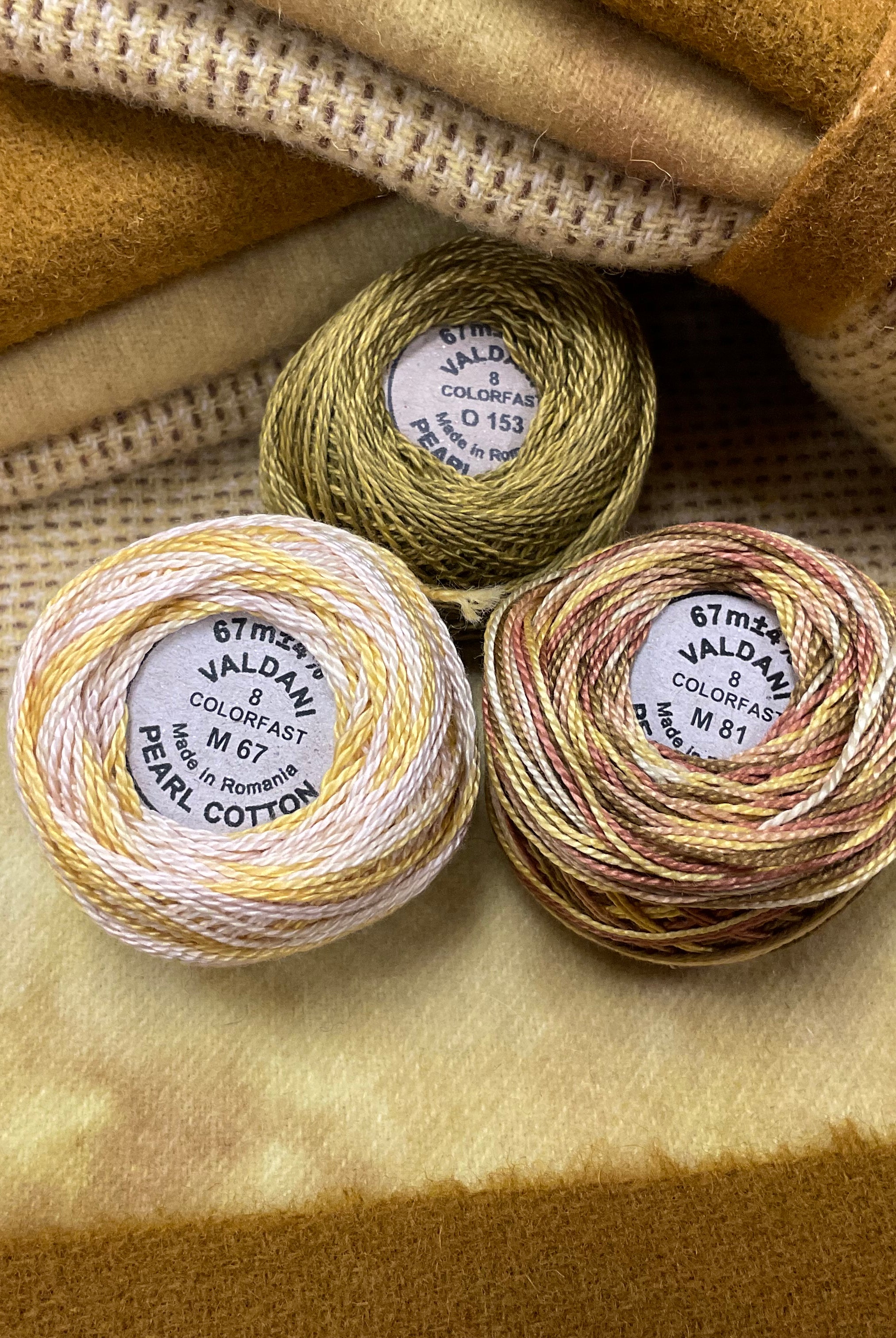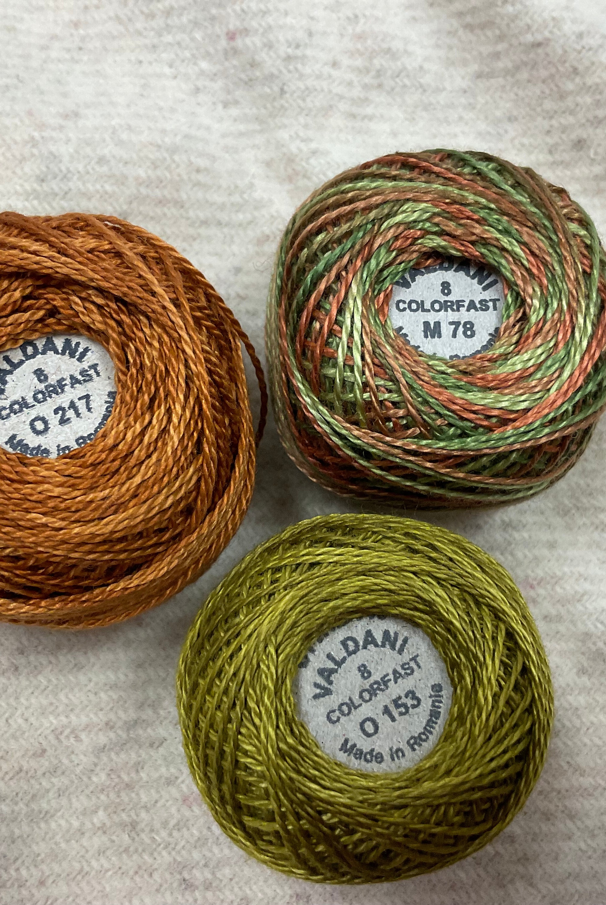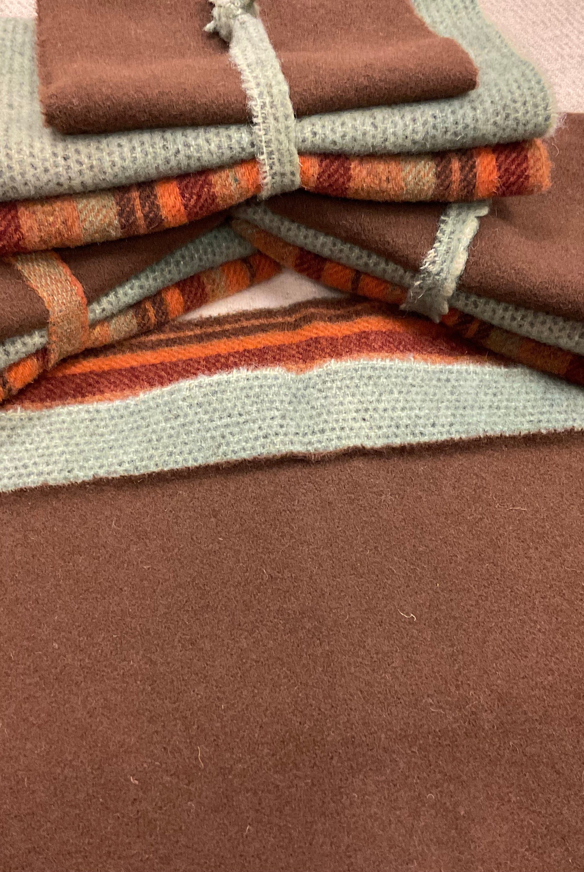 These fun bundles are all washed and ready to work with, they are a fat 1/16 of a washed as is wool 7.5x17, an over dyed wool roughly 7.5x17 and a solid 5.5x17 from the Rebekah Smith wools. We have picked 3 coordinating Vadani threads in #8 to go with your stitching if you like. Threads will be chosen to coordinate with the wools in the bundles.