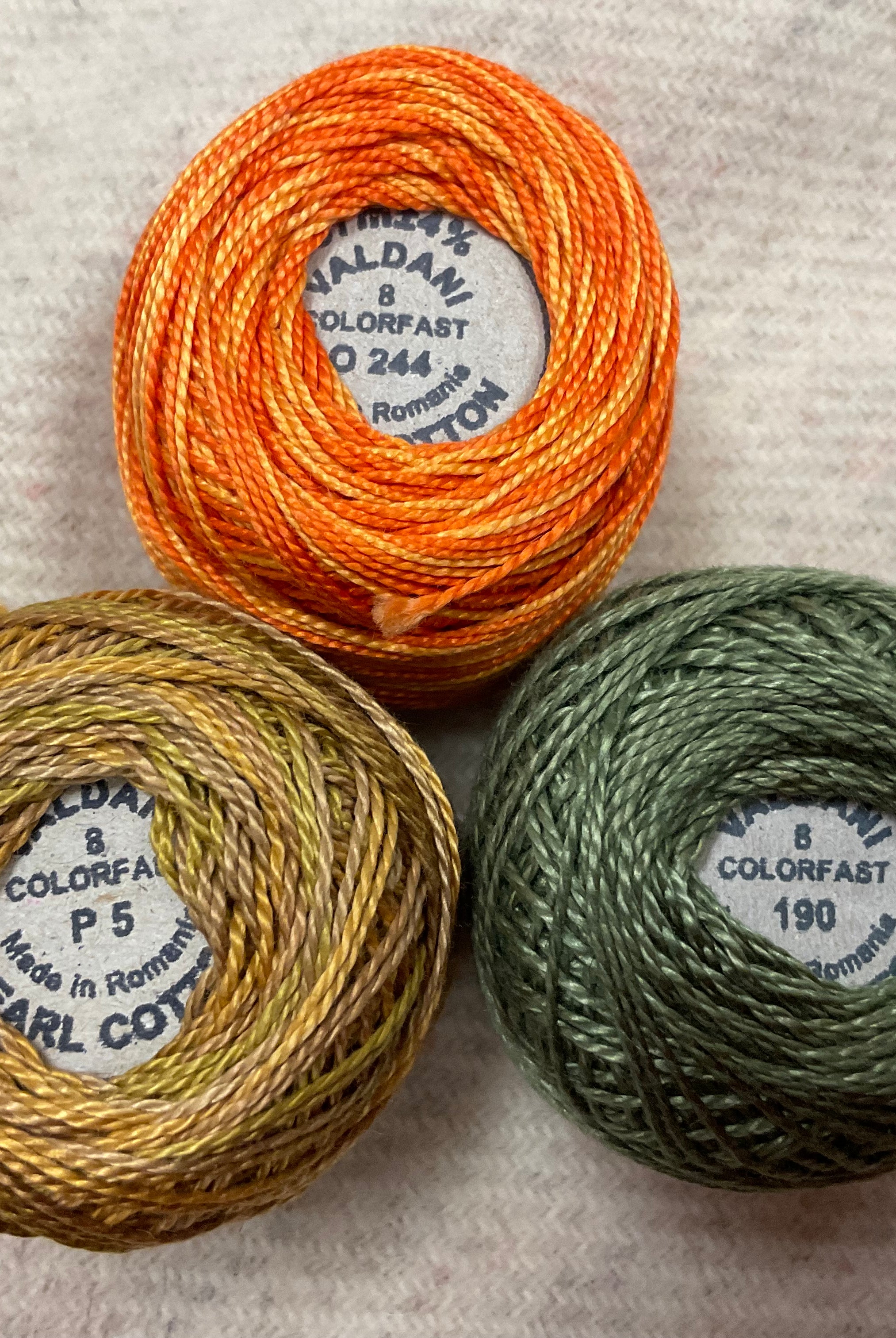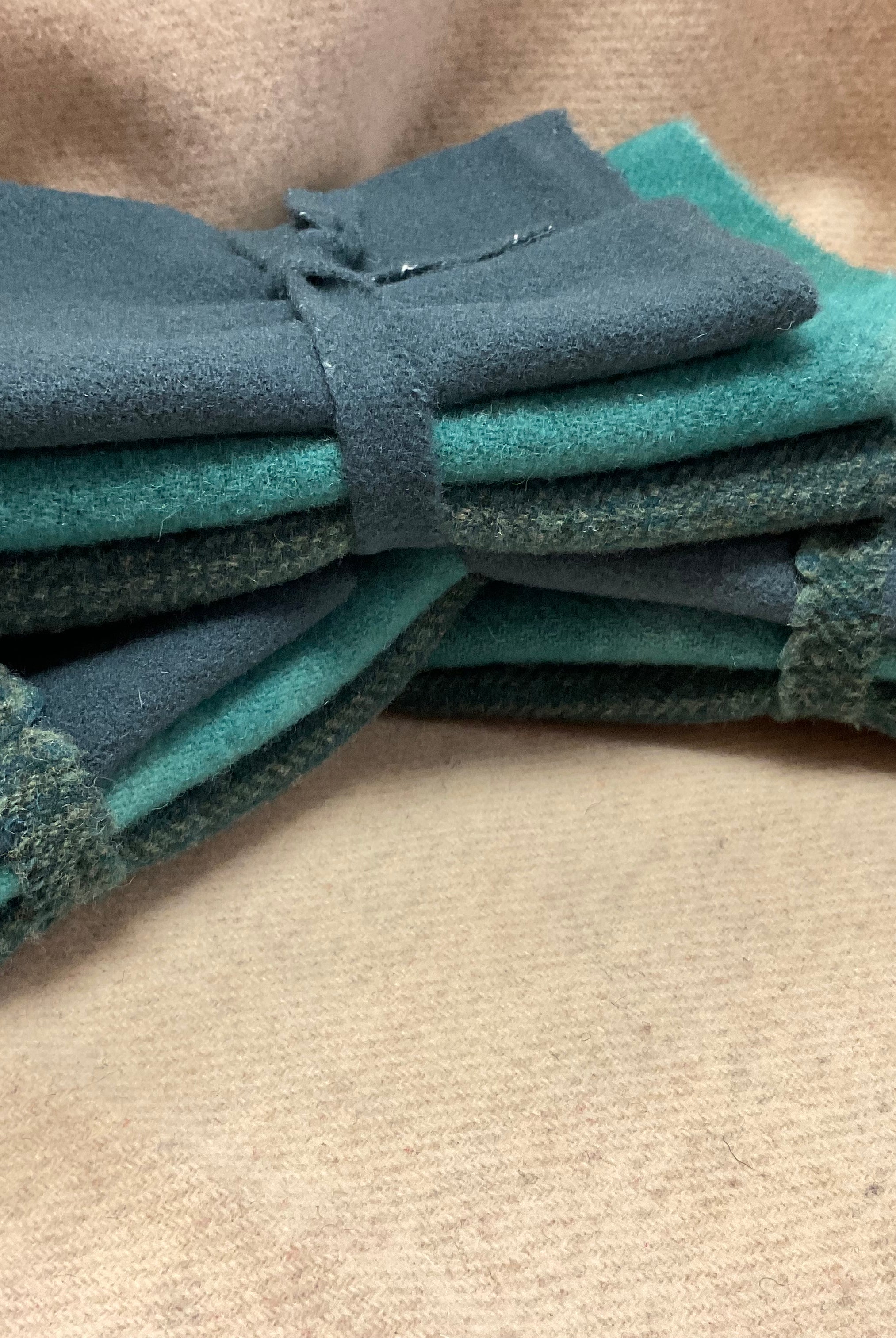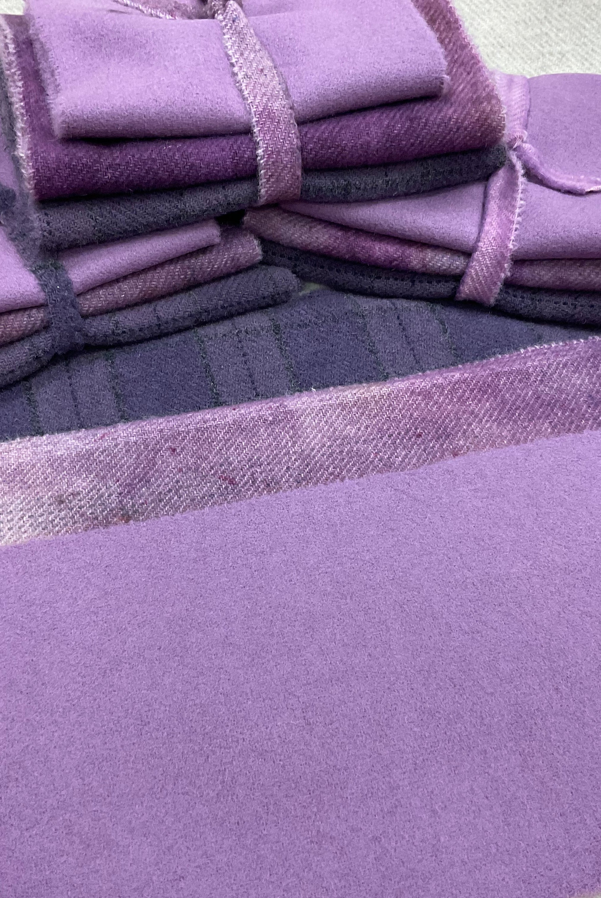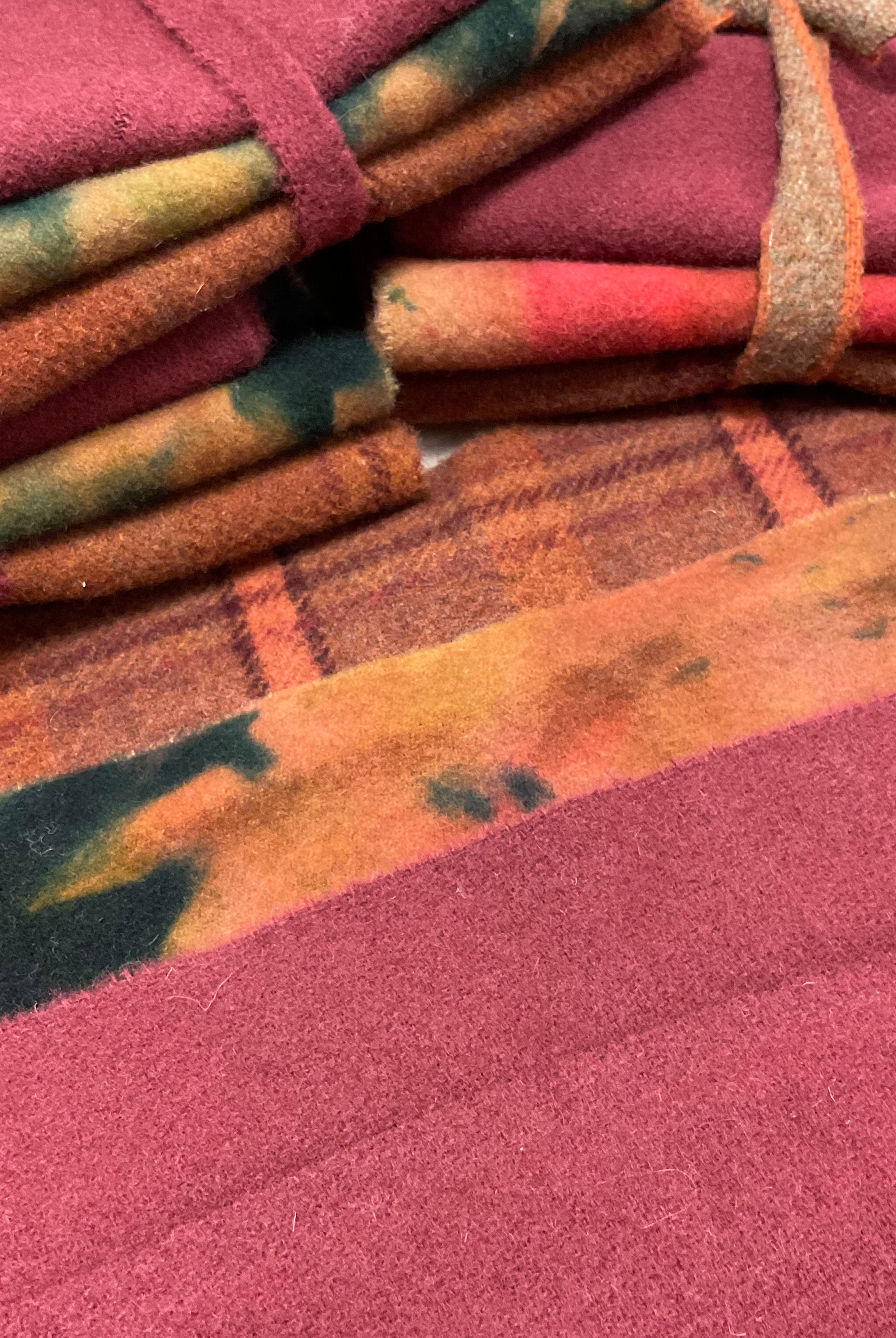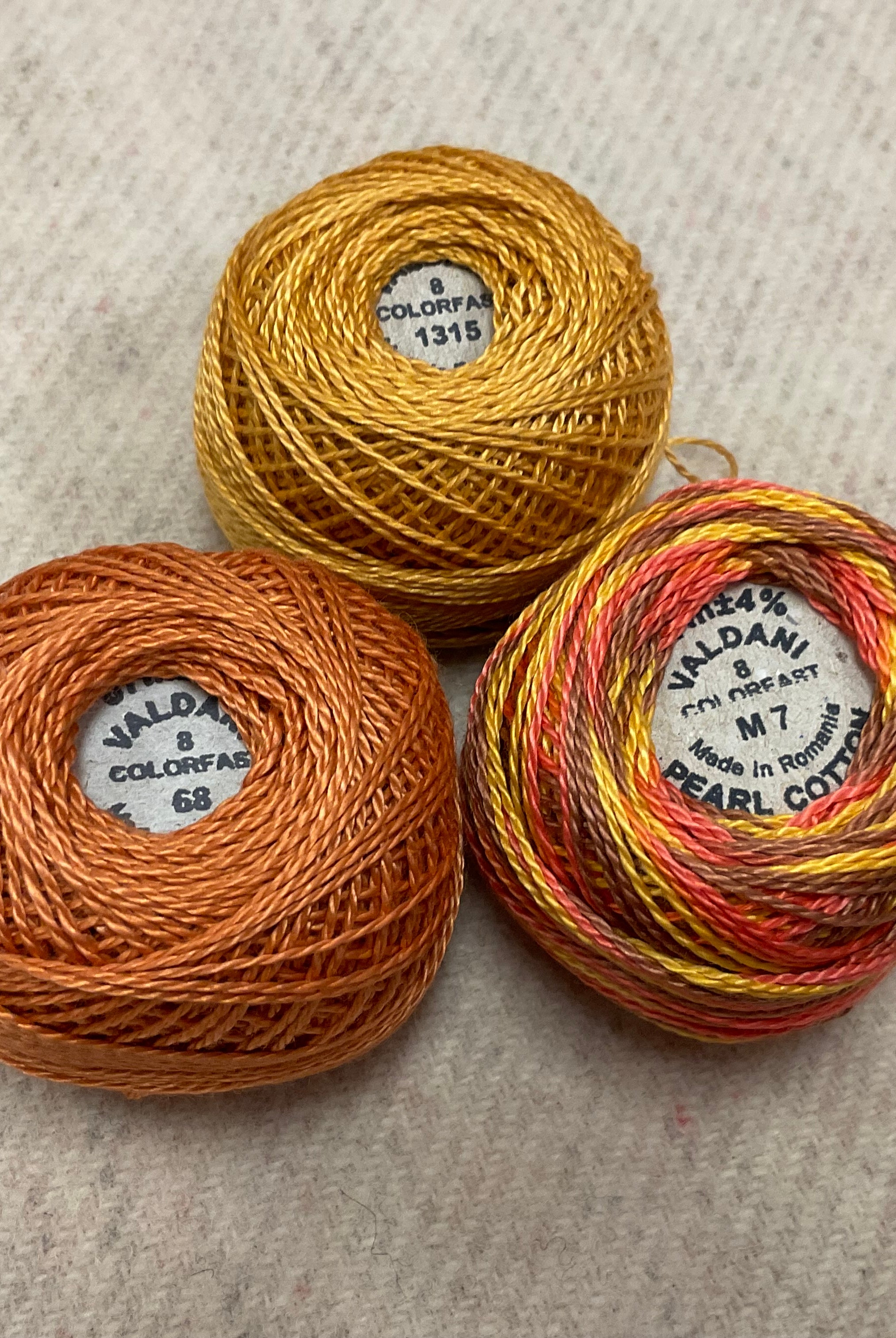 These fun bundles are all washed and ready to work with, they are a fat 1/16 of a washed as is wool 7.5x17, an over dyed wool roughly 7.5x17 and a solid 5.5x17 from the Rebekah Smith wools. We have picked 3 coordinating Vadani threads in #8 to go with your stitching if you like. Threads will be chosen to coordinate with the wools in the bundles.