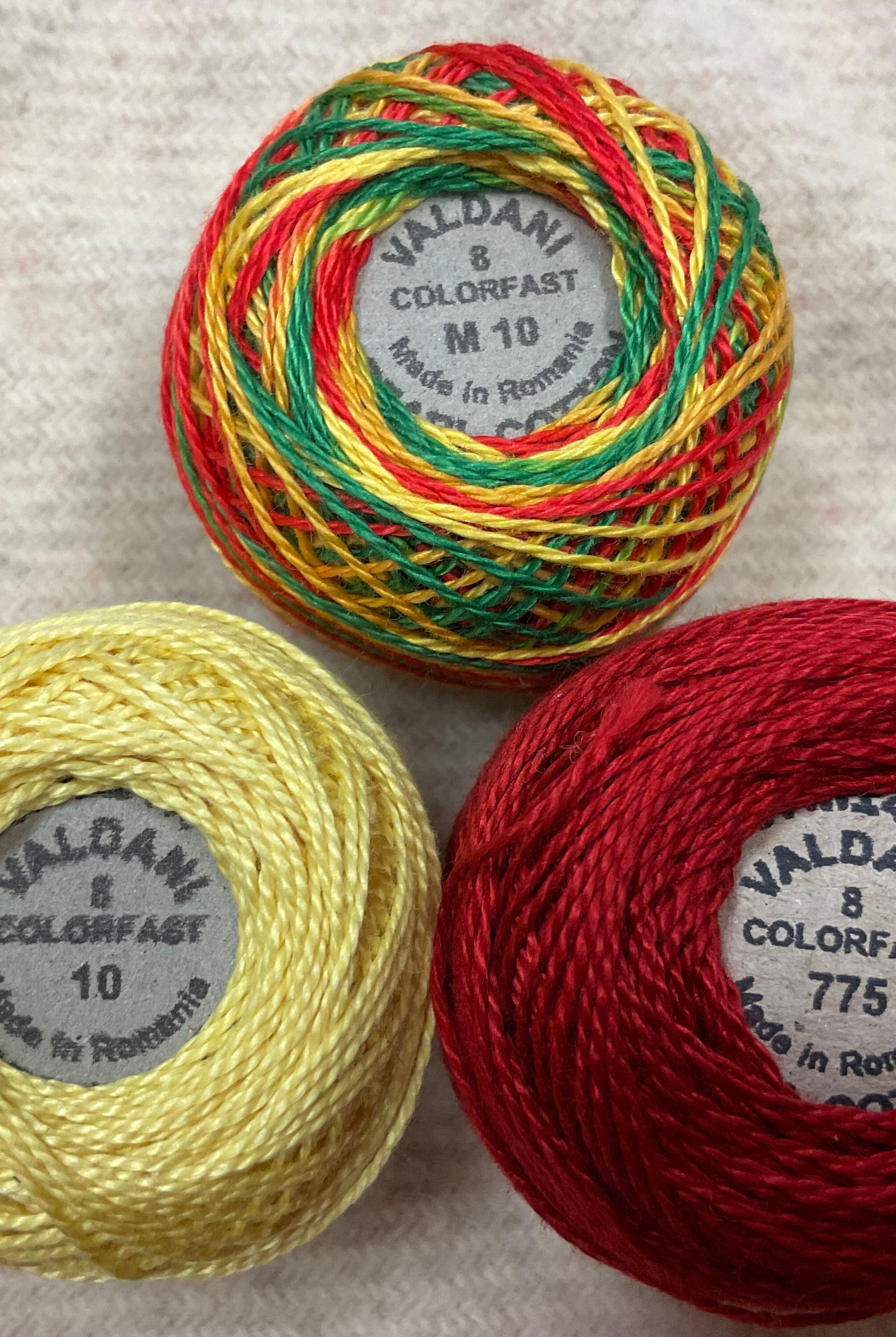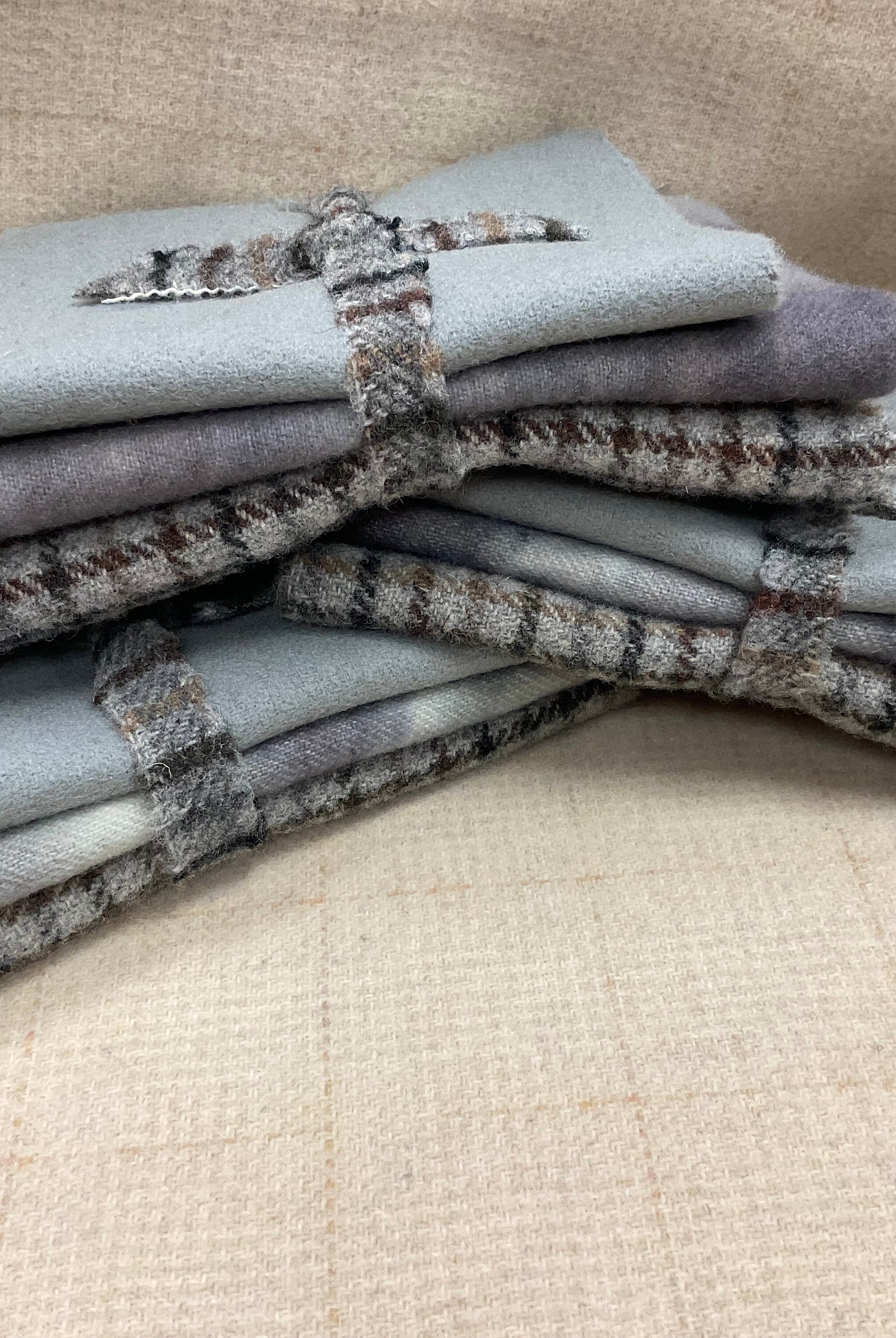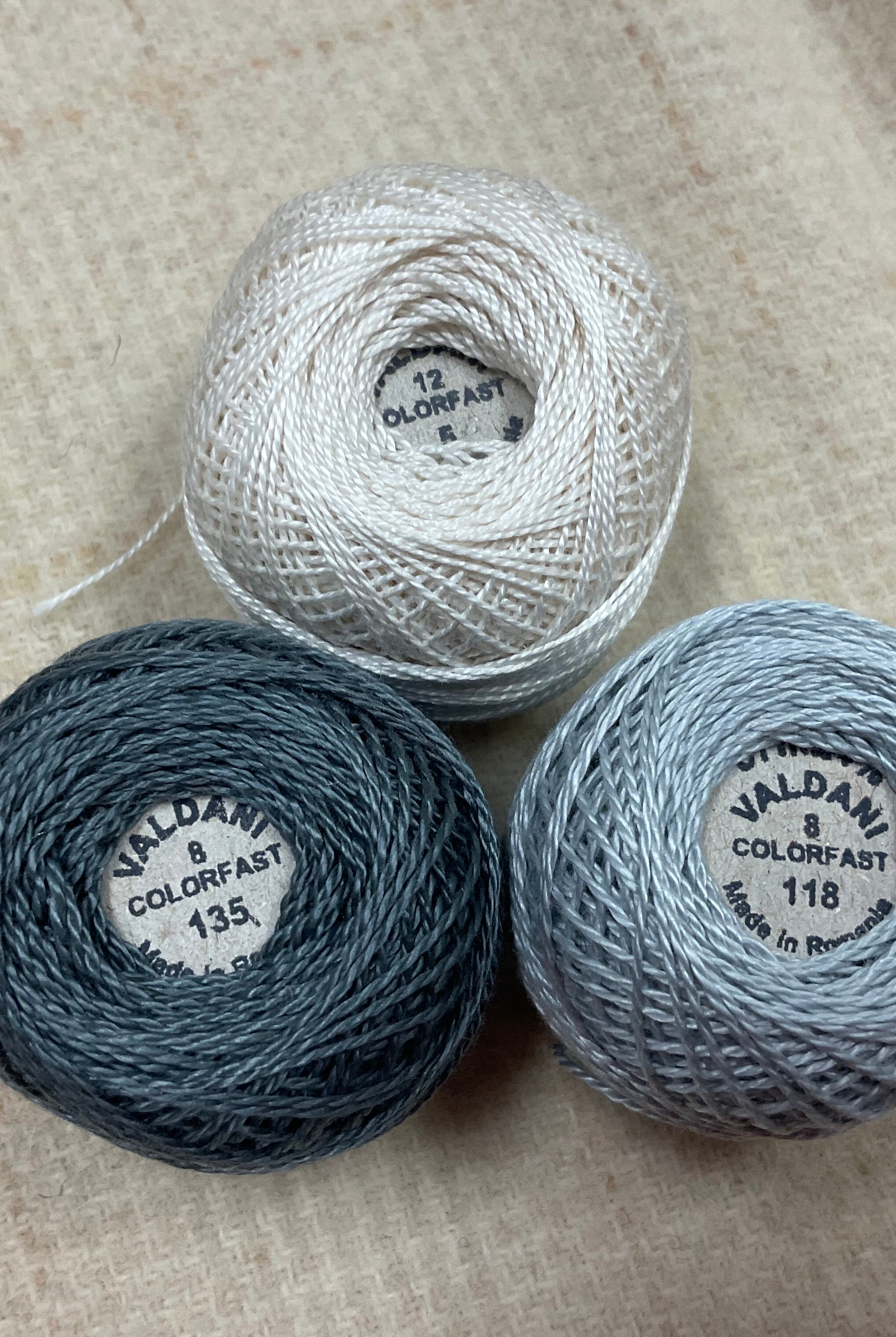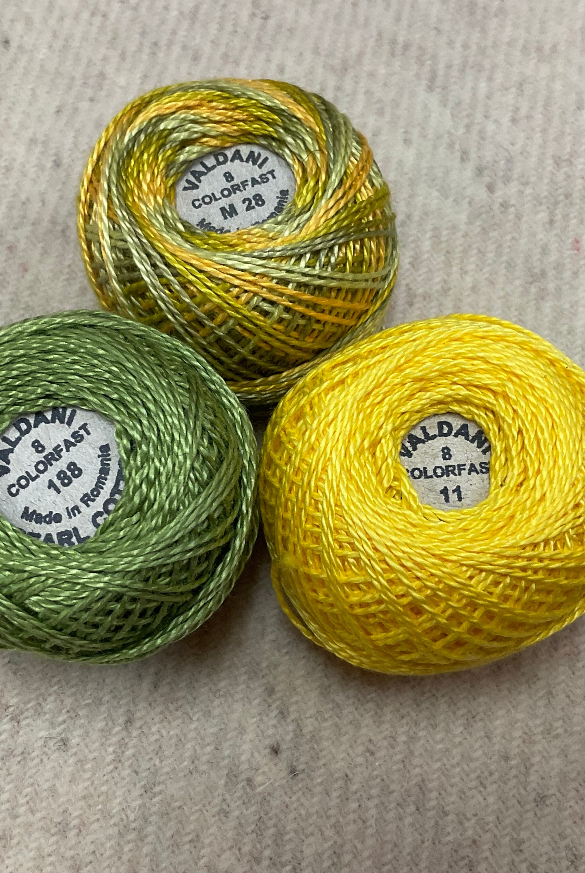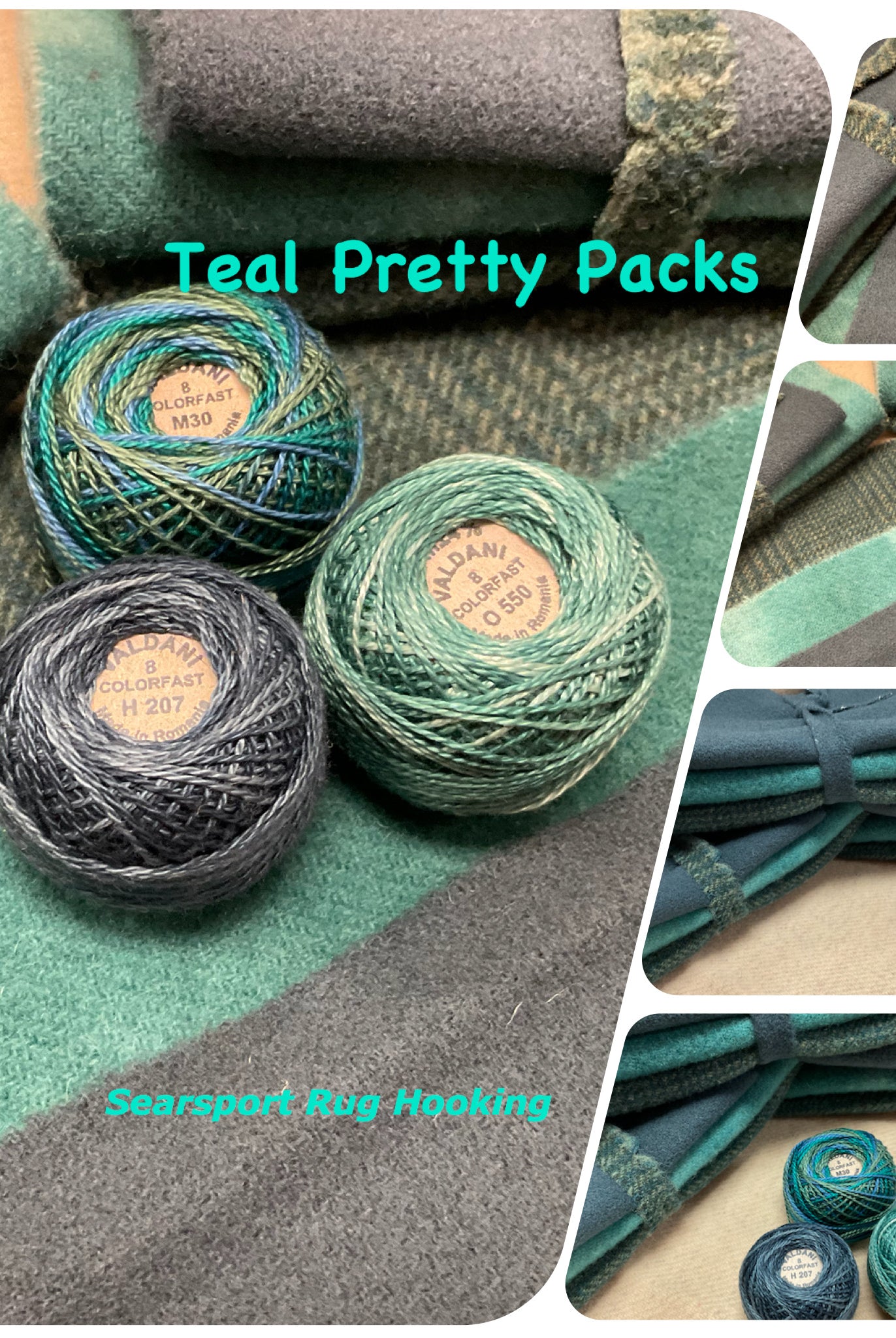 These fun bundles are all washed and ready to work with, they are a fat 1/16 of a washed as is wool 7.5x17, an over dyed wool roughly 7.5x17 and a solid 5.5x17 from the Rebekah Smith wools. We have picked 3 coordinating Vadani threads in #8 to go with your stitching if you like. Threads will be chosen to coordinate with the wools in the bundles.