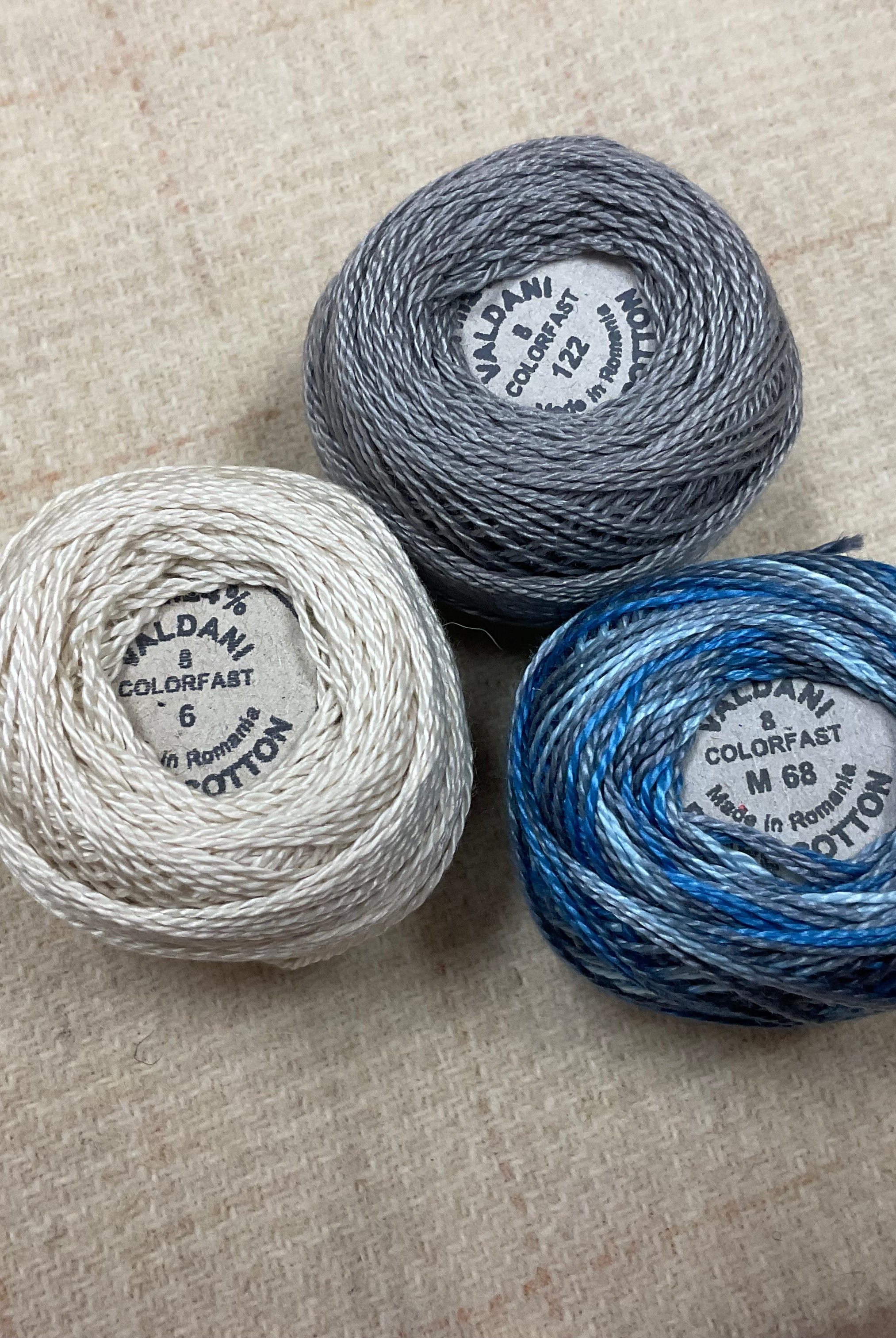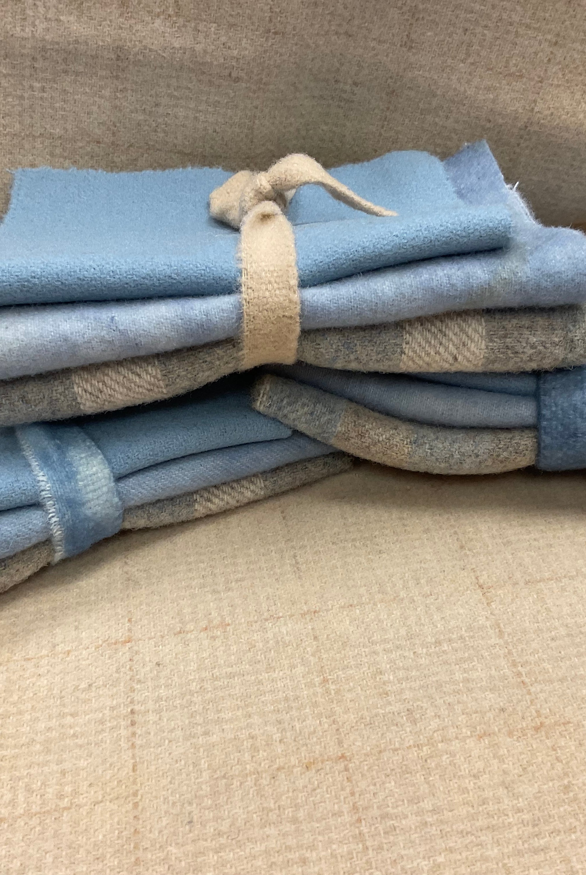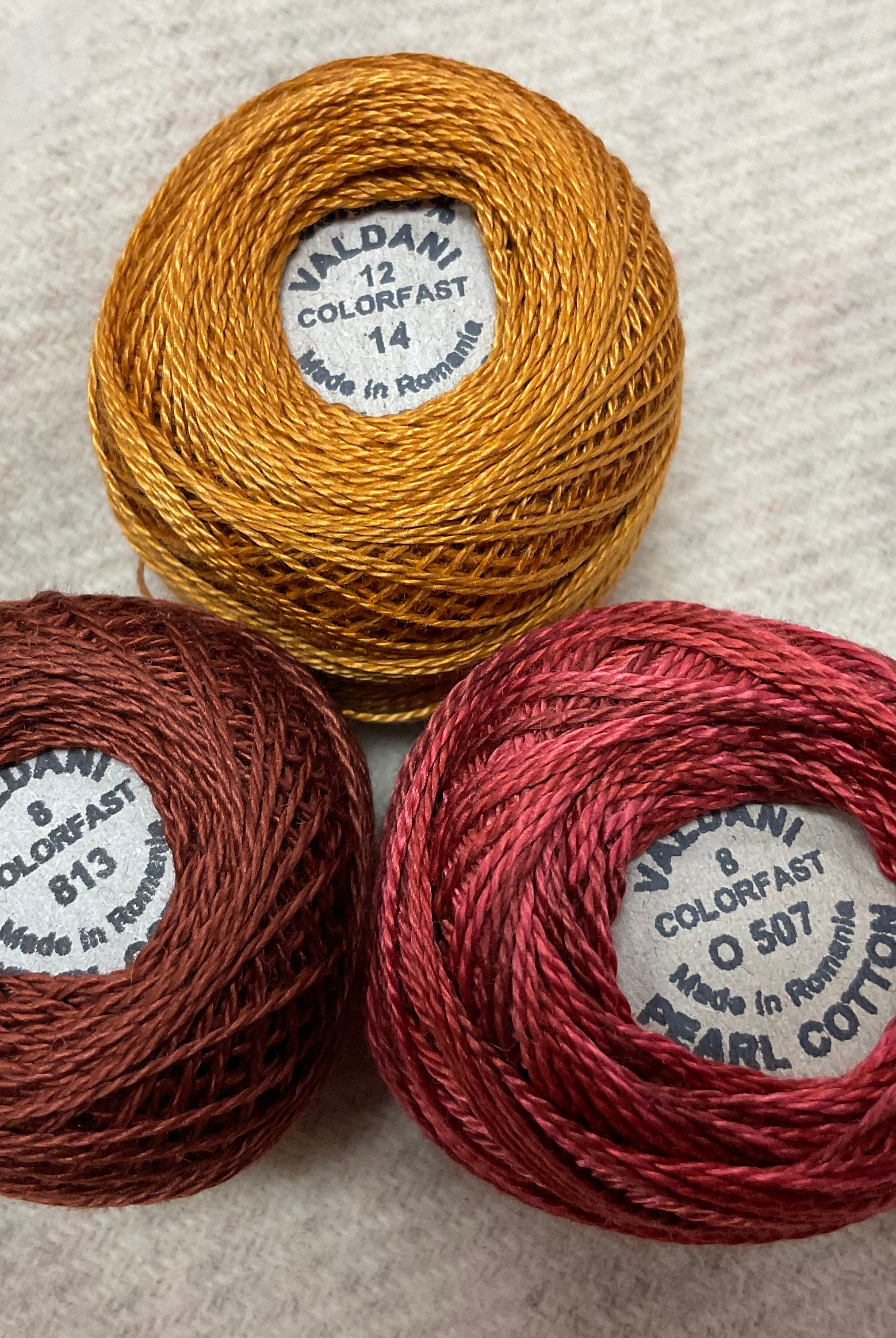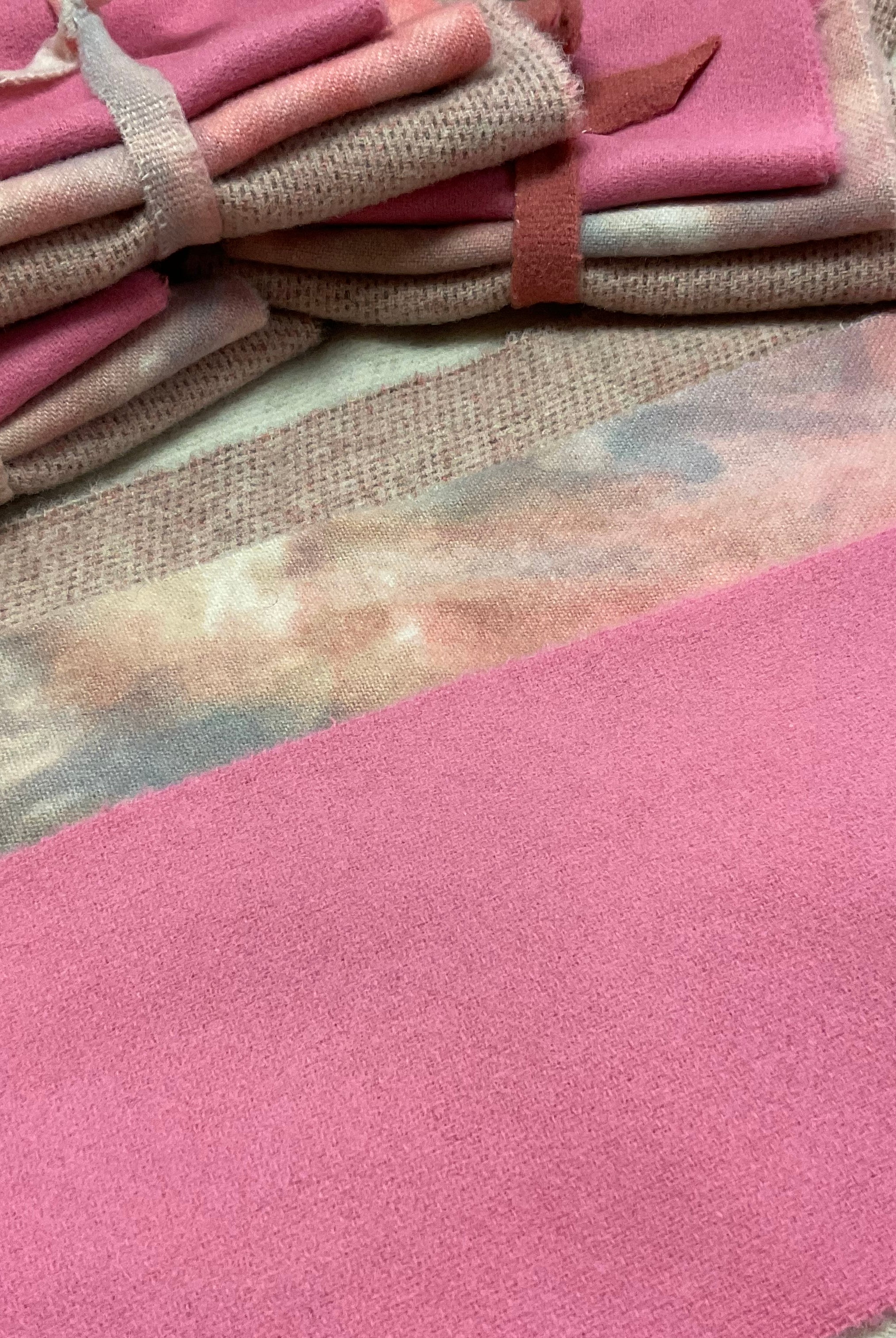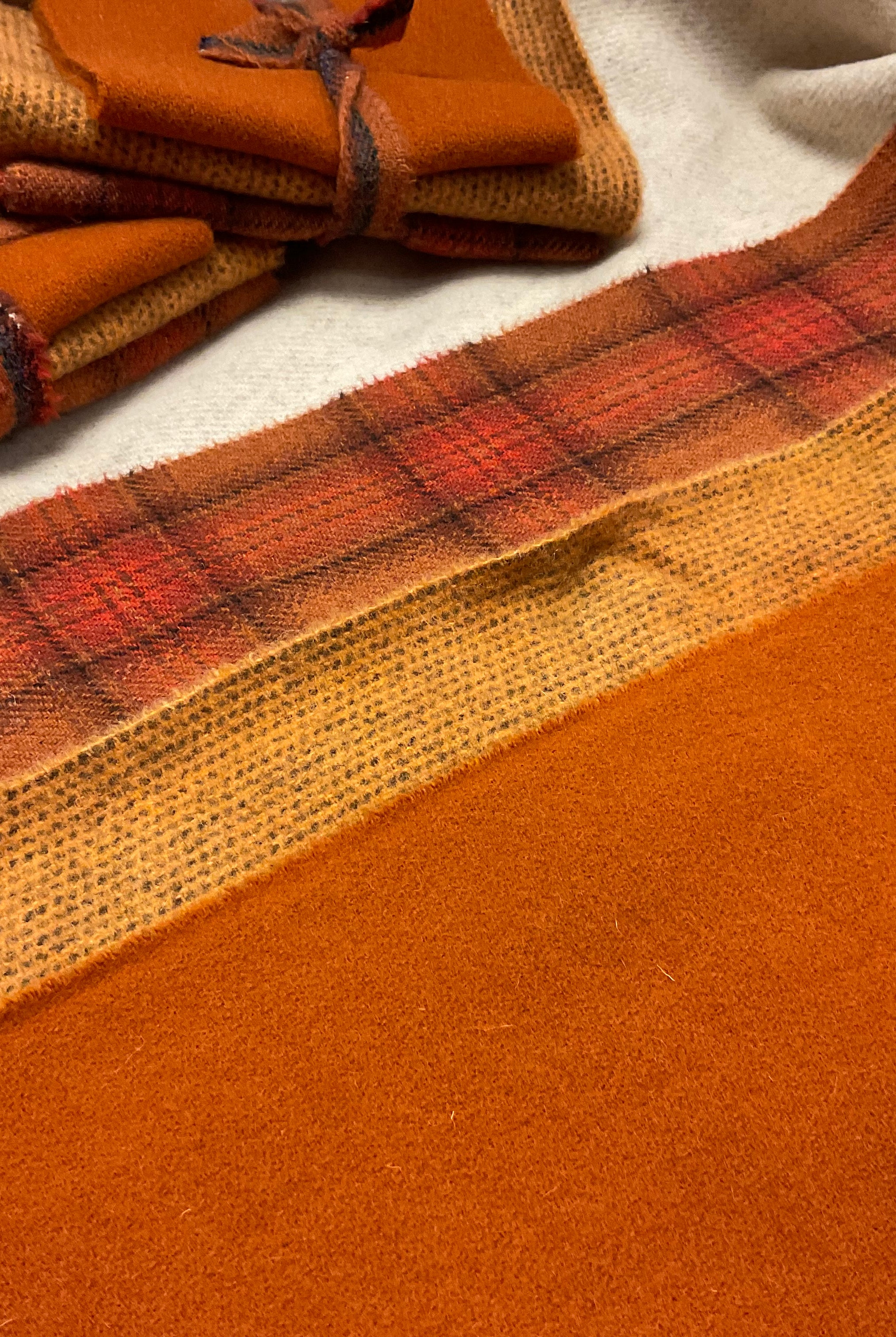 These fun bundles are all washed and ready to work with, they are a fat 1/16 of a washed as is wool 7.5x17, an over dyed wool roughly 7.5x17 and a solid 5.5x17 from the Rebekah Smith wools. We have picked 3 coordinating Vadani threads in #8 to go with your stitching if you like. Threads will be chosen to coordinate with the wools in the bundles.