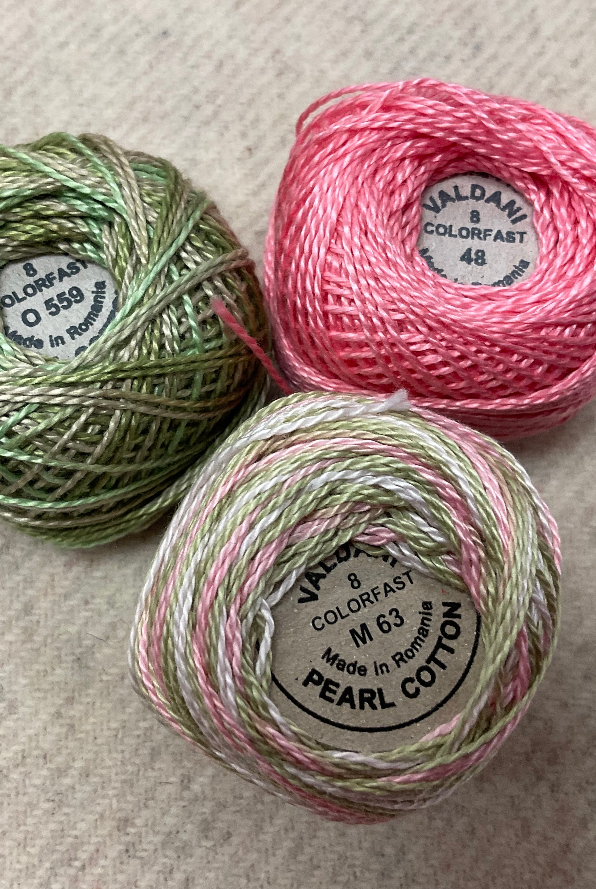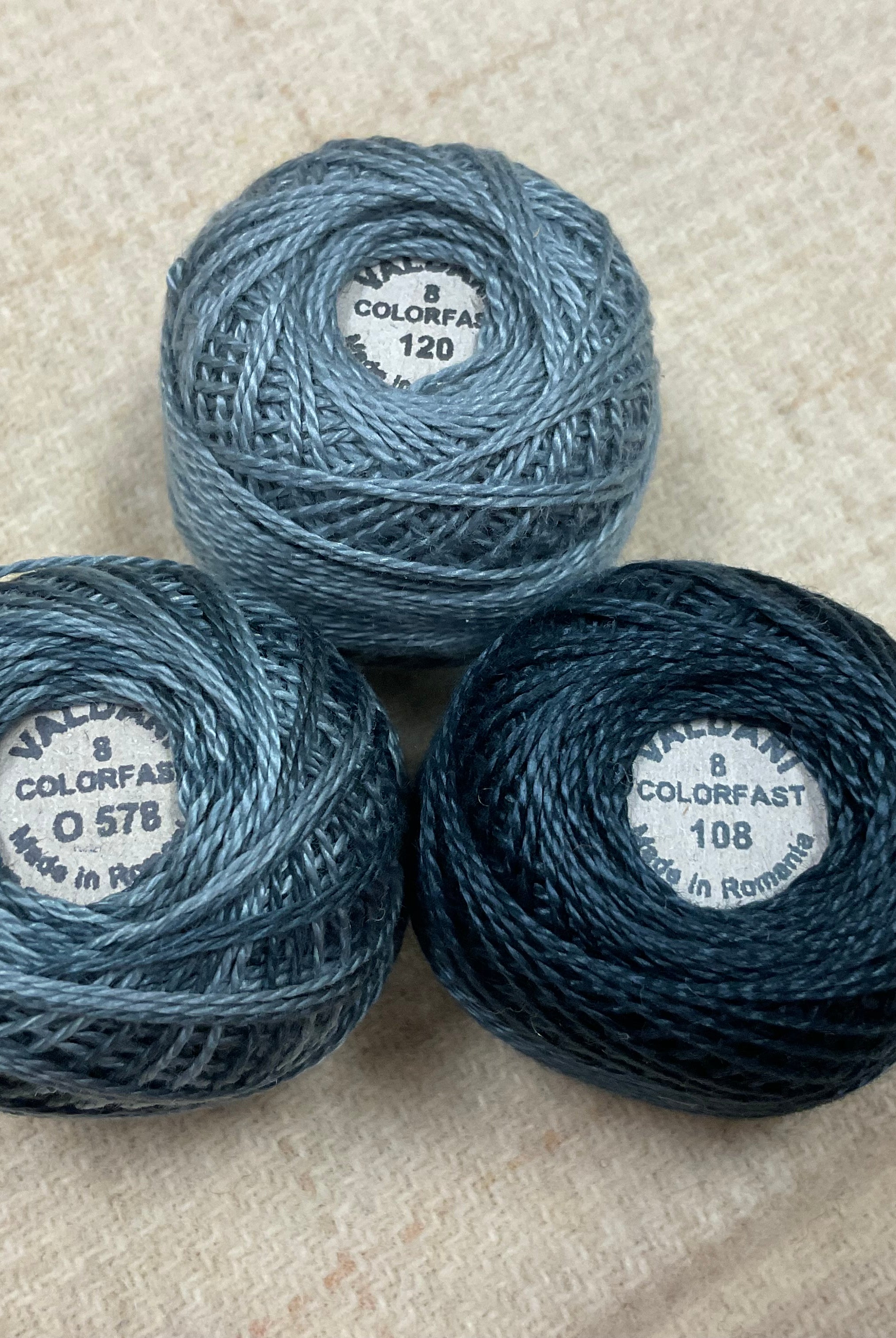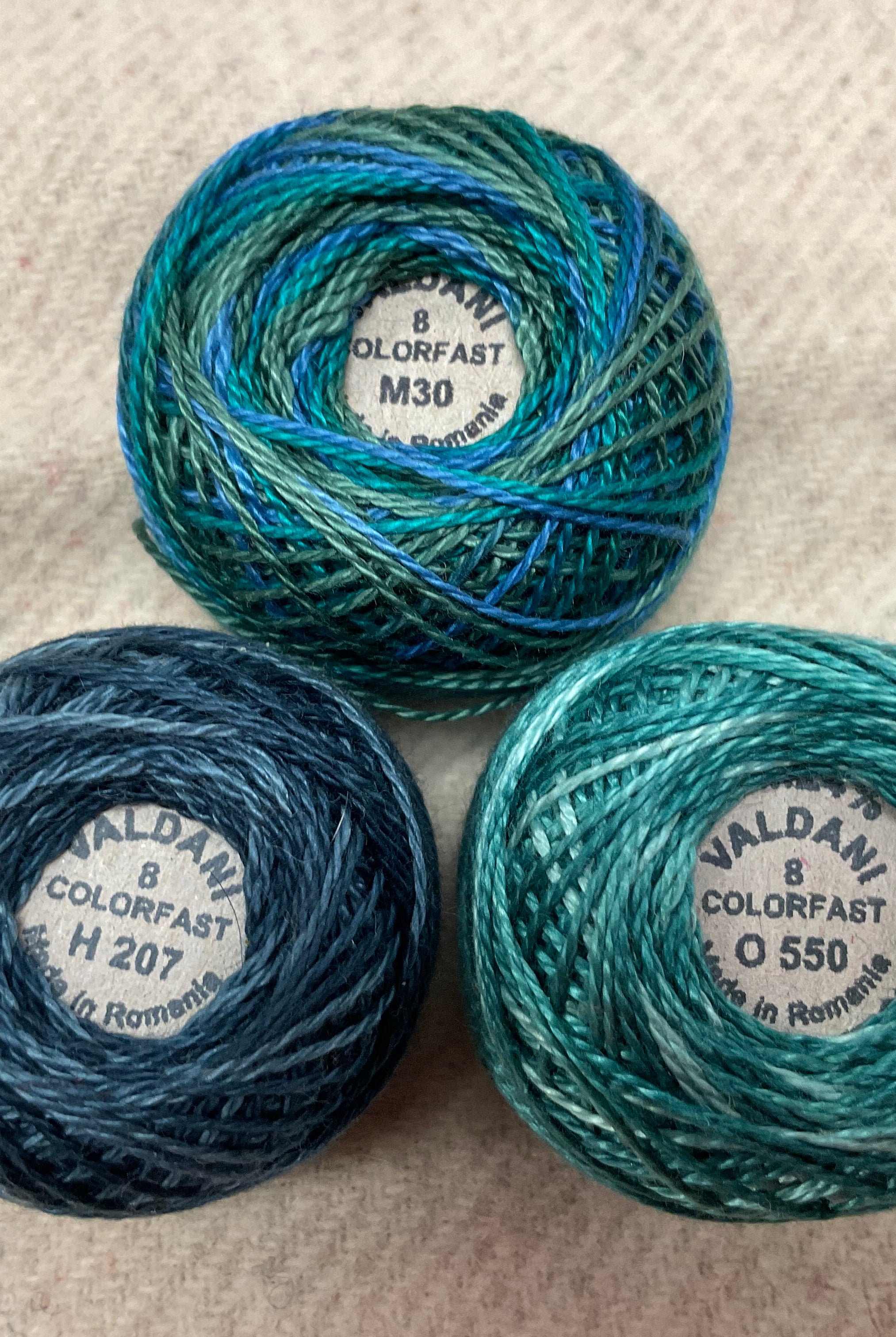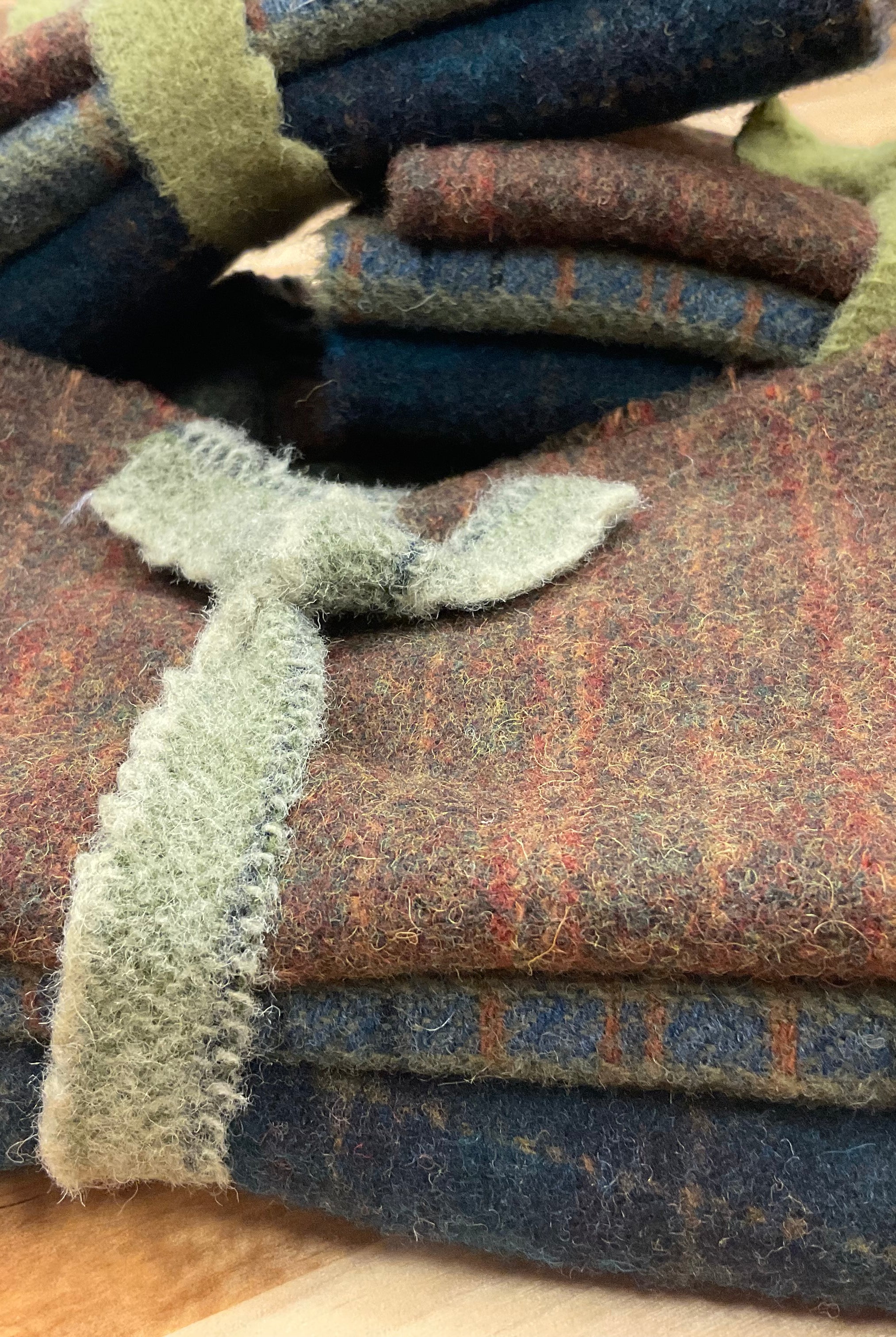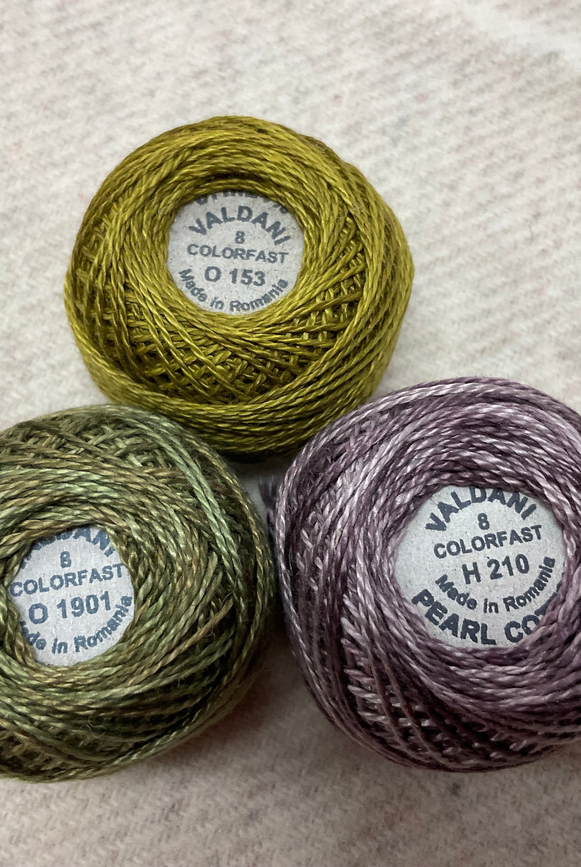 These fun bundles are all washed and ready to work with, they are a fat 1/16 of a washed as is wool 7.5x17, an over dyed wool roughly 7.5x17 and a solid 5.5x17 from the Rebekah Smith wools. We have picked 3 coordinating Vadani threads in #8 to go with your stitching if you like. Threads will be chosen to coordinate with the wools in the bundles.