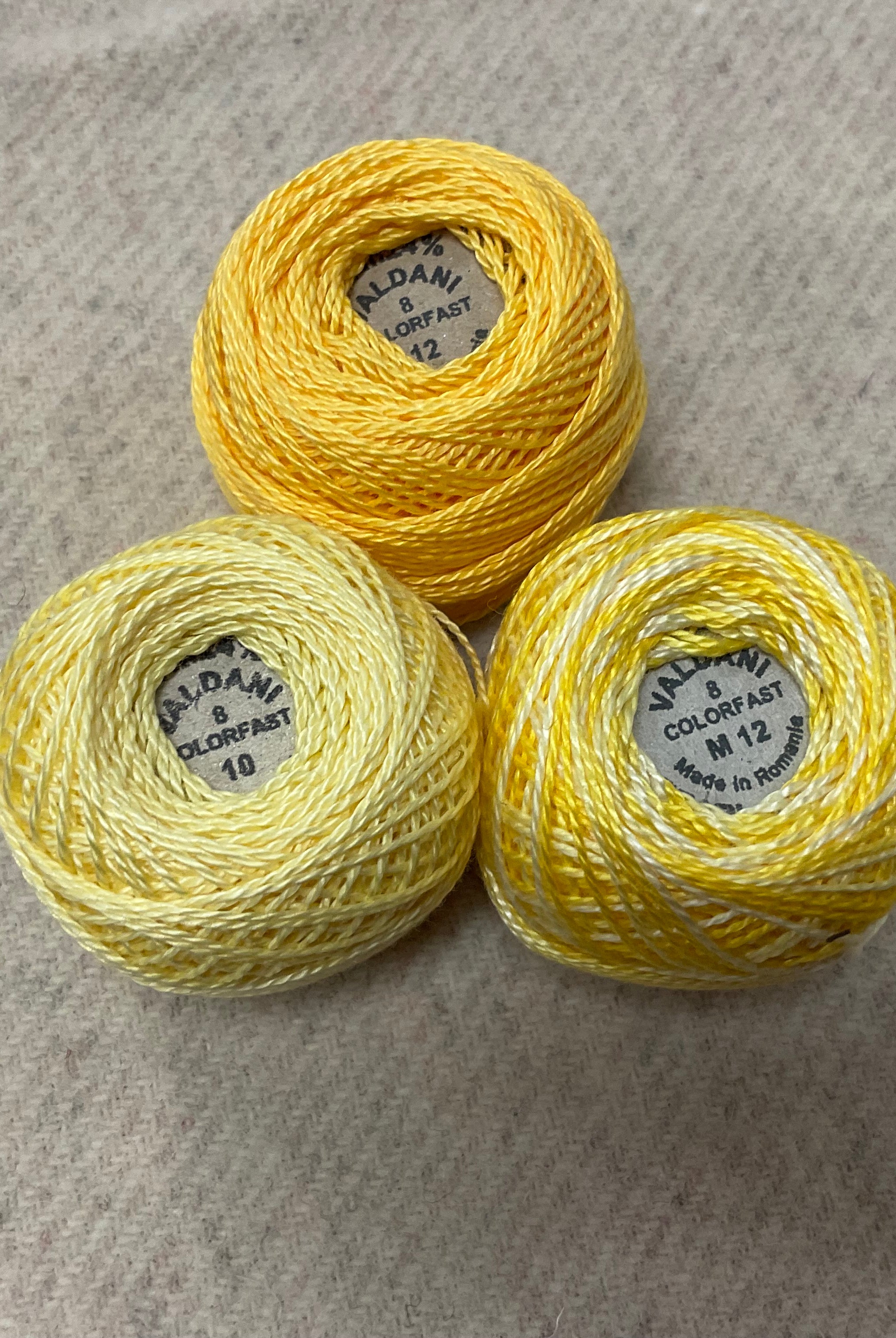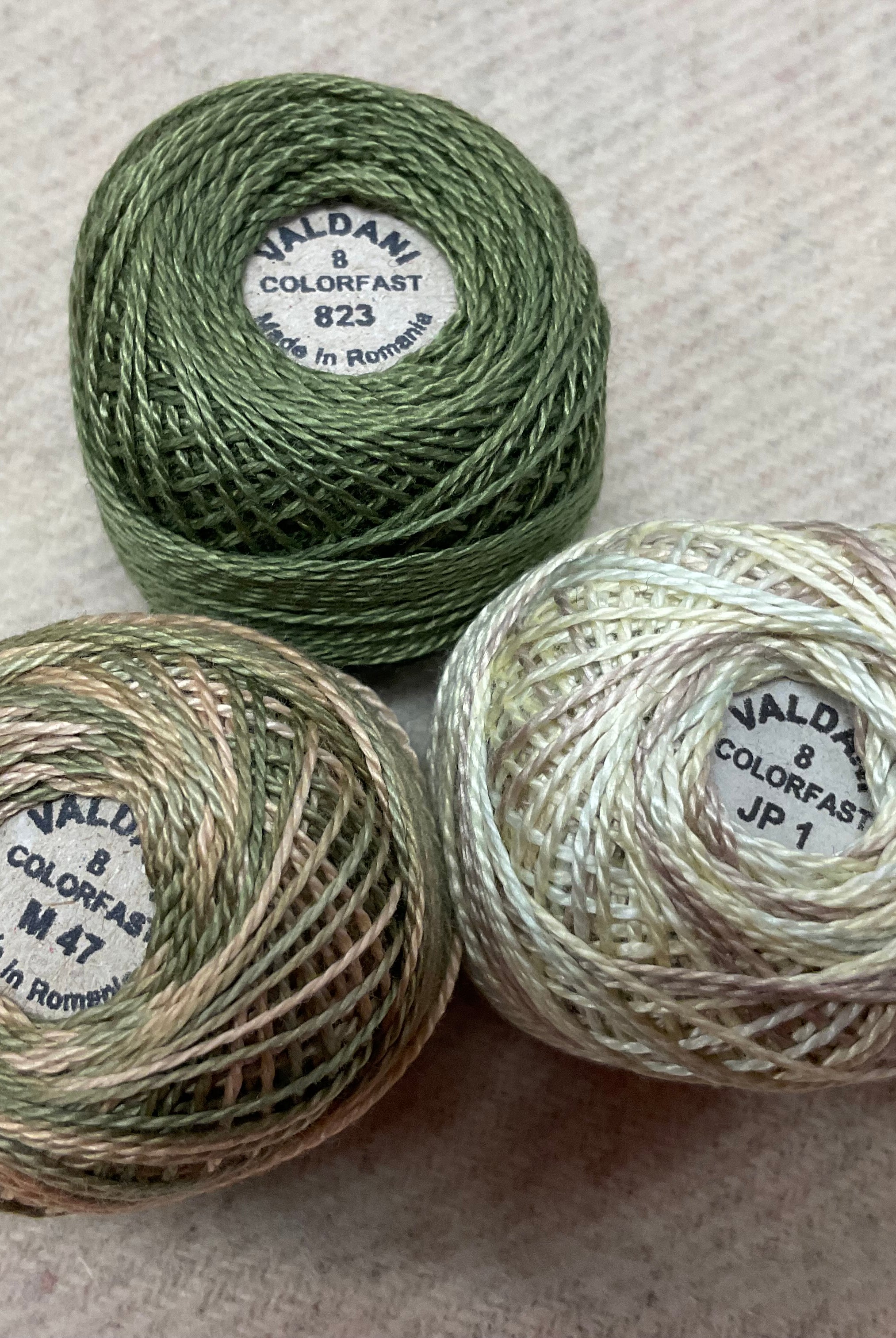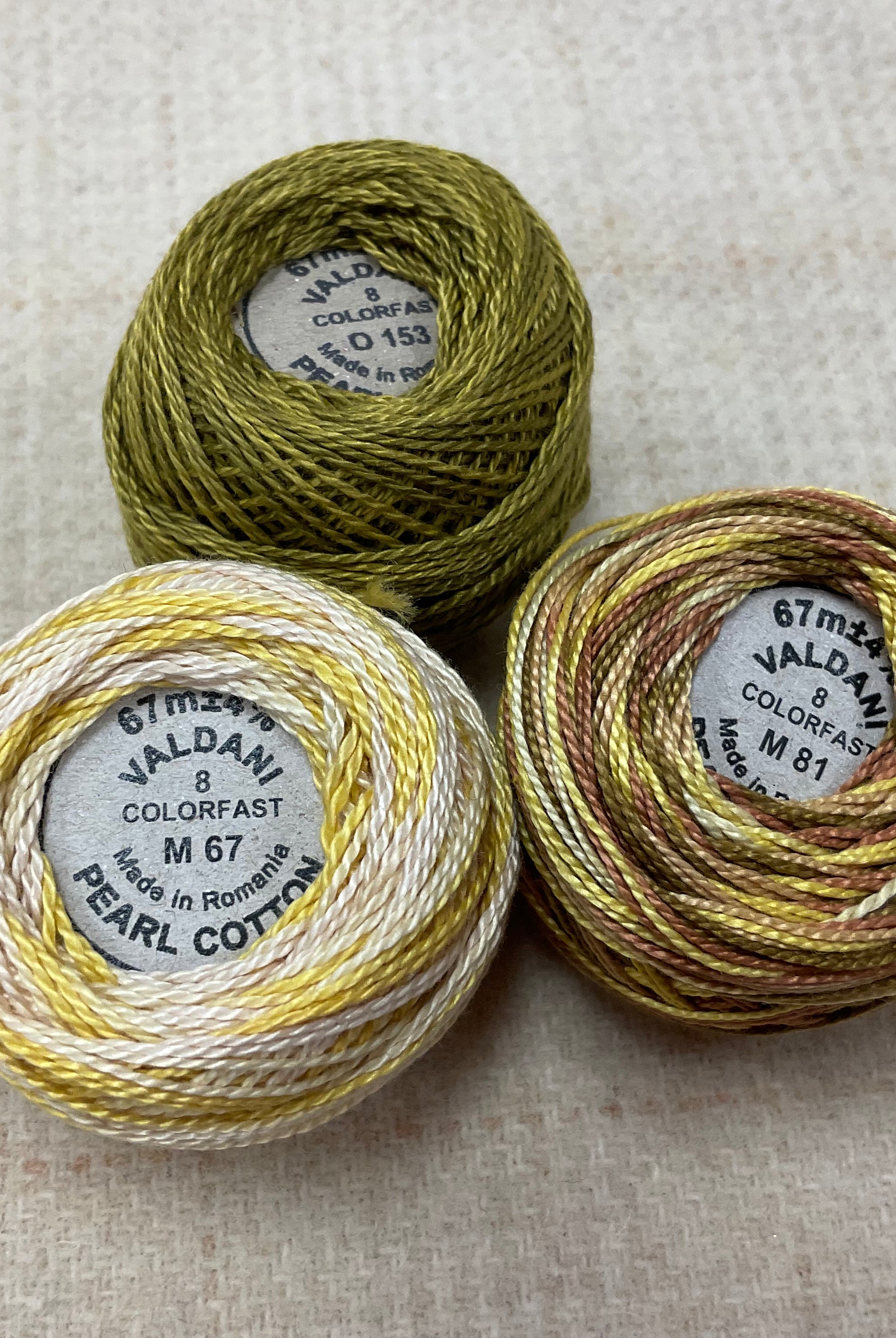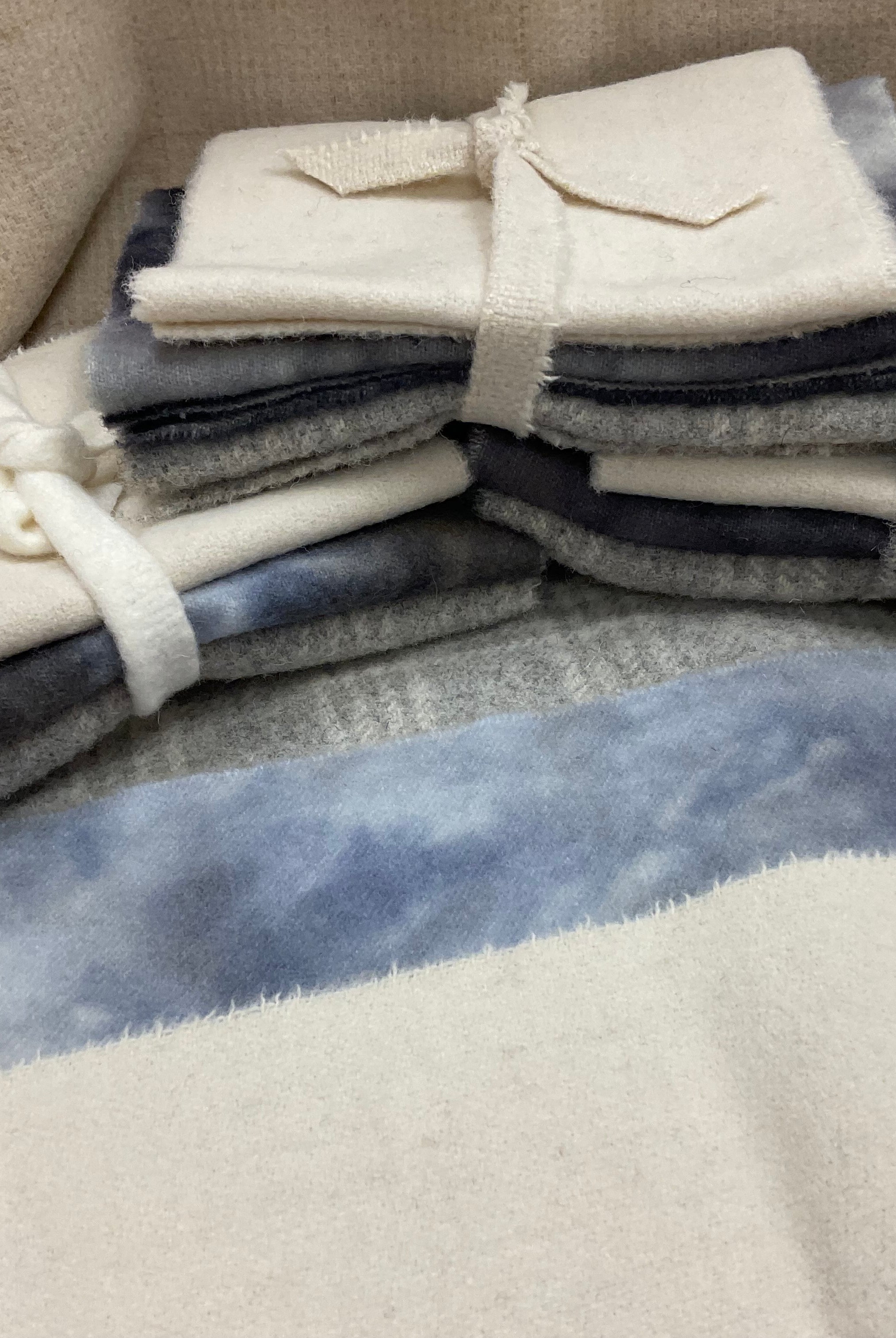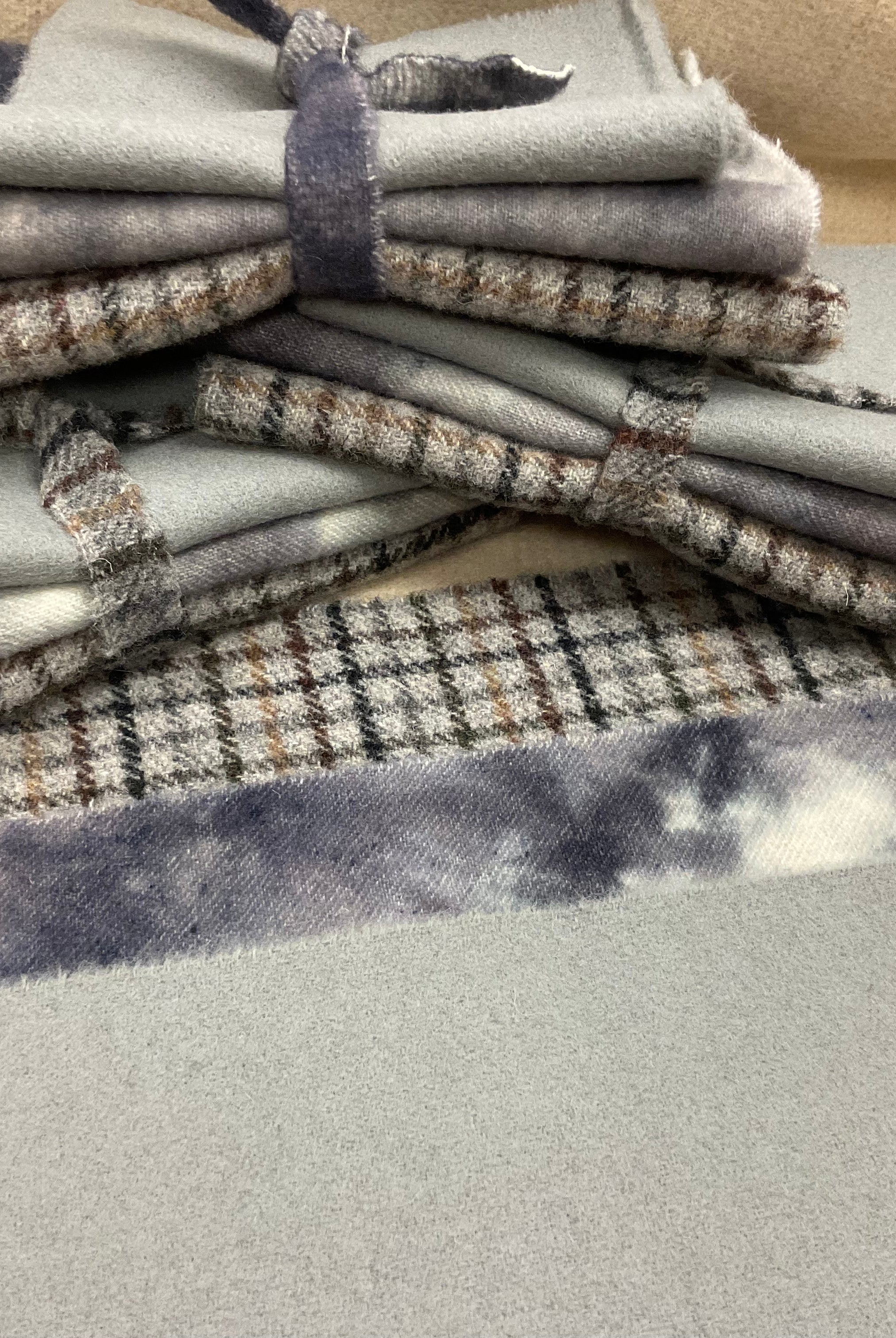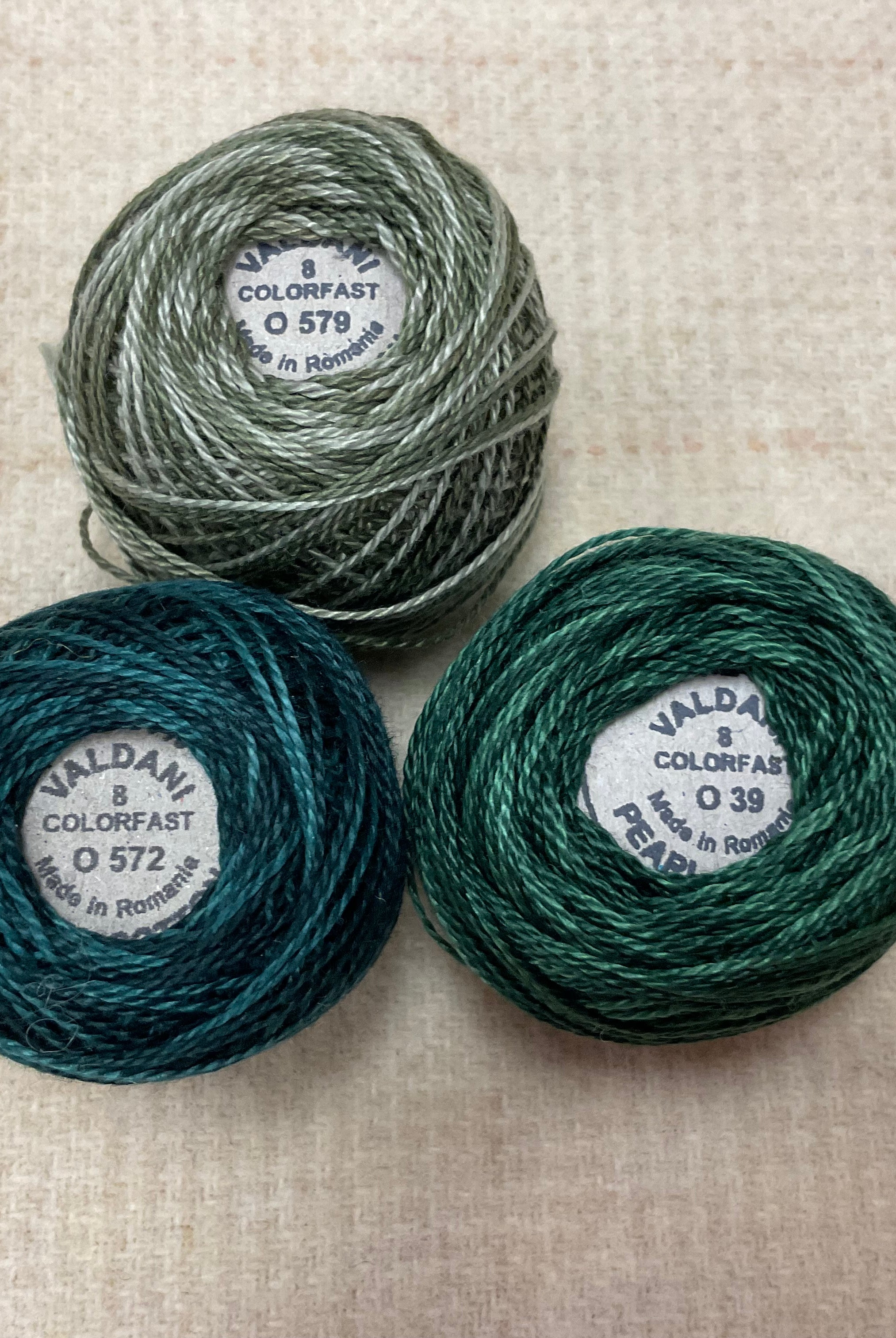 These fun bundles are all washed and ready to work with, they are a fat 1/16 of a washed as is wool 7.5x17, an over dyed wool roughly 7.5x17 and a solid 5.5x17 from the Rebekah Smith wools. We have picked 3 coordinating Vadani threads in #8 to go with your stitching if you like. Threads will be chosen to coordinate with the wools in the bundles.