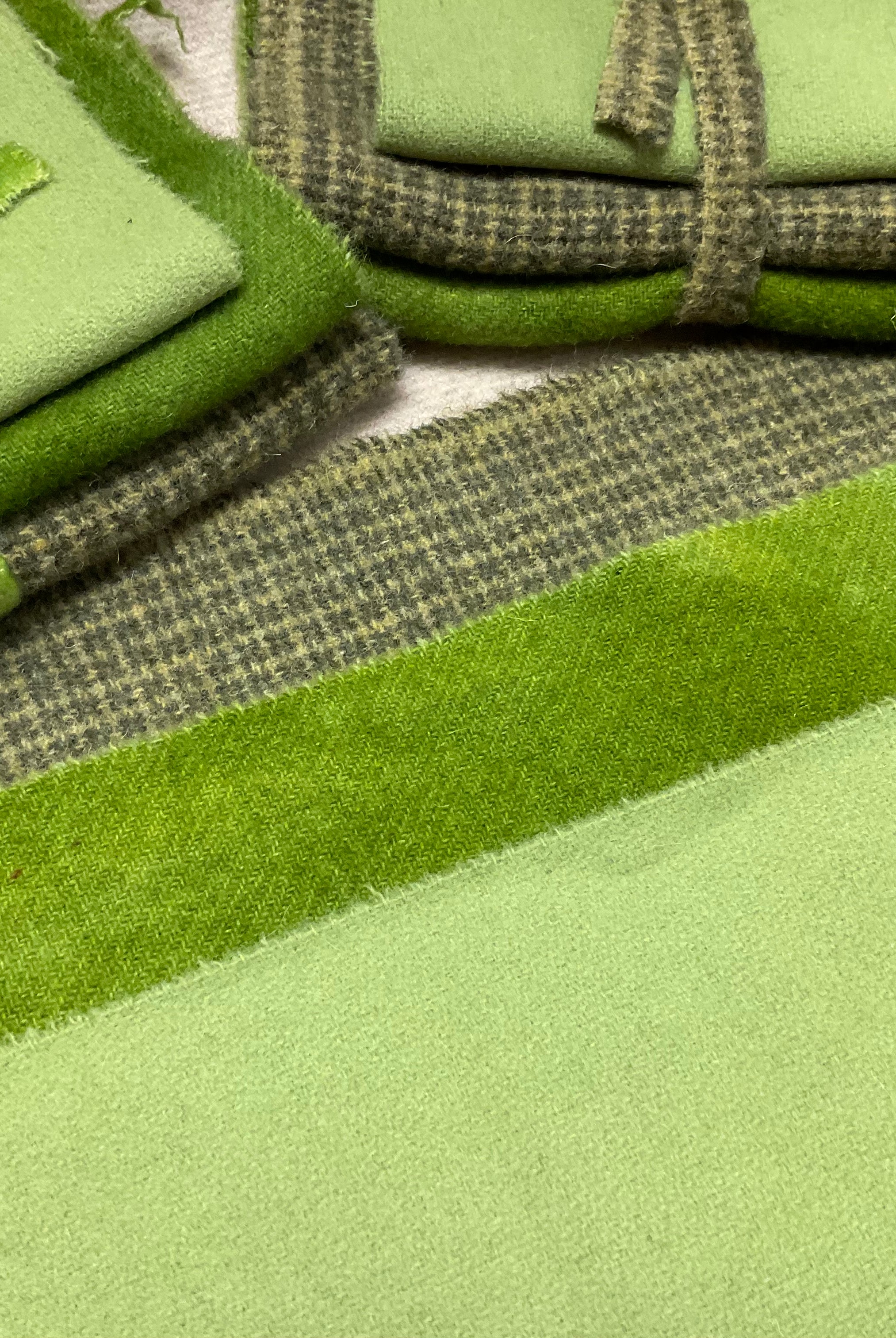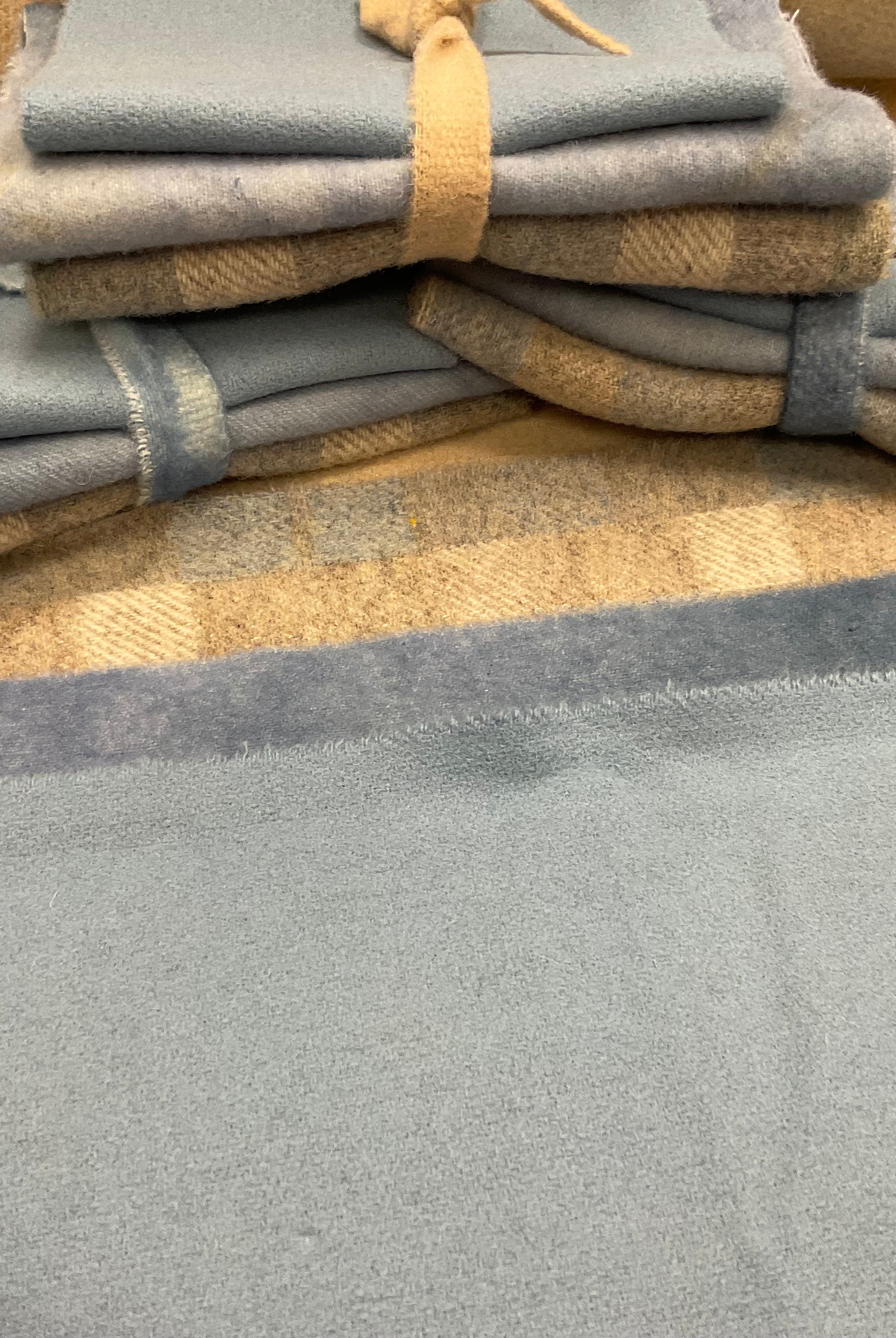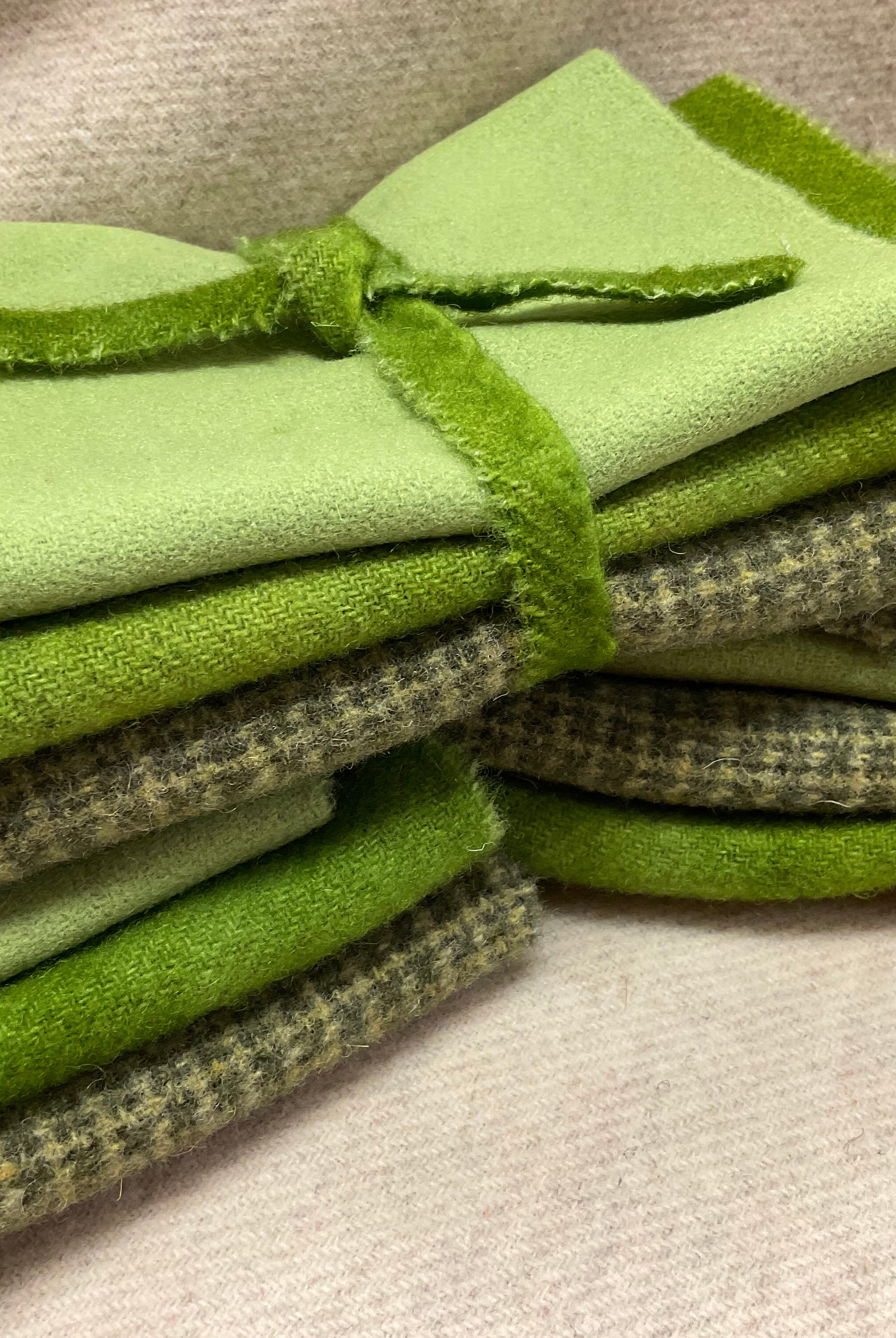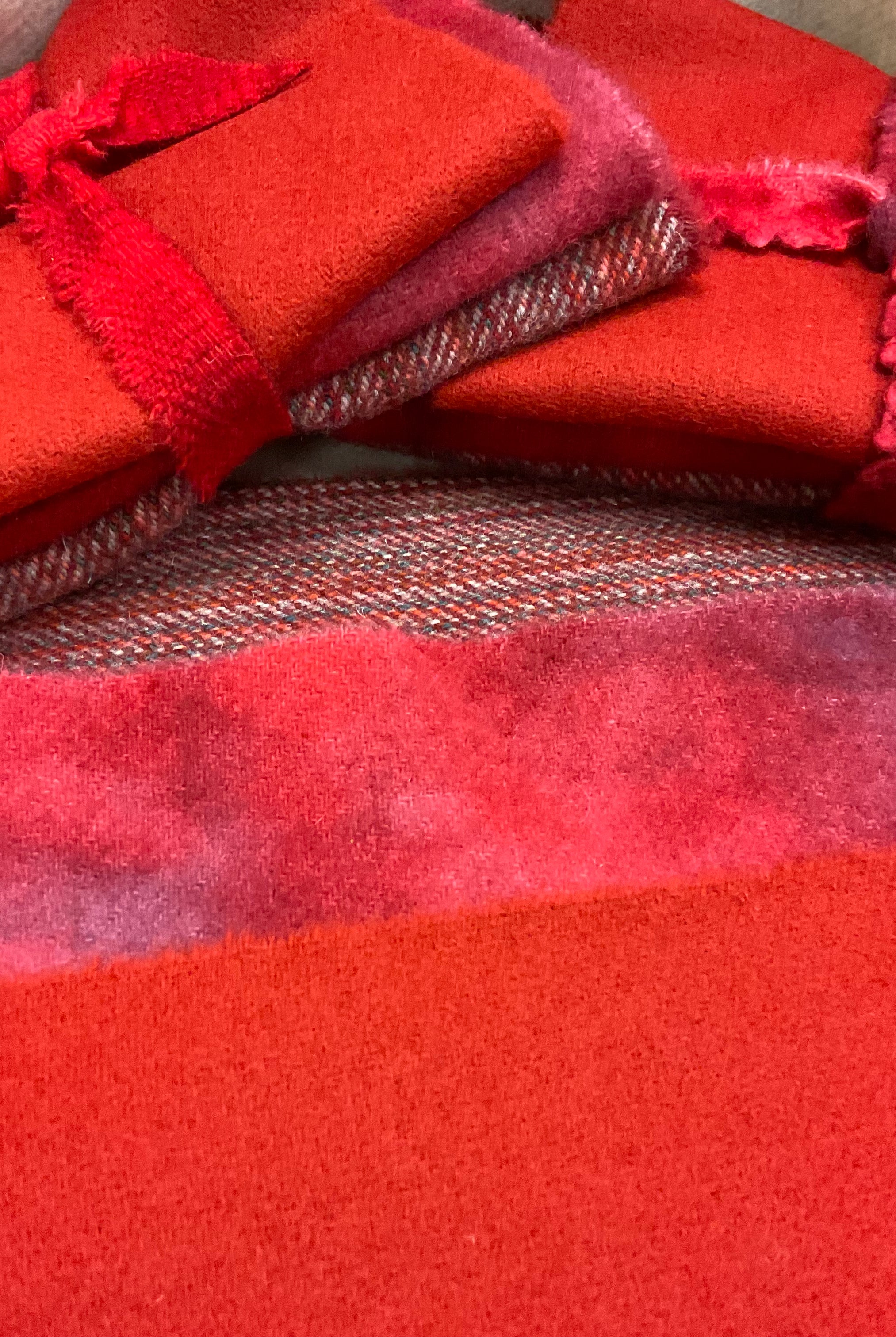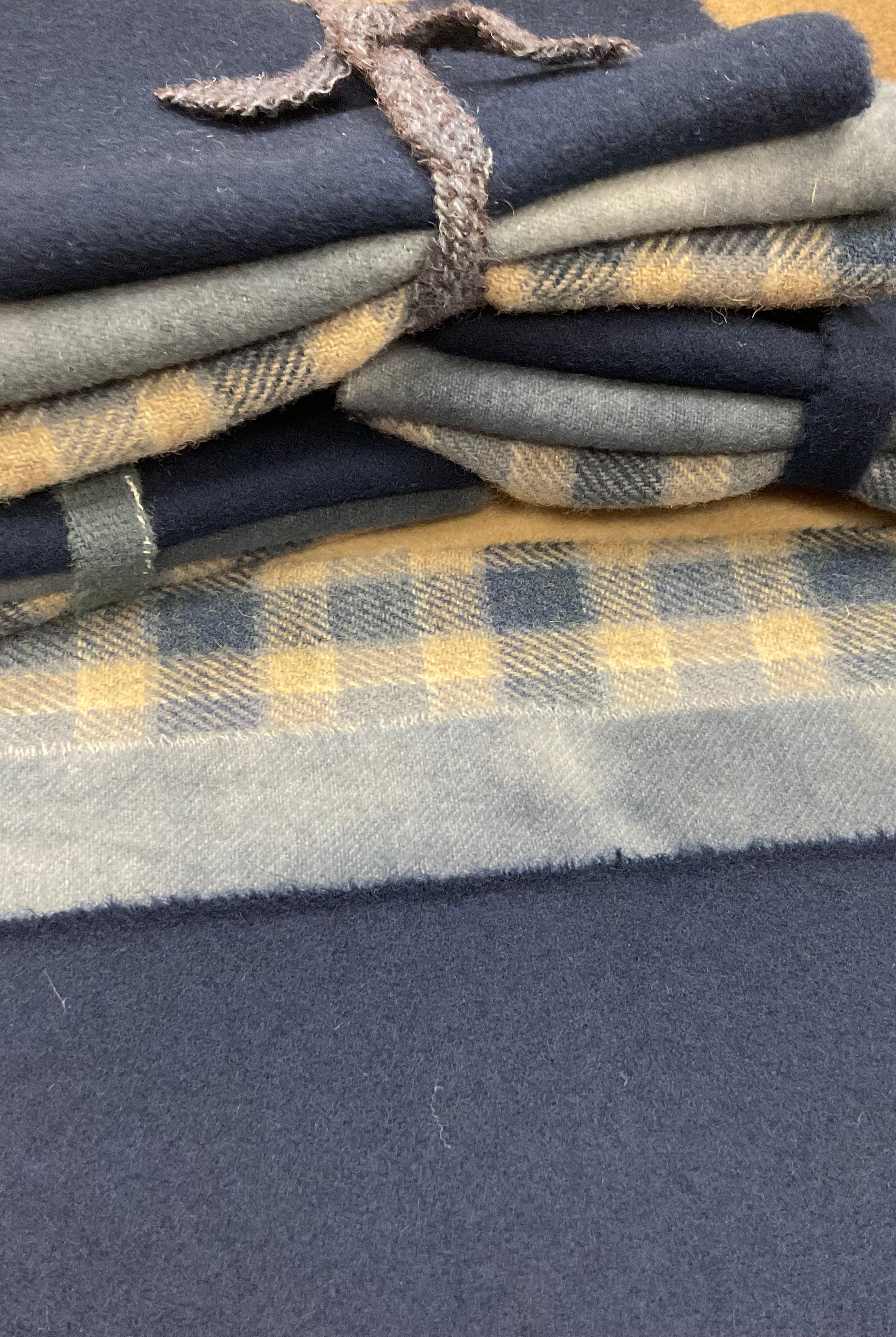These fun bundles are all washed and ready to work with, they are a fat 1/16 of a washed as is wool 7.5x17, an over dyed wool roughly 7.5x17 and a solid 5.5x17 from the Rebekah Smith wools. We have picked 3 coordinating Vadani threads in #8 to go with your stitching if you like. Threads will be chosen to coordinate with the wools in the bundles.