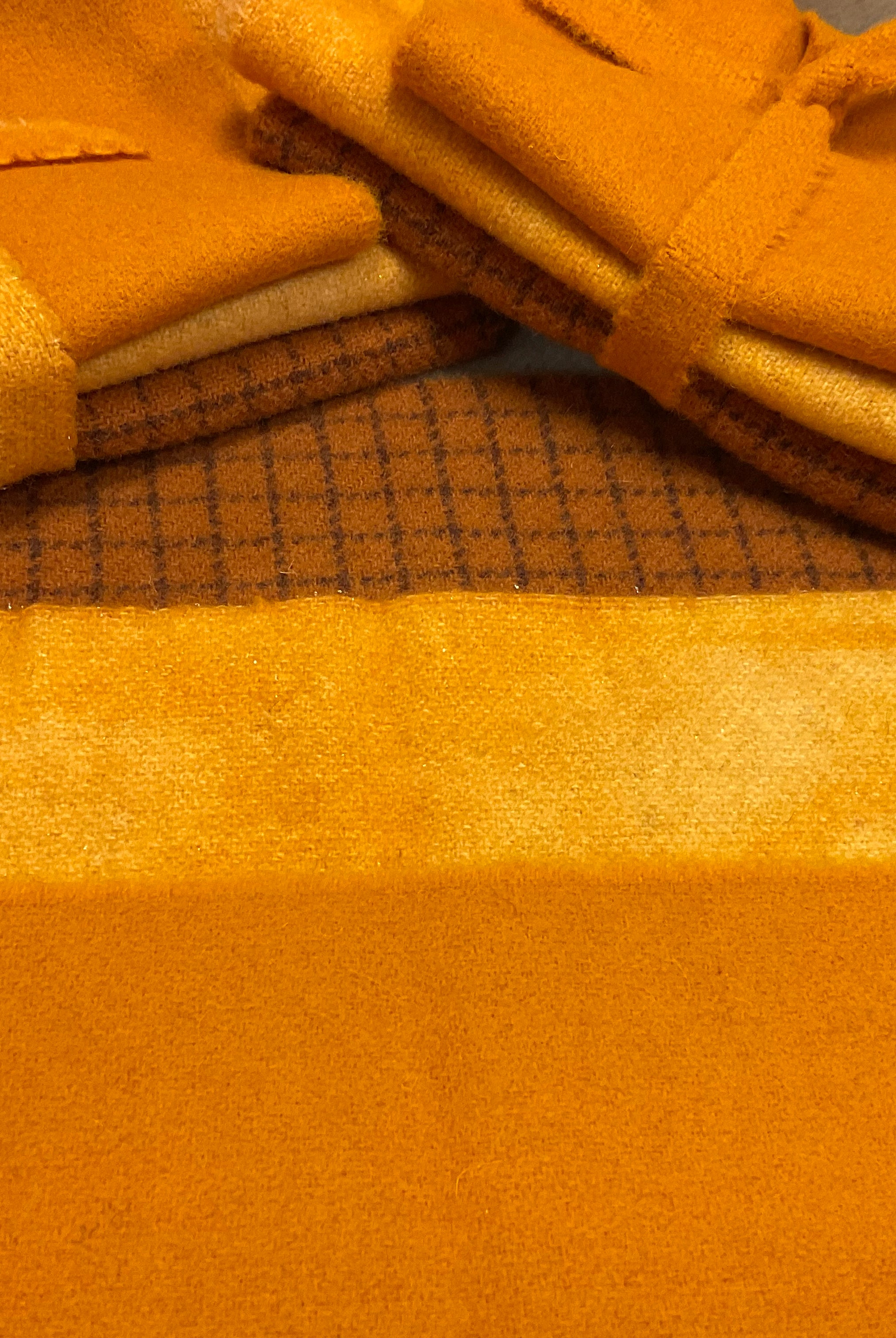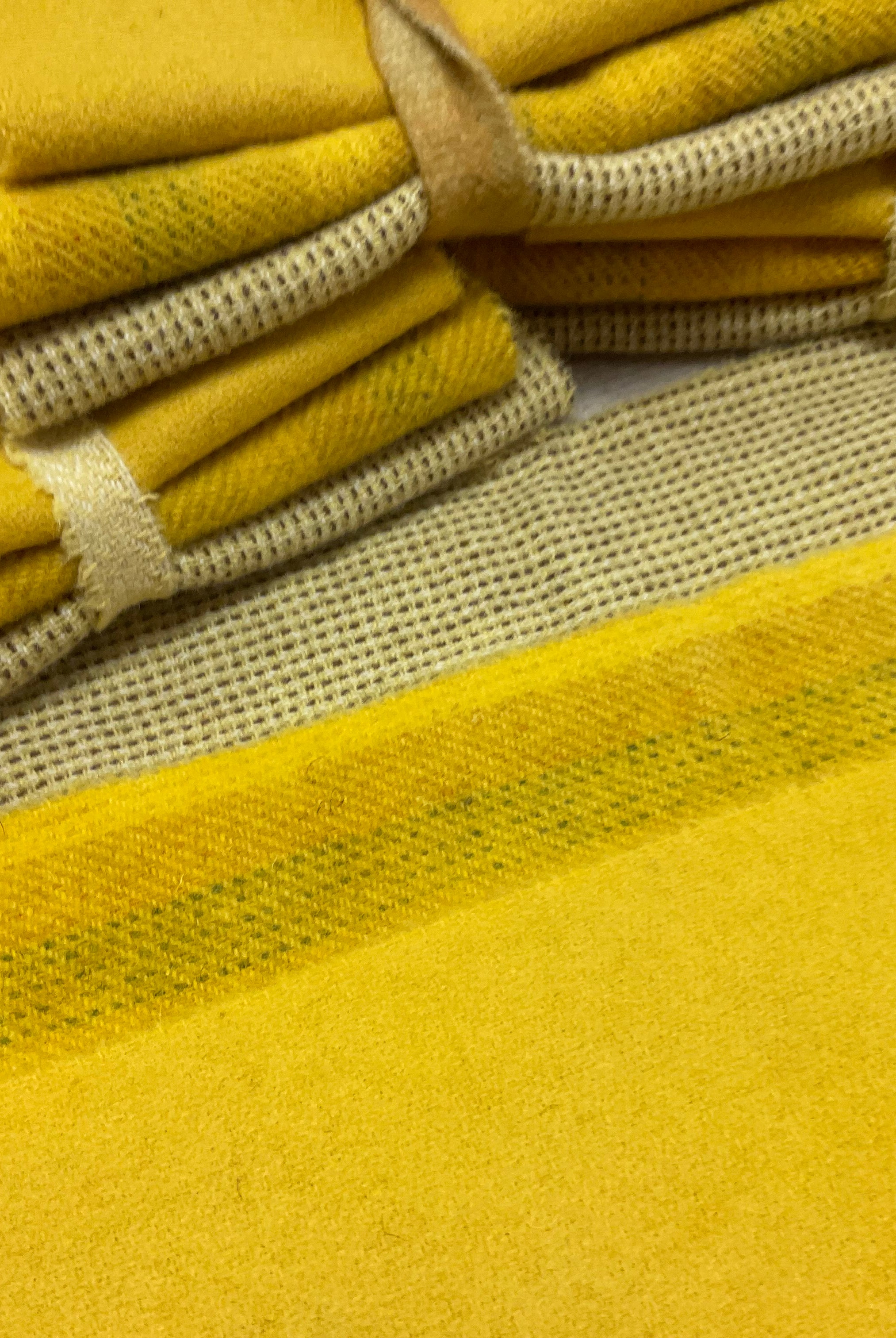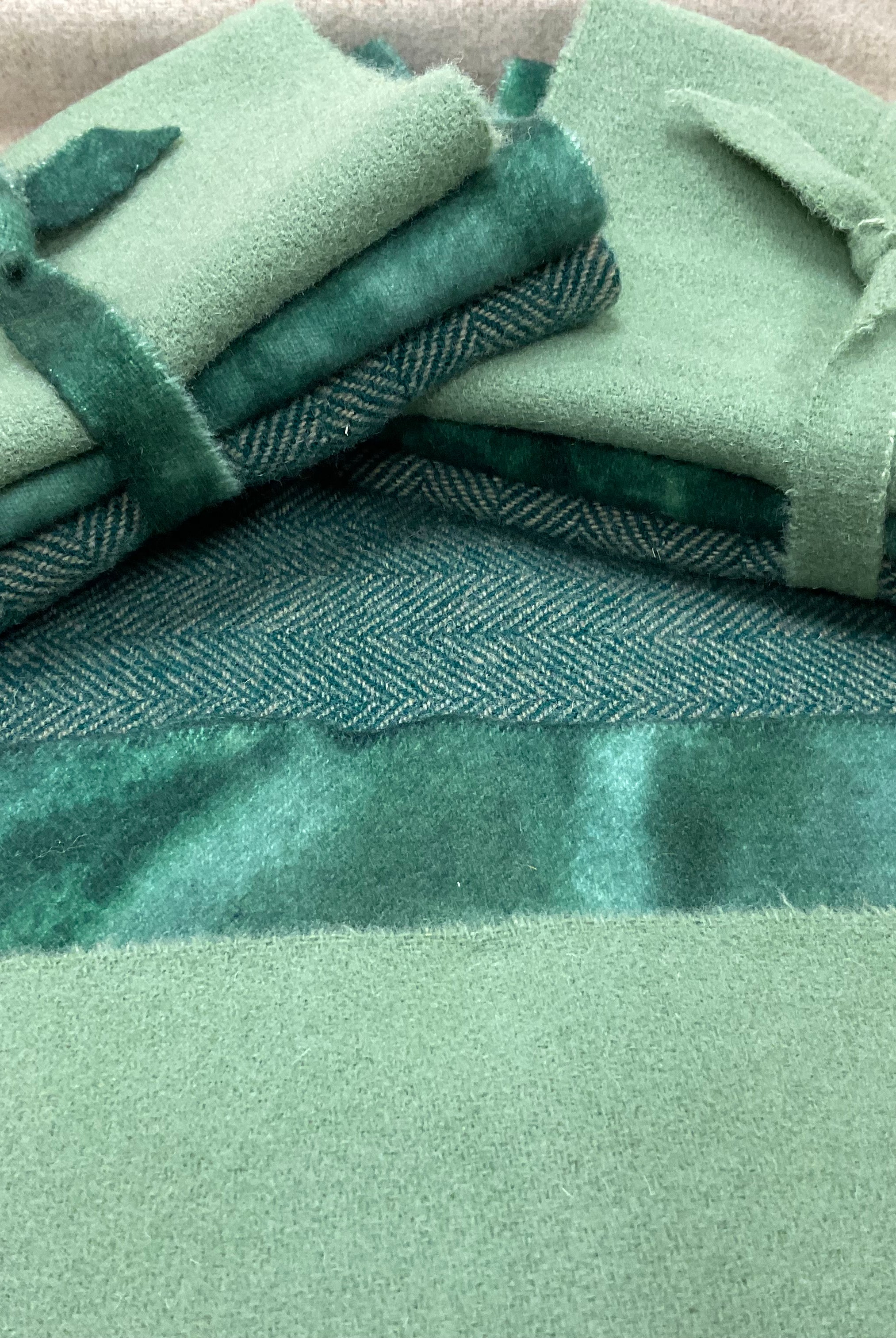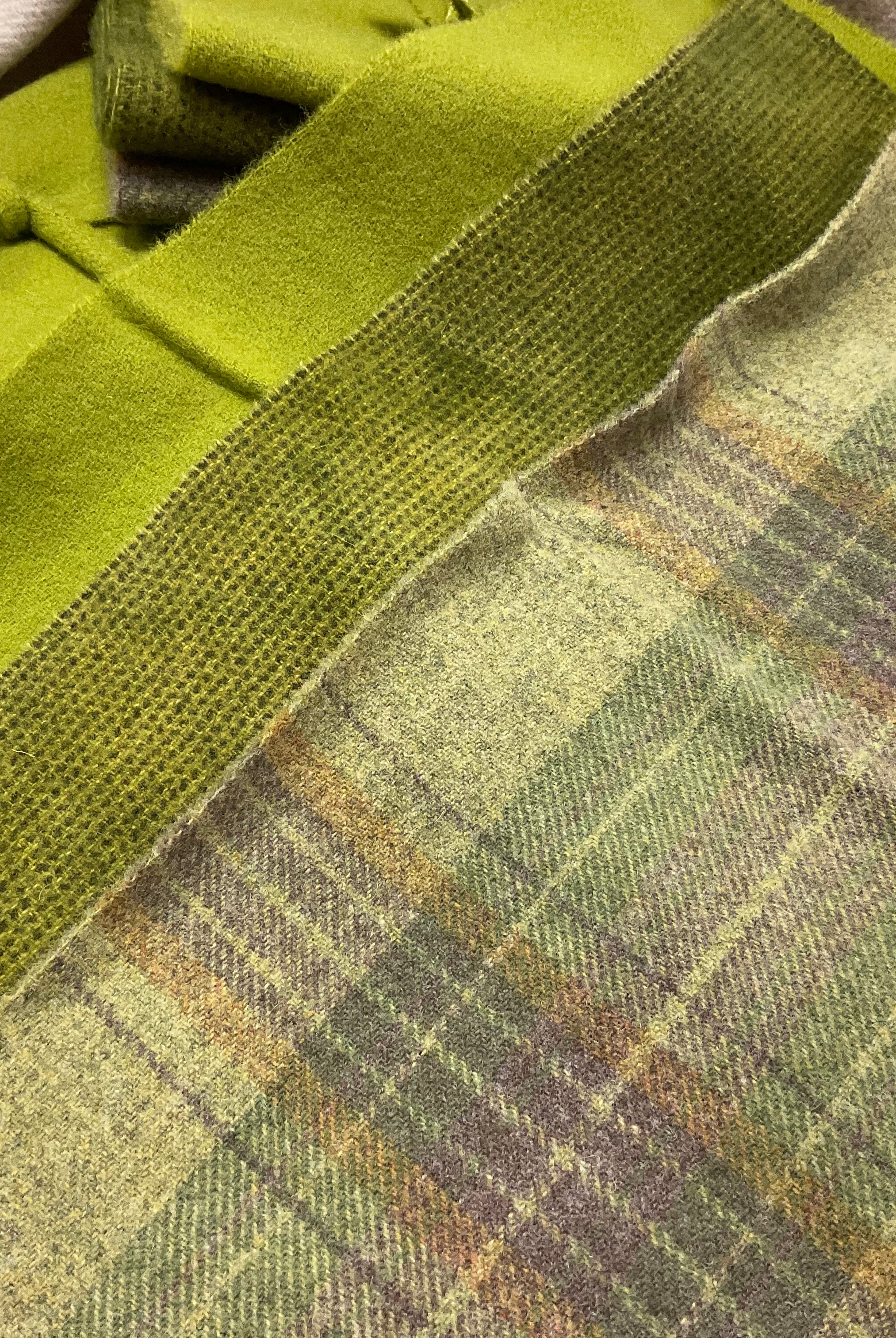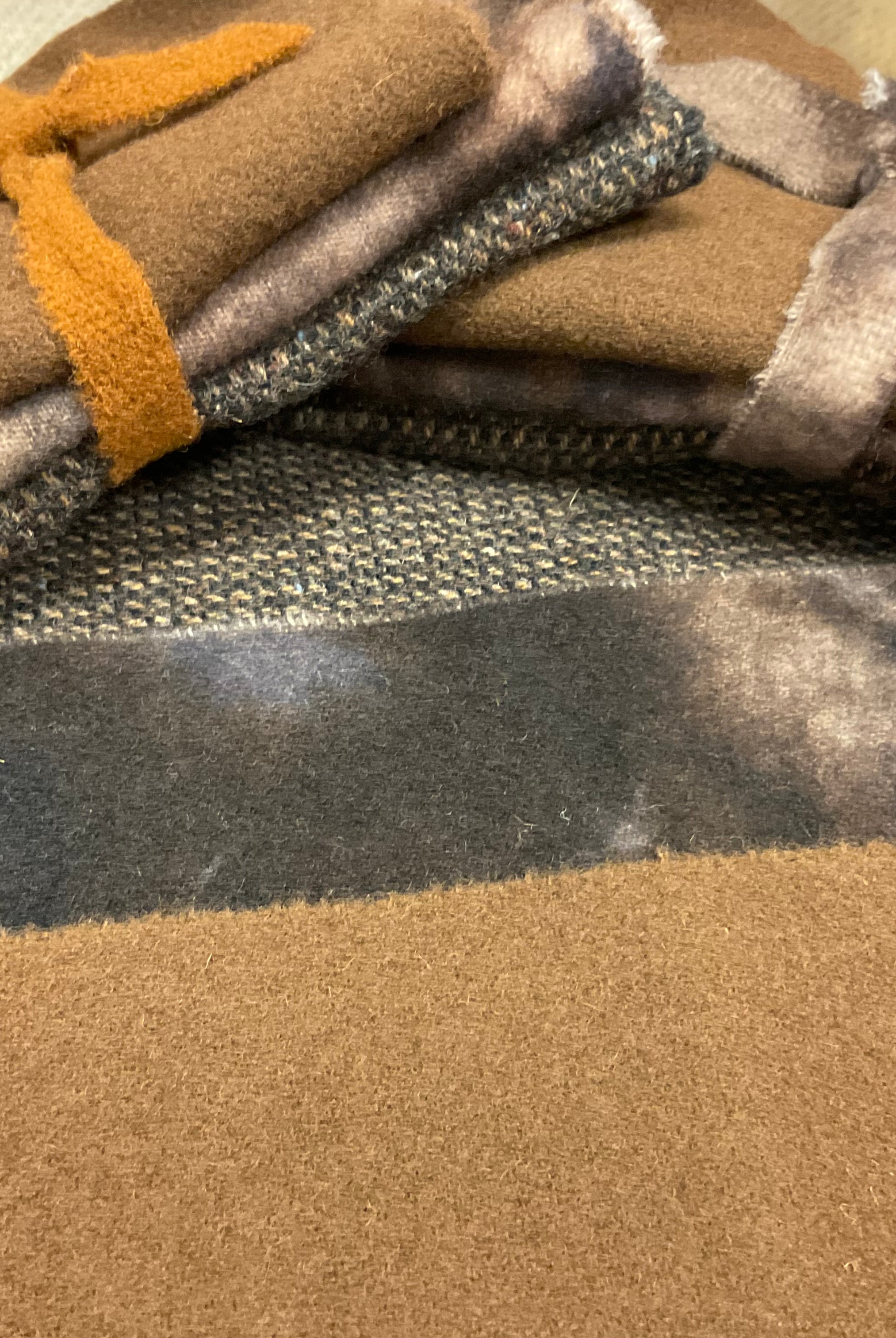 These fun bundles are all washed and ready to work with, they are a fat 1/16 of a washed as is wool 7.5x17, an over dyed wool roughly 7.5x17 and a solid 5.5x17 from the Rebekah Smith wools. We have picked 3 coordinating Vadani threads in #8 to go with your stitching if you like. Threads will be chosen to coordinate with the wools in the bundles.