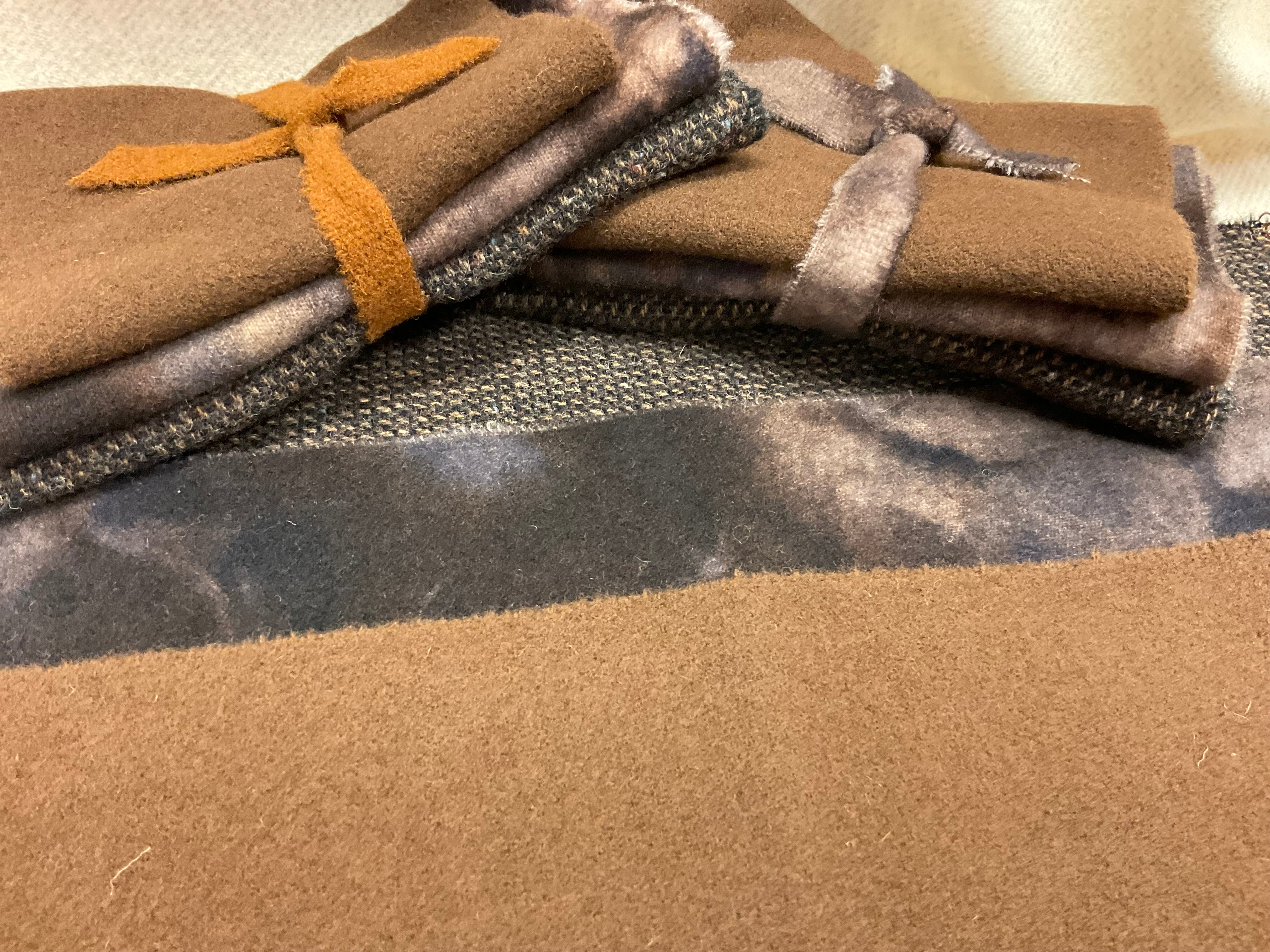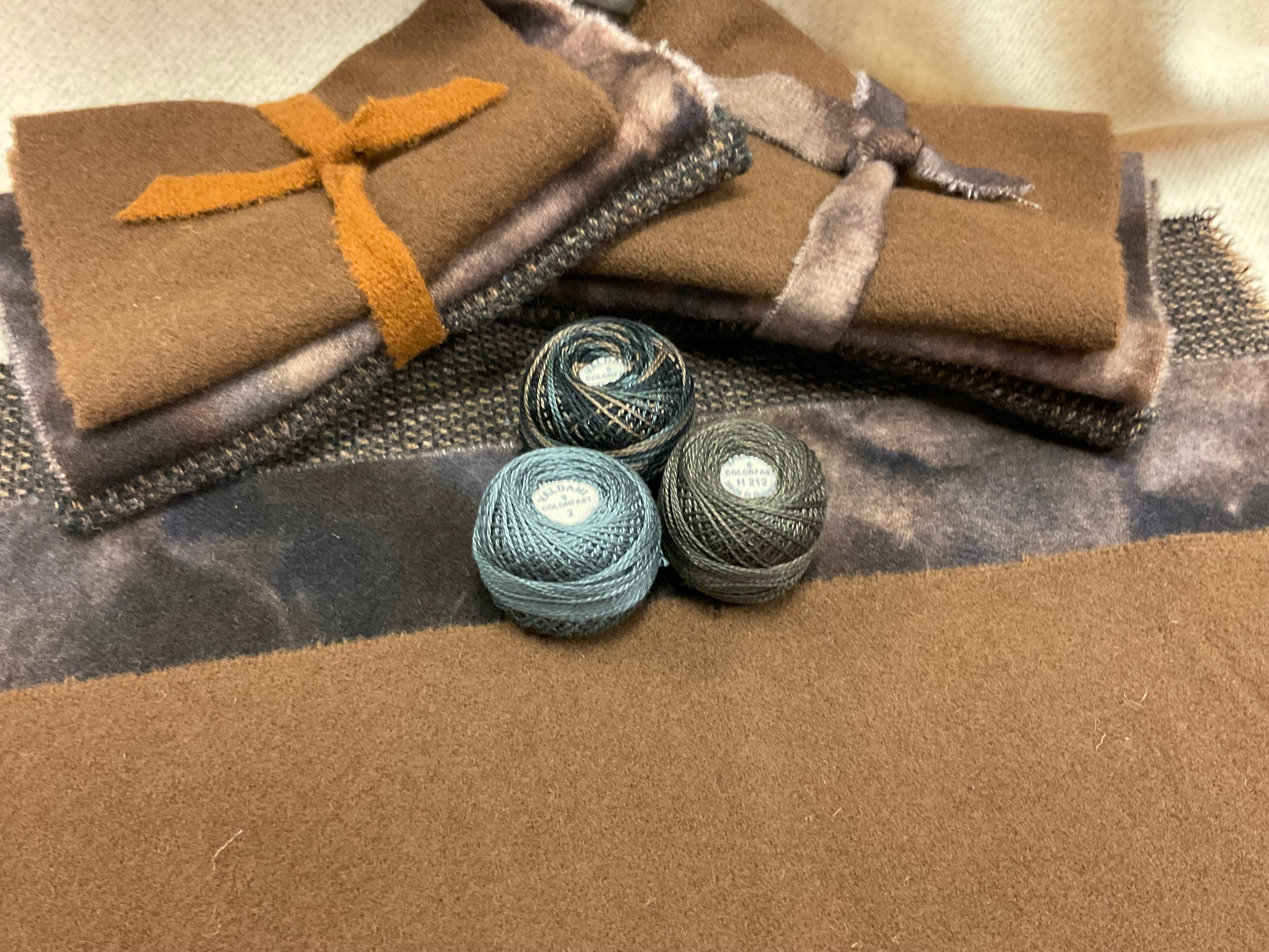 Our newest Bundle of washed wools ready to work with! These are fat 1/16 of a washed as is wool 7.5x17, an over dyed wool roughly 7.5x17 and a solid 5.5x17 from the Rebekah Smith wools. We have picked 3 coordinating valdani threads in #8 to go with your stitching if you like.