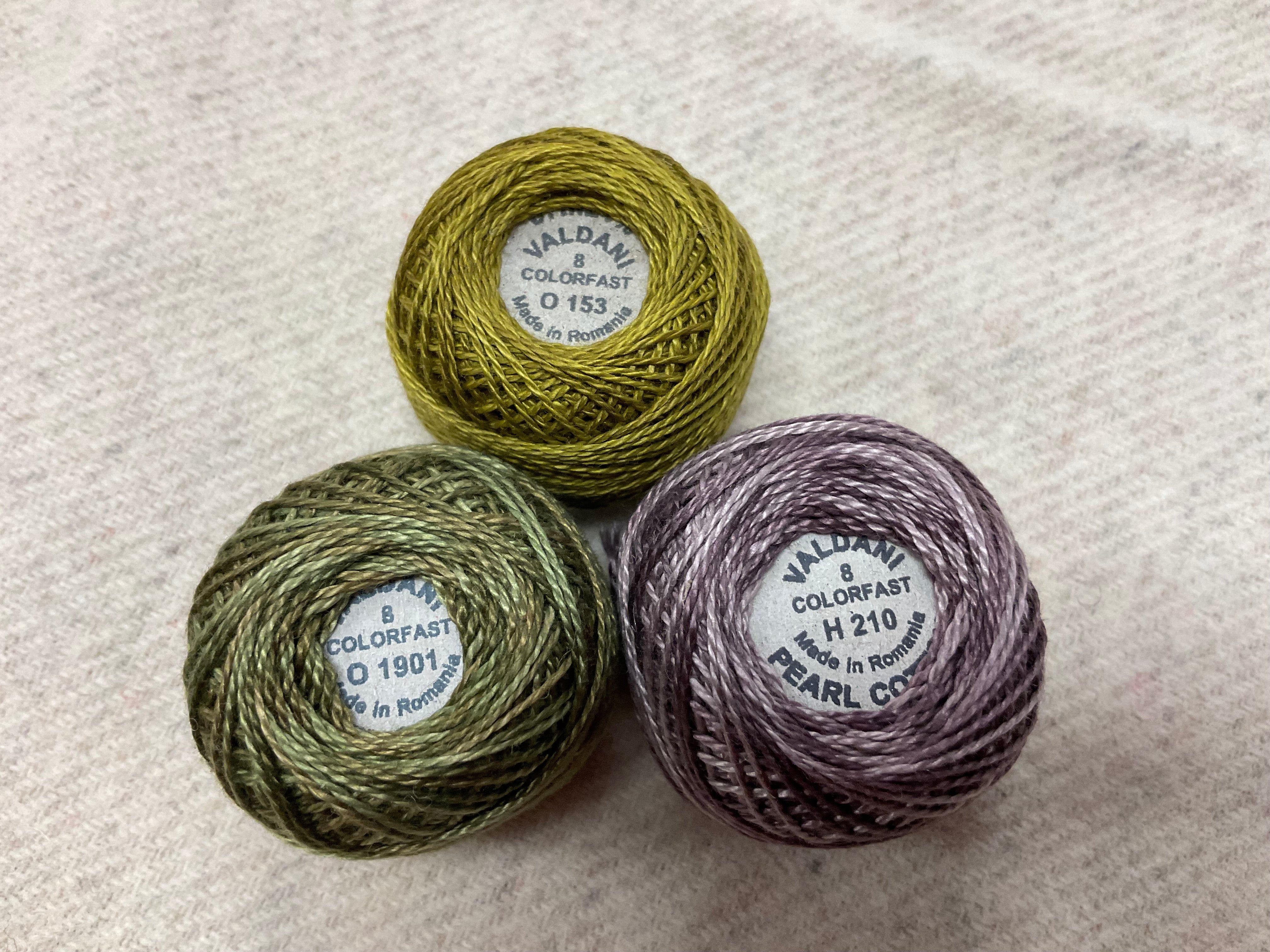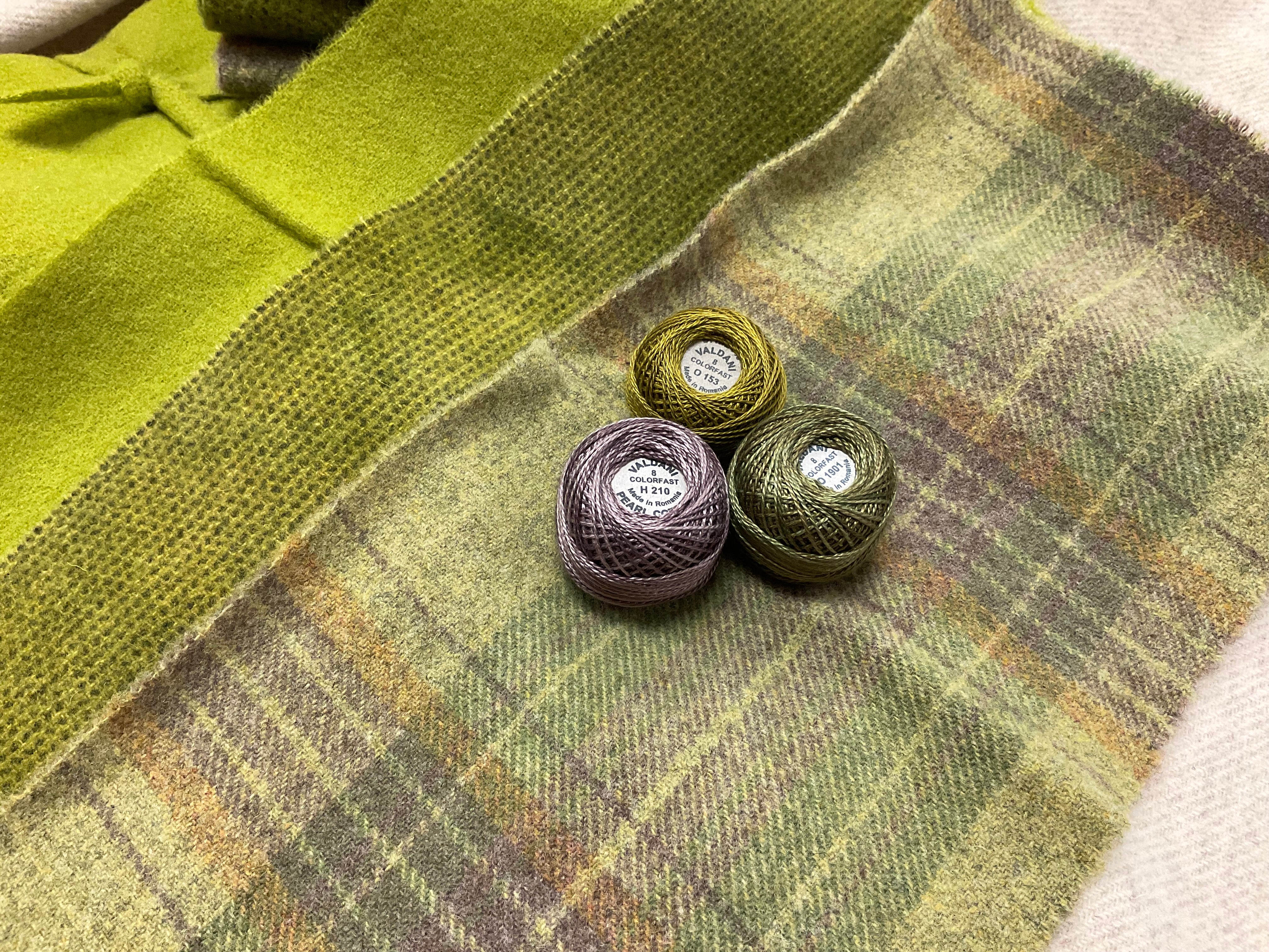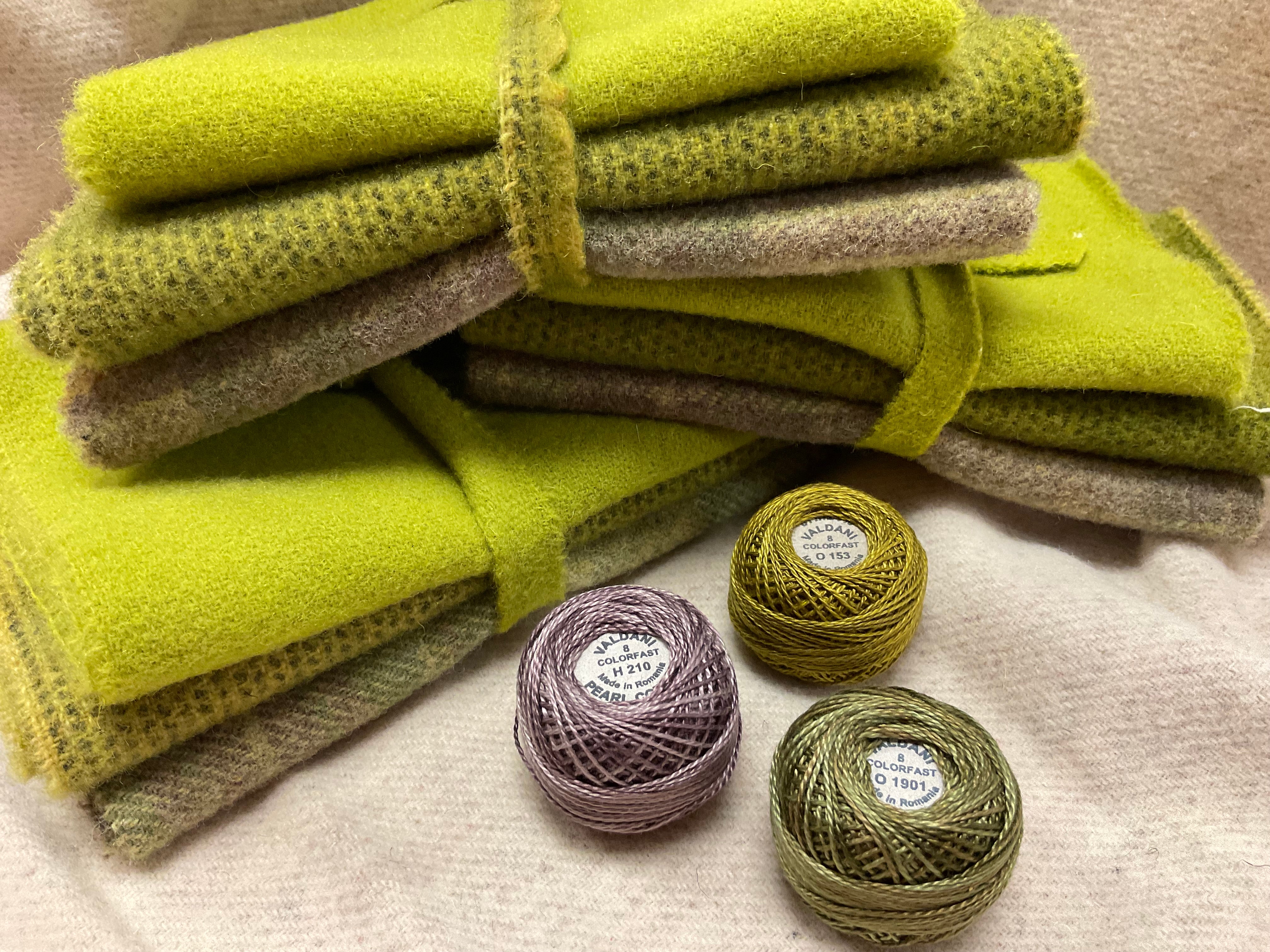 Our newest Bundle of washed wools ready to work with! These are fat 1/16 of a washed as is wool 7.5x17, an over dyed wool roughly 7.5x17 and a solid 5.5x17 from the Rebekah Smith wools. We have picked 3 coordinating valdani threads in #8 to go with your stitching if you like.