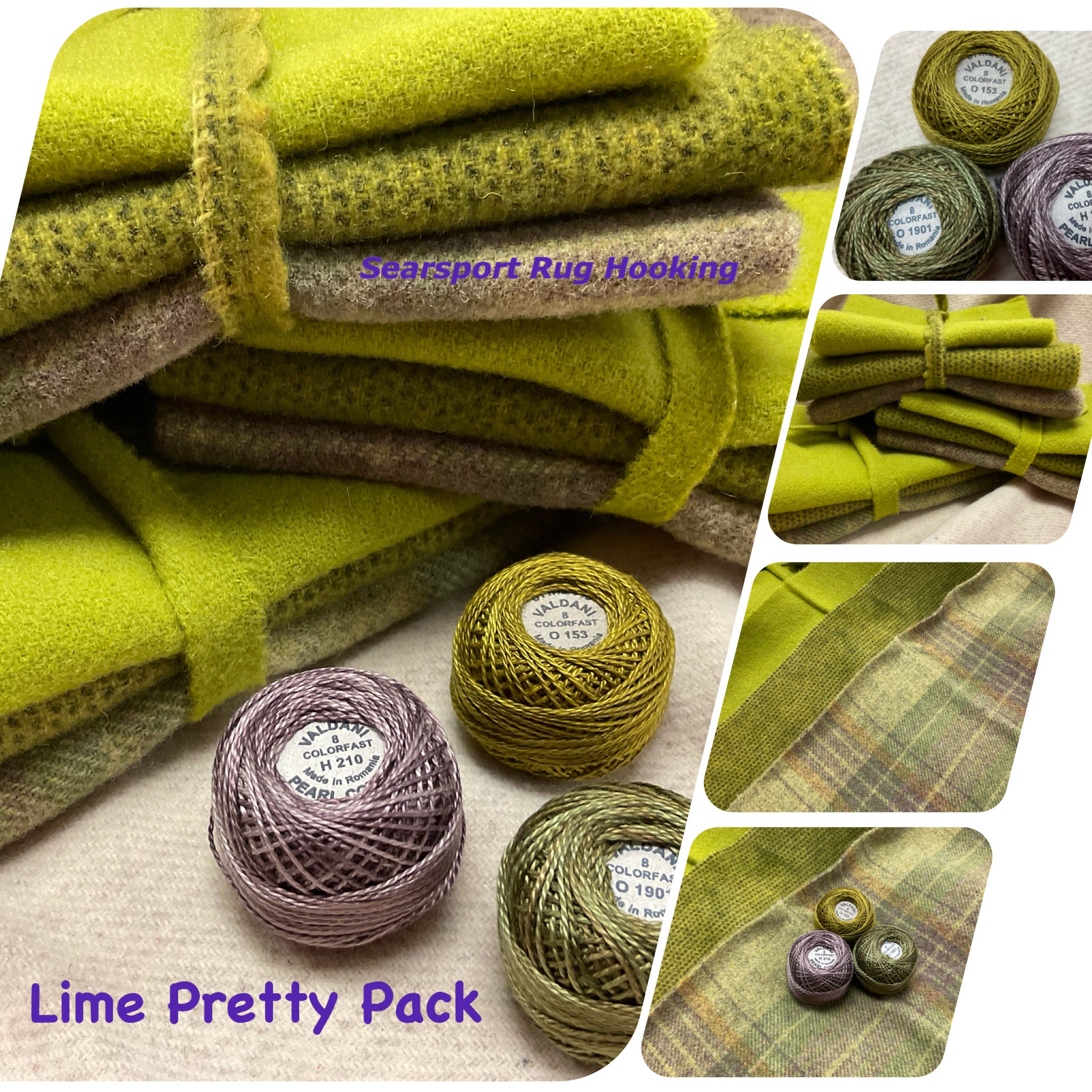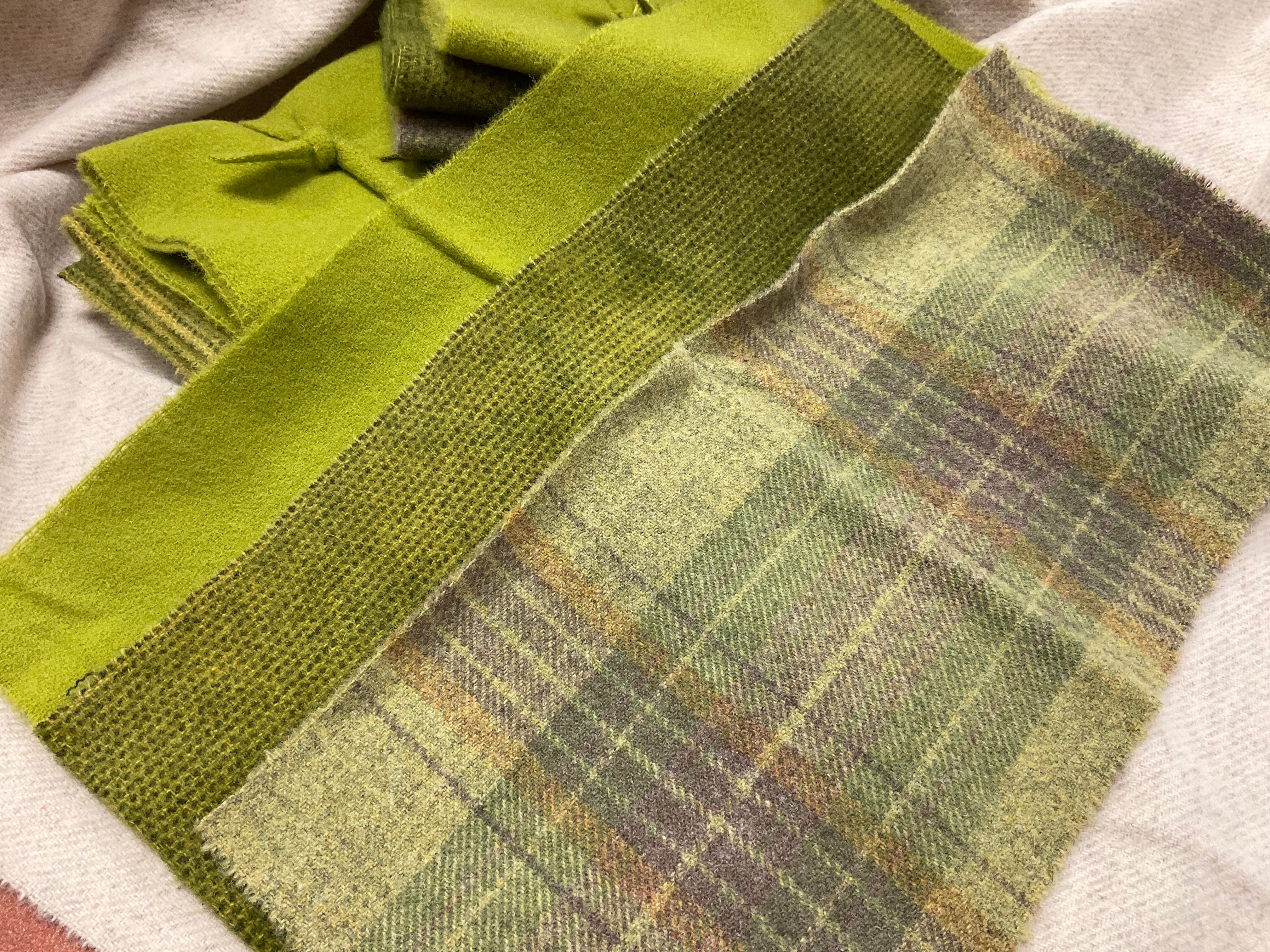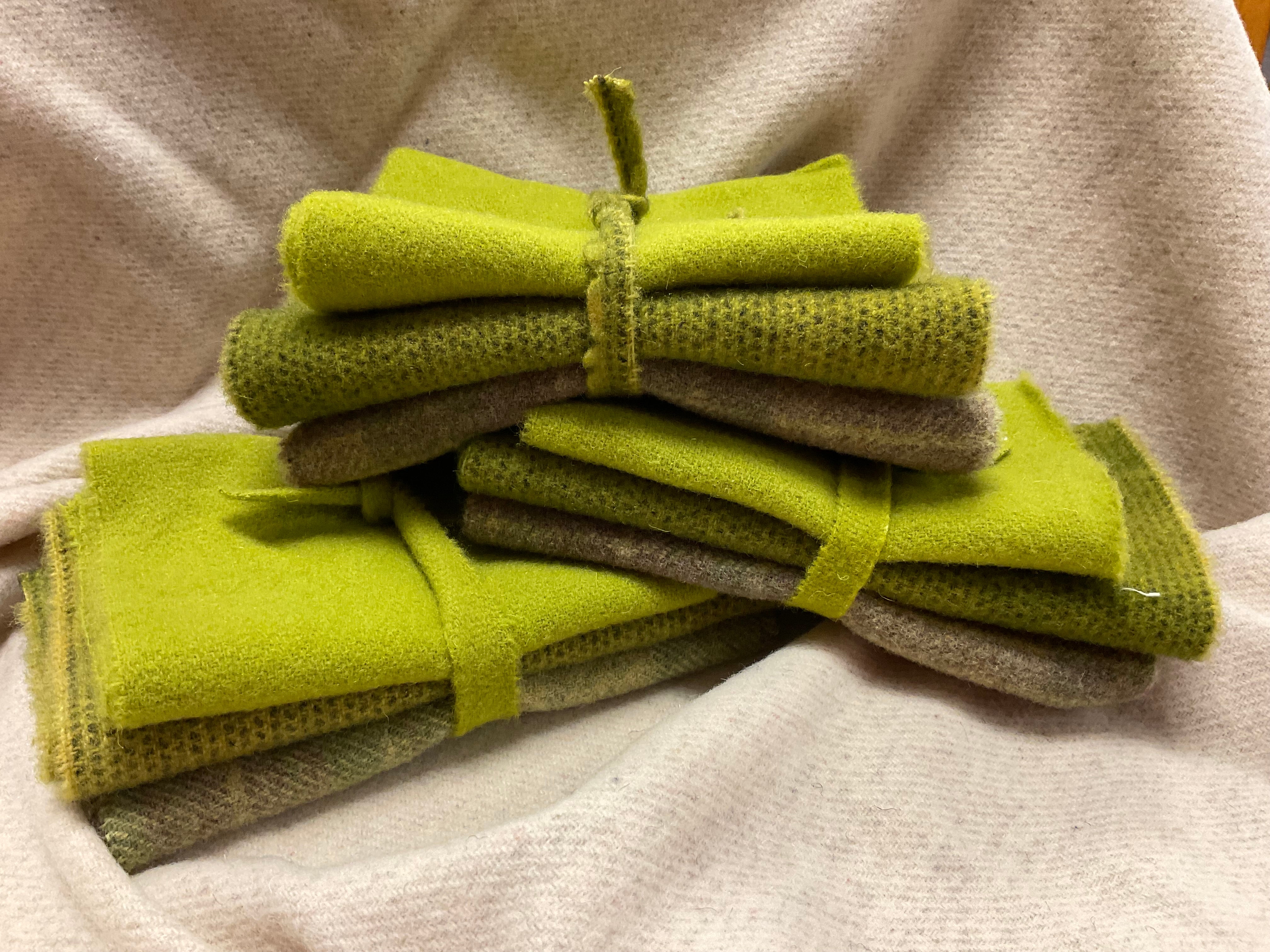Our newest Bundle of washed wools ready to work with! These are fat 1/16 of a washed as is wool 7.5x17, an over dyed wool roughly 7.5x17 and a solid 5.5x17 from the Rebekah Smith wools. We have picked 3 coordinating valdani threads in #8 to go with your stitching if you like.