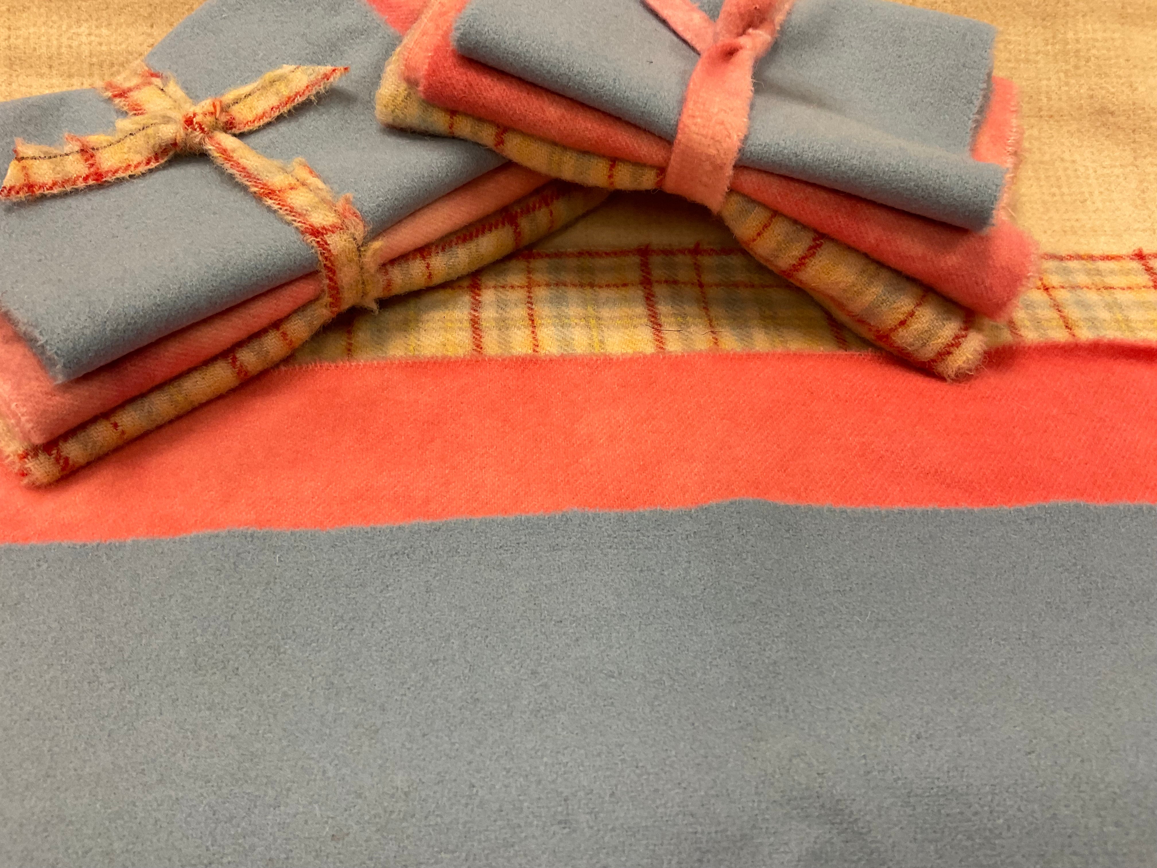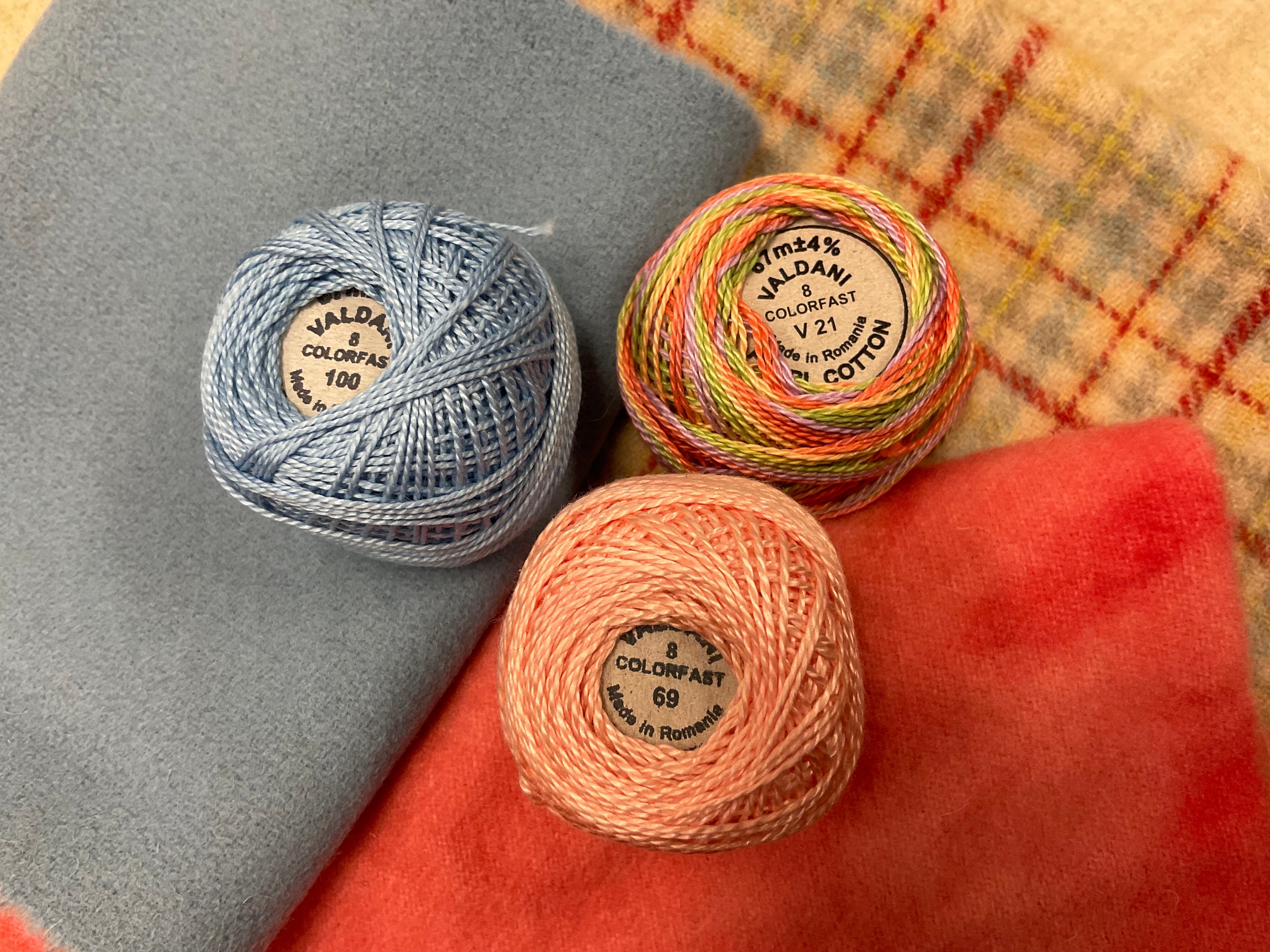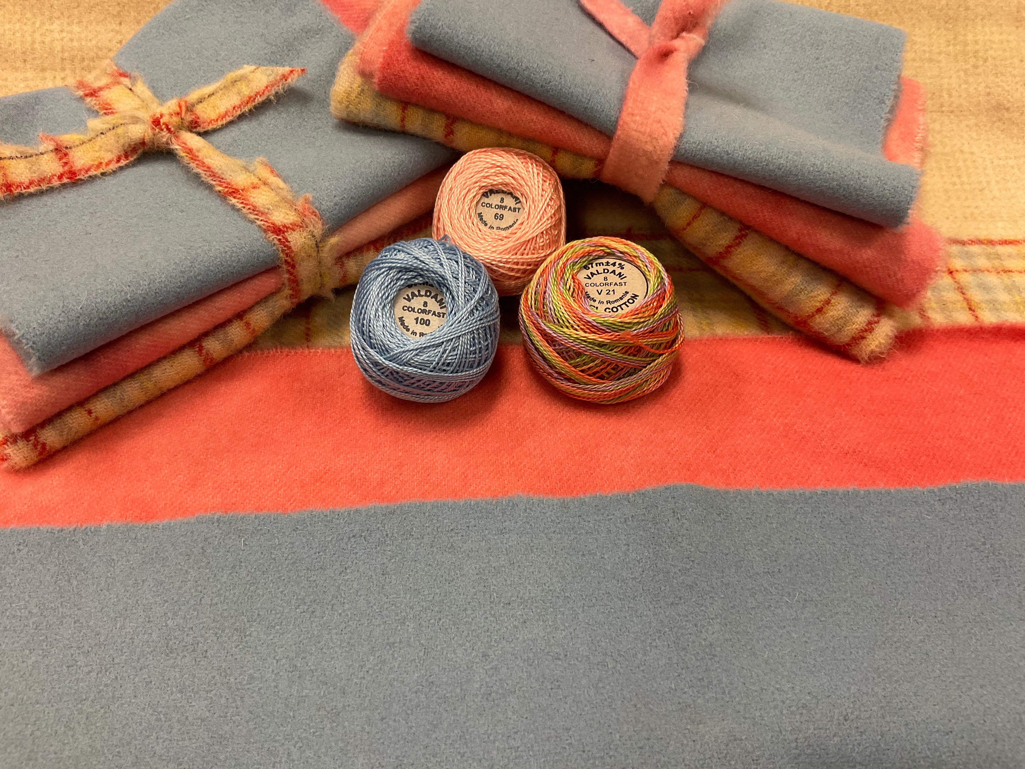 Our newest Bundle of washed wools ready to work with! These are fat 1/16 of a washed as is wool 7.5x17, an over dyed wool roughly 7.5x17 and a solid 5.5x17 from the Rebekah Smith wools. We have picked 3 coordinating valdani threads in #8 to go with your stitching if you like. The blue in this bunch is a pretty soft blue not as gray as the picture looks