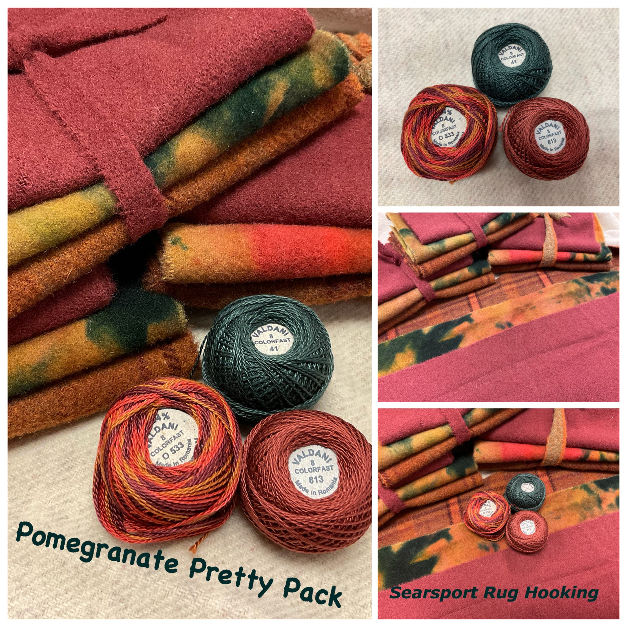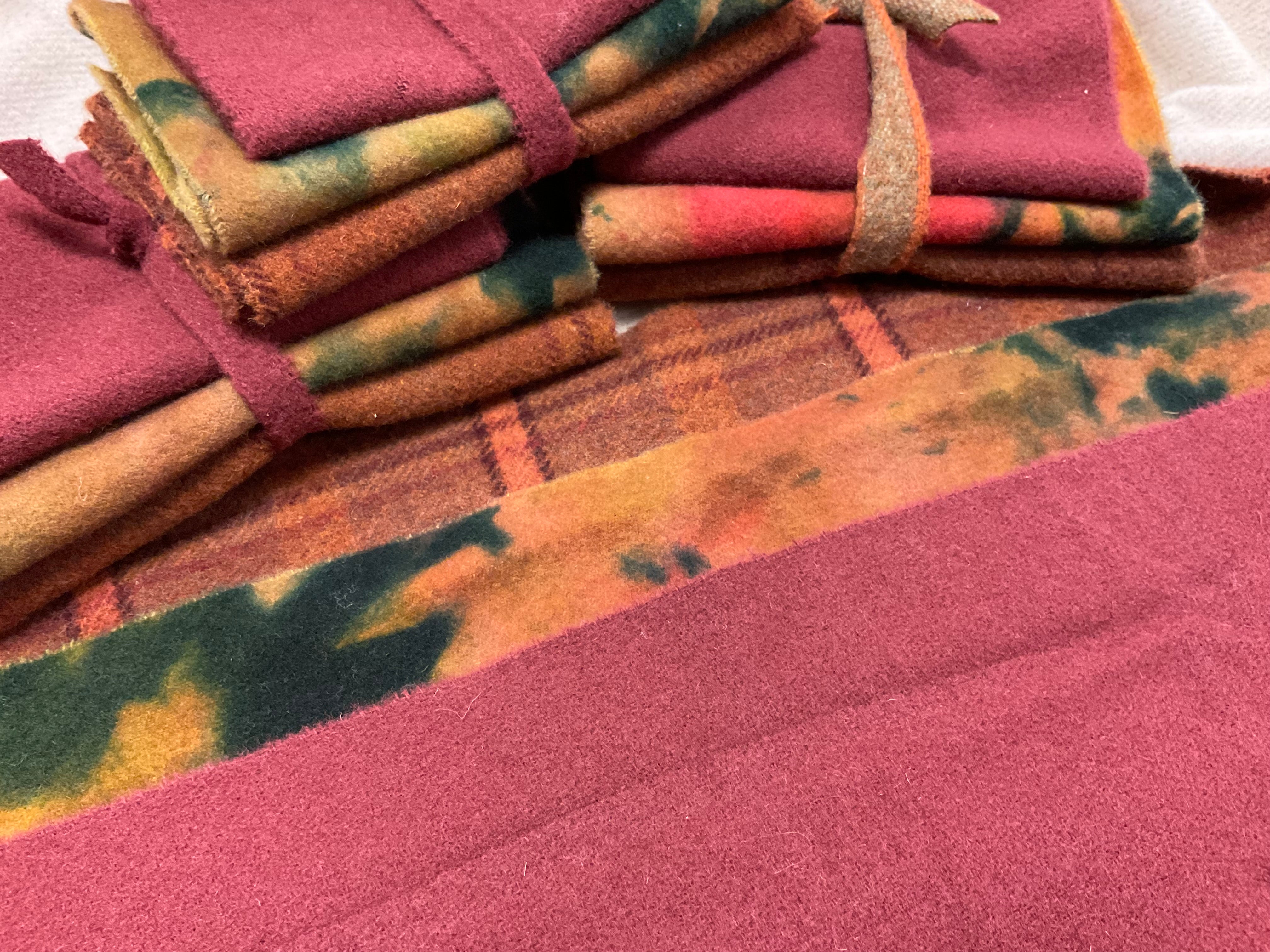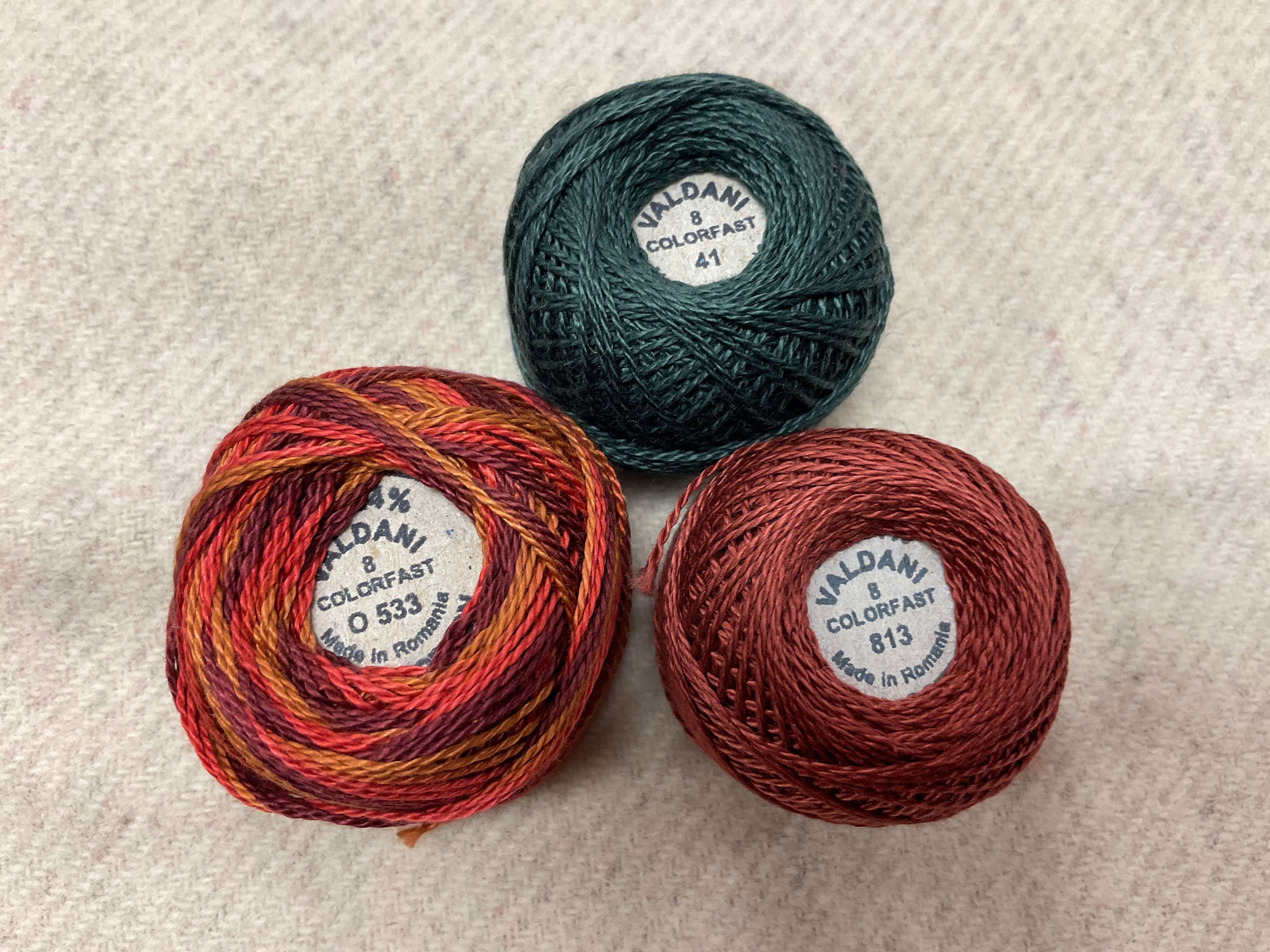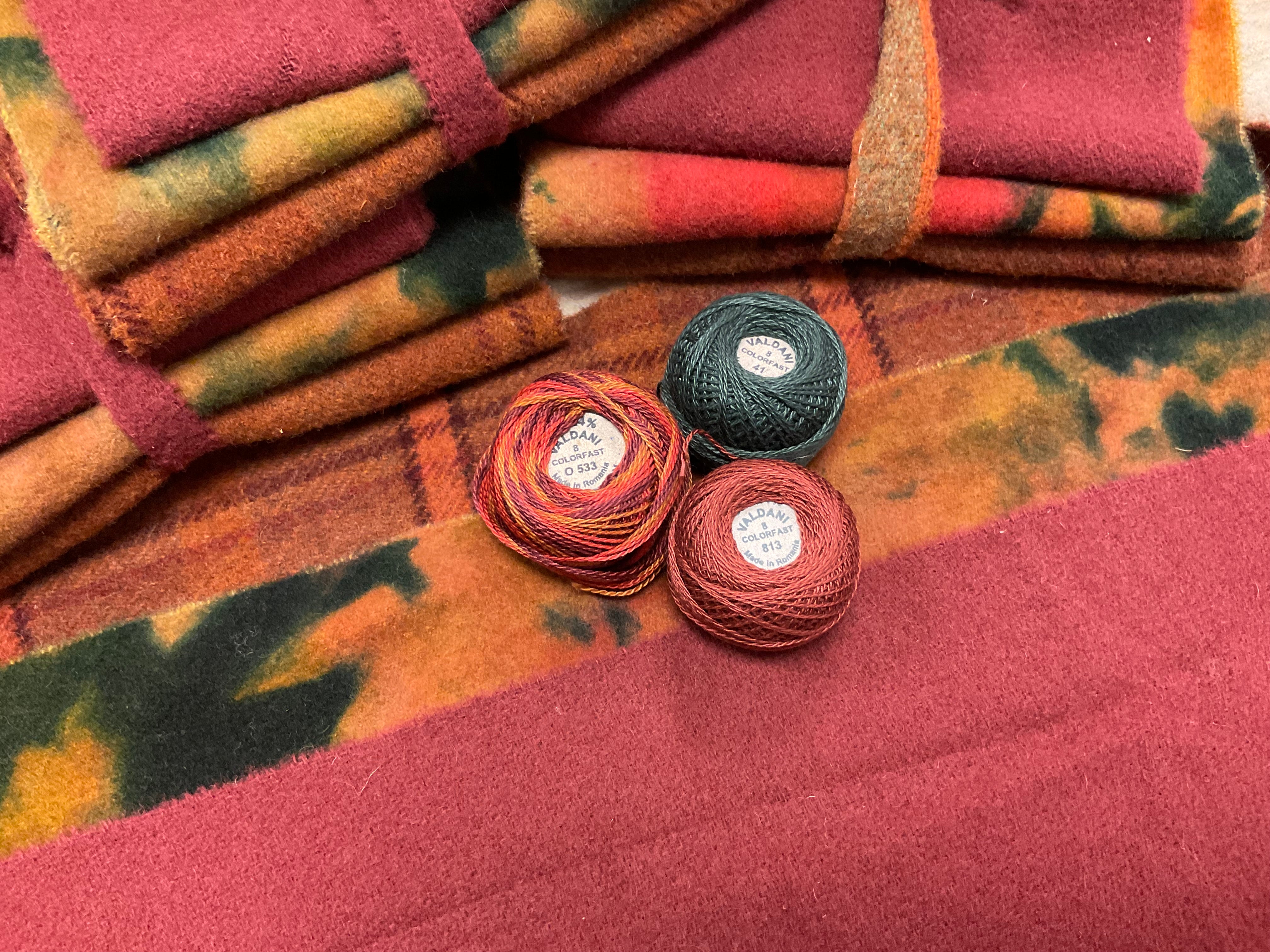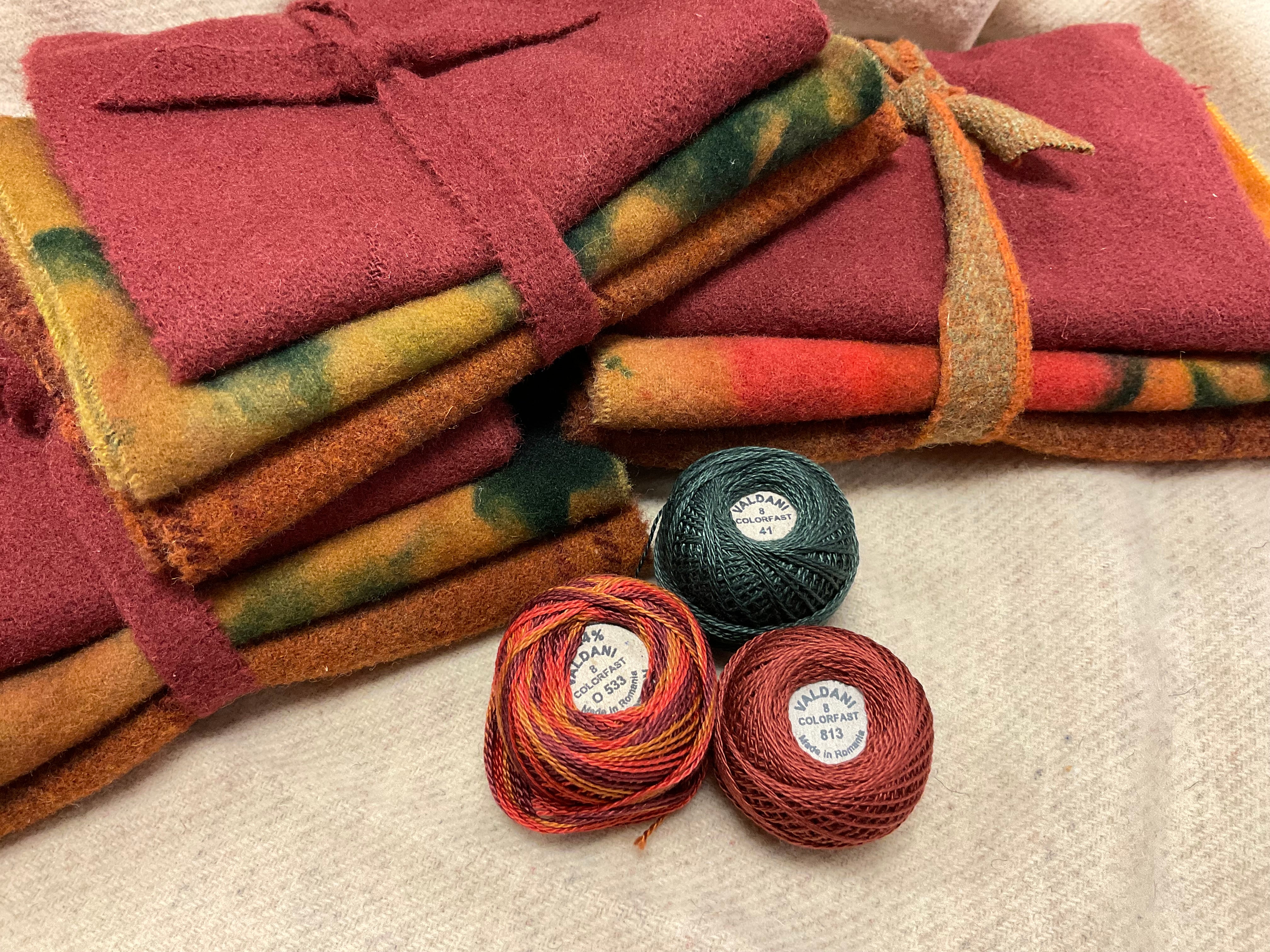 Our newest Bundle of washed wools ready to work with! These are a fat 1/16 of a washed as is wool 7.5x17, an over dyed wool roughly 7.5x17 and a solid 5.5x17 from the Rebekah Smith wools. We have picked 3 coordinating valdani threads in #8 to go with your stitching if you like.