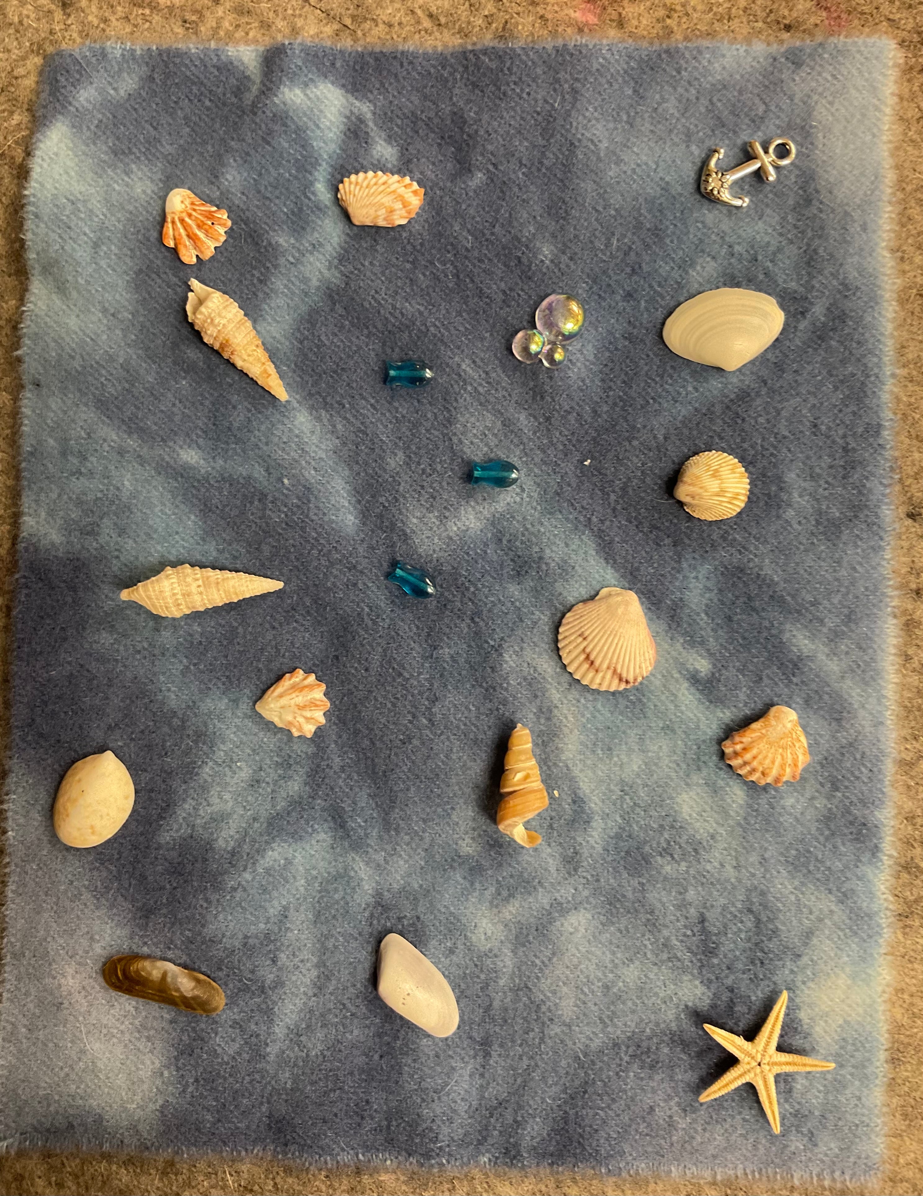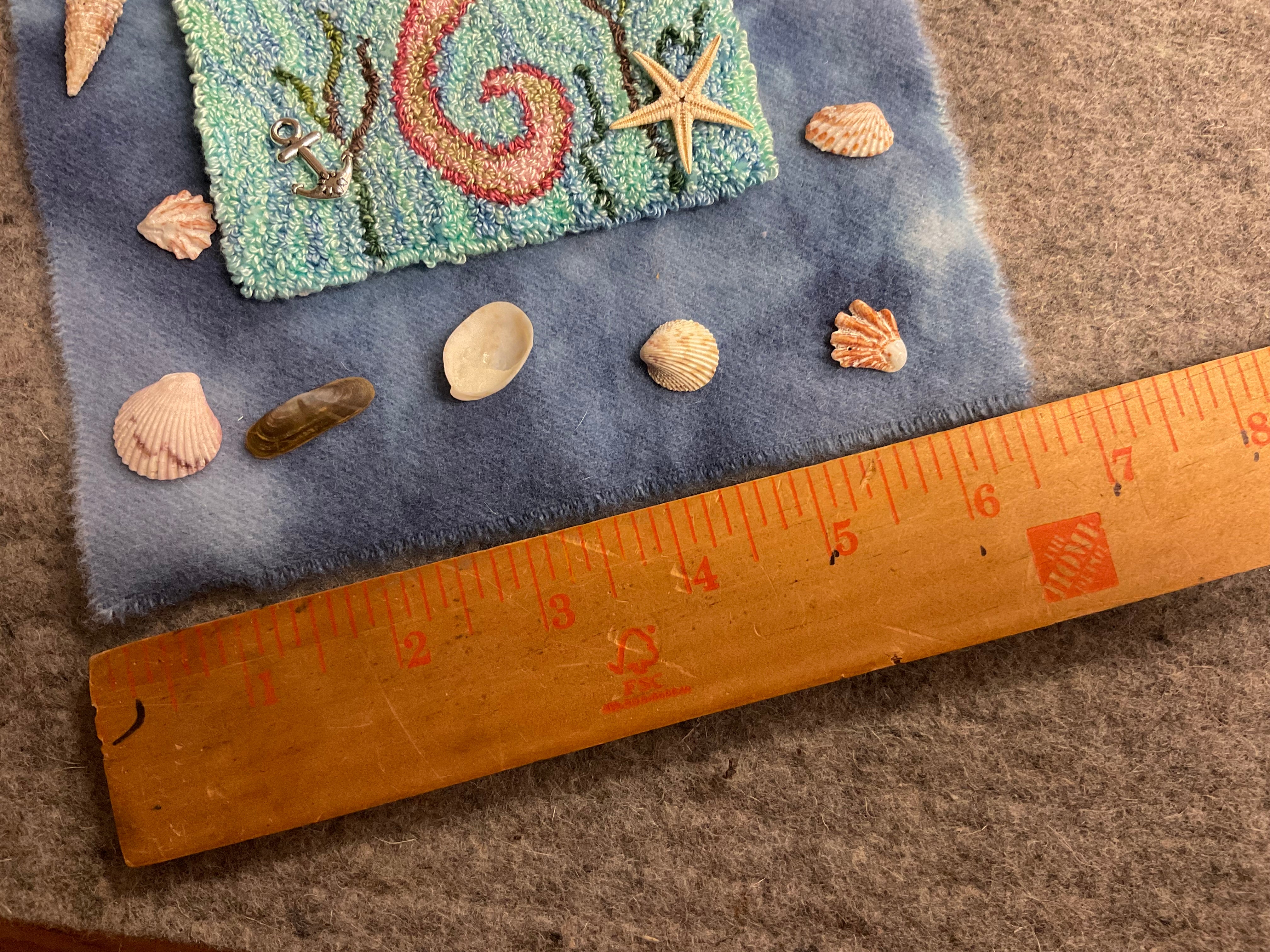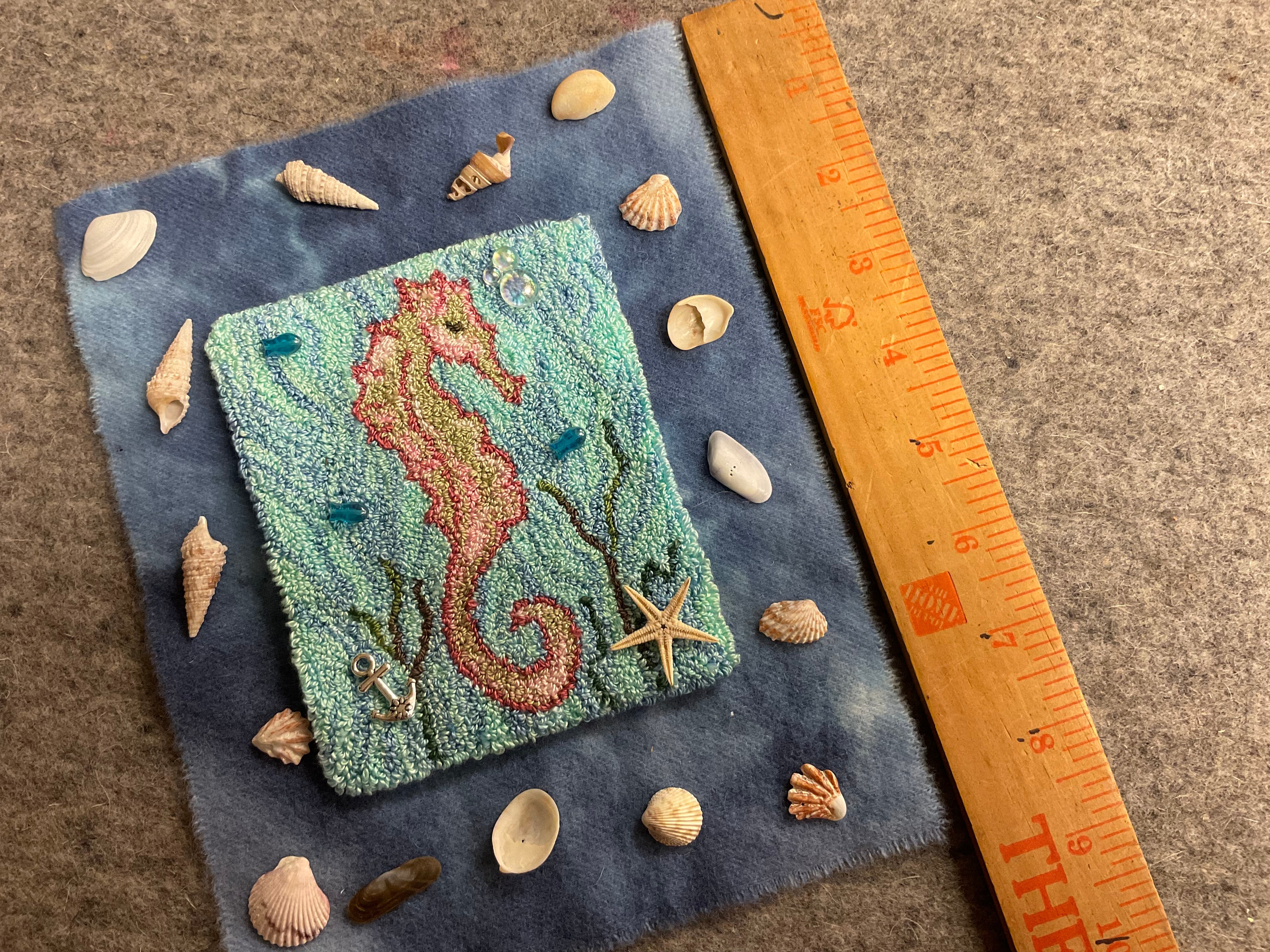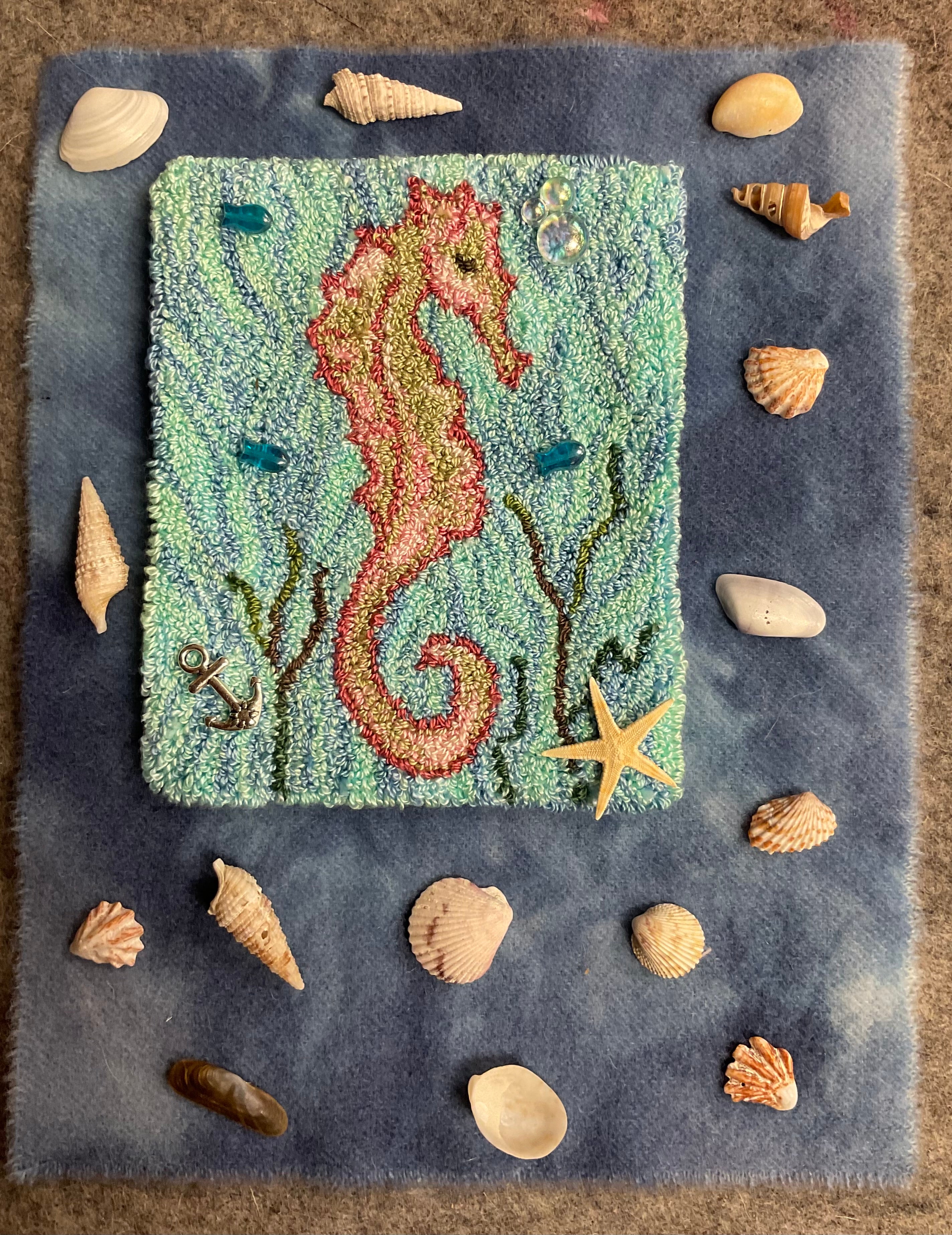 We have had requests for the wool and shells embellishments that we used on this piece so we have put together a limited pack. The wool in the pictures did not photograph true to color or even close really. It’s a pretty periwinkle blue that goes perfect with the periwinkle in the Varigated thread in the background water. The pack includes the wool, a silver charm, bubbles, three glass fish and assorted shells to mount and finish how ever you like.