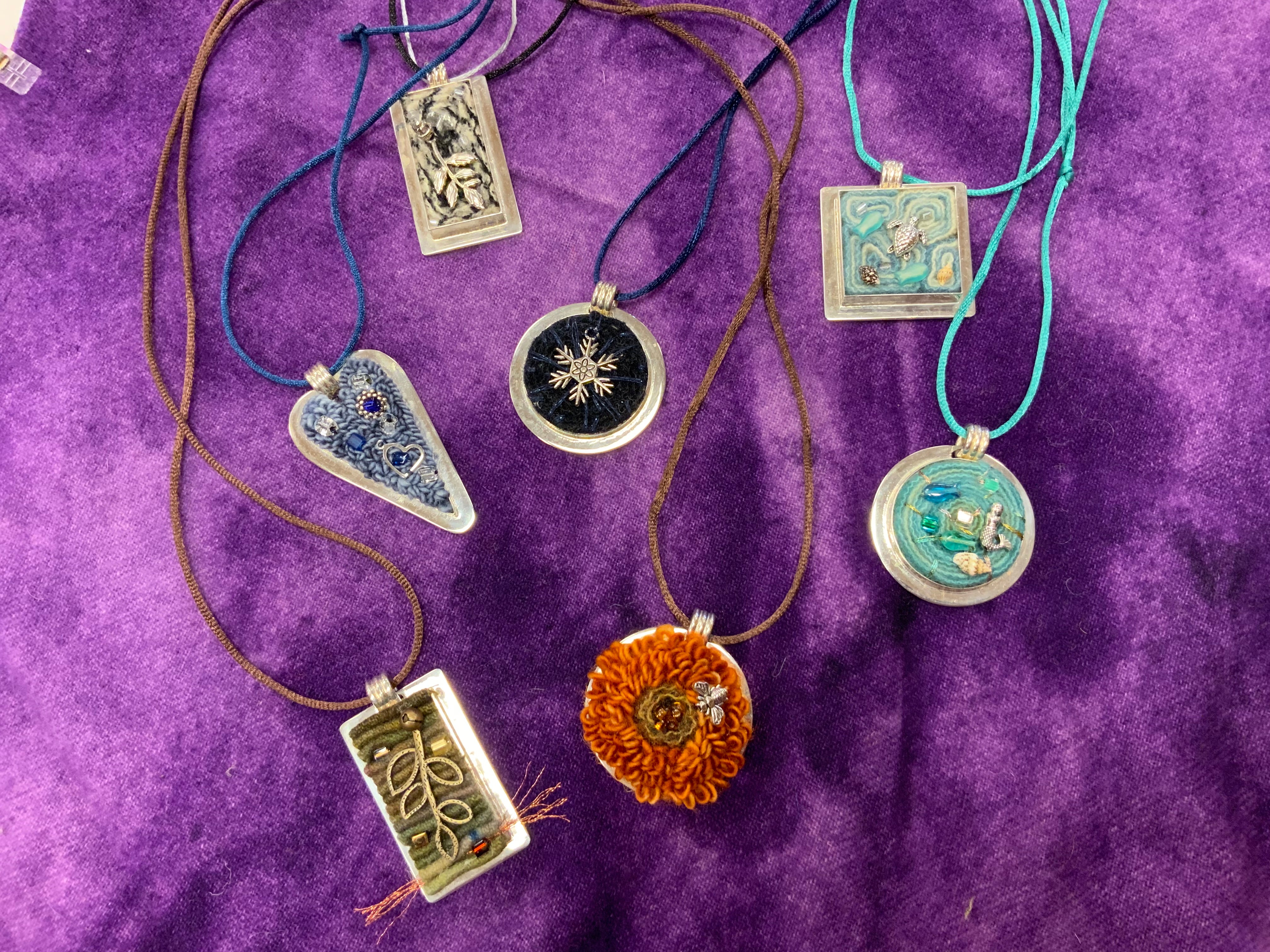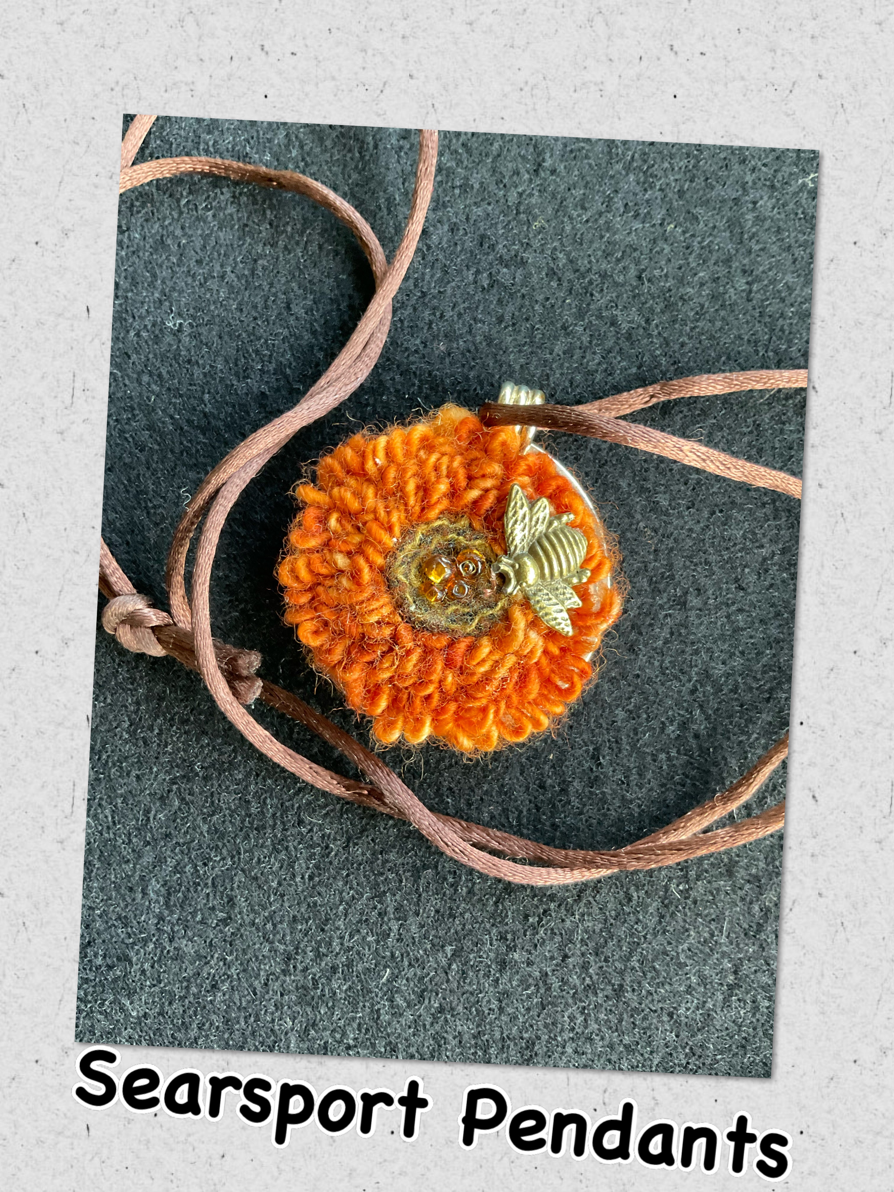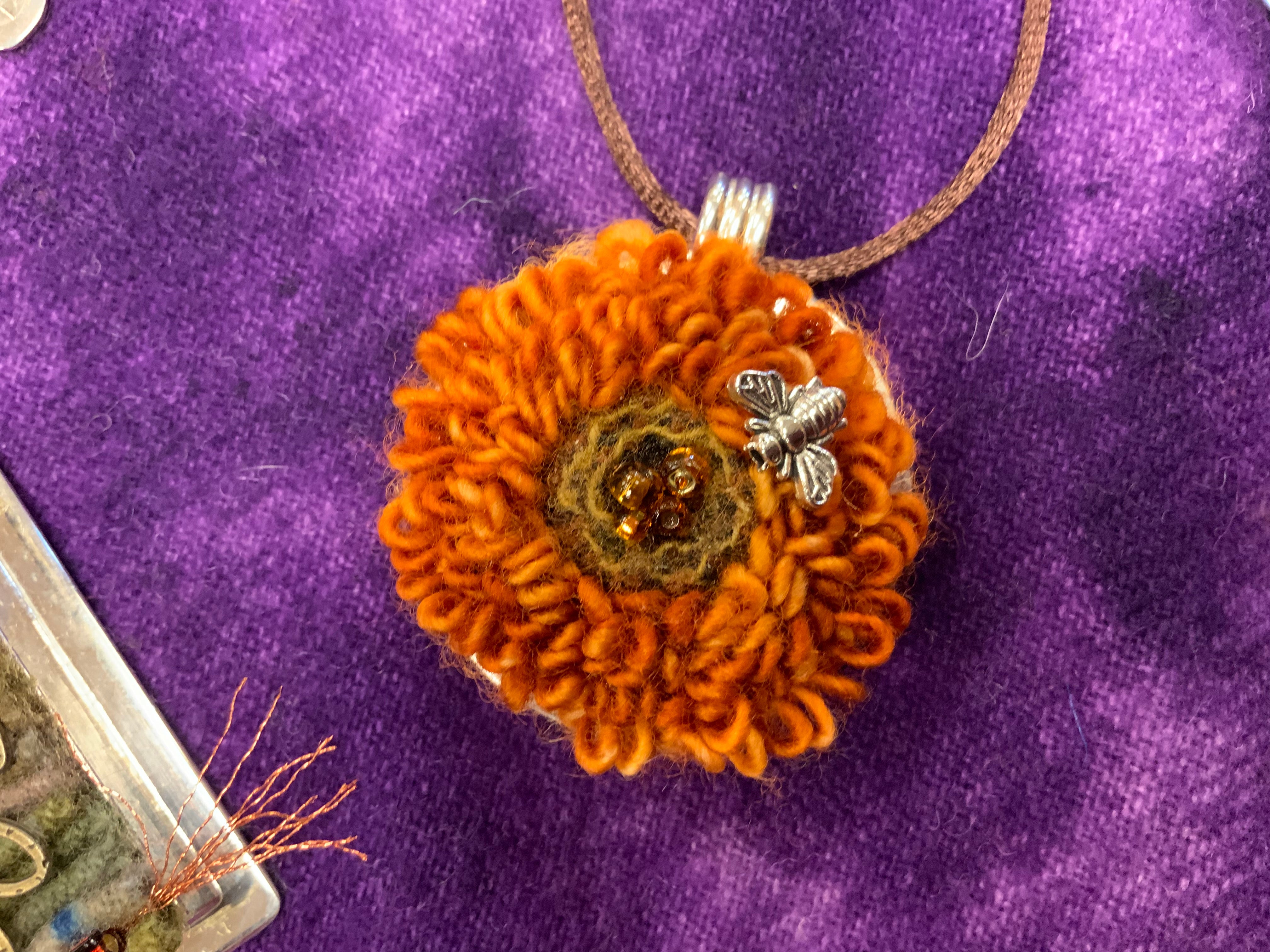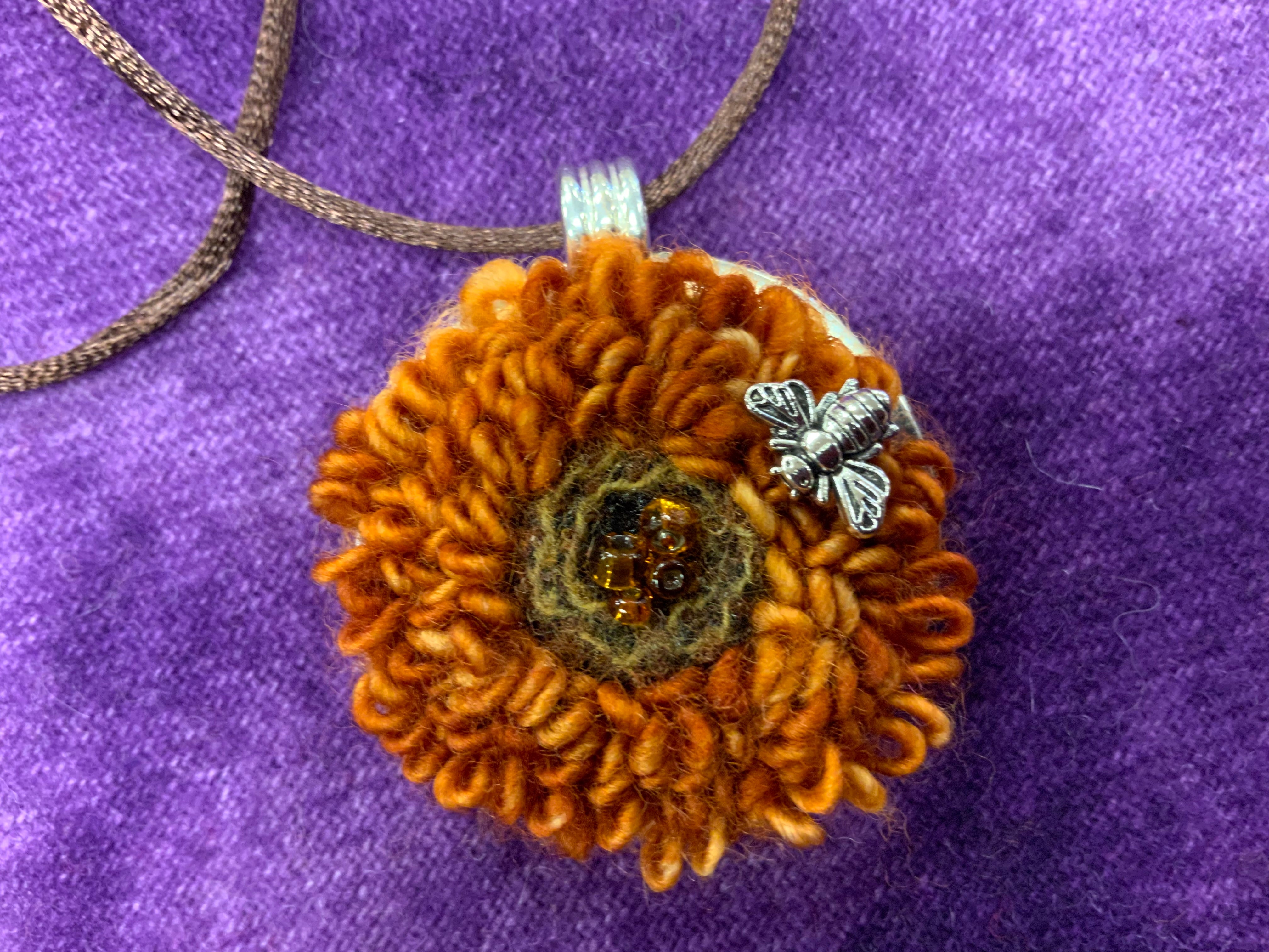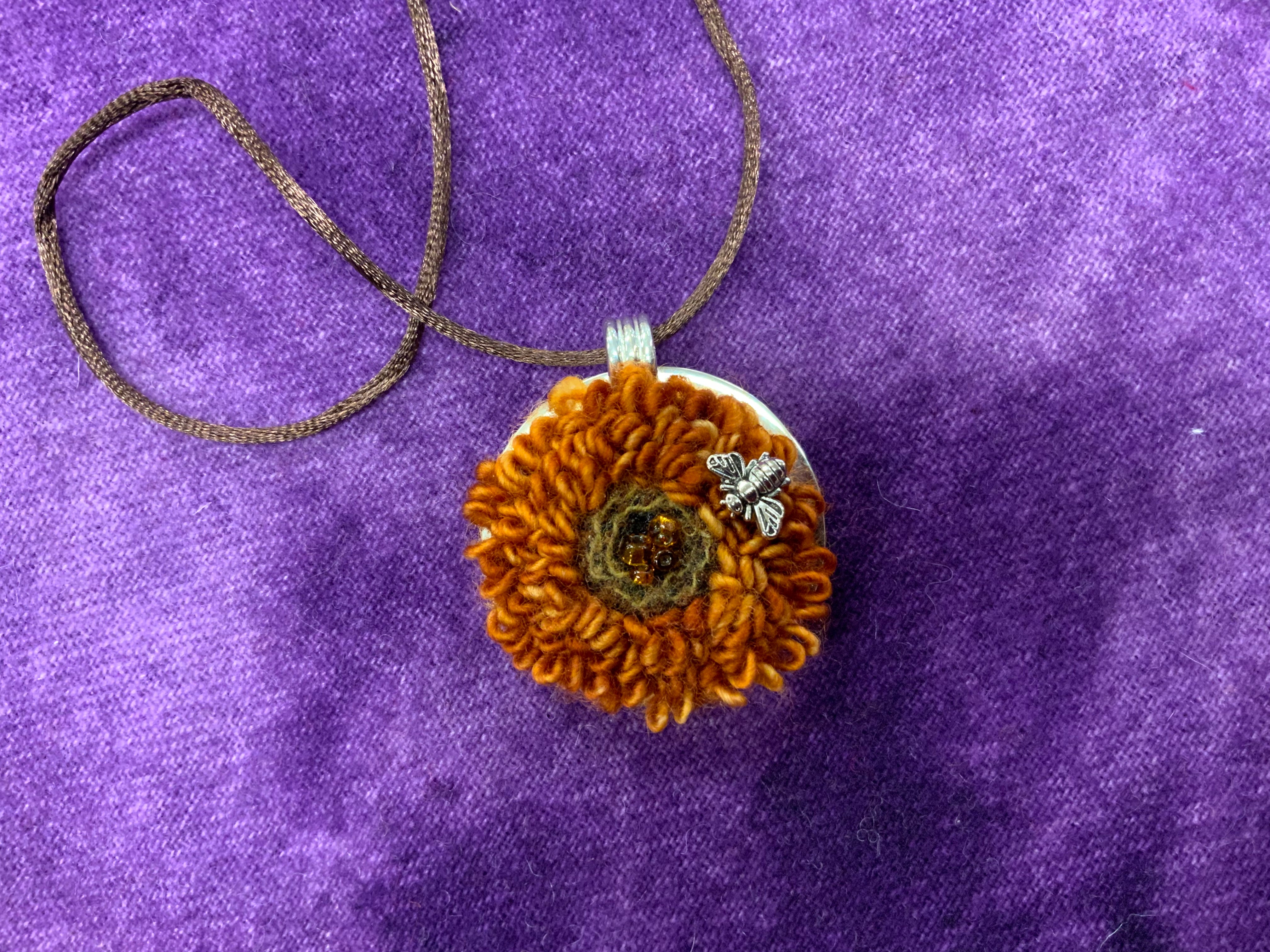 Your kit includes the round silver plate pendant, your pattern drawn on weavers cloth, hand dyed rusty/golden/orange merino wool, a strip of brown wool for your center Quilly, glass beads, the bee charm, a polishing cloth and brown rat tail for the necklace.