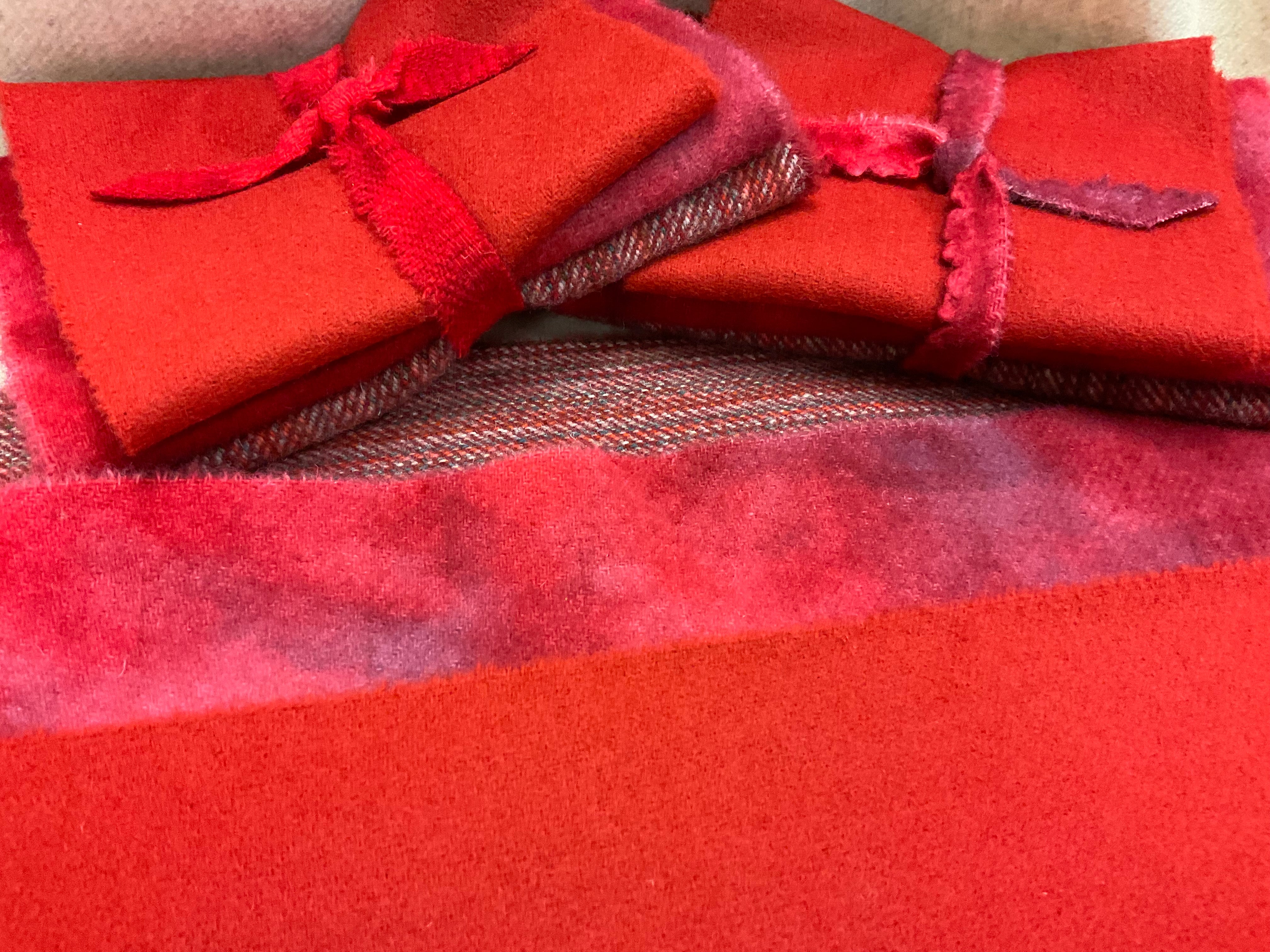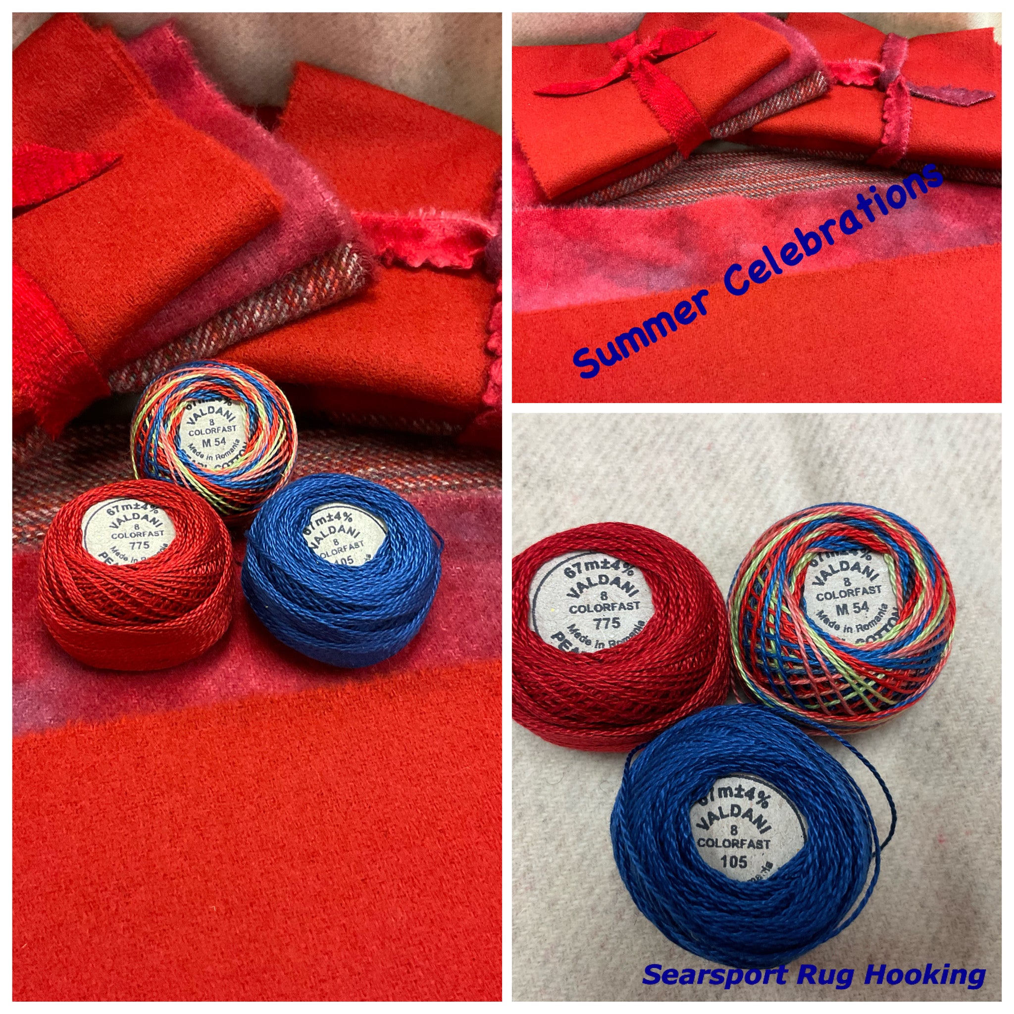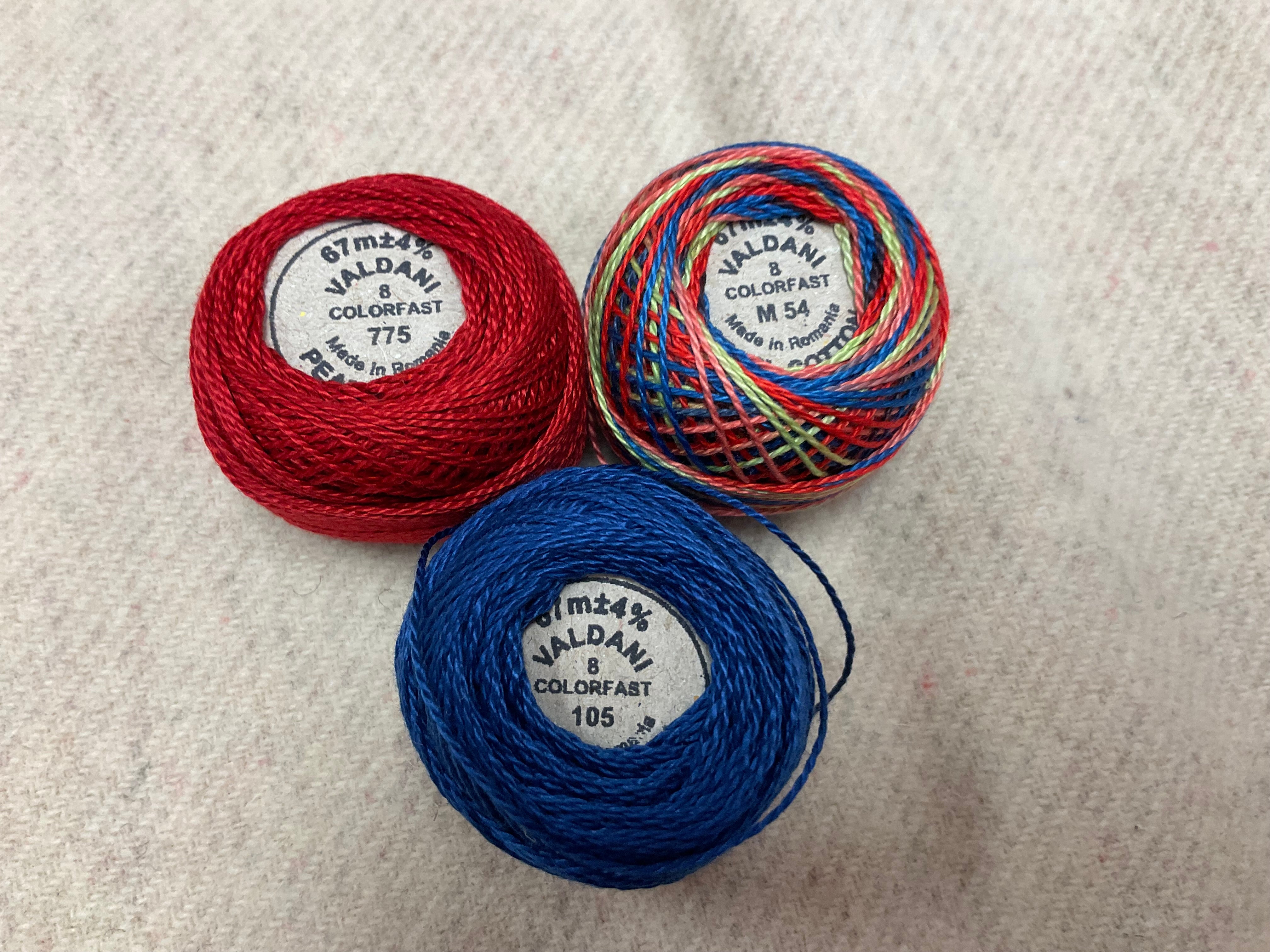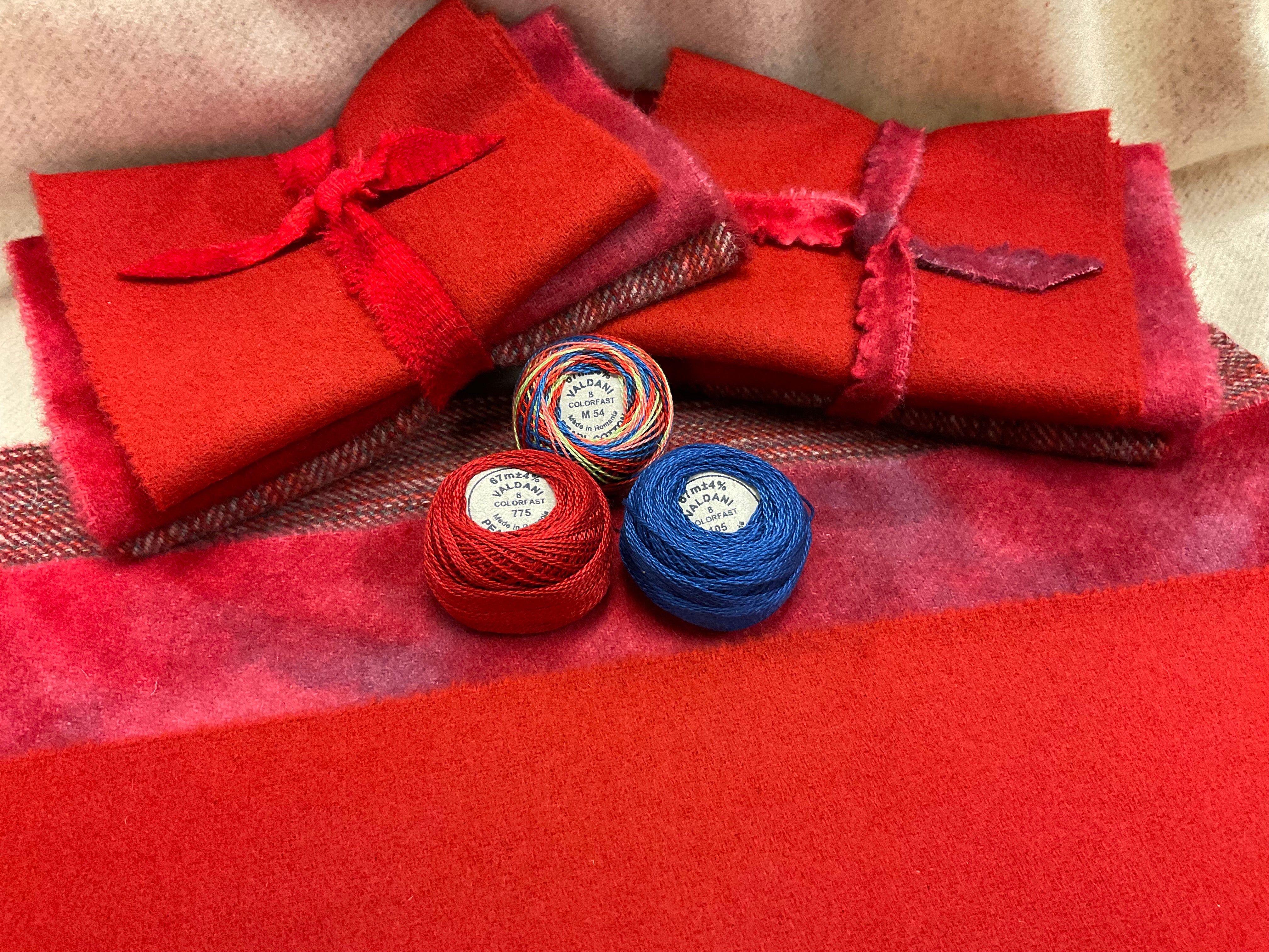 Our newest Bundle of washed wools ready to work with! These are fat 1/16 of a washed as is wool 7.5x17, an over dyed wool roughly 7.5x17 and a solid 5.5x17 from the Rebekah Smith wools. We have picked 3 coordinating valdani threads in #8 to go with your stitching if you like.