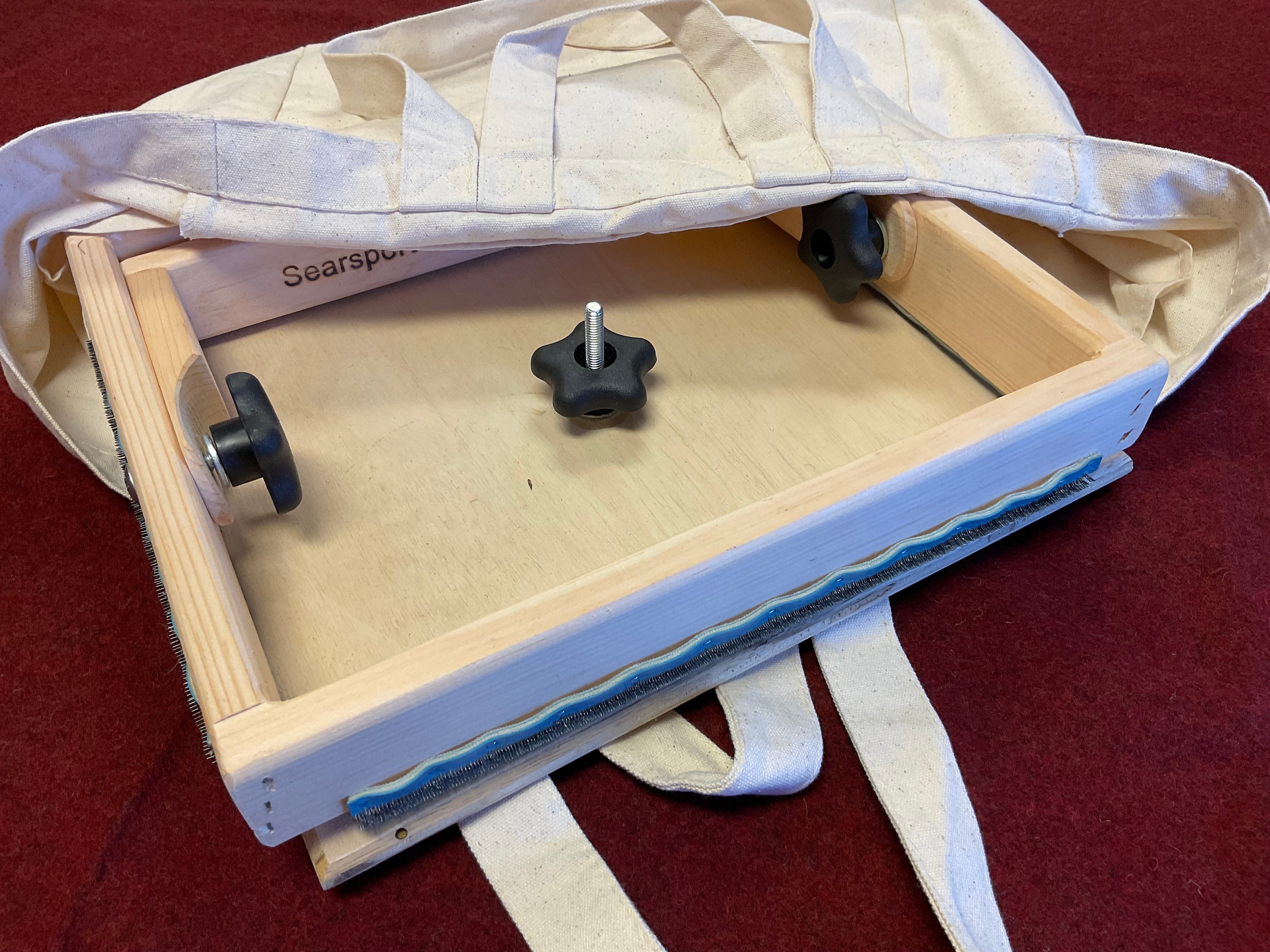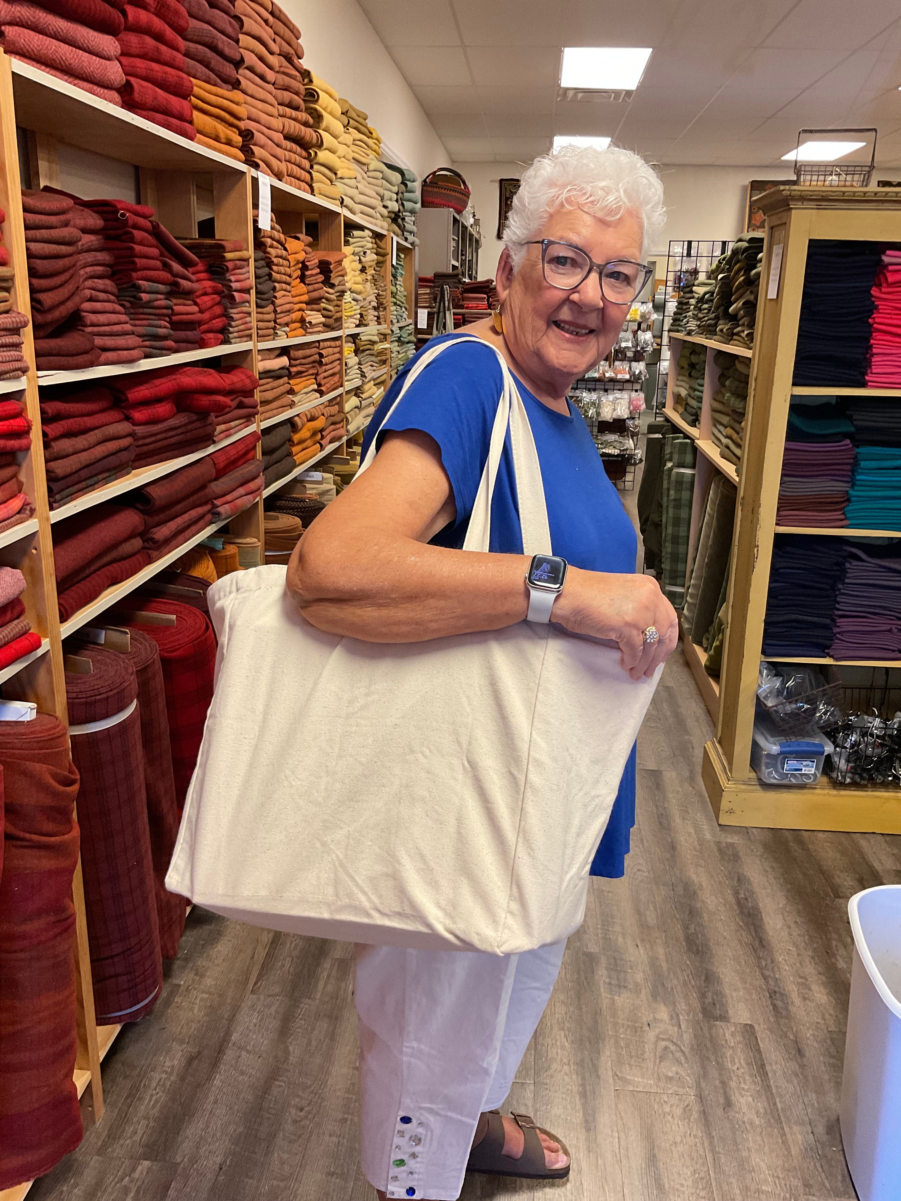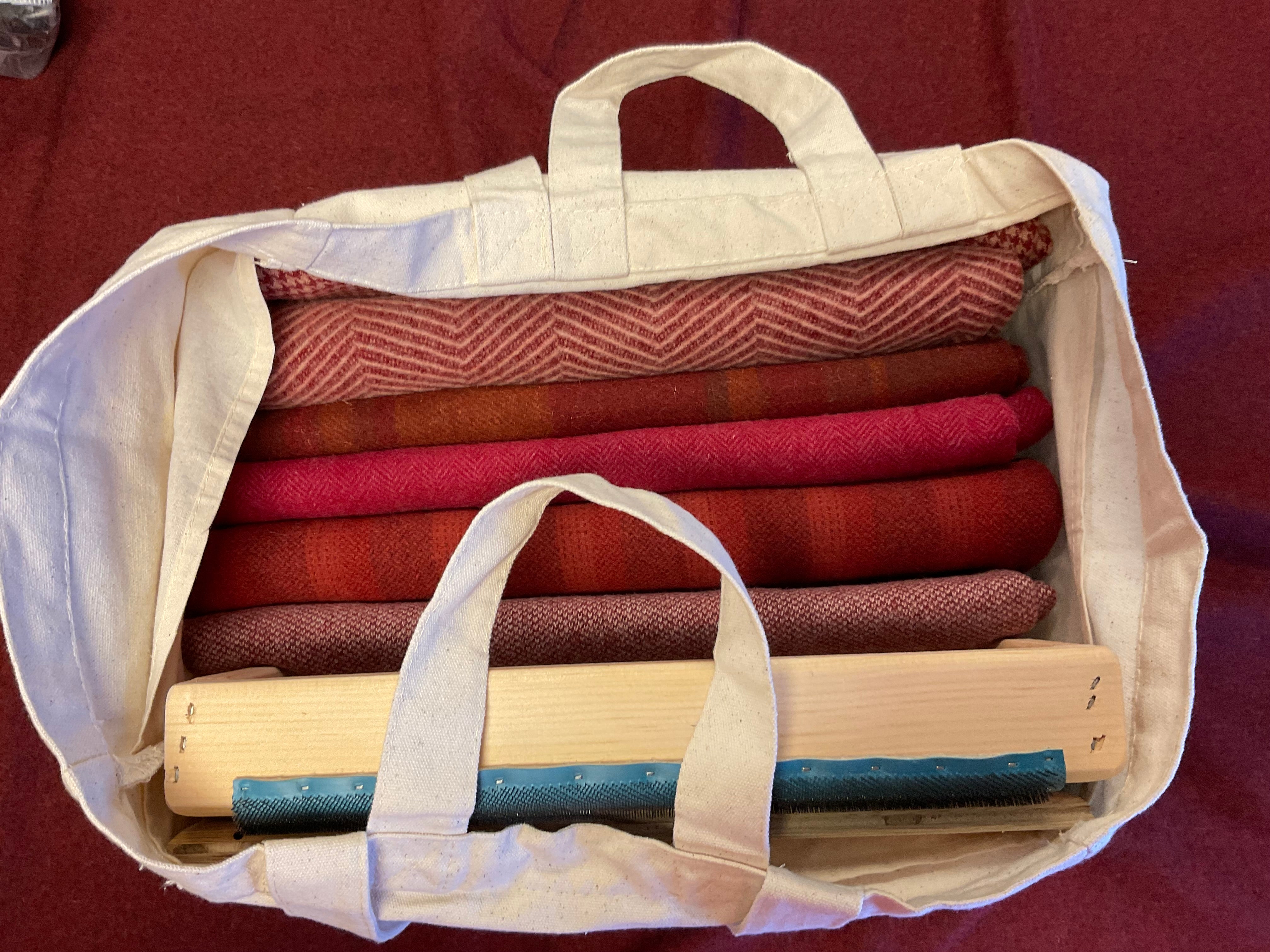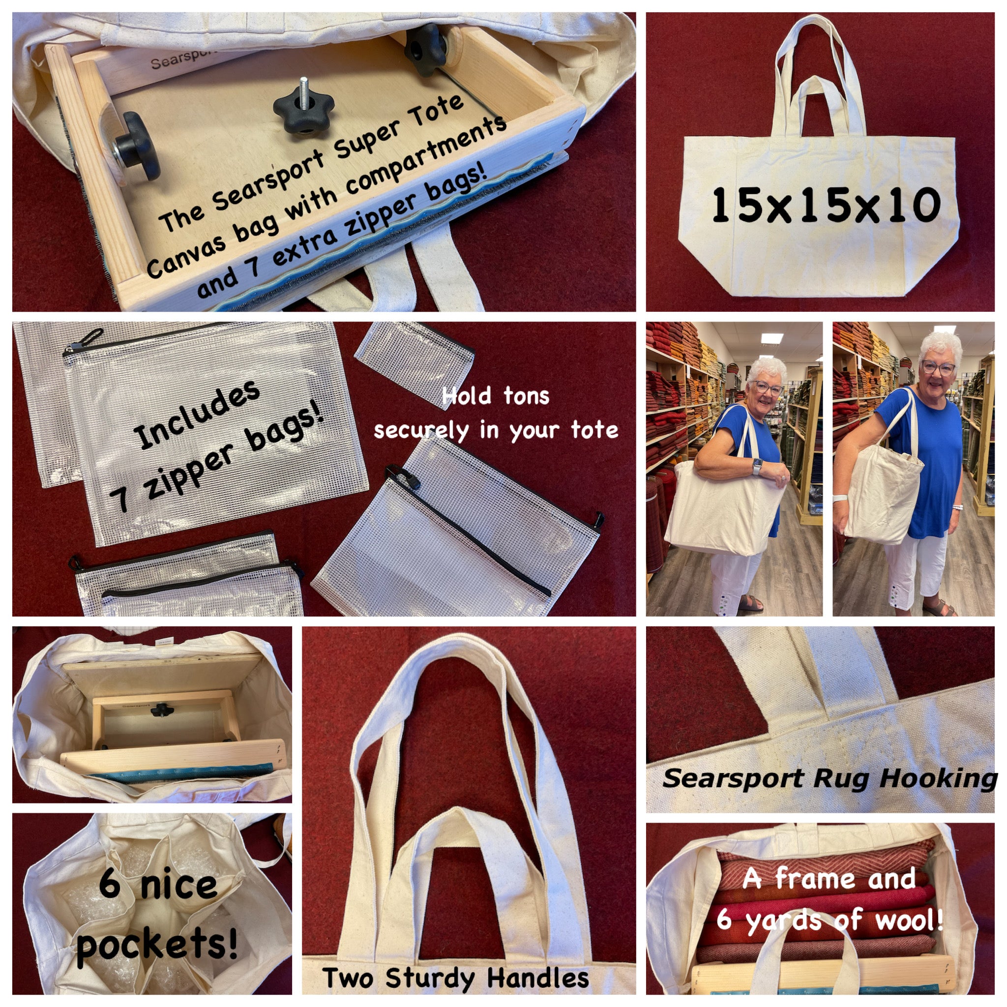 OR you can do the full set up that incudes the tote, 7, yes SEVEN of the zipper bags in assorted sizes! We have included these to hold all your tools, needles, hooks, scissors, threads, patterns, change, candy, any thing at all you want to be contained and not rolling loose in the main tote bag. The size of the bag is 15x15 with a 10x15 inch bottom. It holds our budget swivel frame along with lots of wool and extra goodies with zero issues. The one picture is our swivel frame and 6 yards of wool! This bag is designed to hold over 75 pounds! So get yours now and put it to work!