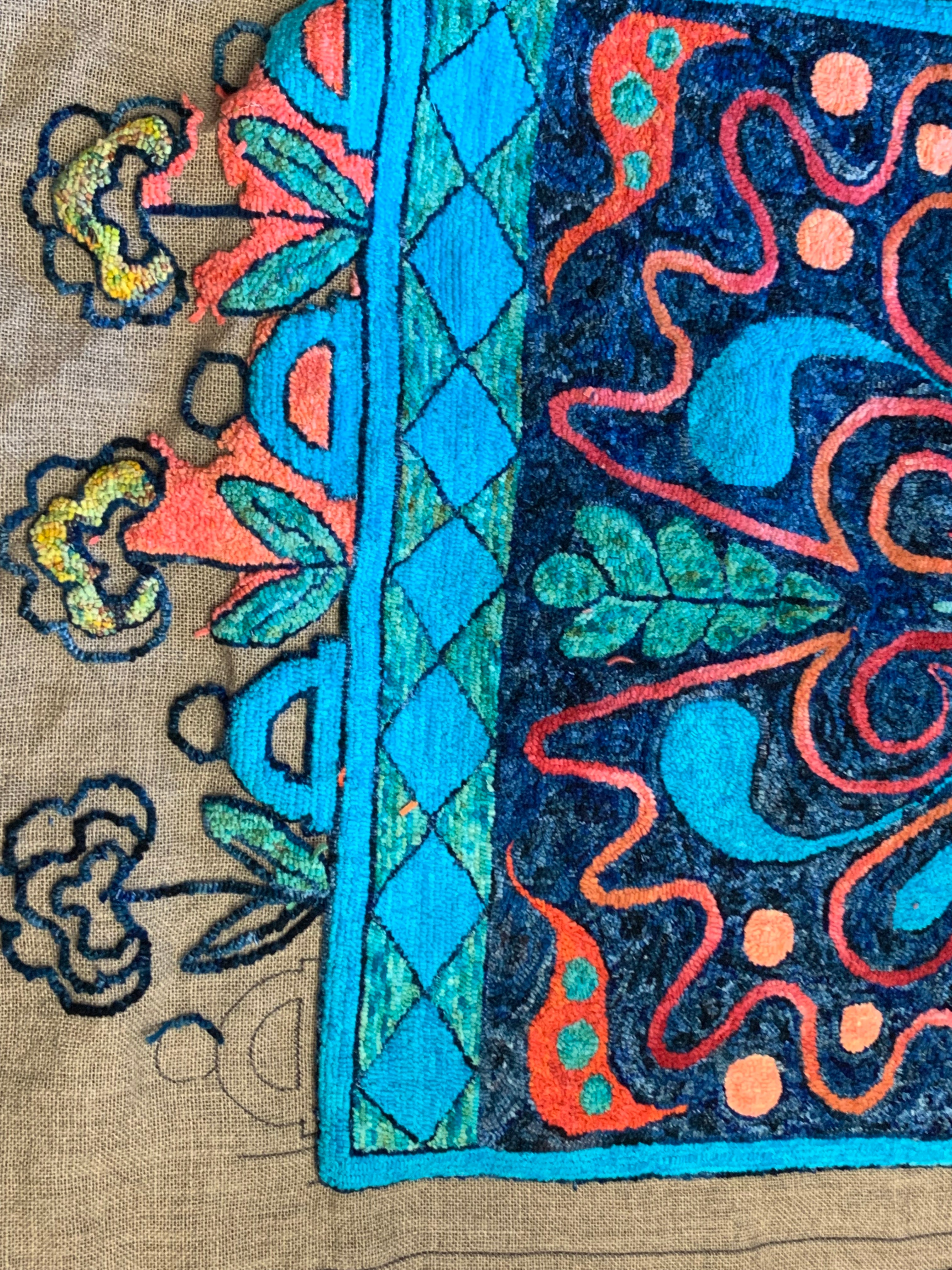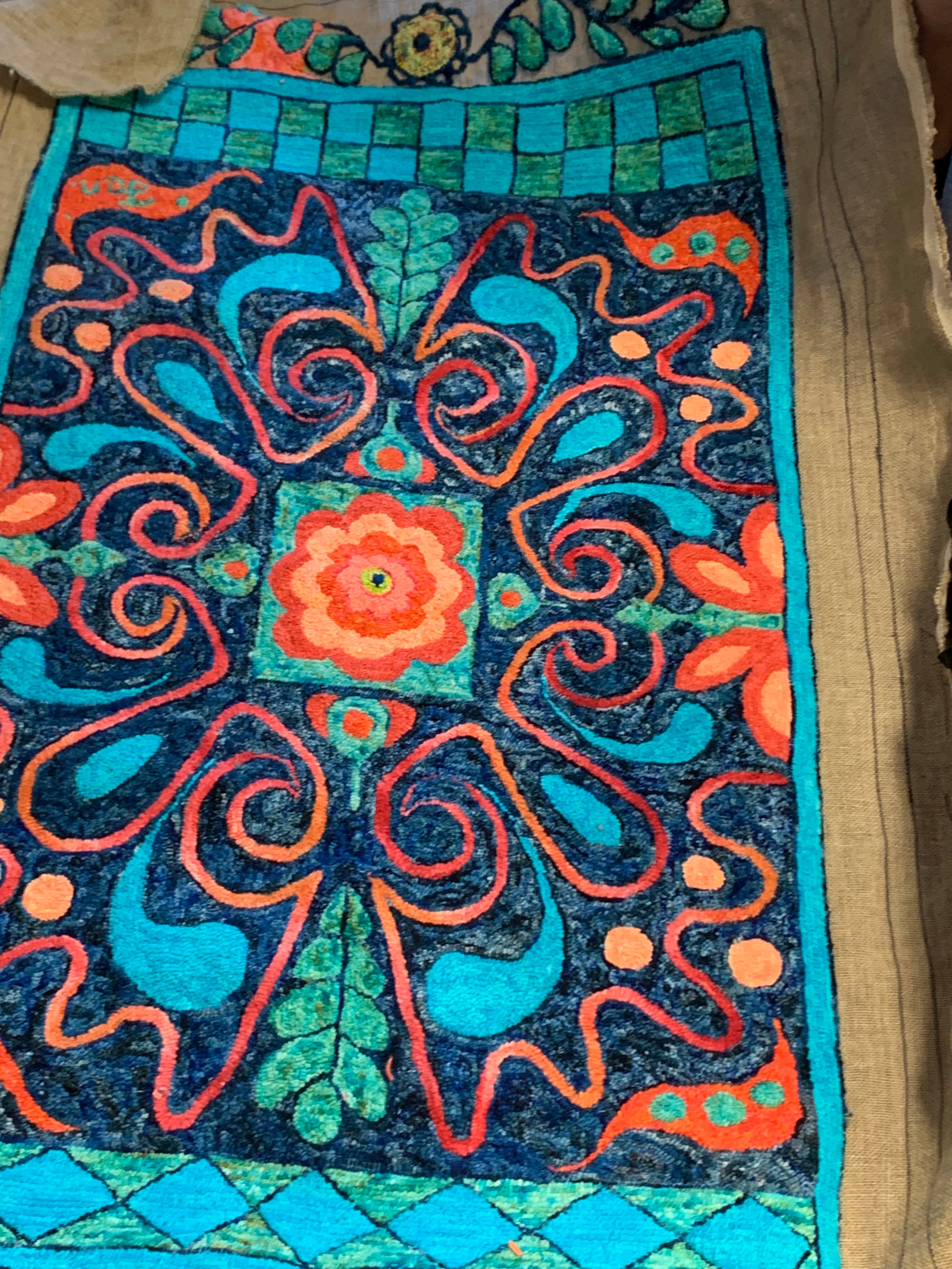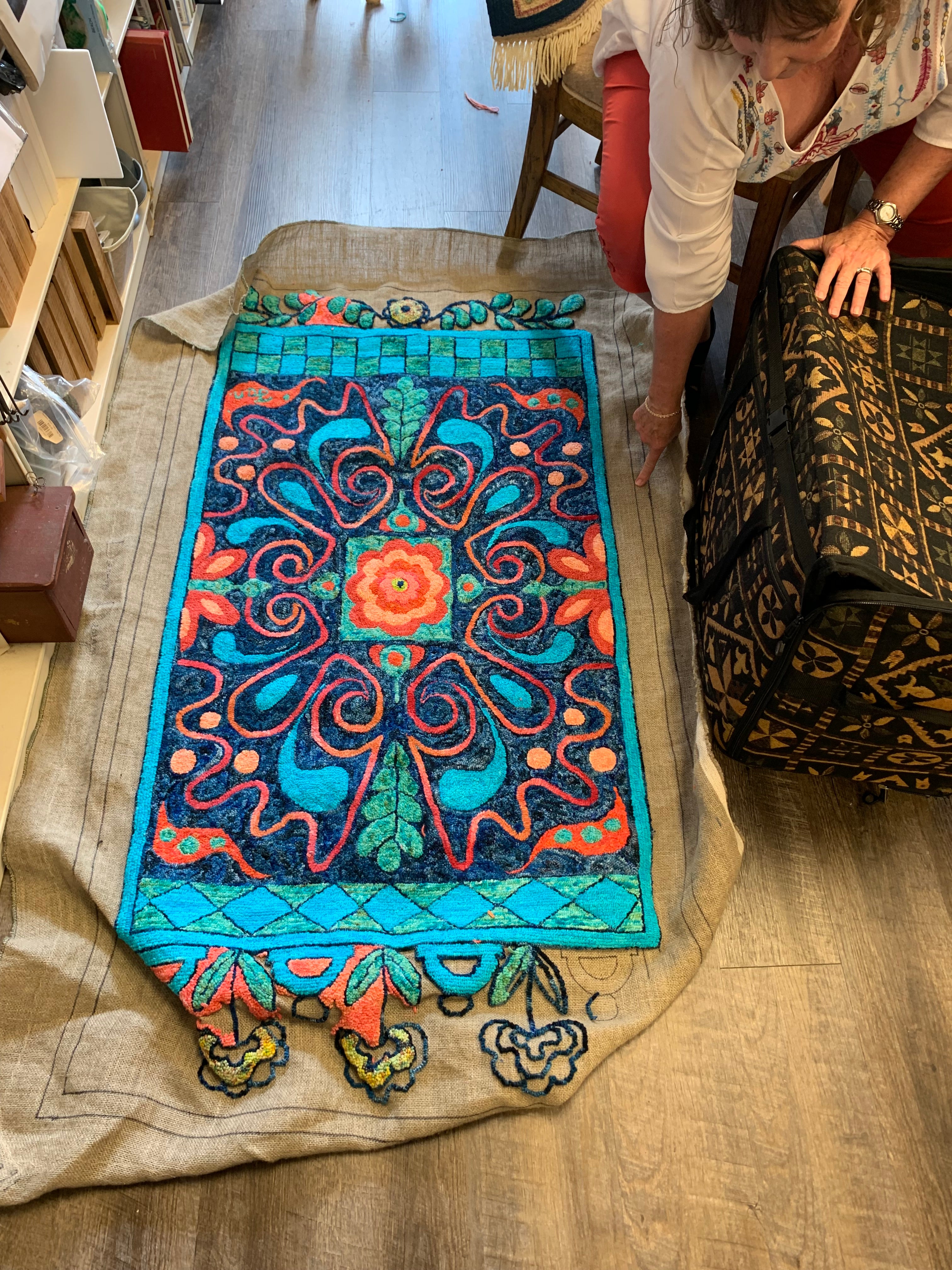 The rug in the blues and corals is Ginny F’s