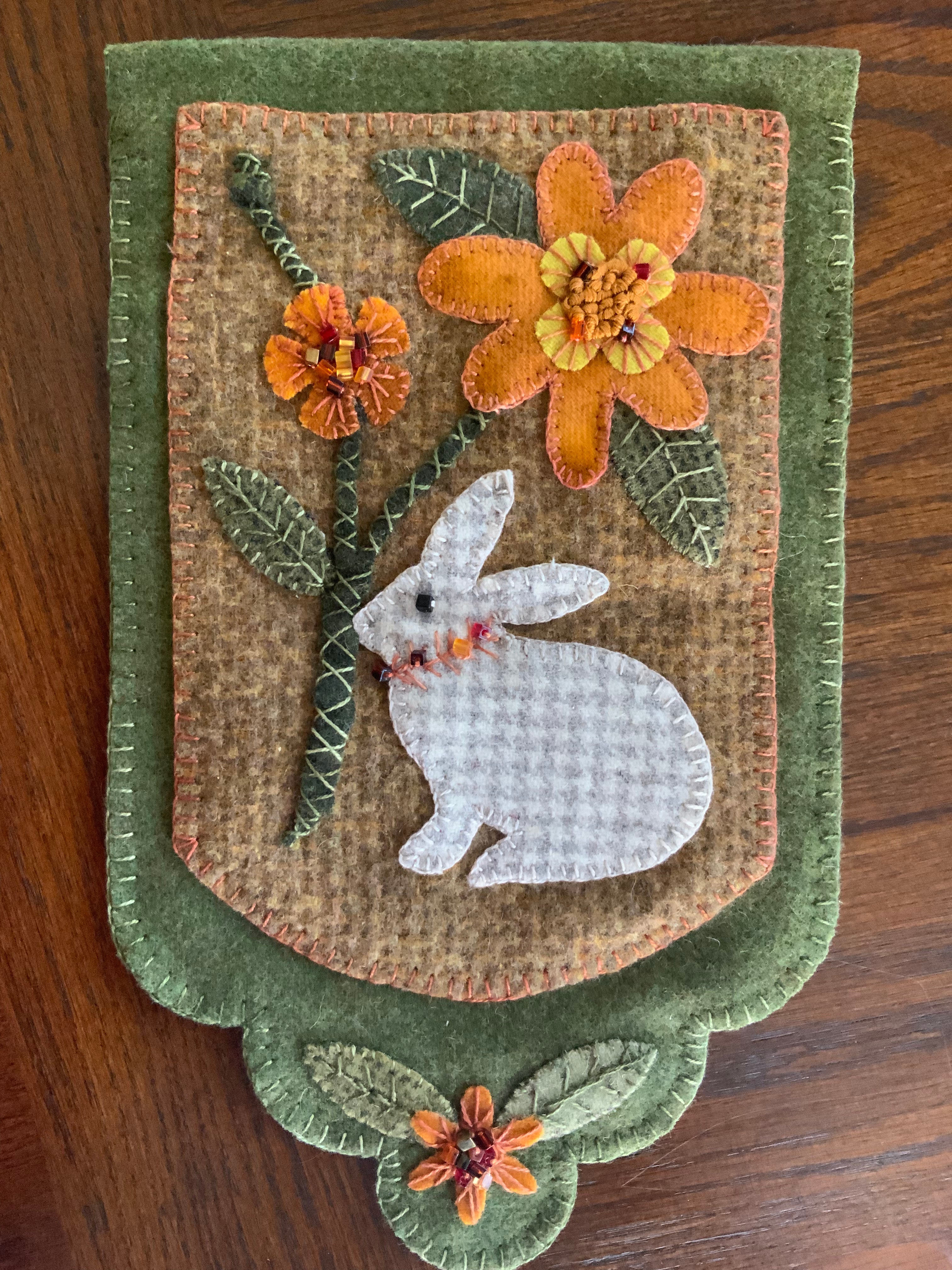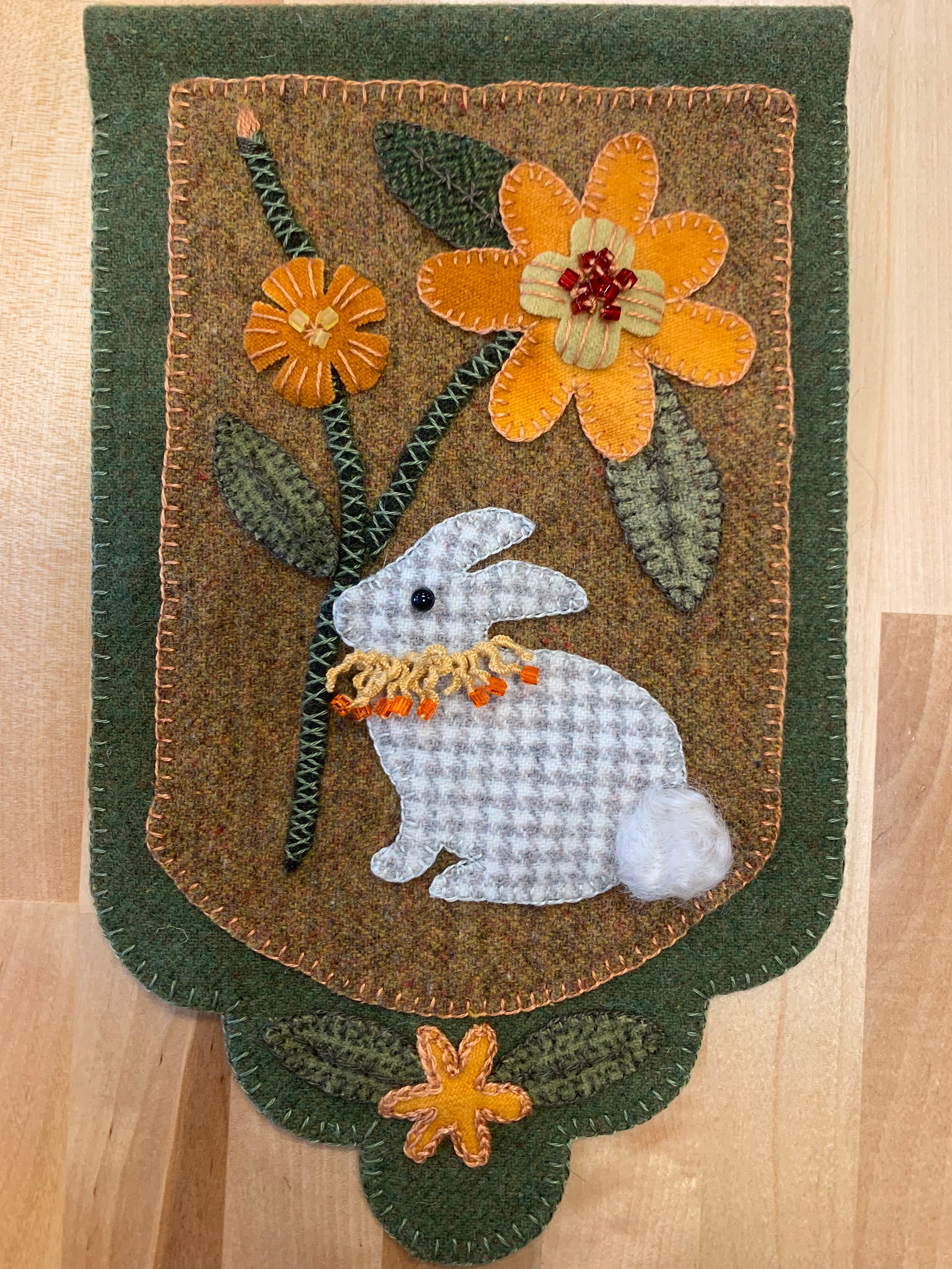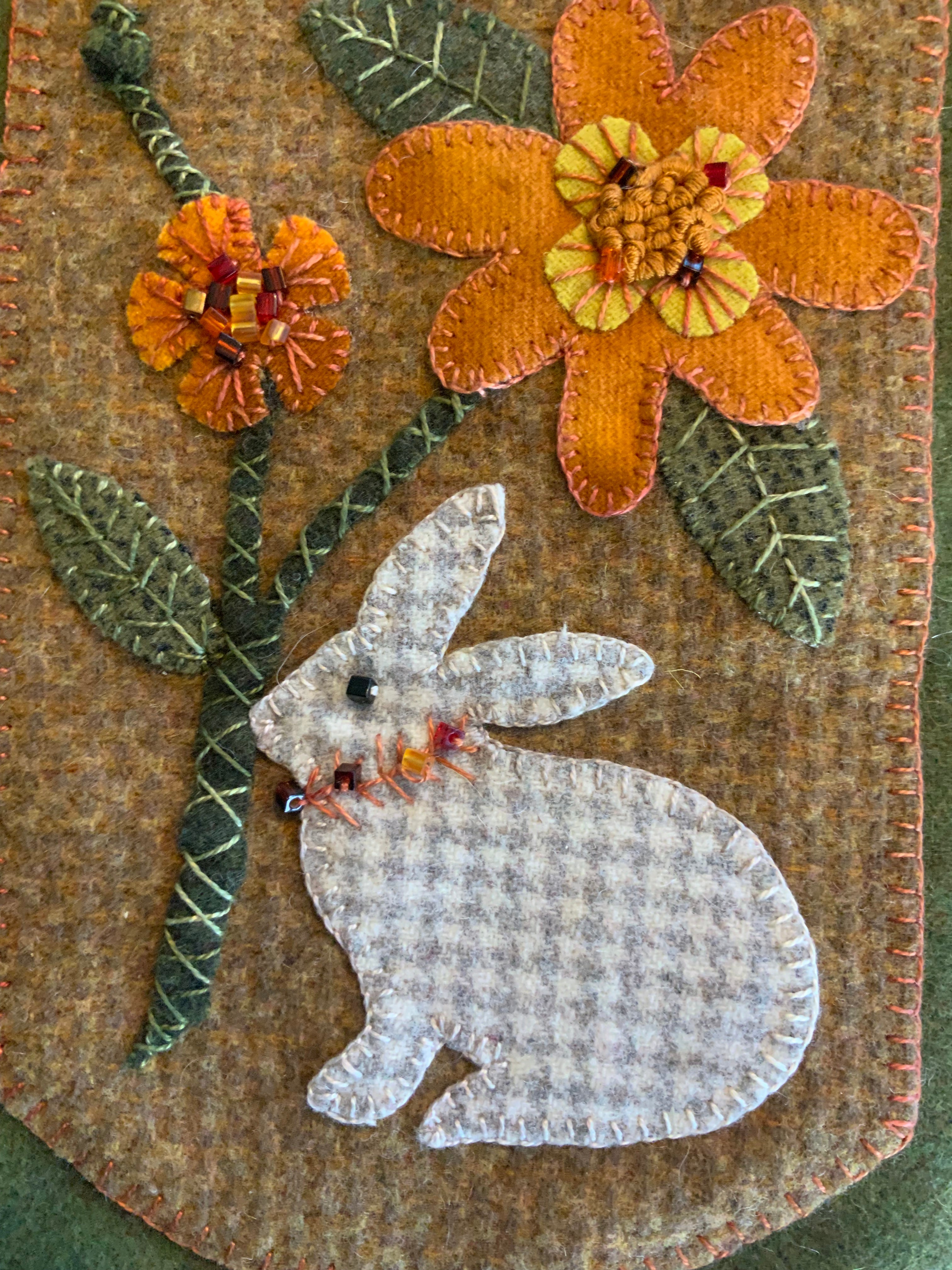 There’s someone in the garden nibbling on the pretty flowers! Their centers sparkle like jewels and she has some caught as a pretty necklace! Our fully pre cut kit includes the backing, top panel, bunny, flowers, stems, leaves and beads! Wether you use it for spring or fall this sweet piece is fun to stitch up!