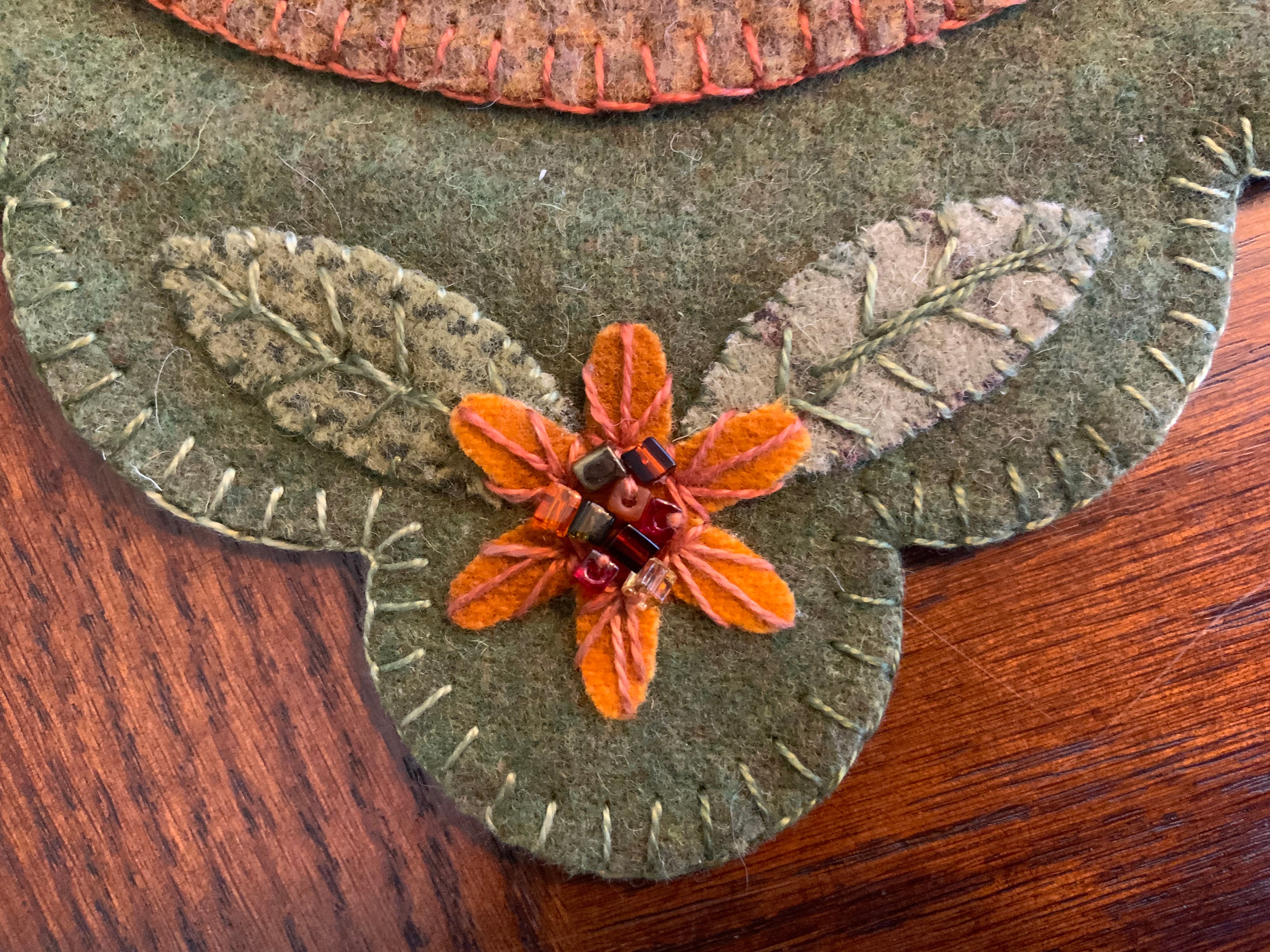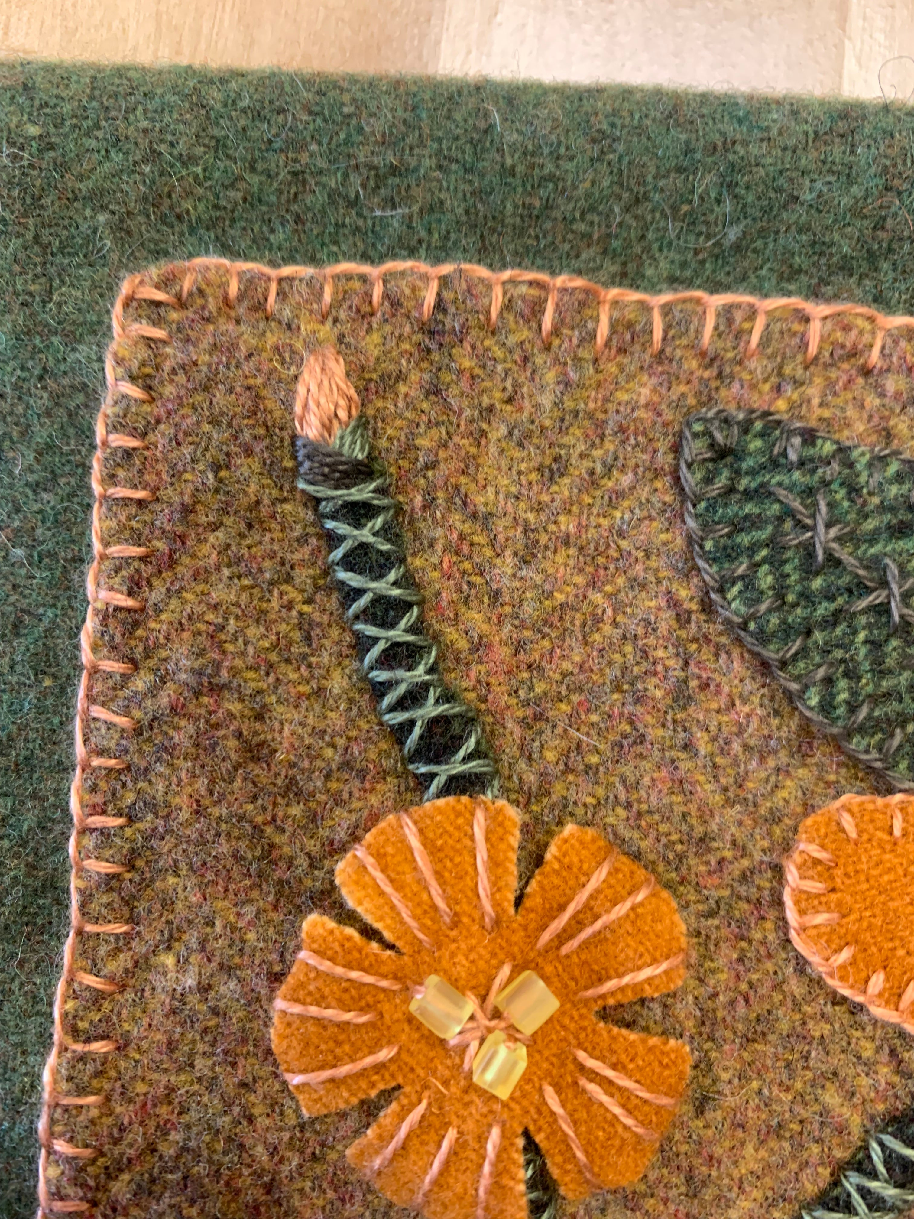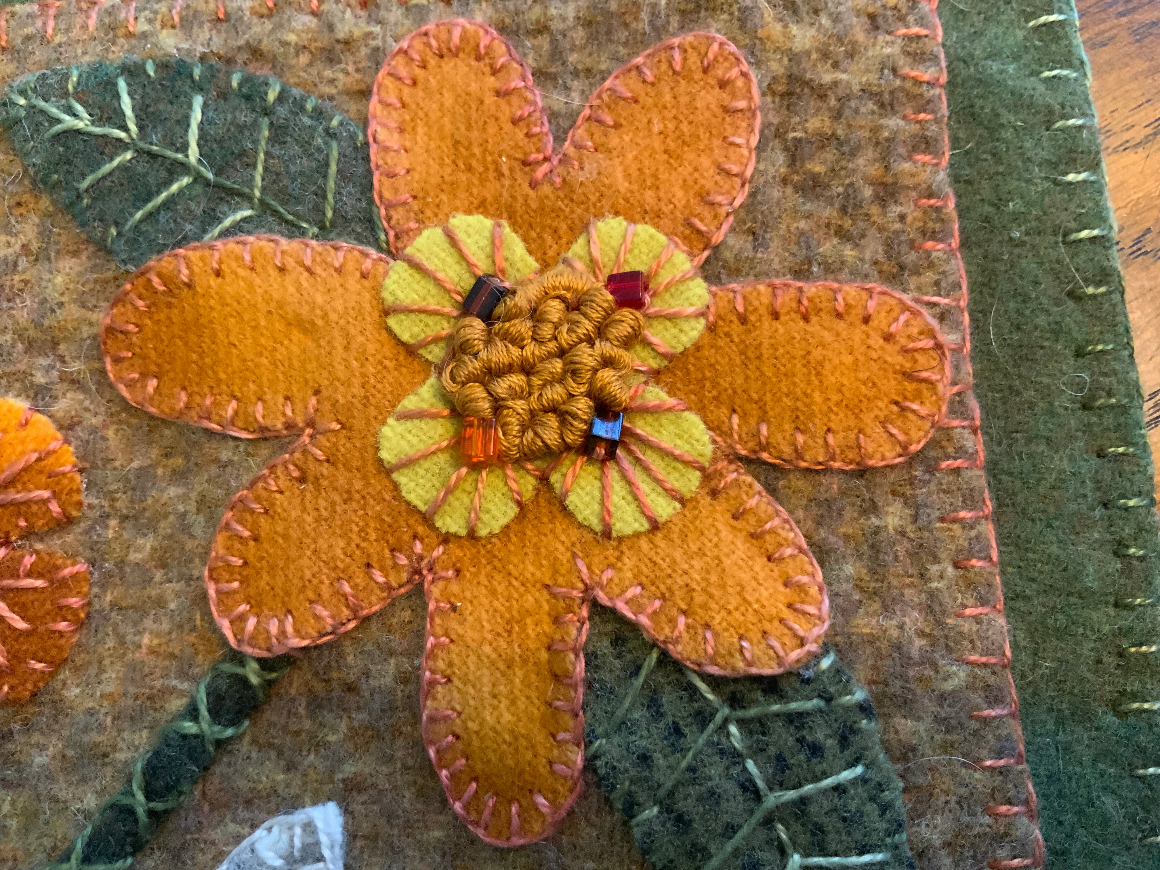 On this one Julie stitched it with #8 Valdani pearl cotton in variegated rusty oranges, greens and cream.