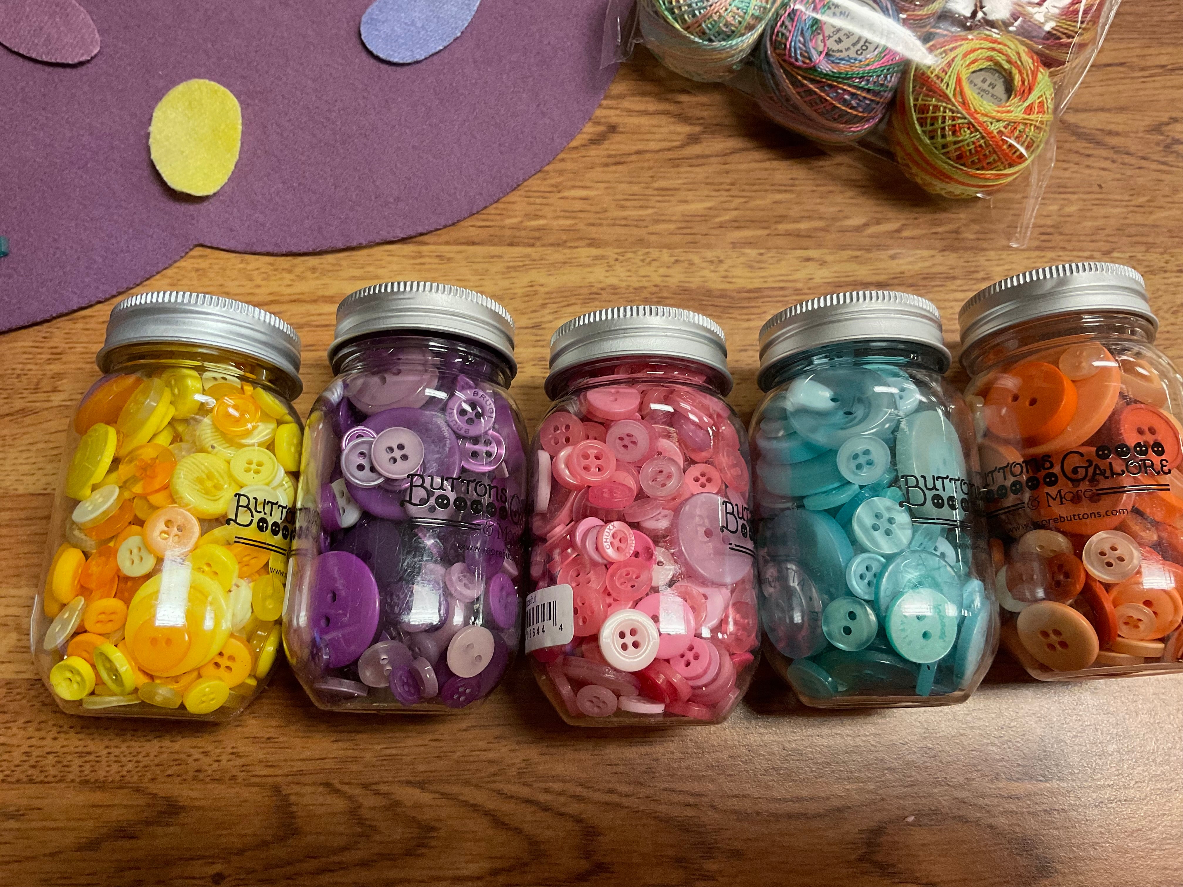 We love using fun, funky maulti colored buttons of all sizes in our projects. And sometime you even just need one to fix a shirt or pair of pants. And so many of us do no have button jars any longer… remember Nanas big butter cookie tin that was so heavy and so much fun to dig through? I do! I wish I had it now! But these help fill that need! From teeny tiny to larger fun ones each little jar has over 200 buttons in it by color. Fashionable and on trend, our Button Mason Jars feature over 200 hand-dyed, garment quality buttons. Each jar features carefully chosen colors that work beautifully together. Weather you are embellishing a garment, paper craft or home decor project, these buttons will provide the perfect touch to make your creation special.
