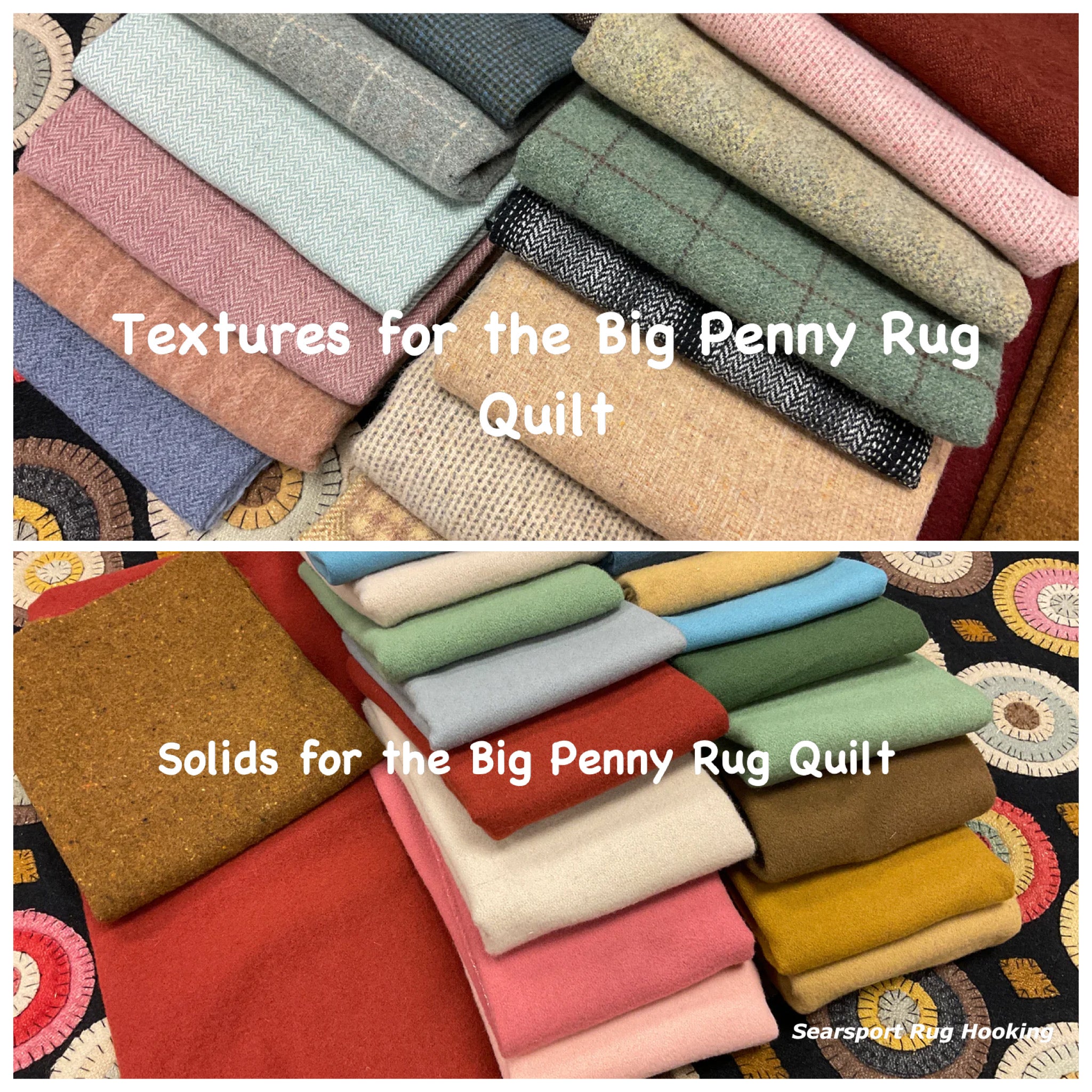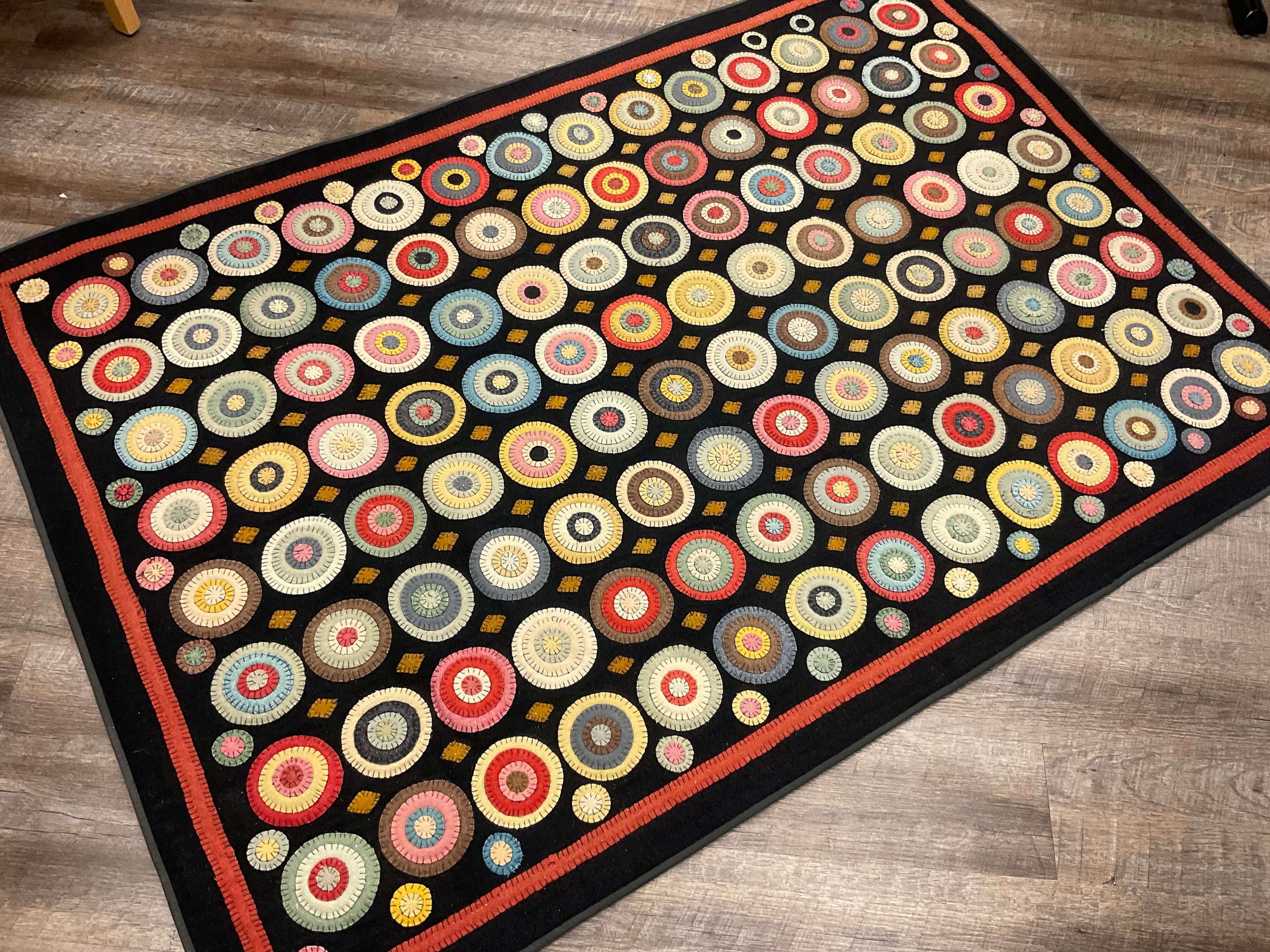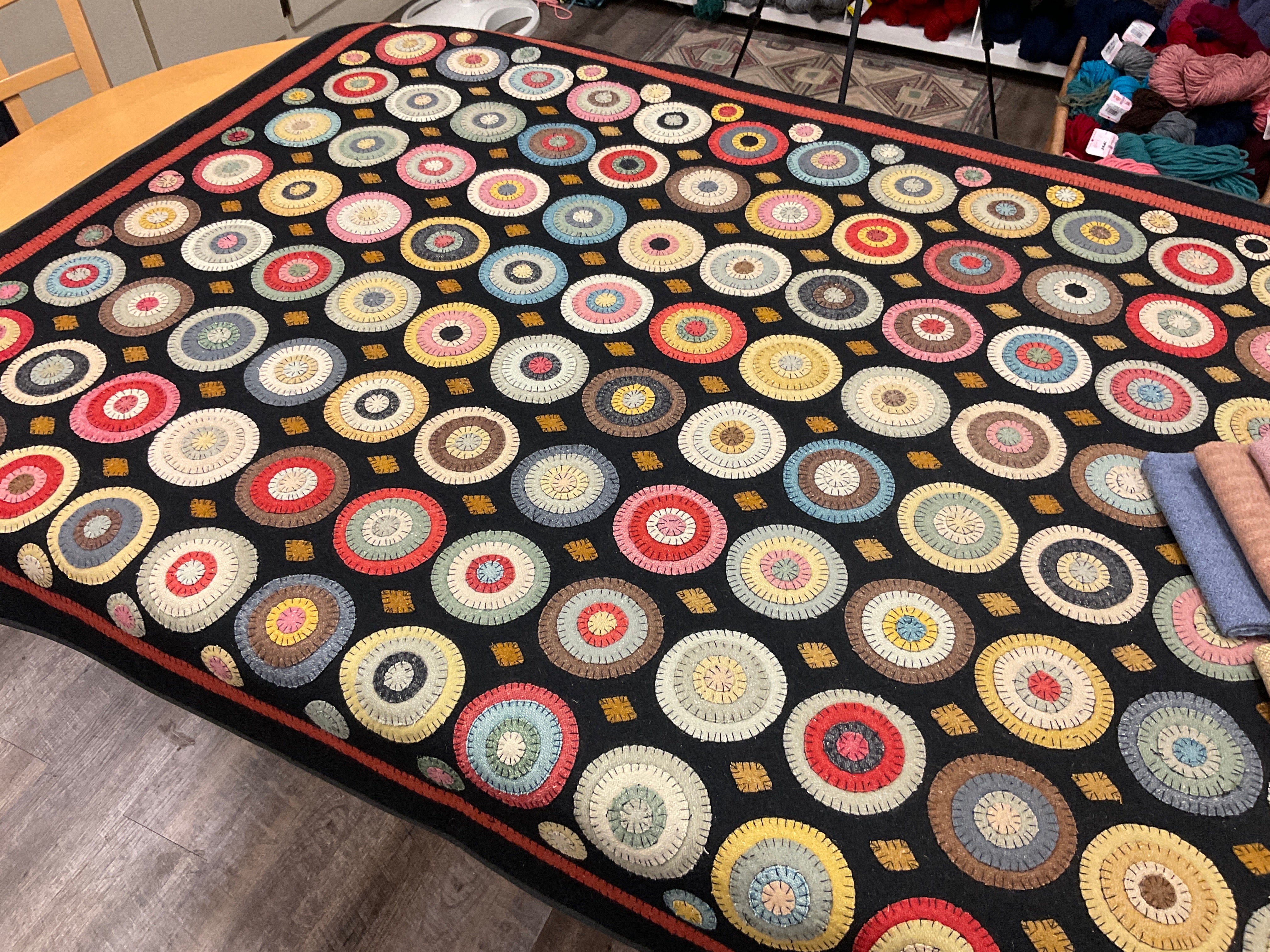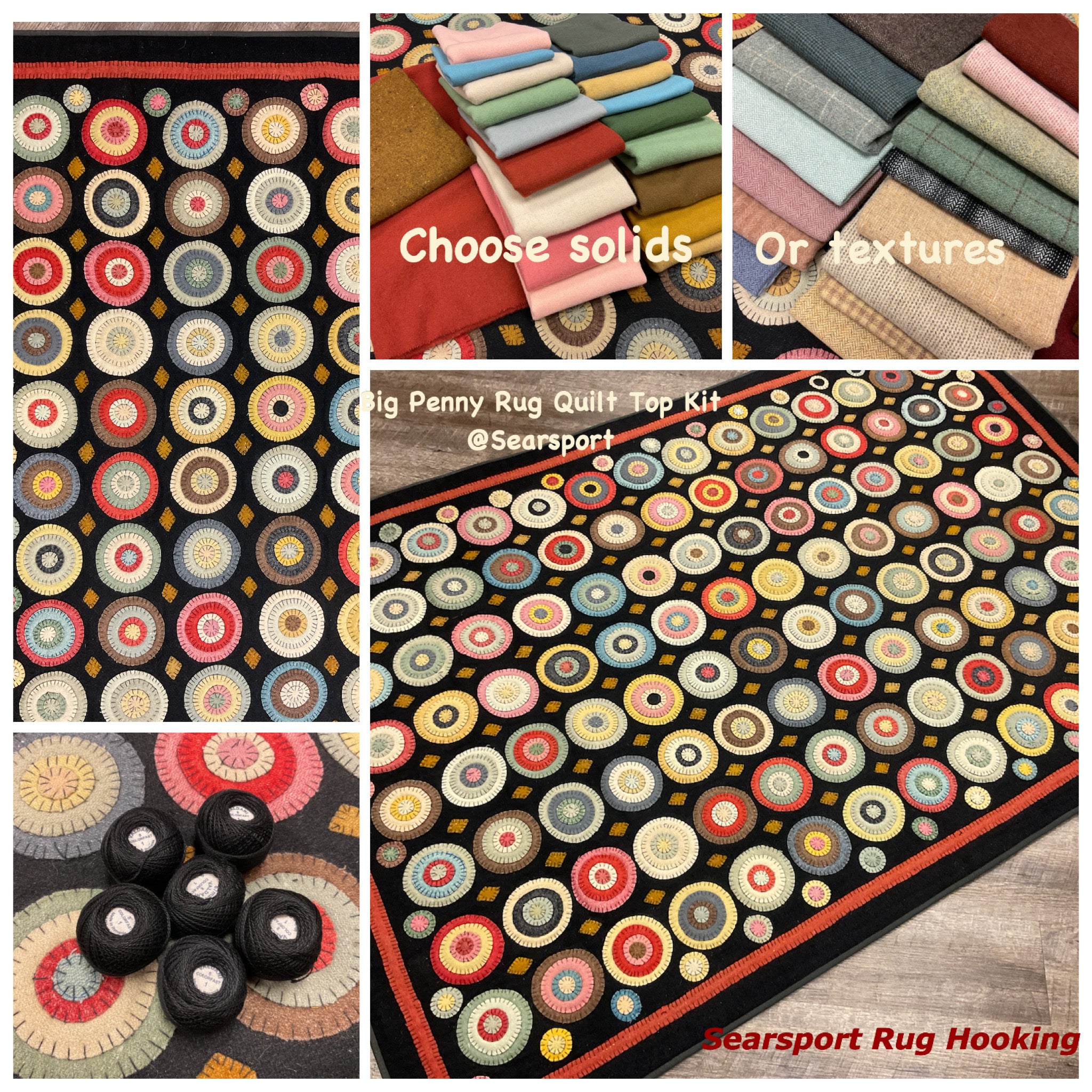 You have asked for years for a kit for this awesome quilt. This is from a line we carried in our gift shop, Silkweeds, for many years. Then in 2004 at the rug hooking studio when we sold Silkweeds and because Searsport Rug Hooking. We finally had time to sit down and pull two sets of wools and figure everything needed to make one. We have a set of solids from the Rebekah Smith collection and a set of textured from our as is wool, you choose one of those and the heavy black for the background and templates for you to trace and cut your circles. And a basic set of instructions and lots of pictures as guides.
