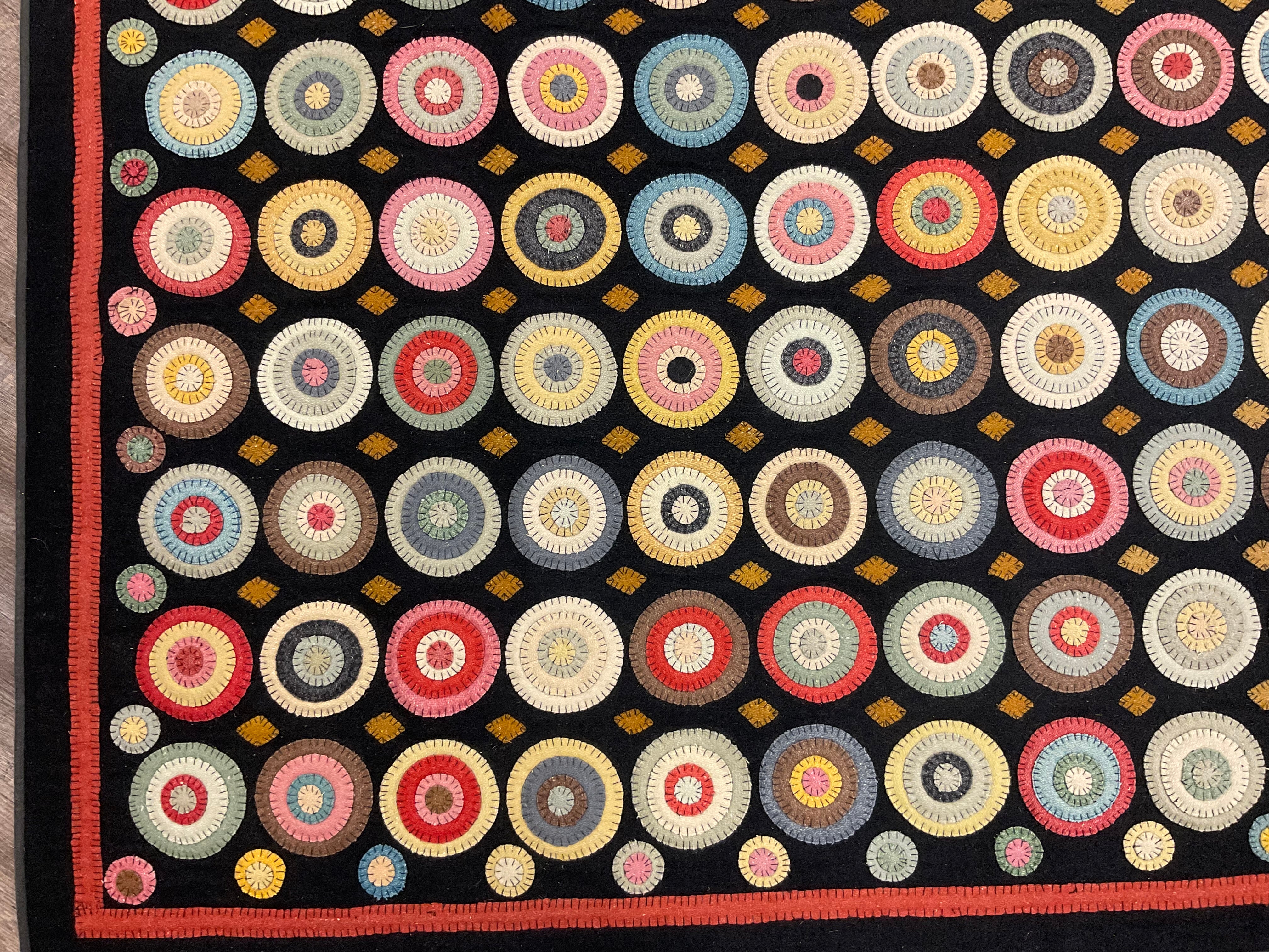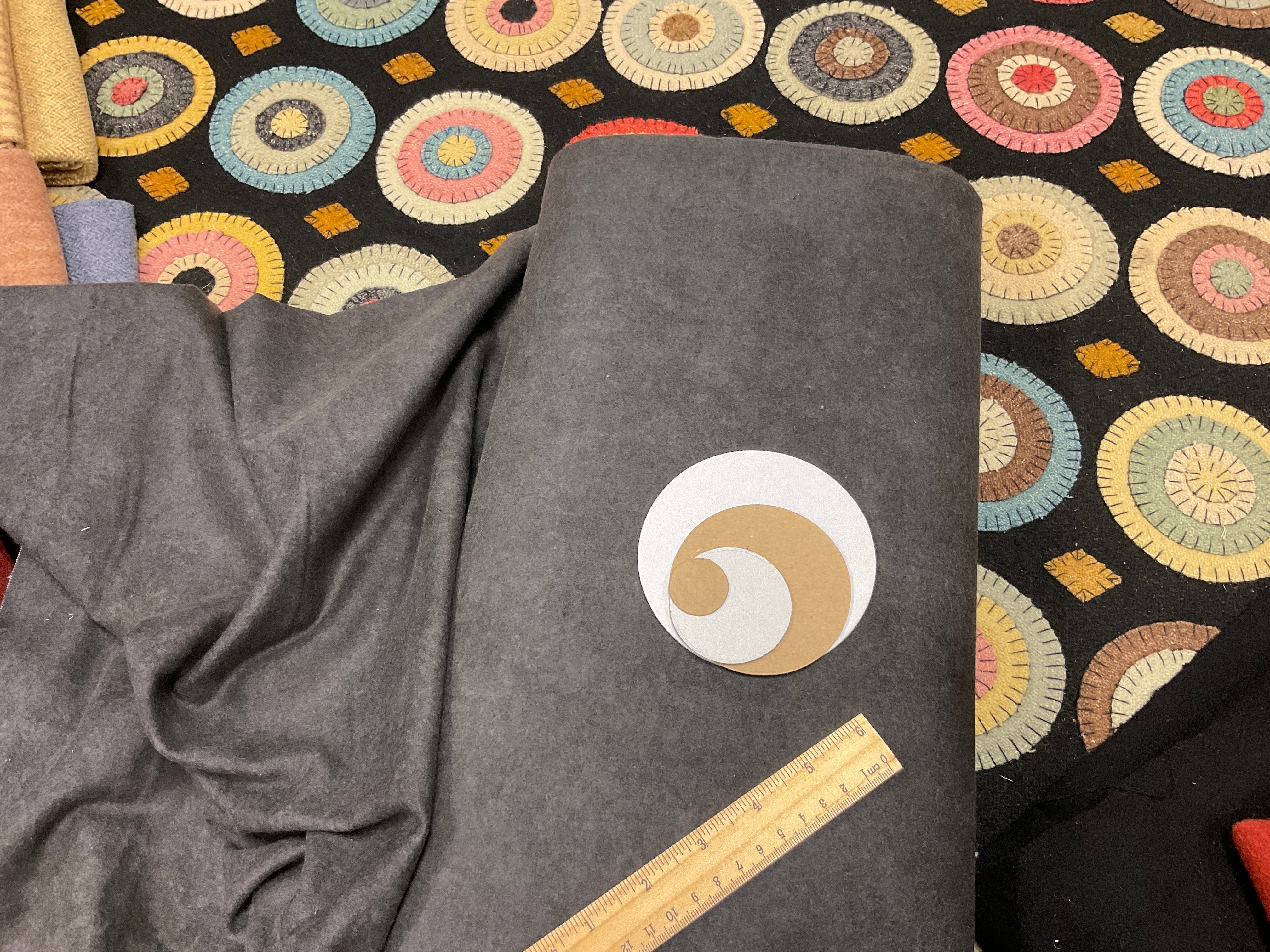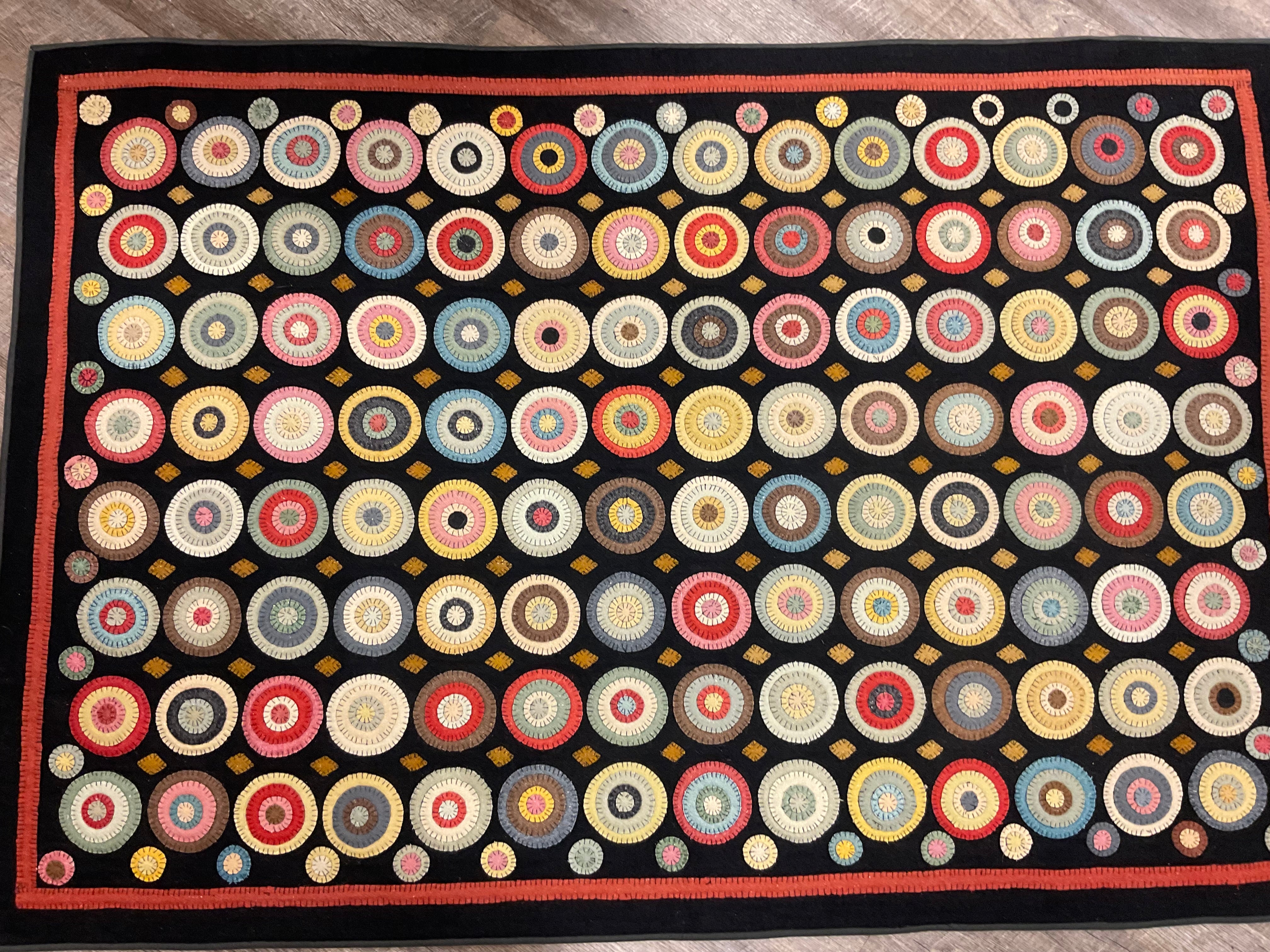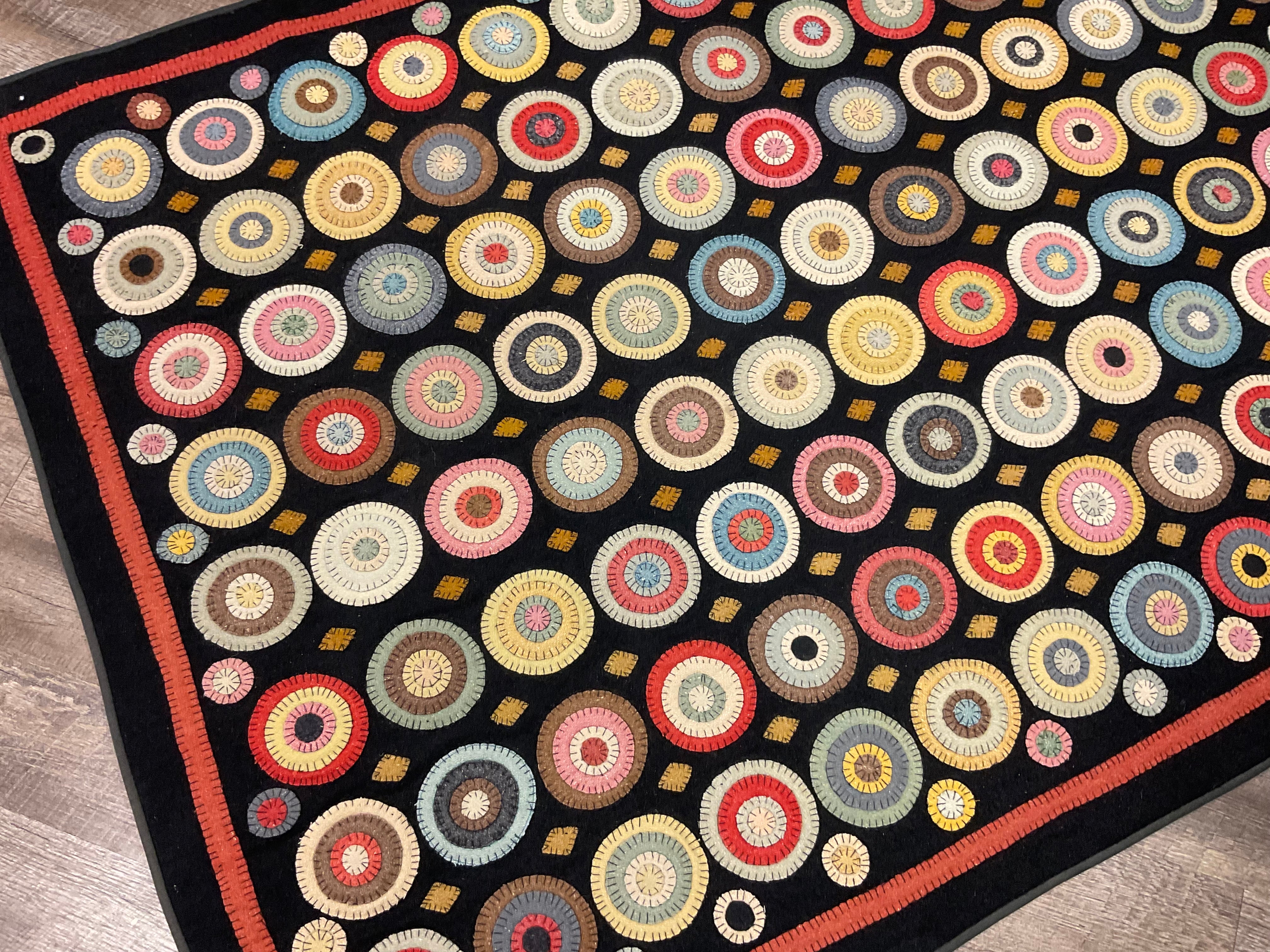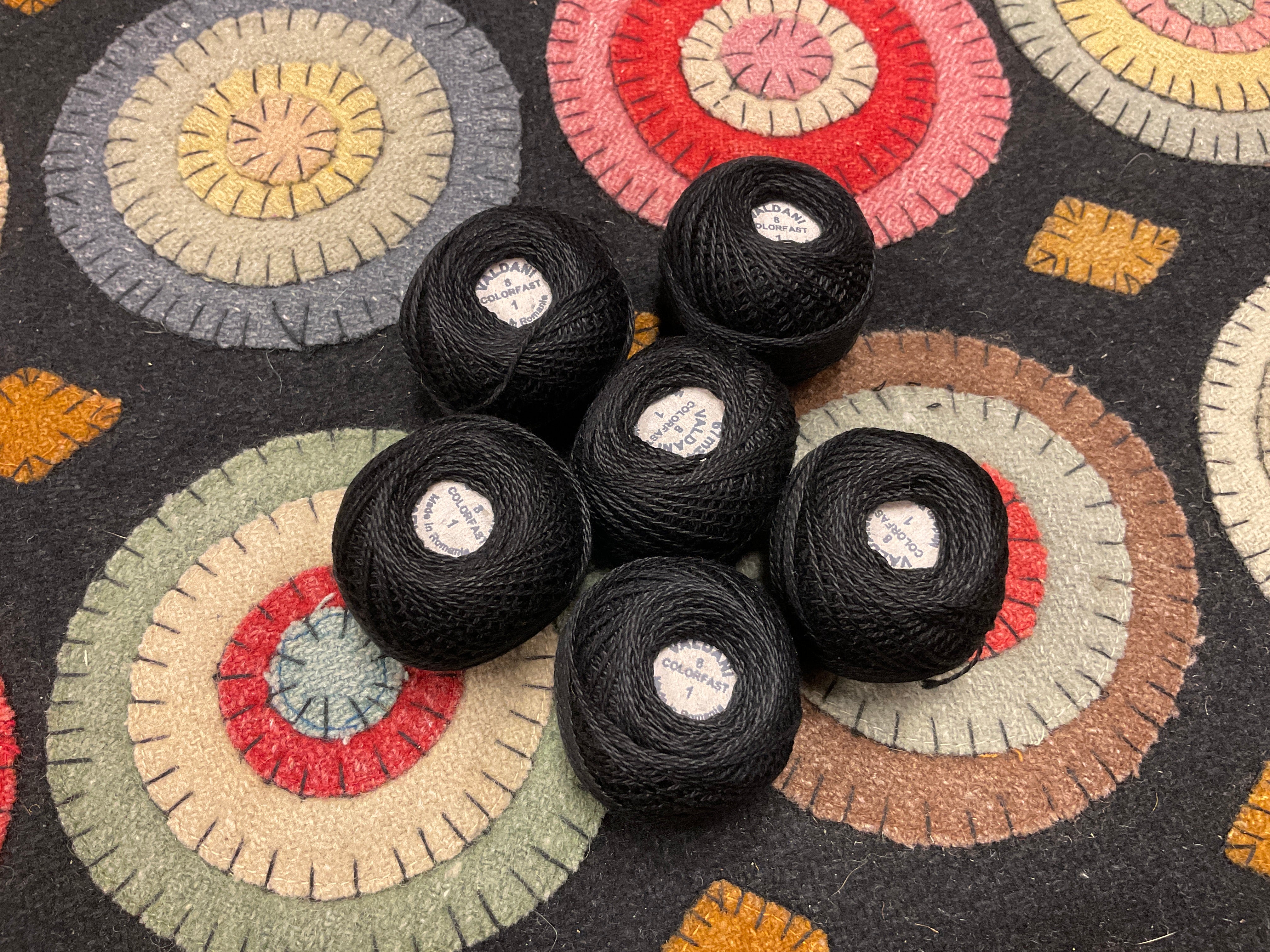 You have asked for years for a kit for this awesome quilt. This is from a line we carried in our gift shop, Silkweeds, for many years. Then in 2004 at the rug hooking studio when we sold Silkweeds and because Searsport Rug Hooking. We finally had time to sit down and pull two sets of wools and figure everything needed to make one. We have a set of solids from the Rebekah Smith collection and a set of textured from our as is wool, you choose one of those and the heavy black for the background and templates for you to trace and cut your circles. And a basic set of instructions and lots of pictures as guides.