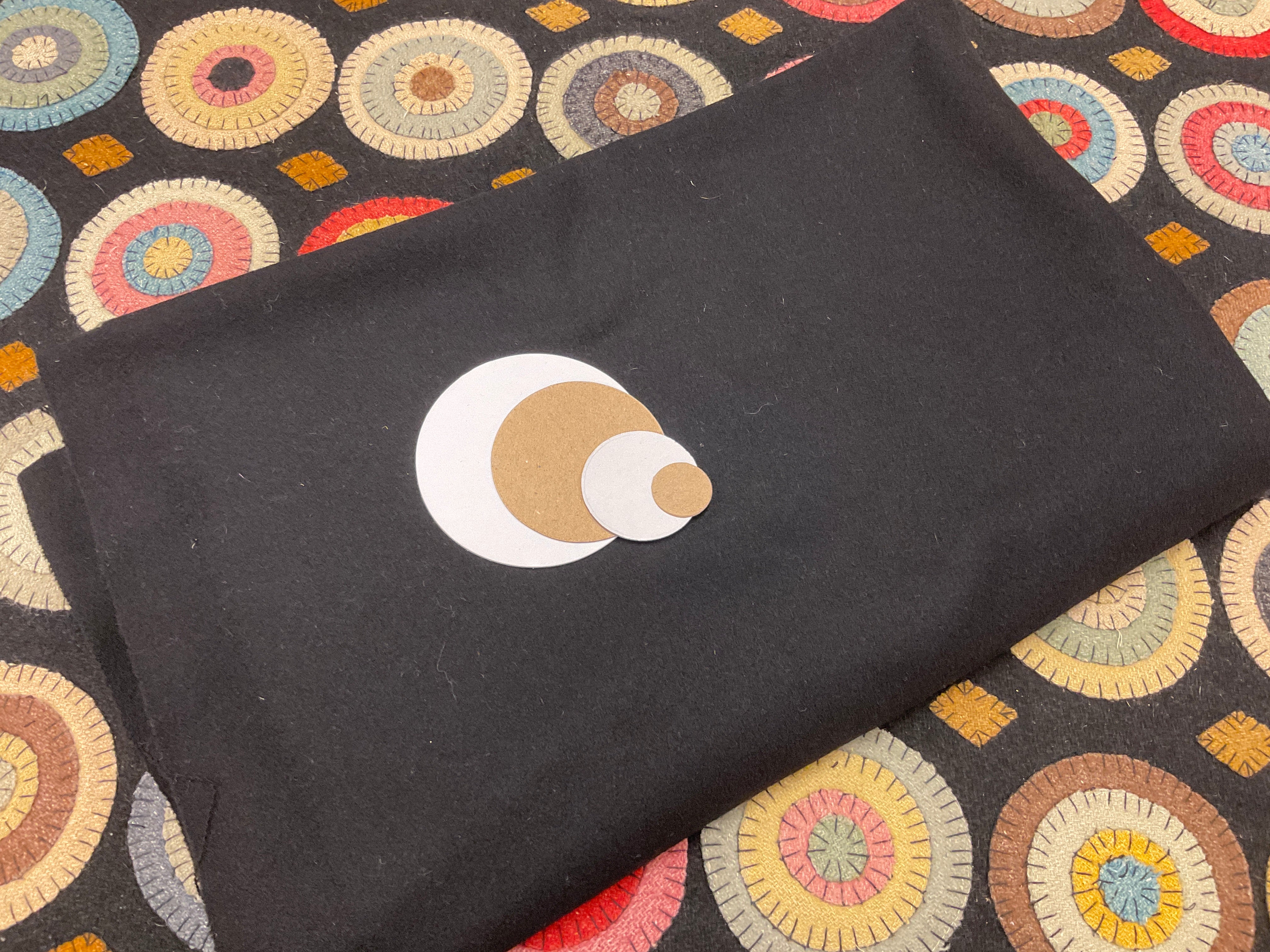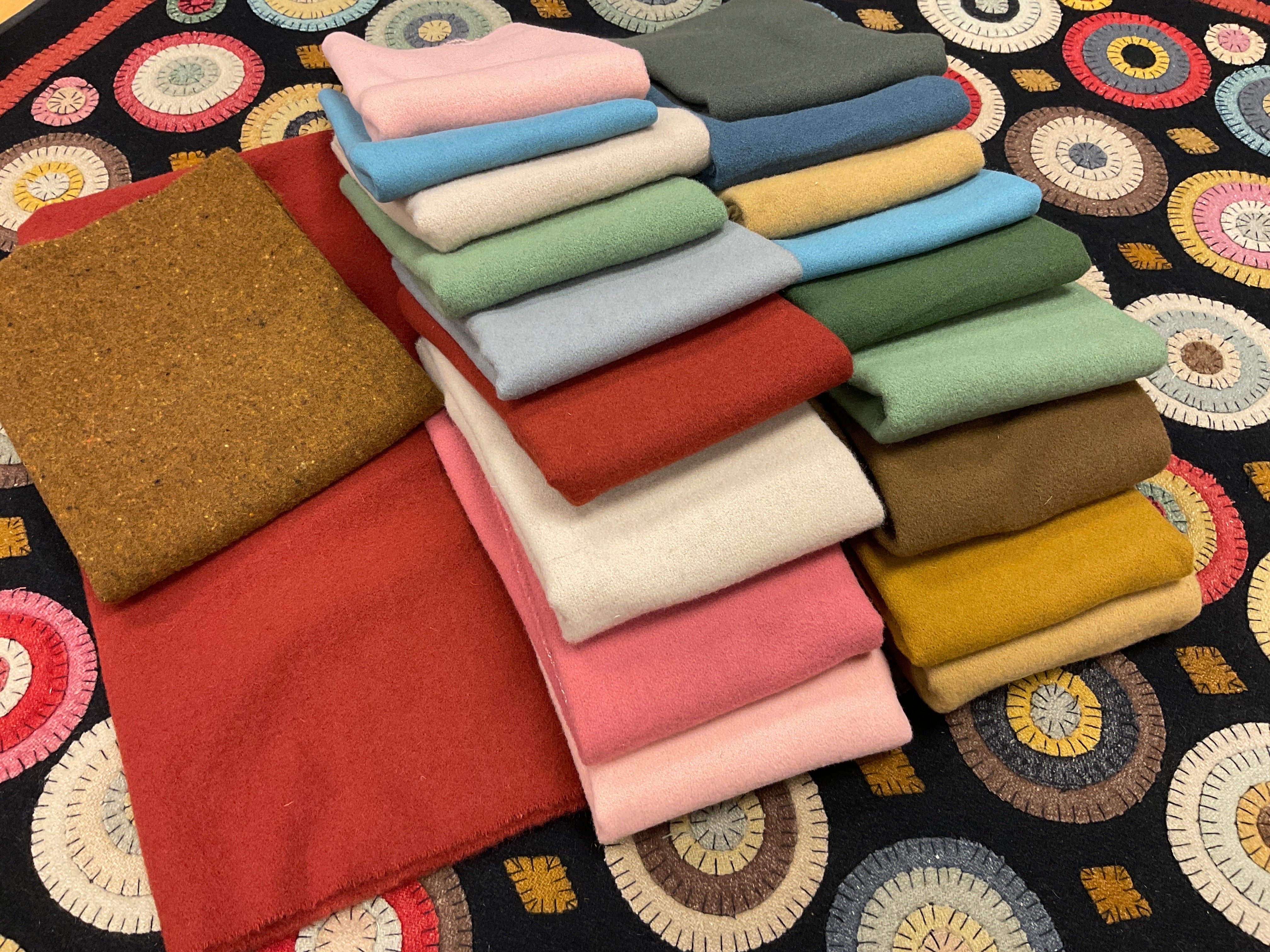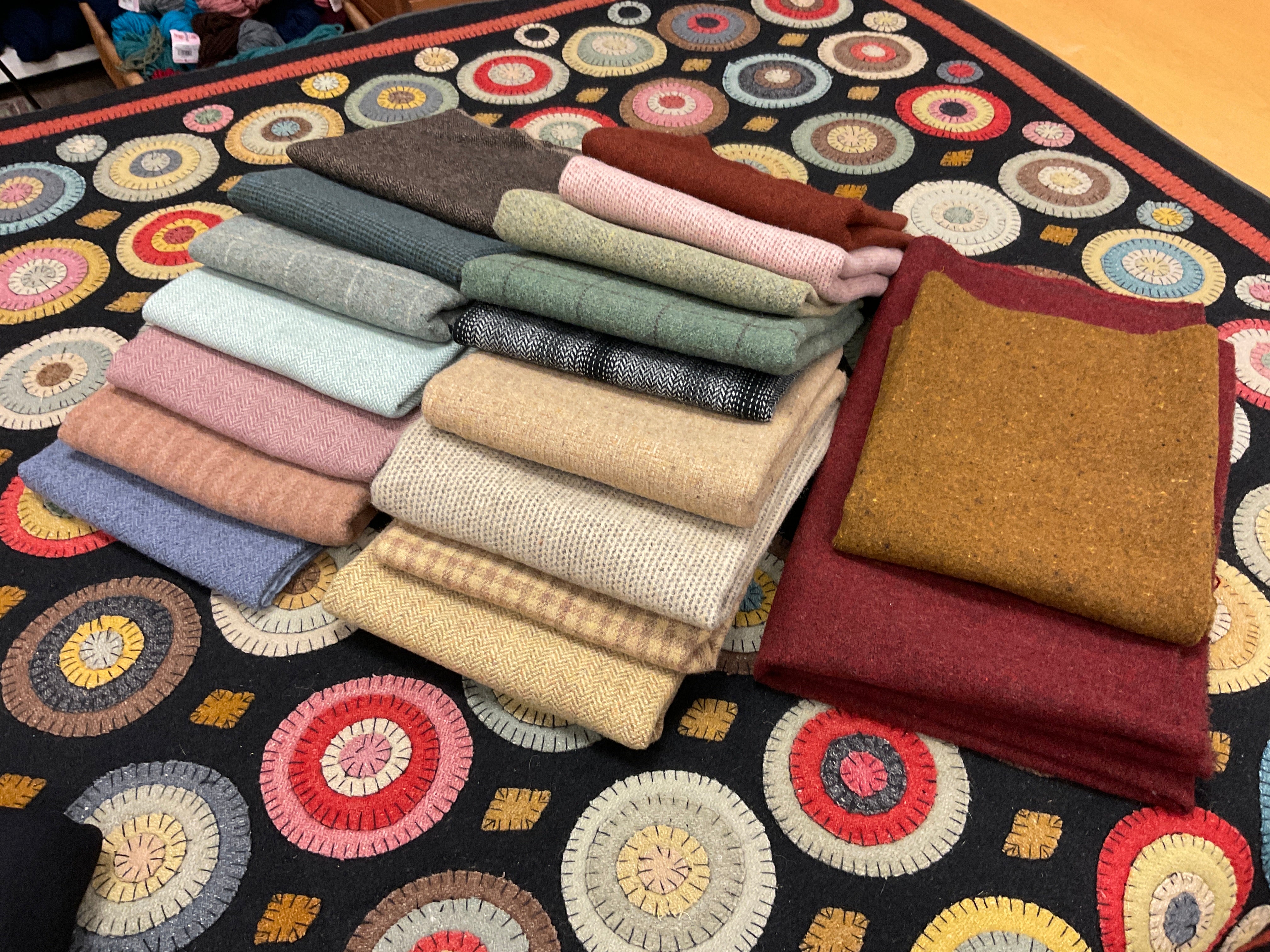 You will choose between the Rebekah Smith solid wools similar to our sample or small textured wools for a more updated look. The solid set costs a little more because the wool is not as wide, therefore it takes 3 more fat qtrs to cut all the circles