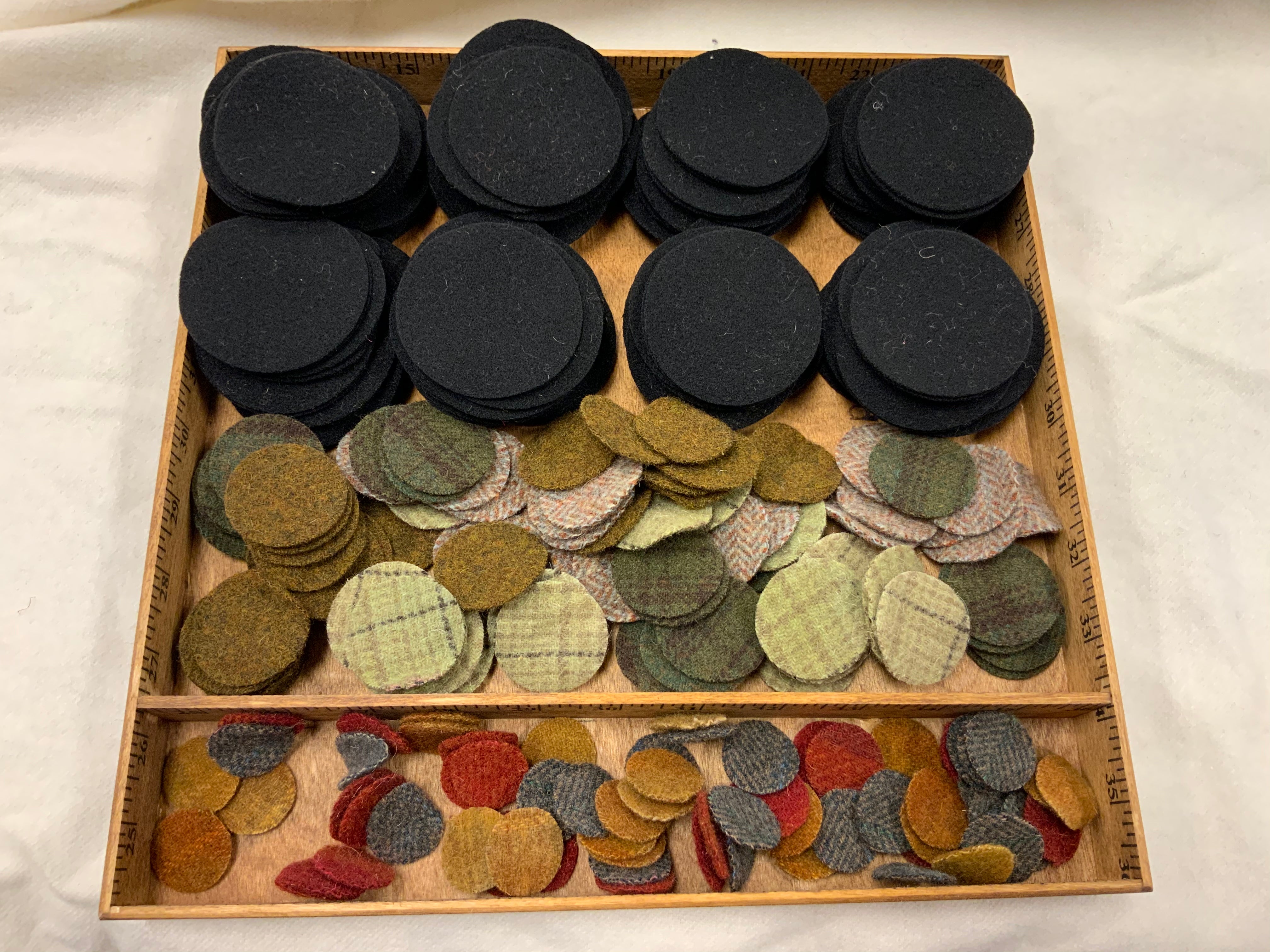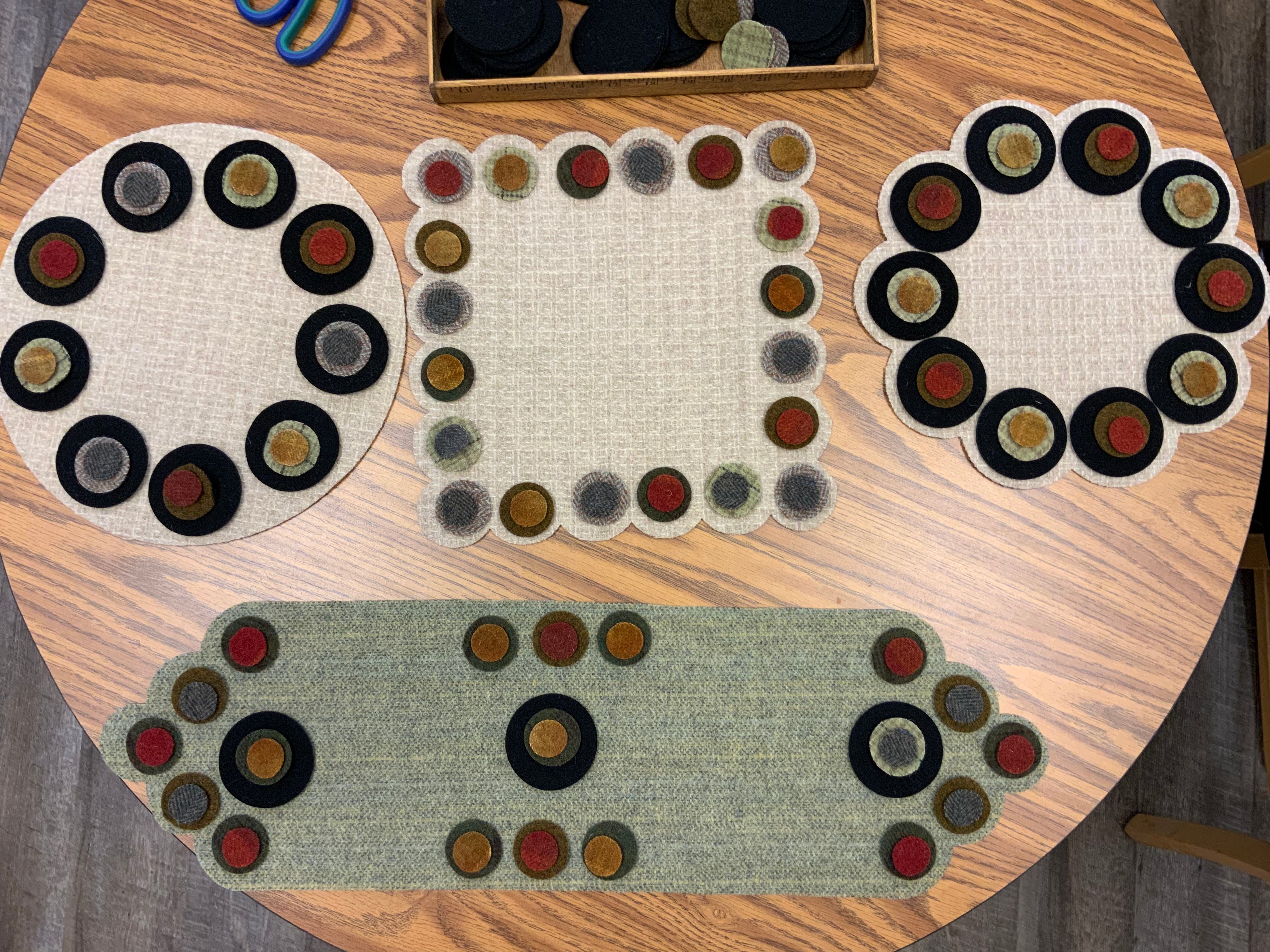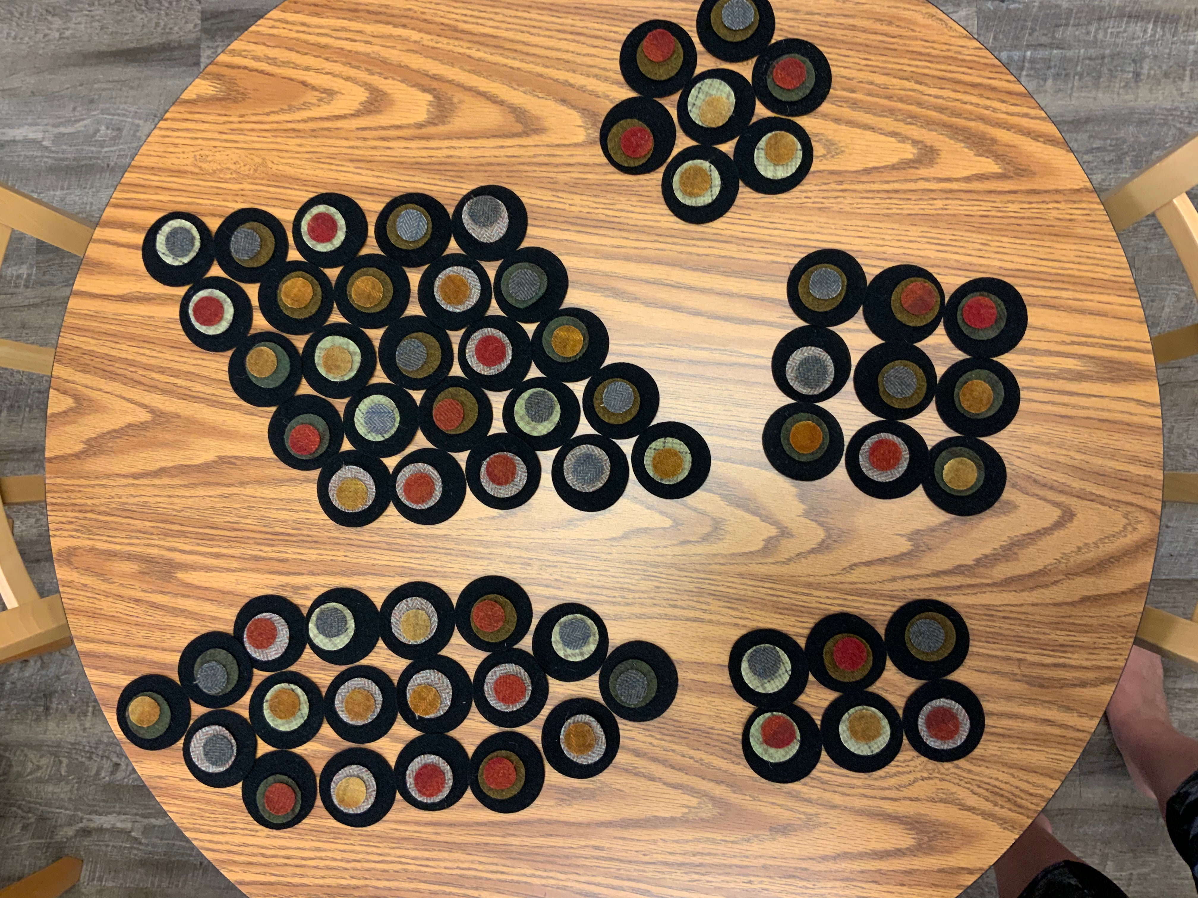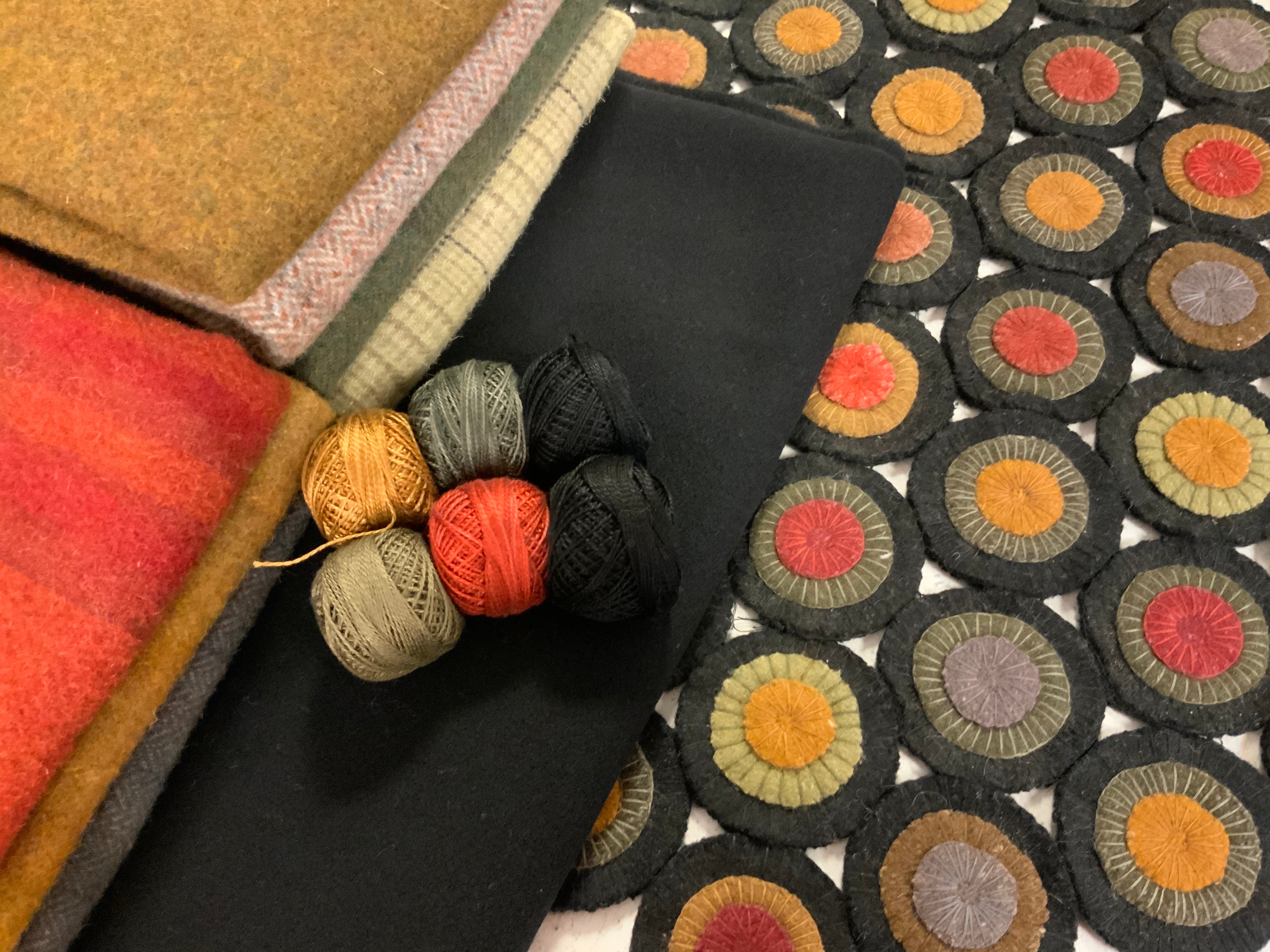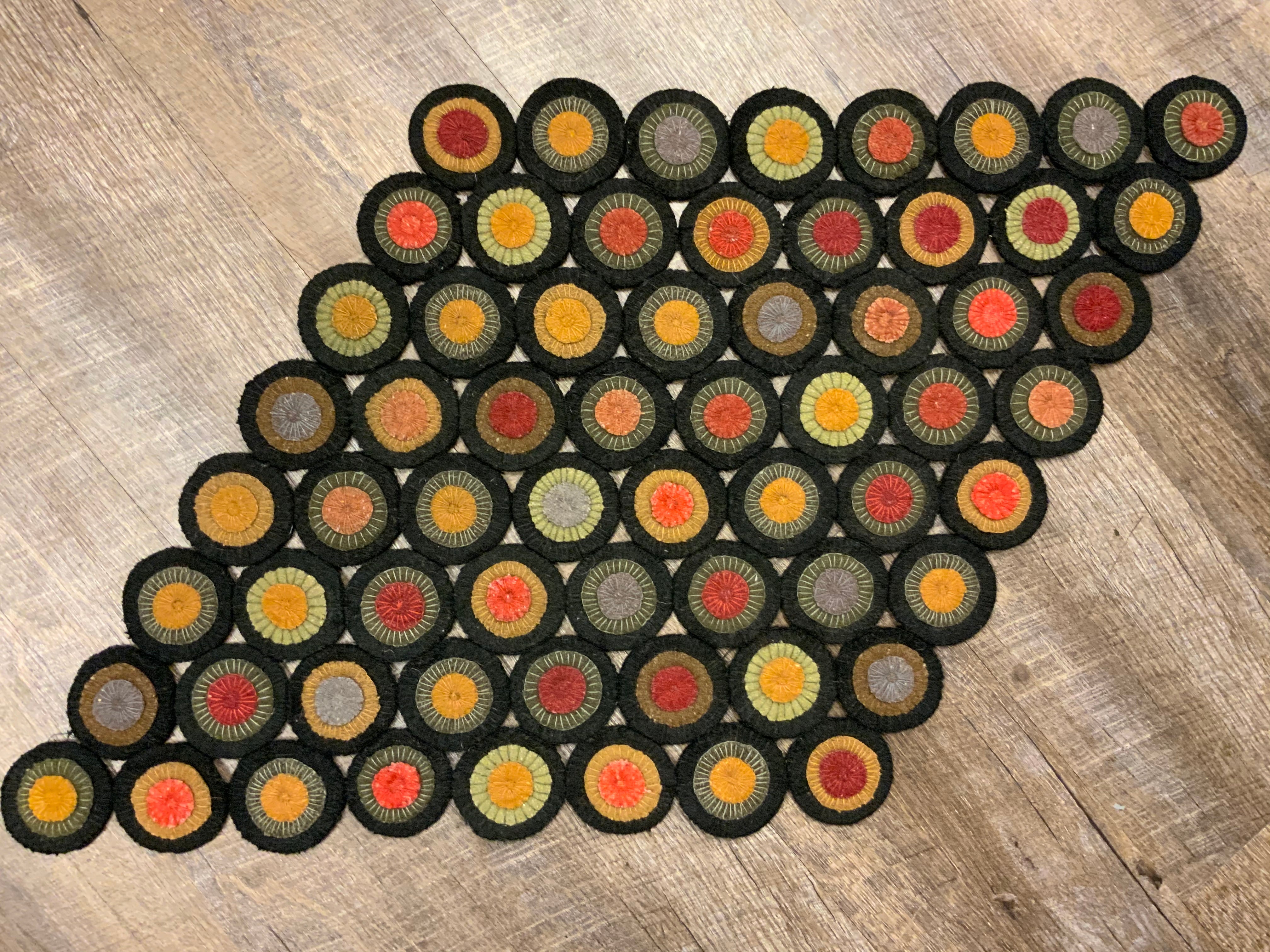 This fun kit is a great project if your traveling or for a summer project, so your not draped in hot wool or just because! It is a large diamond shaped vintage style penny mat. There are 65 triple stacked pennies using reds, mustards and grungy gray on the top layer, then you have mustards, grungy green, golden brown and dull grays as the second layer and sharp black as your base pennies. This kit is all pre cut ready for you to just sit down and stitch! There are 260 pre cut pennies in this kit! All your wool Pennie’s for the top and flannel for the backs of the black circles. It measures 33 inches by 19.5 inches if assembled this way but you can lay it out how ever you like :)