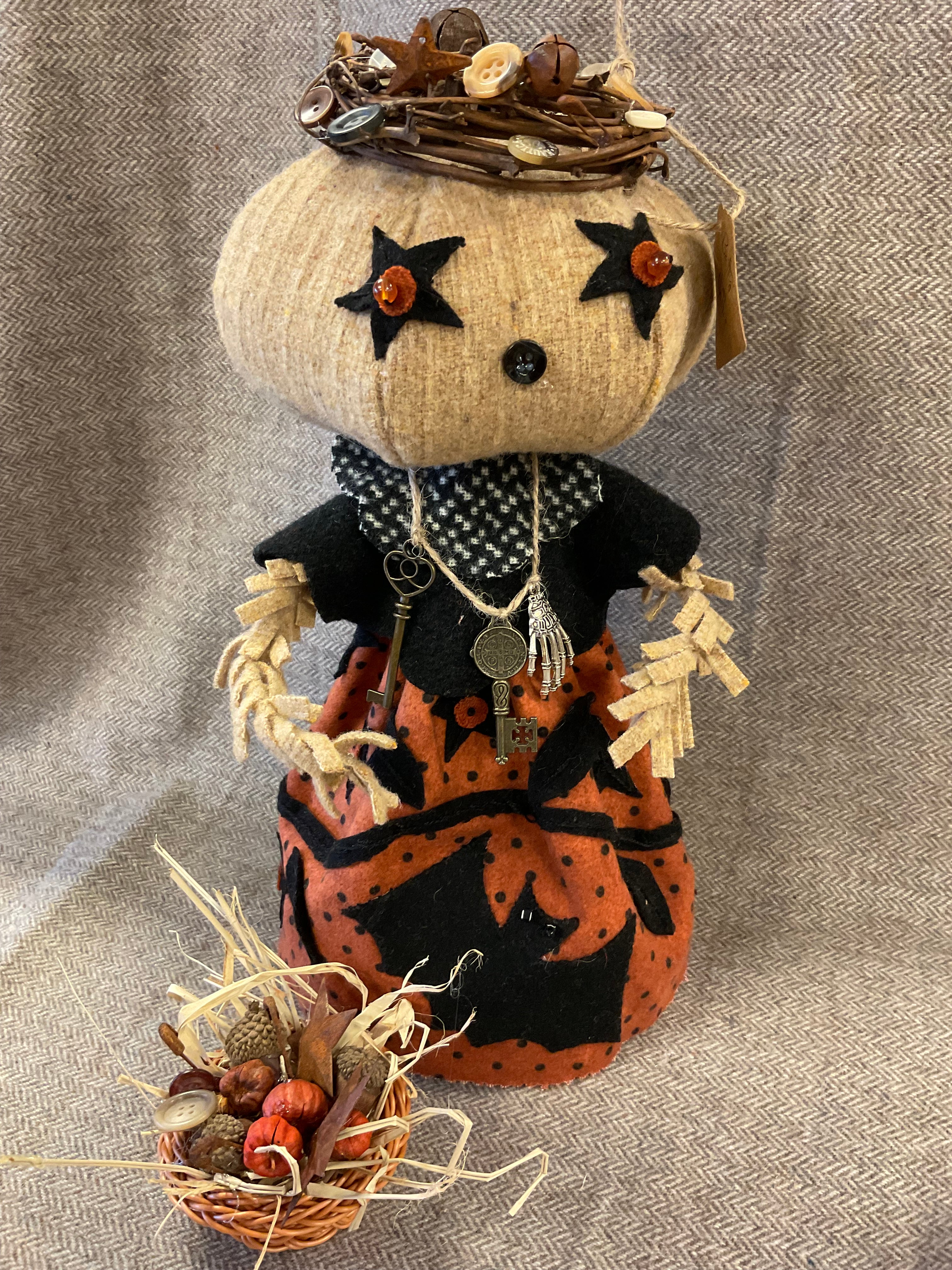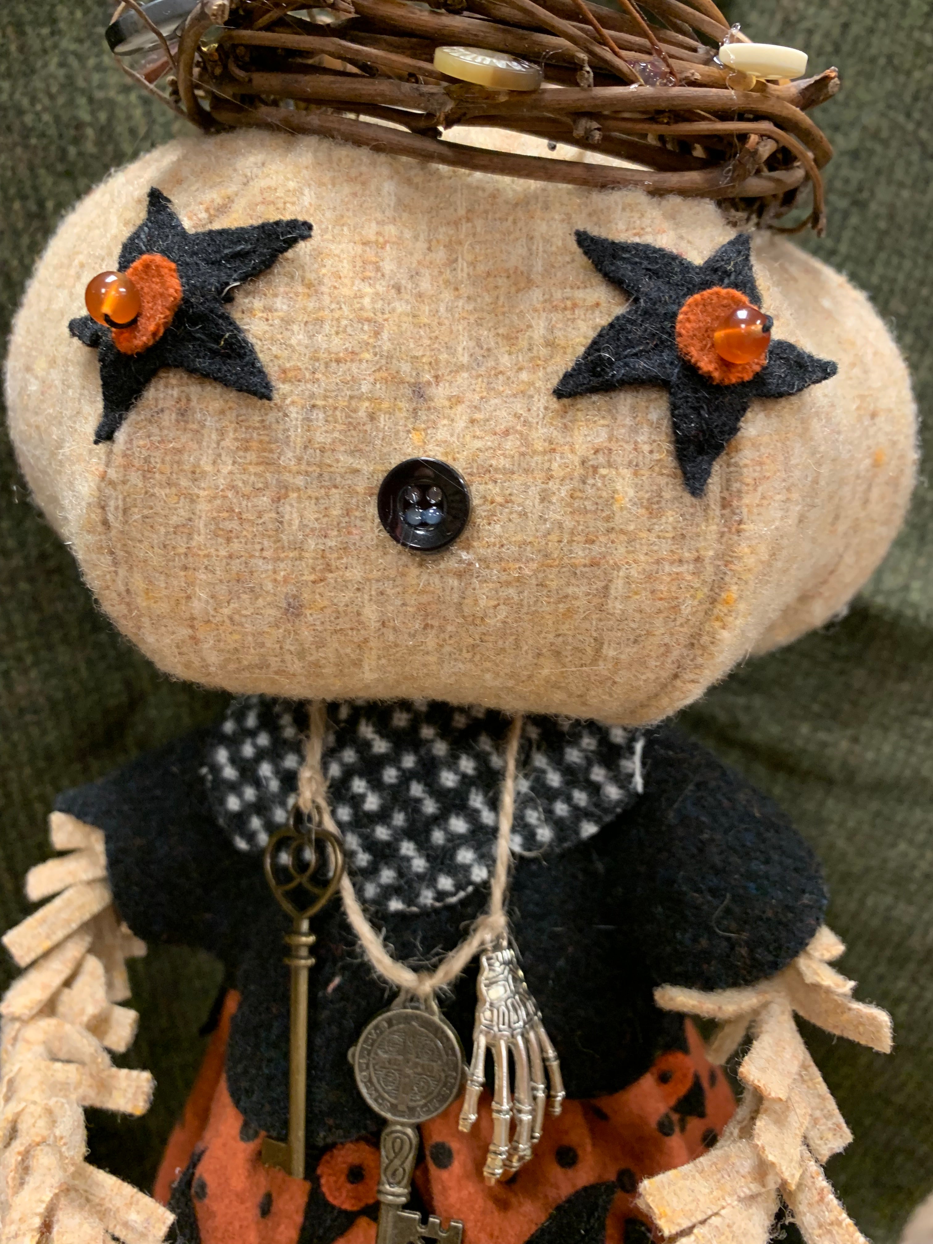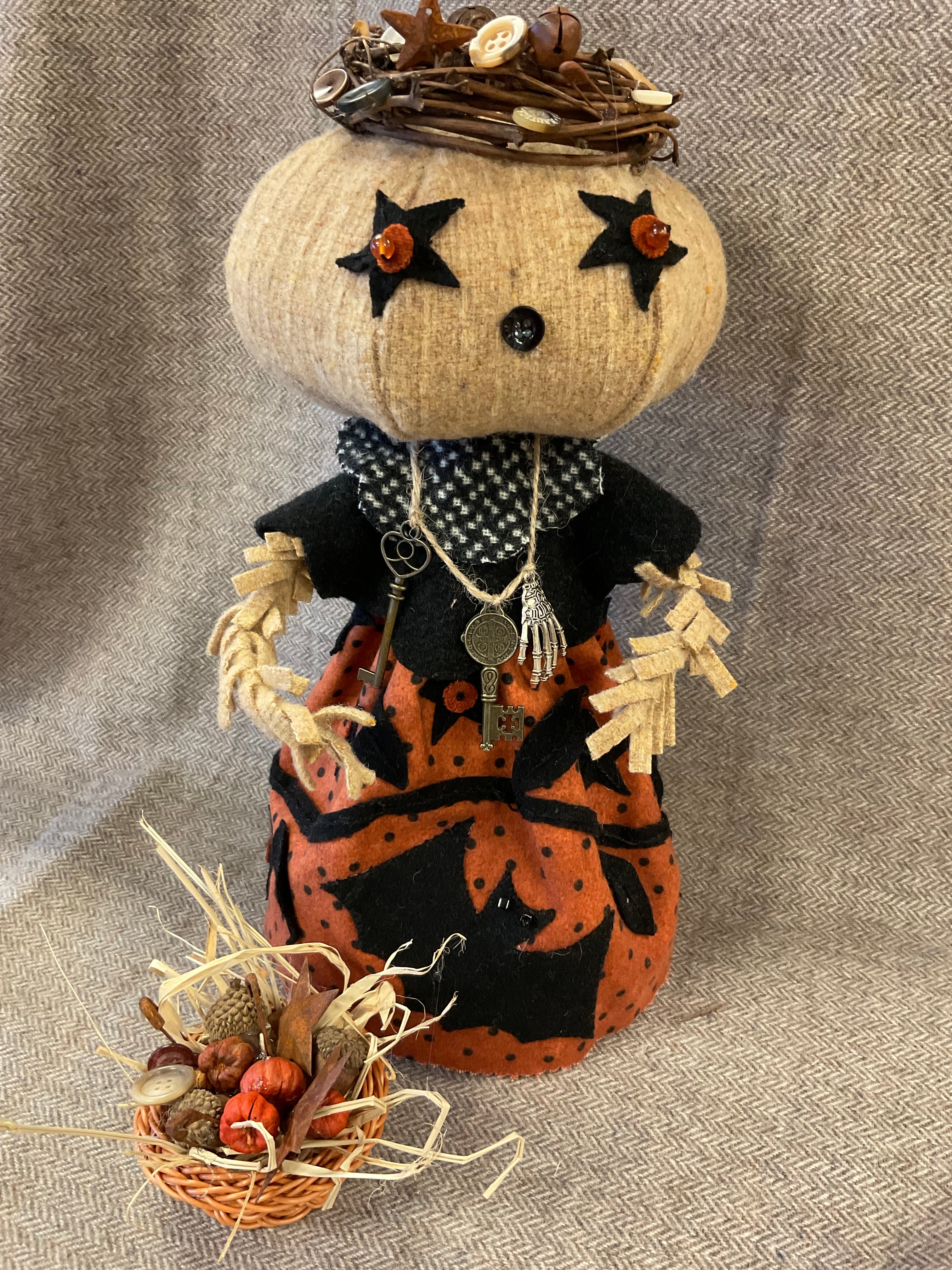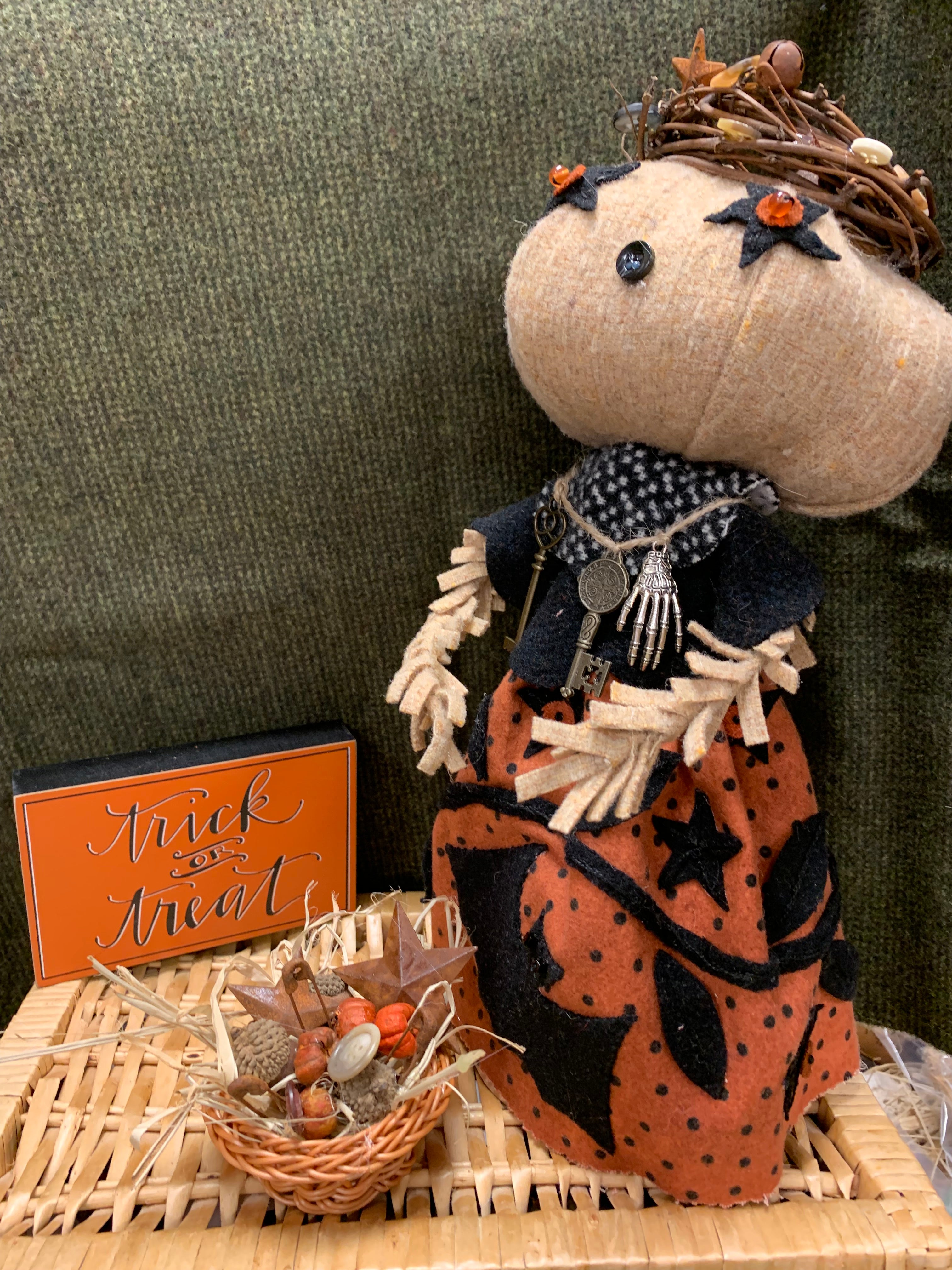 What happens when you combine our mini pumpkins pre cut kit for the head… cotton or wool for the skirt and cape and collar …paper mache cones…cinnamon sticks ….. brass Keys and acorn bells…….snowflakes and holly leaves…. bits of lace and all kinds of pre cut Woolies….wire and jute and beads and more! Wrap in some sari silk and hang an acorn bell or sew on rusty stars….. we make it easy so you can pick one of our girls and we will send you everything to make your own Goblin Girl! So many cool ideas and ways to create your own grouping!