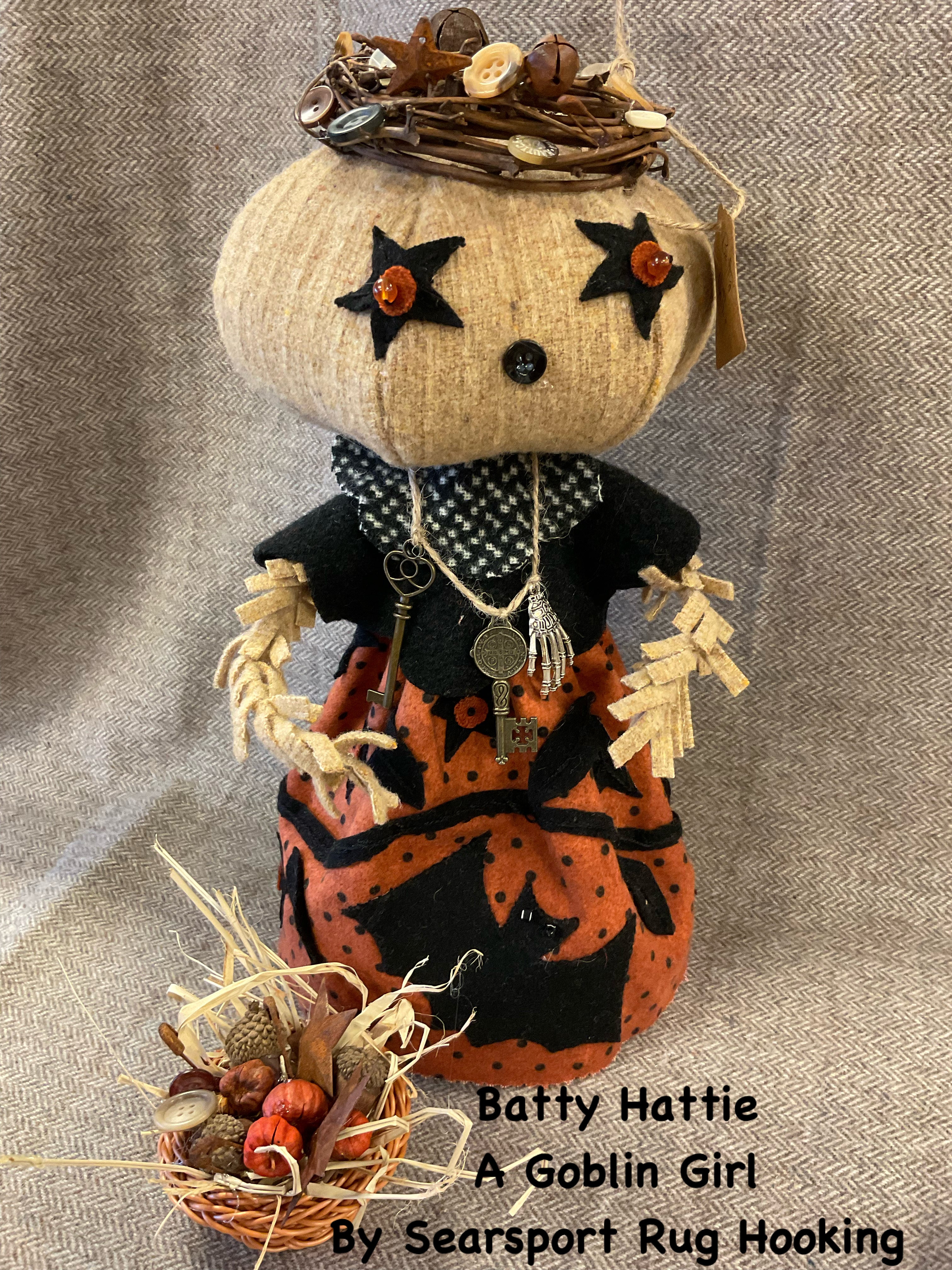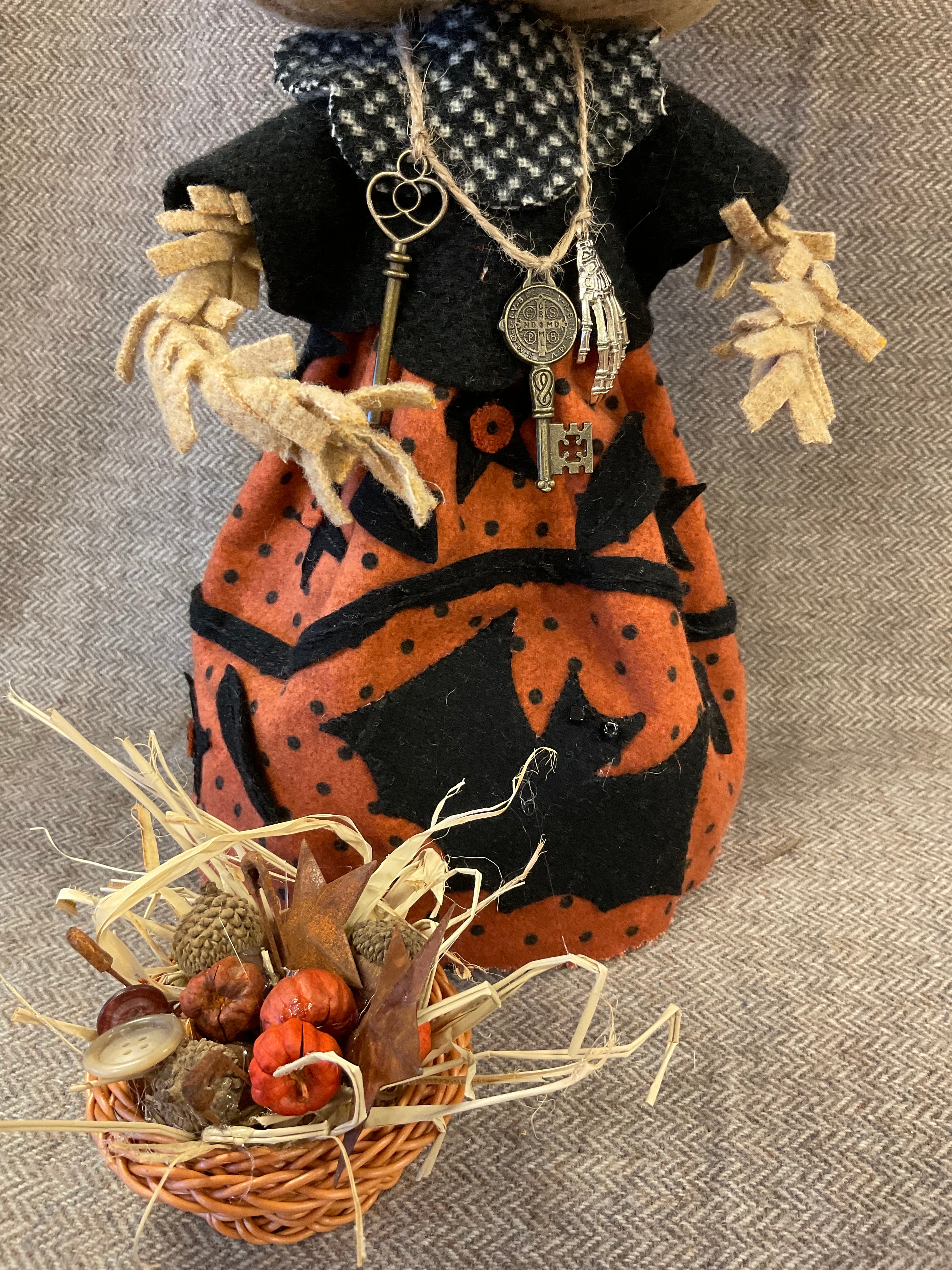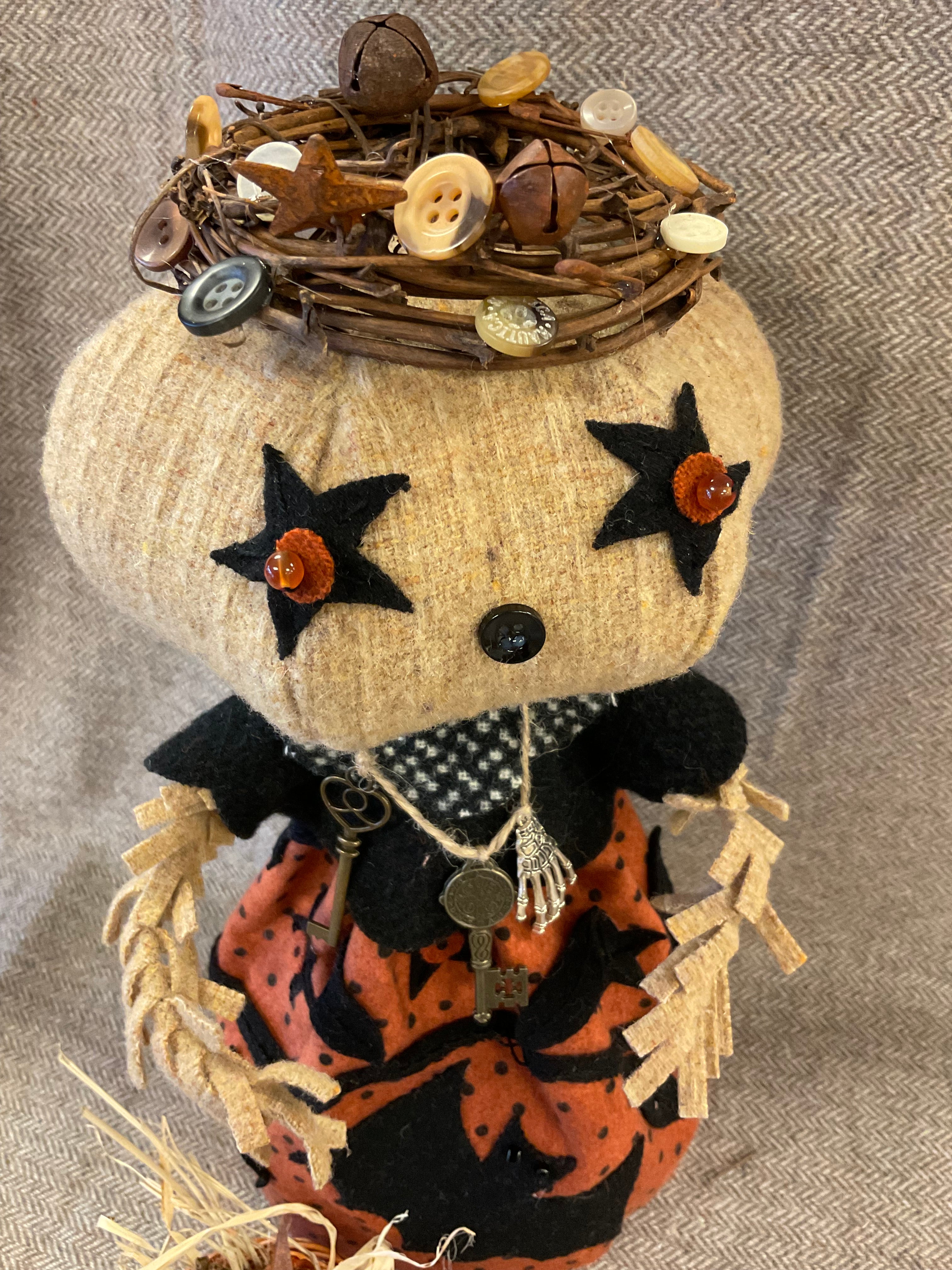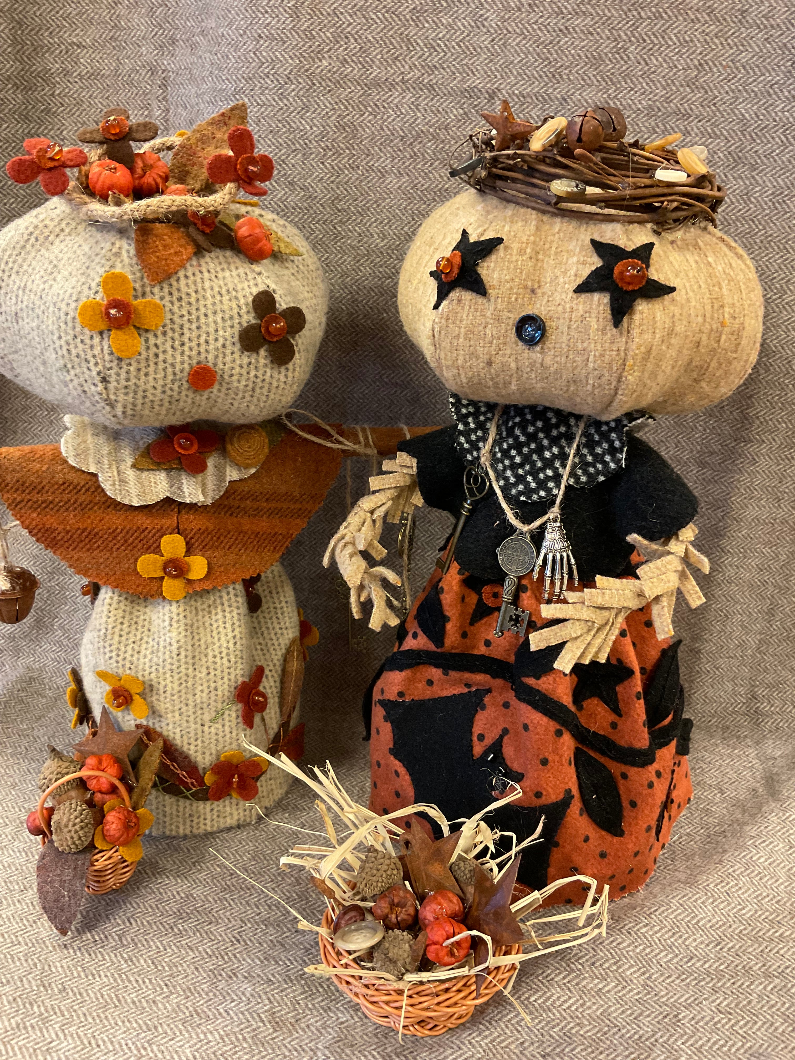 What happens when you combine our mini pumpkins pre cut kit for the head… cotton or wool for the skirt and cape and collar …paper mache cones…cinnamon sticks ….. brass Keys and acorn bells…….snowflakes and holly leaves…. bits of lace and all kinds of pre cut Woolies….wire and jute and beads and more! Wrap in some sari silk and hang an acorn bell or sew on rusty stars….. we make it easy so you can pick one of our girls and we will send you everything to make your own Goblin Girl! So many cool ideas and ways to create your own grouping!