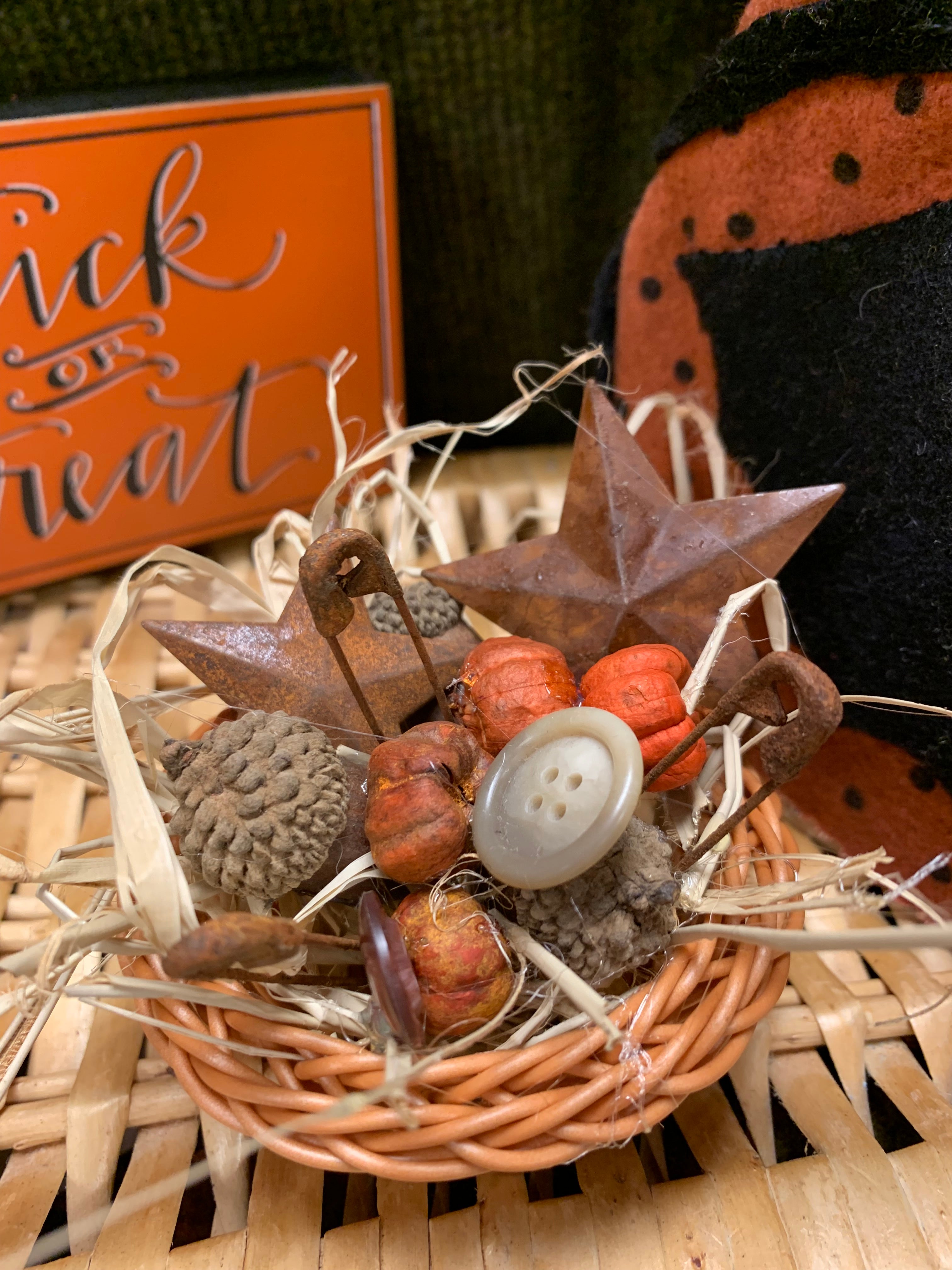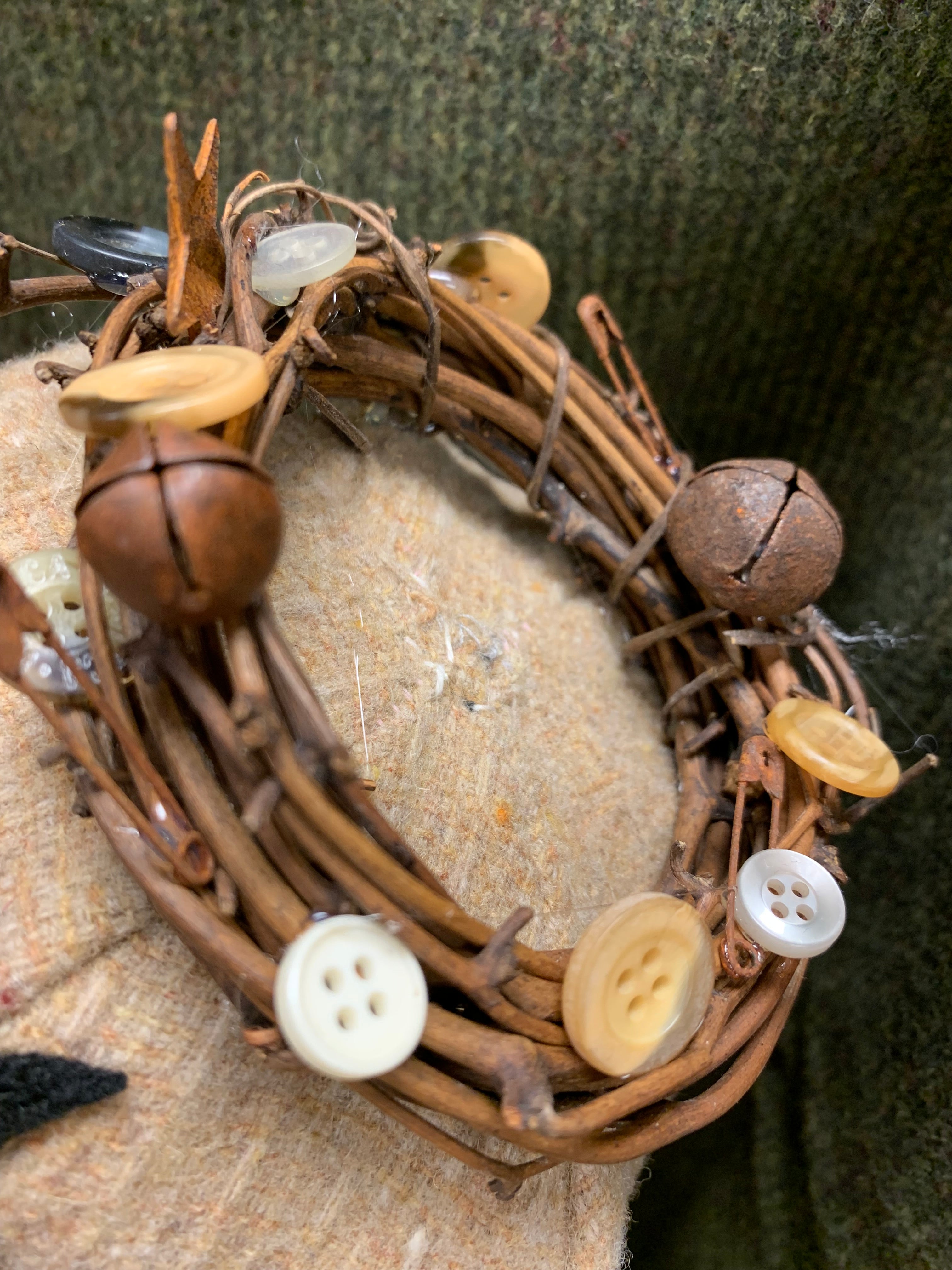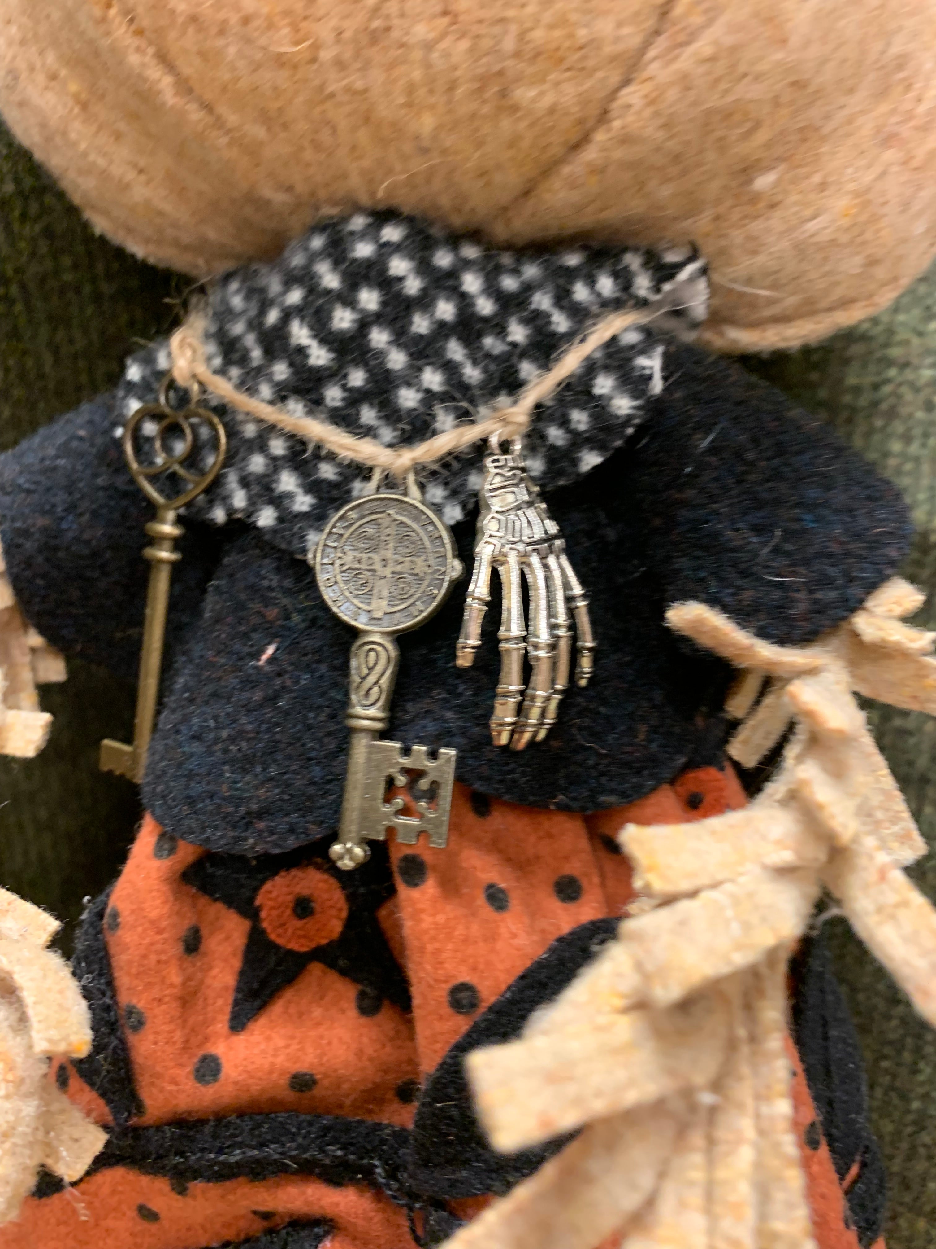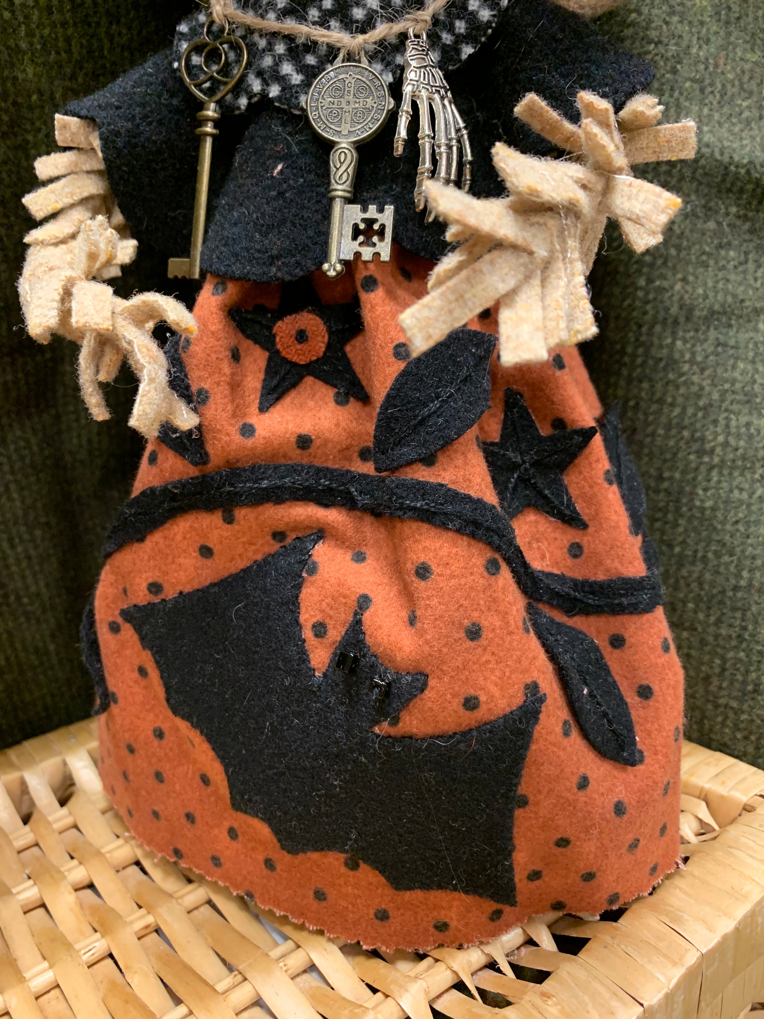 What happens when you combine our mini pumpkins pre cut kit for the head… cotton or wool for the skirt and cape and collar …paper mache cones…cinnamon sticks ….. brass Keys and acorn bells…….snowflakes and holly leaves…. bits of lace and all kinds of pre cut Woolies….wire and jute and beads and more! Wrap in some sari silk and hang an acorn bell or sew on rusty stars….. we make it easy so you can pick one of our girls and we will send you everything to make your own Goblin Girl! So many cool ideas and ways to create your own grouping!