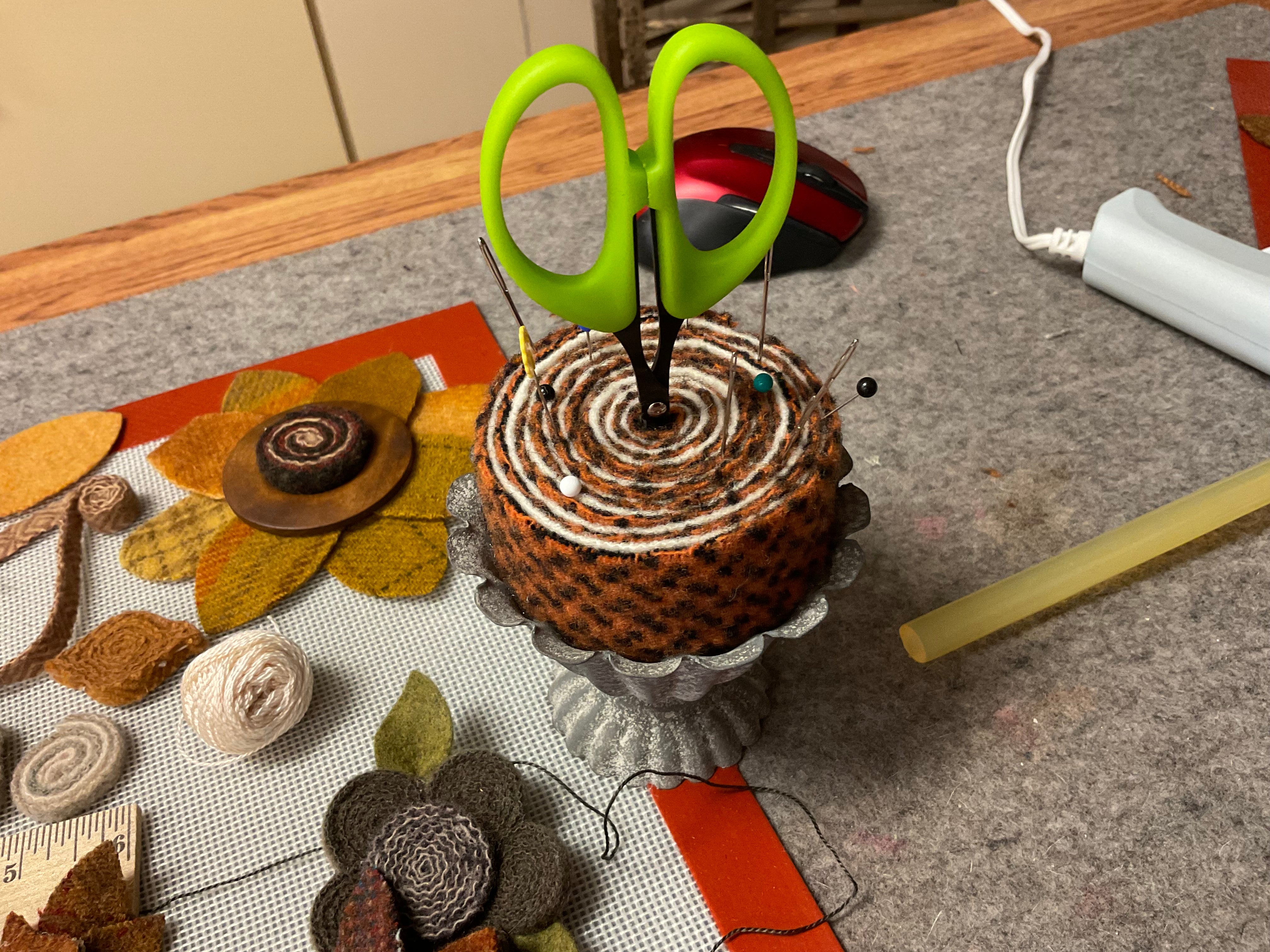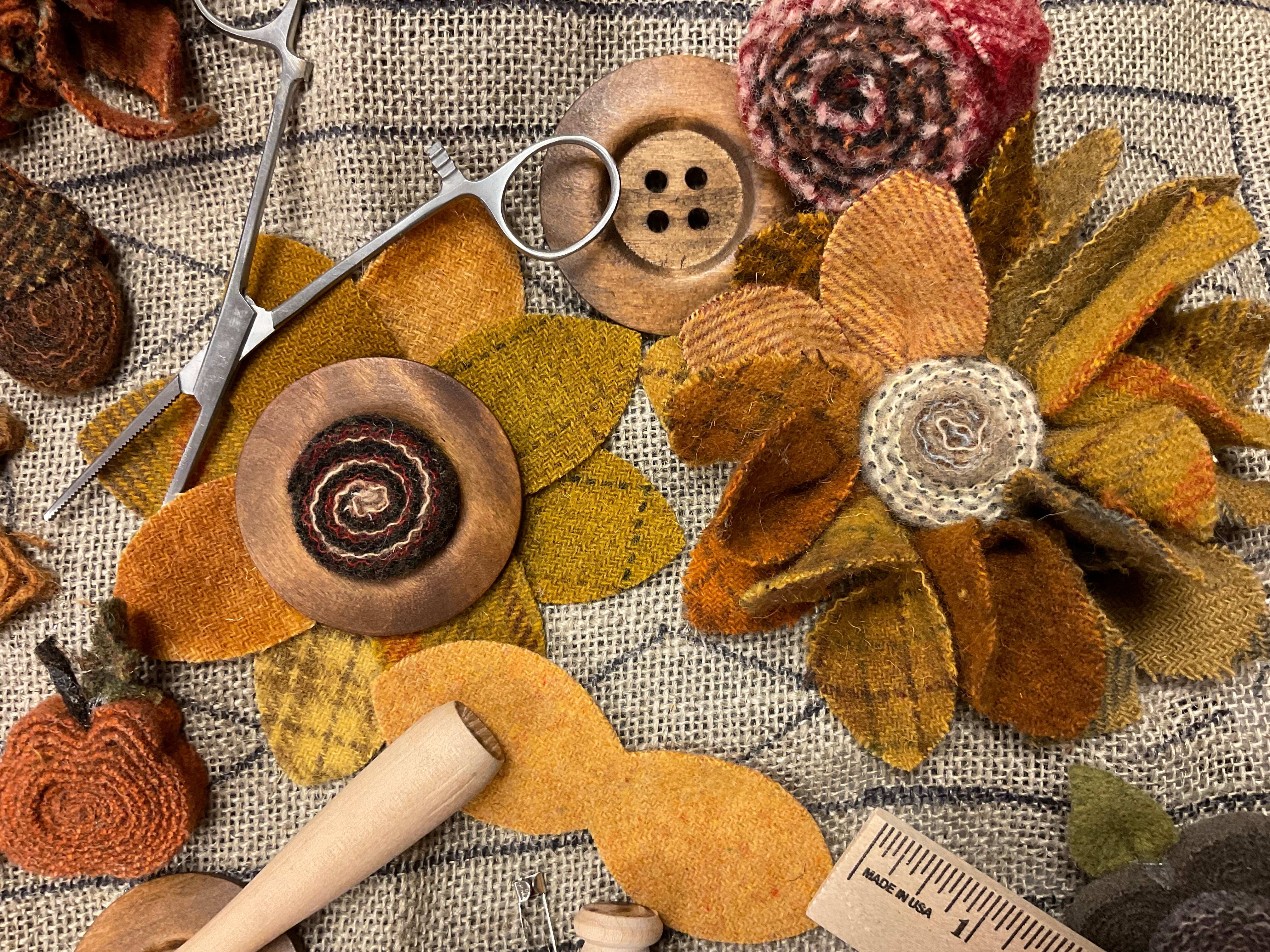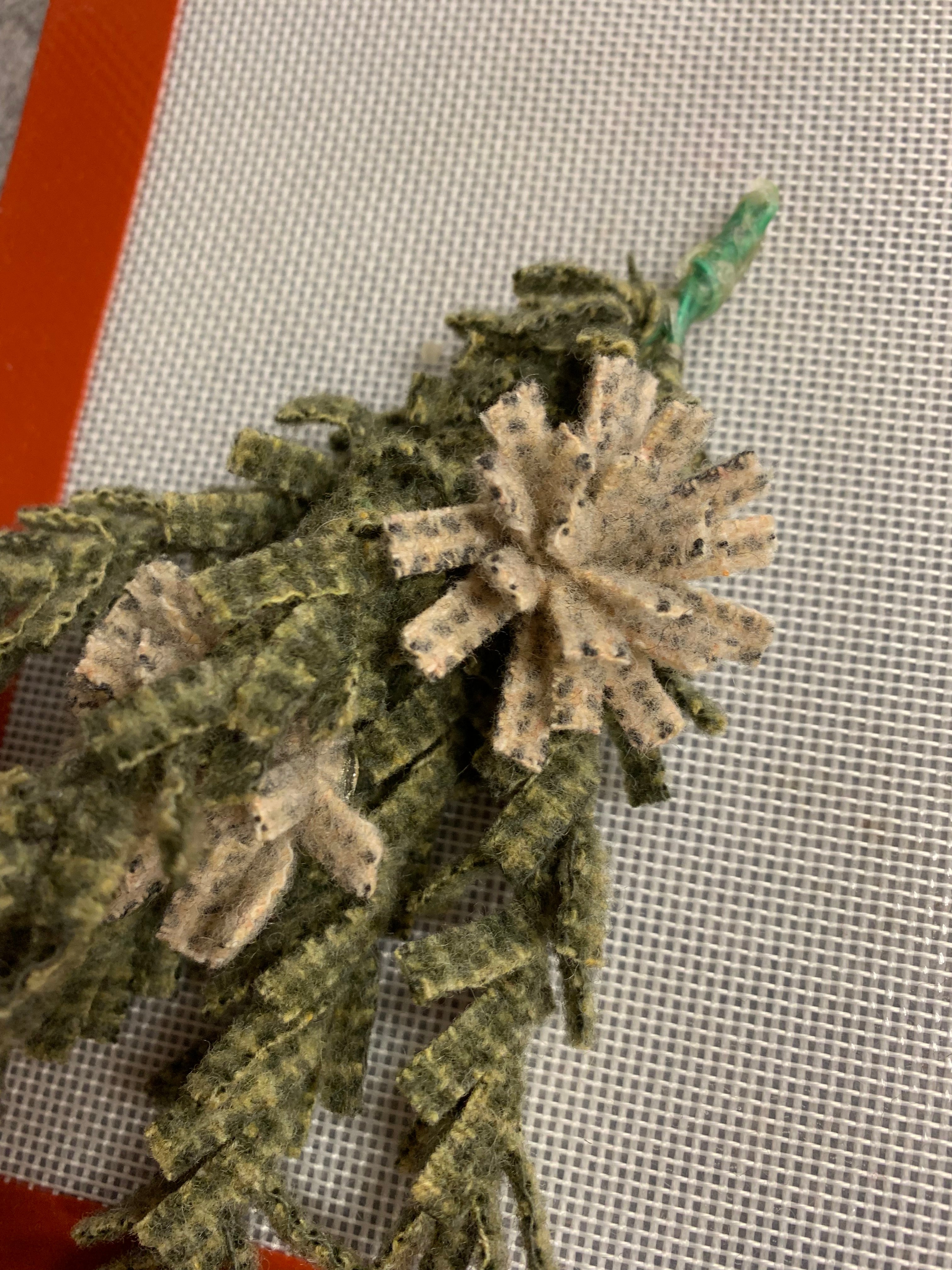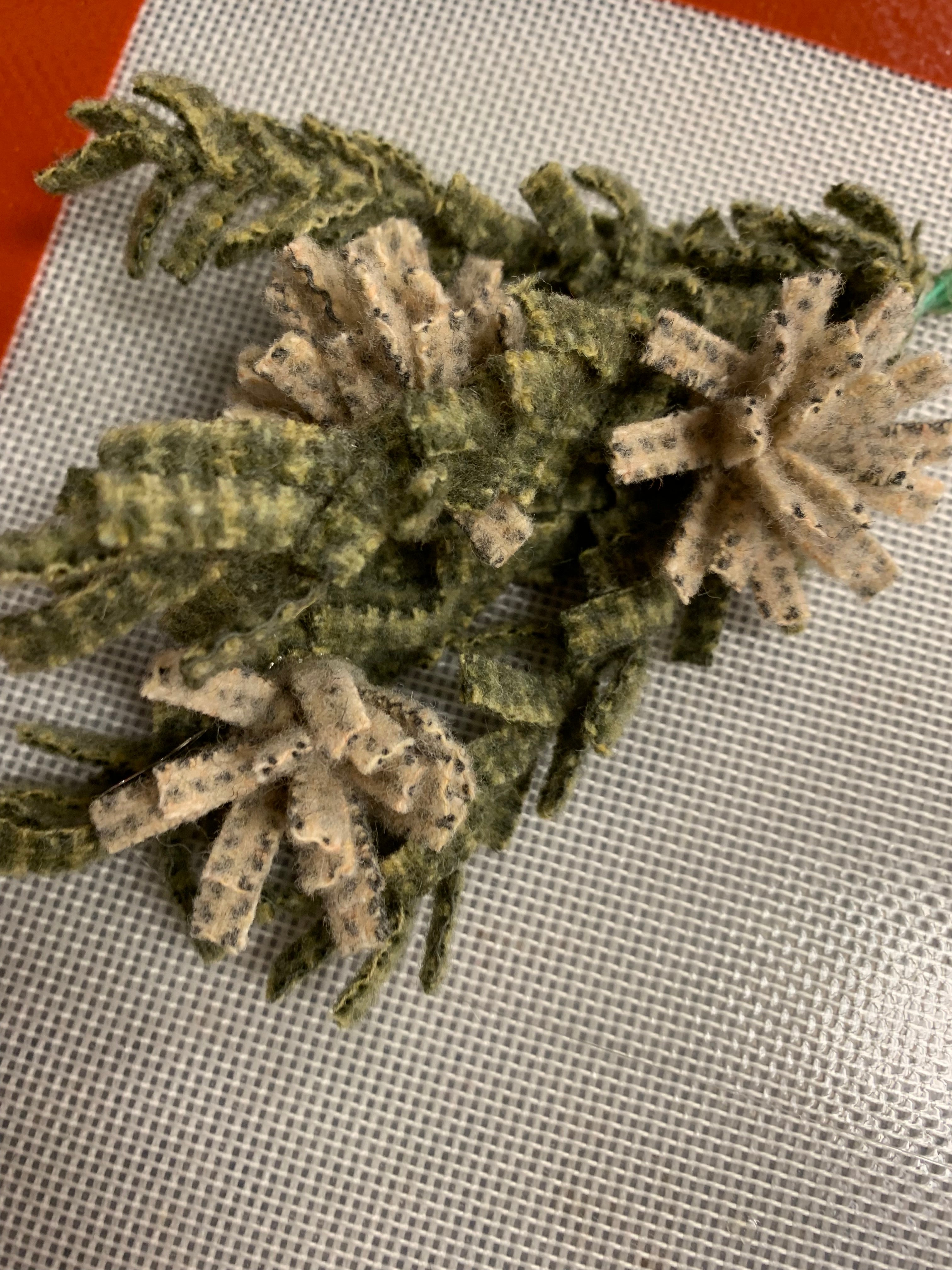 Some people can whirl and twirl up a quillie with no problem! But some of us need to help our fingers a little if we can’t or we need a couple dozen for an egg or tree or other large project. Neil’s Quicker Quillies tool is perfect!   Slip the end of your wool strip in the opening and simple twirl to load up the quillie! Slide off and add a few stitches or I cover the back in hot glue and press on our glue mat to let cool.  Did you see the bouquet we made for the snowflake goblin girl? It’s branches of twisted greens and bursting with creamy wool flowers!