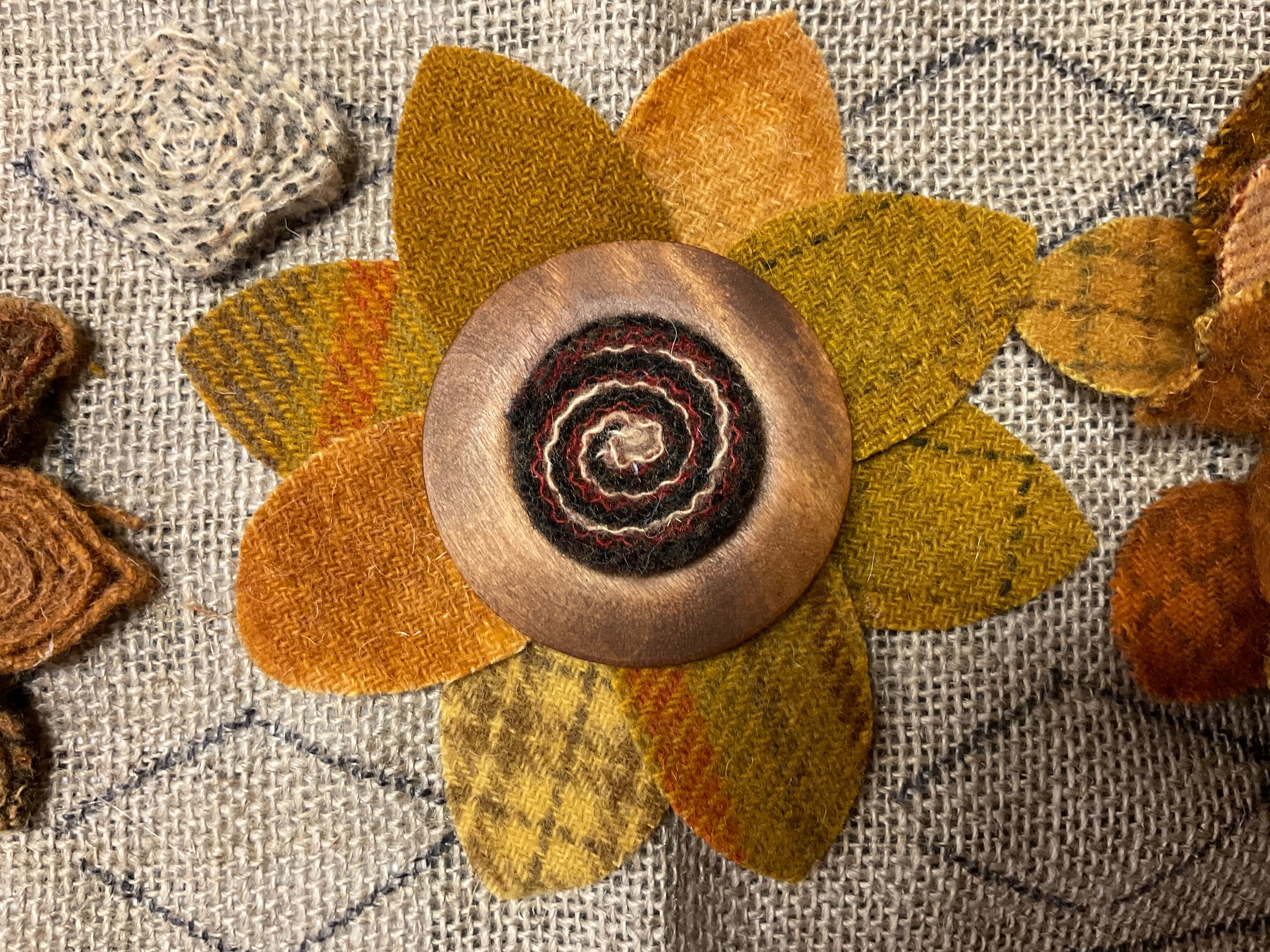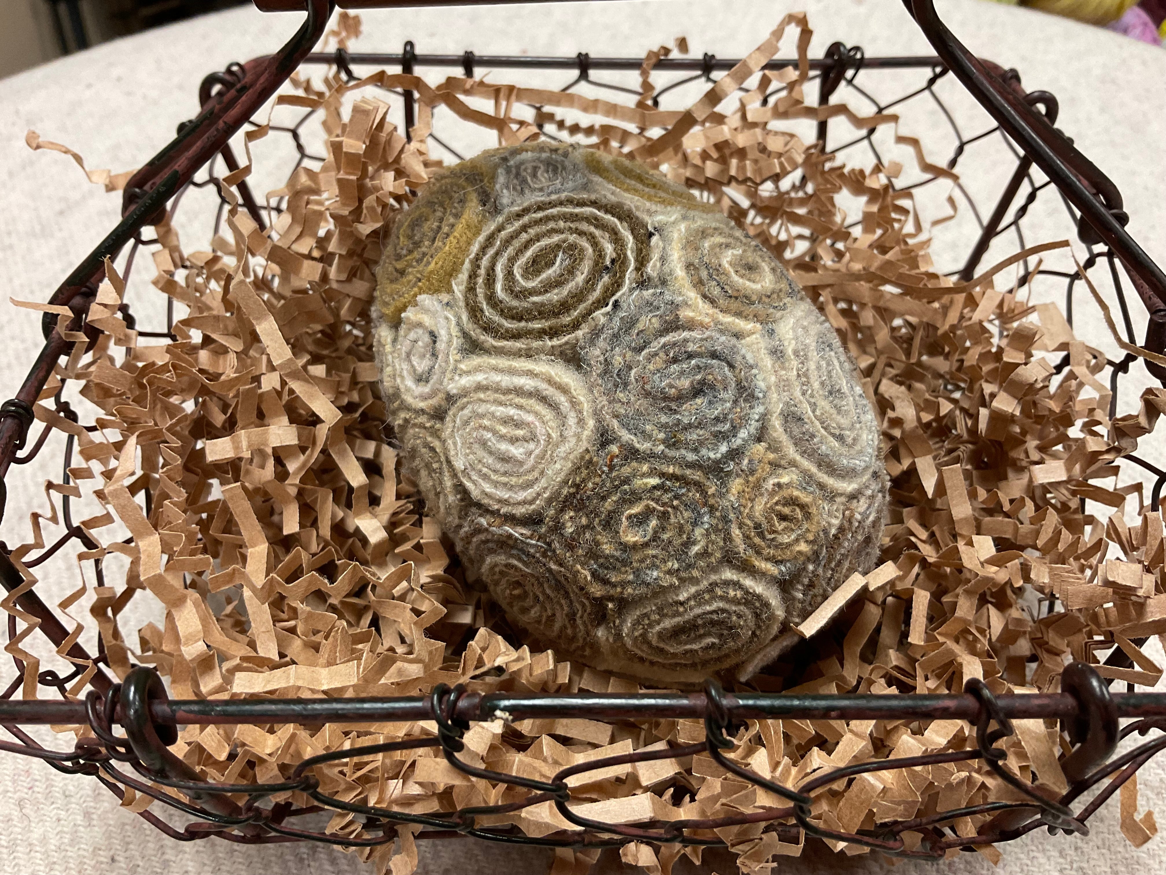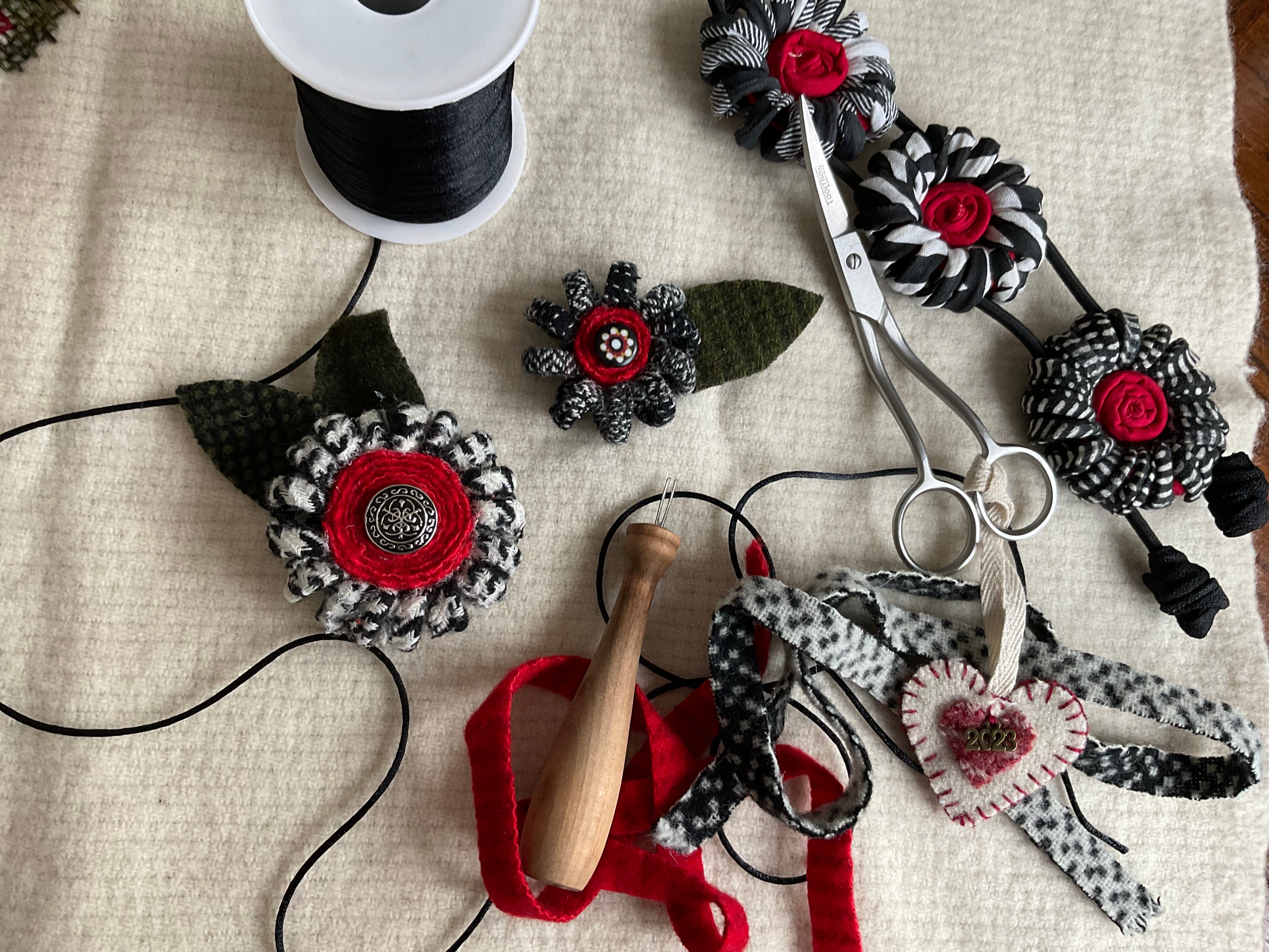 Some people can whirl and twirl up a quillie with no problem! But some of us need to help our fingers a little if we can’t or we need a couple dozen for an egg or tree or other large project. Neil’s Quicker Quillies tool is perfect!   Slip the end of your wool strip in the opening and simple twirl to load up the quillie! Slide off and add a few stitches or I cover the back in hot glue and press on our glue mat to let cool.  Did you see the bouquet we made for the snowflake goblin girl? It’s branches of twisted greens and bursting with creamy wool flowers!