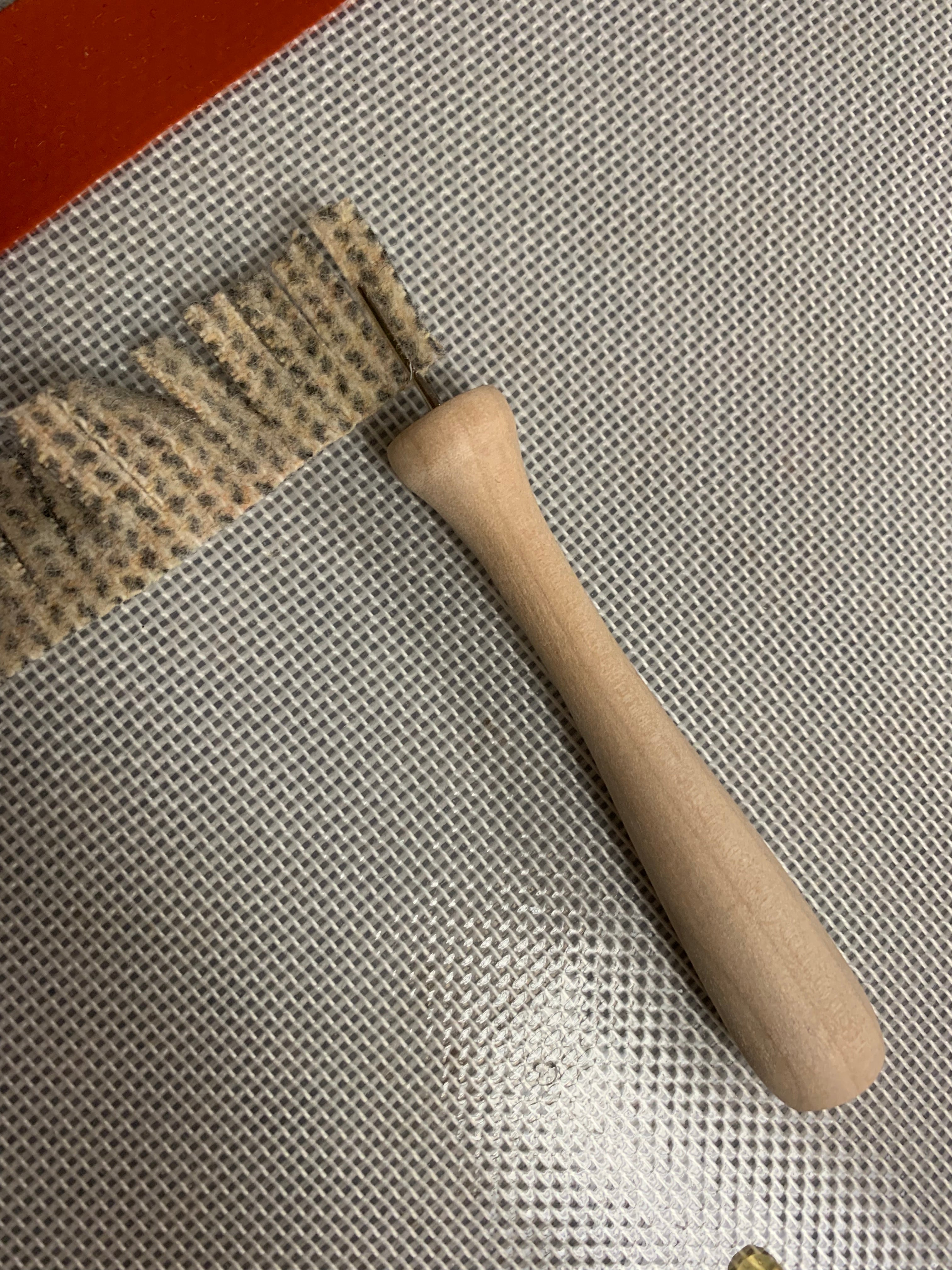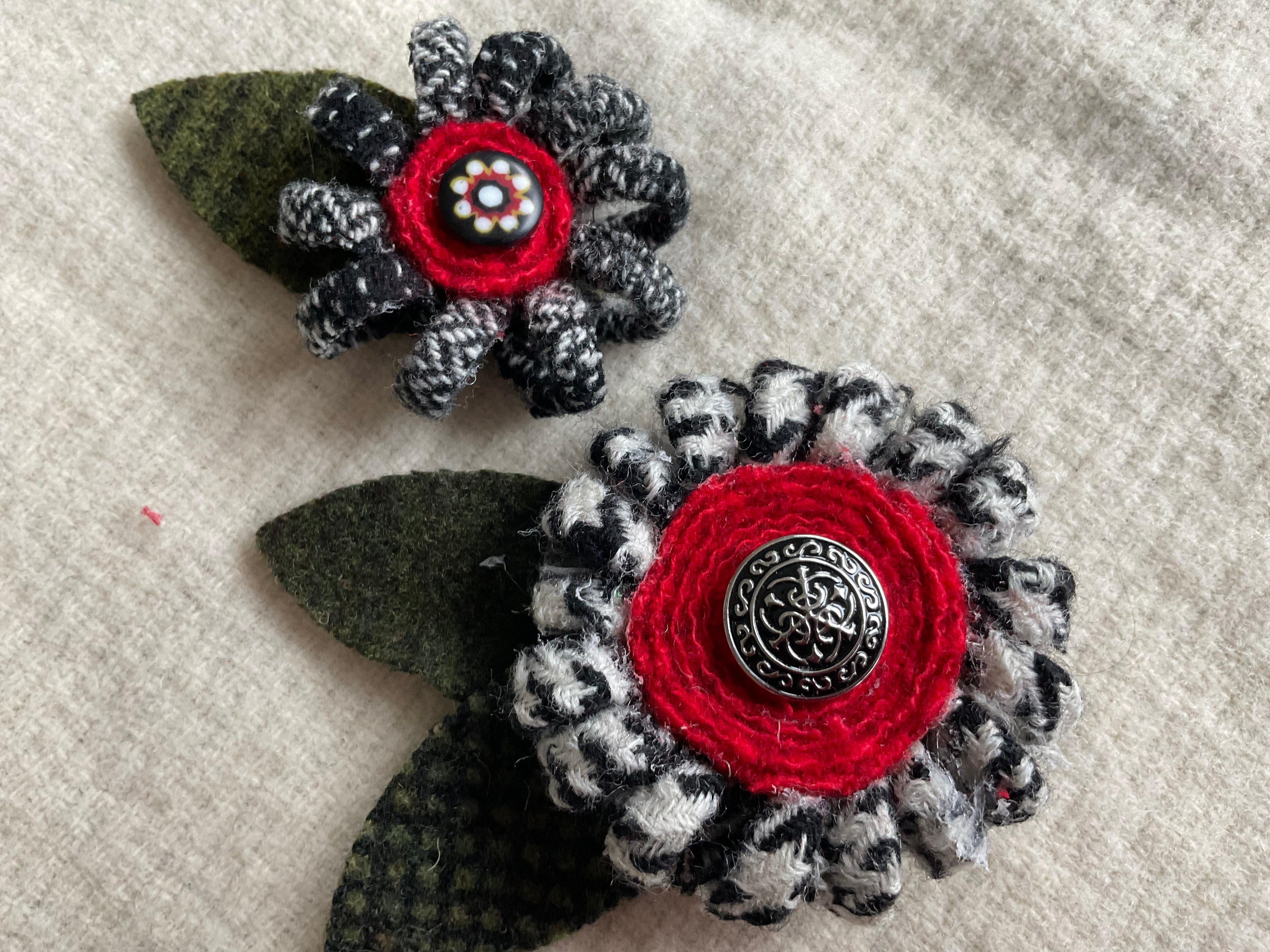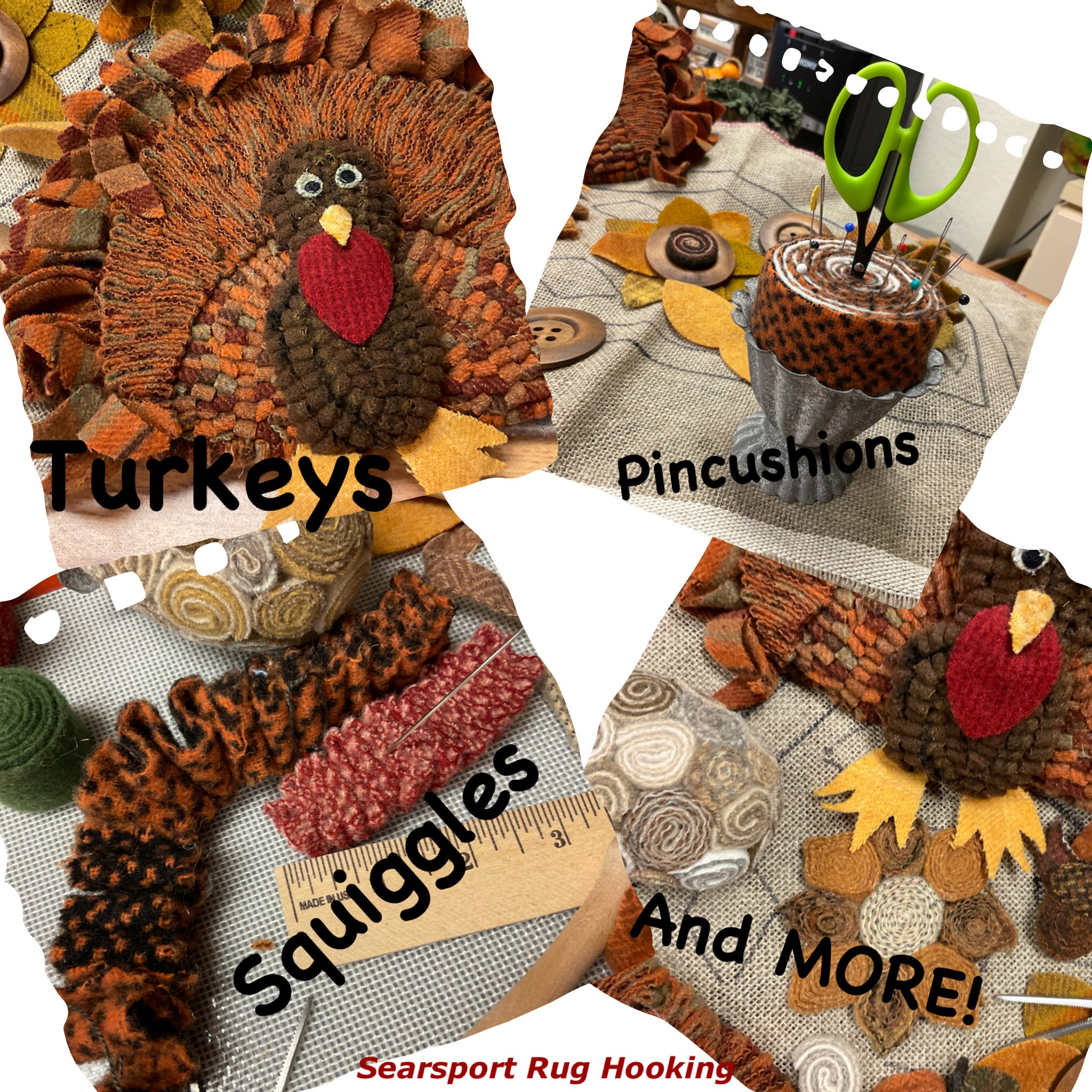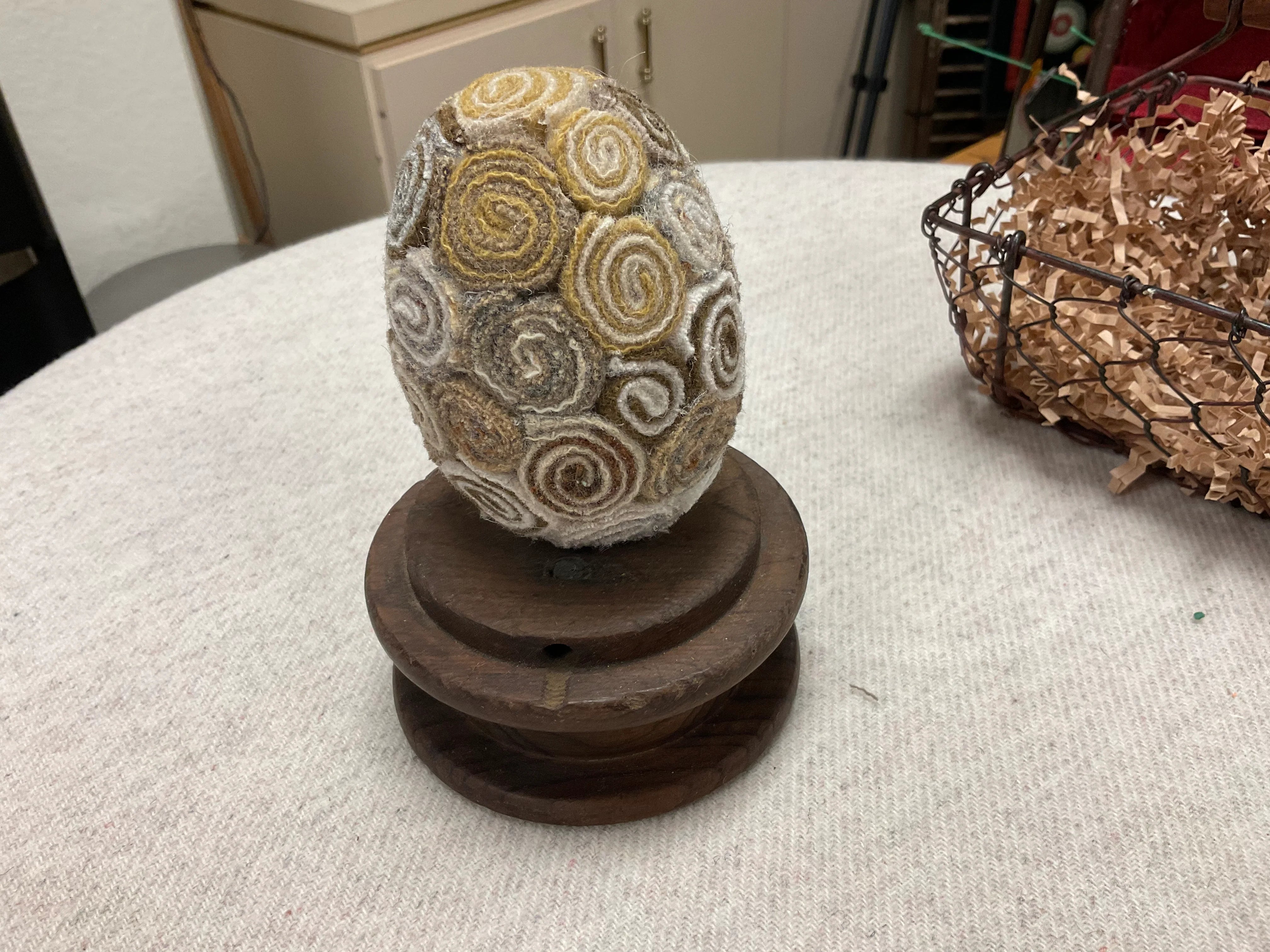 Some people can whirl and twirl up a quillie with no problem! But some of us need to help our fingers a little if we can’t or we need a couple dozen for an egg or tree or other large project. Neil’s Quicker Quillies tool is perfect!   Slip the end of your wool strip in the opening and simple twirl to load up the quillie! Slide off and add a few stitches or I cover the back in hot glue and press on our glue mat to let cool.  Did you see the bouquet we made for the snowflake goblin girl? It’s branches of twisted greens and bursting with creamy wool flowers!