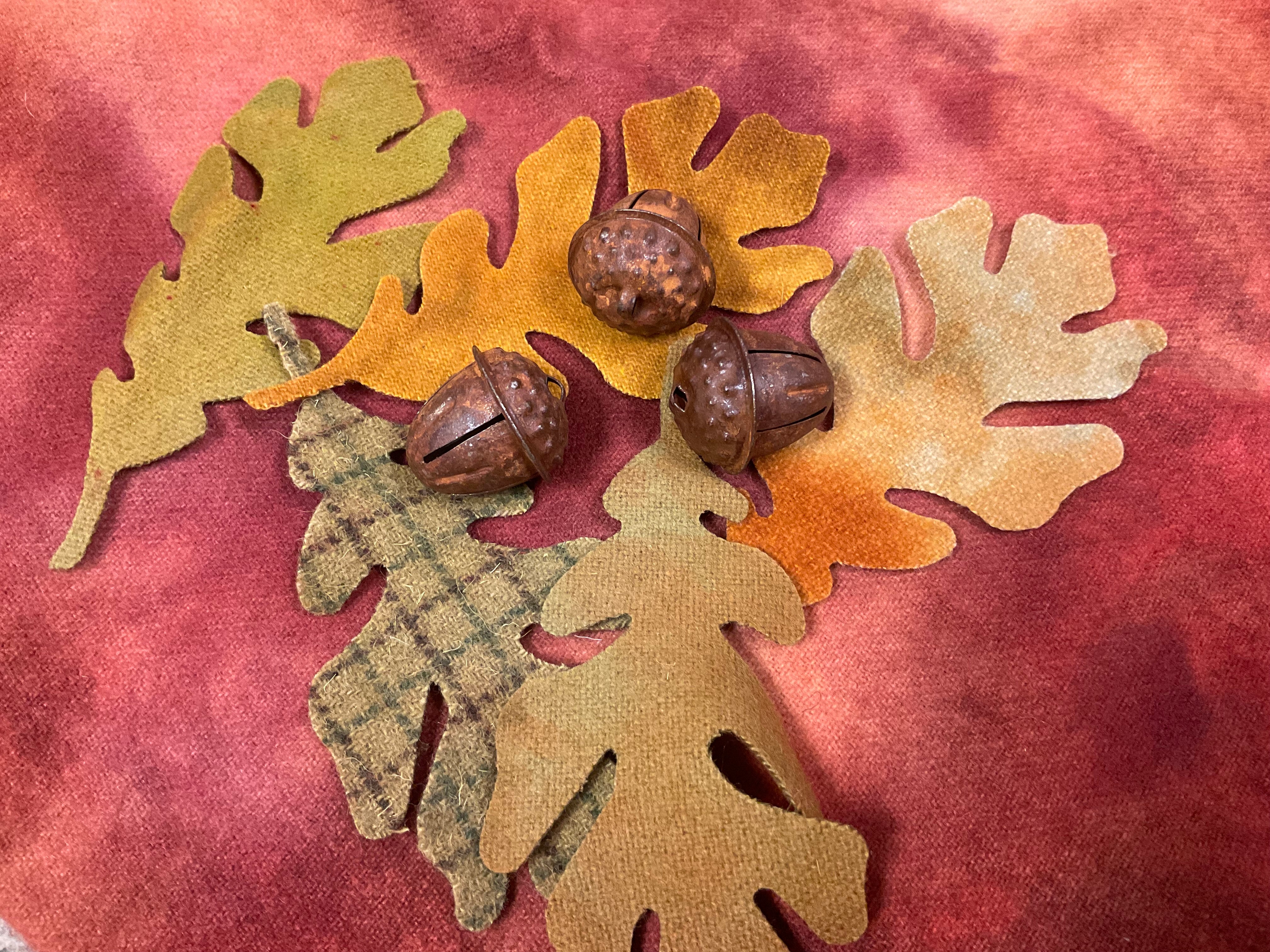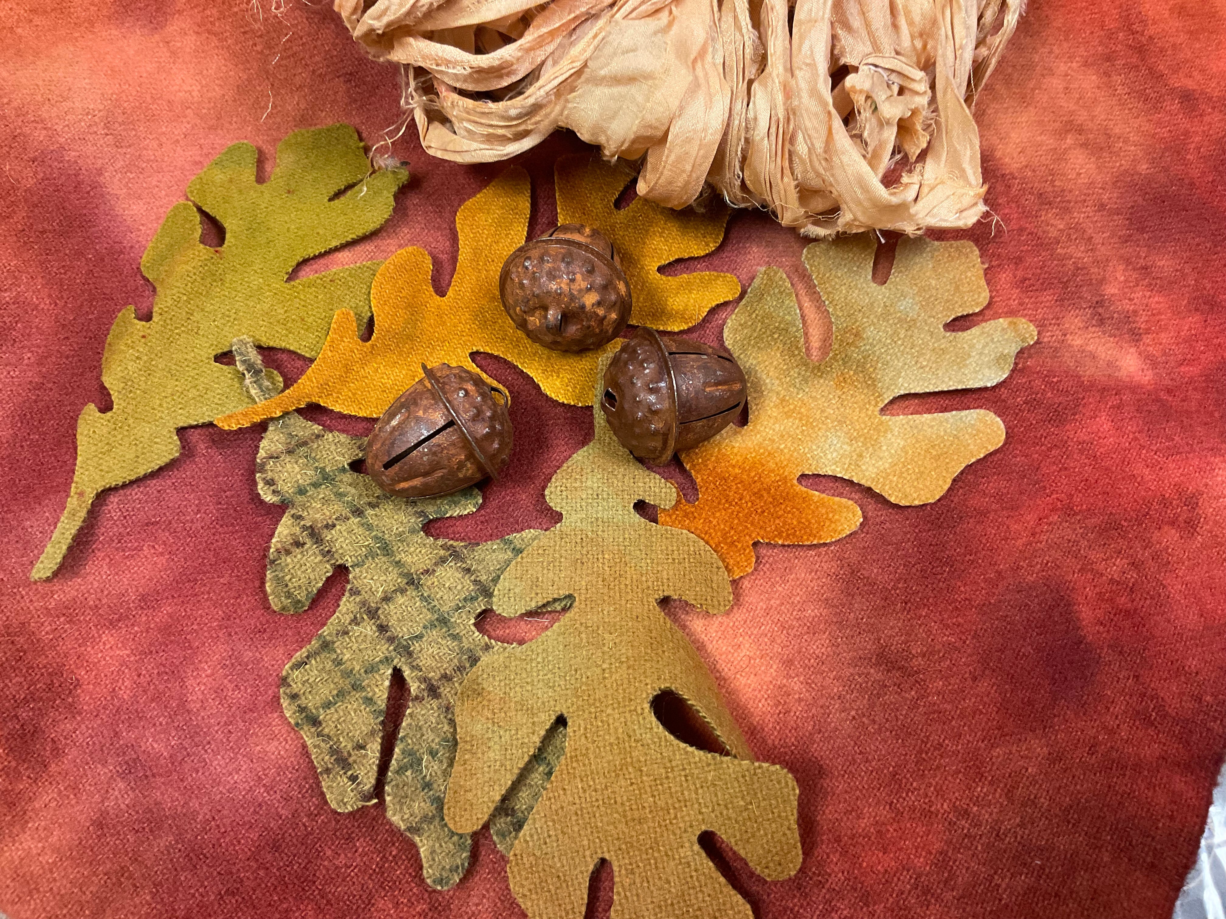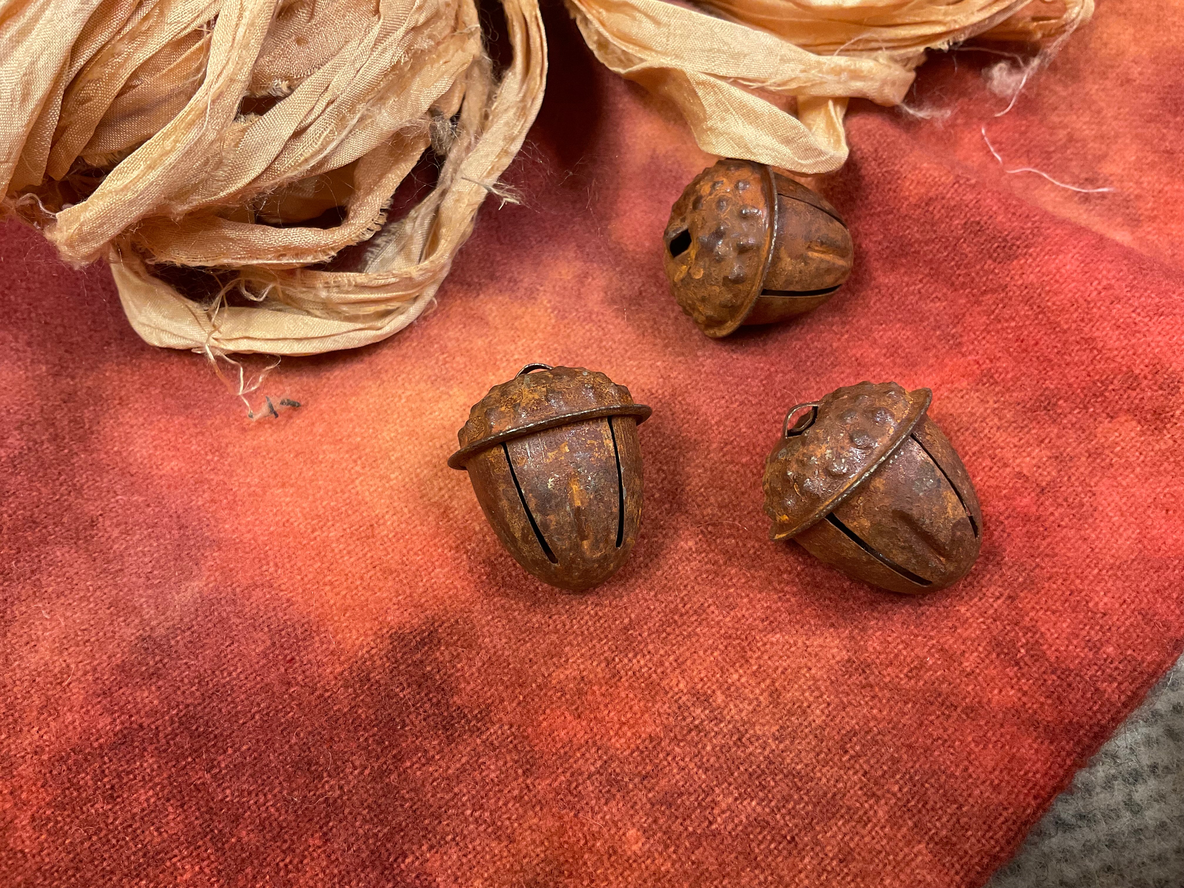 Very cute primitive, rusty acorn bells measure 1.25 inches each making them perfect for ornaments and small twisted wool projects. They are adorable and perfect with our overdyed fall oak leaves. What will you create with them?