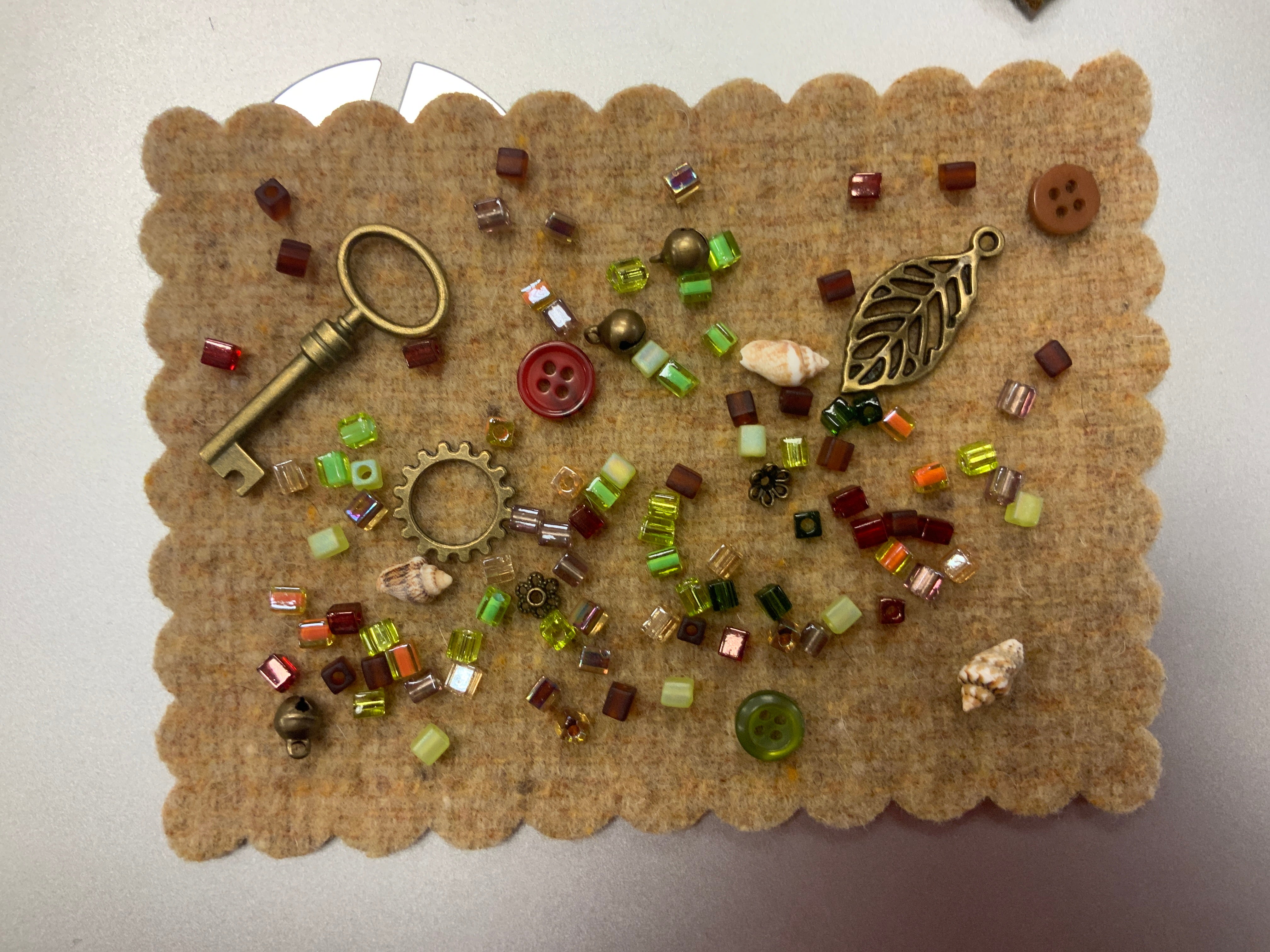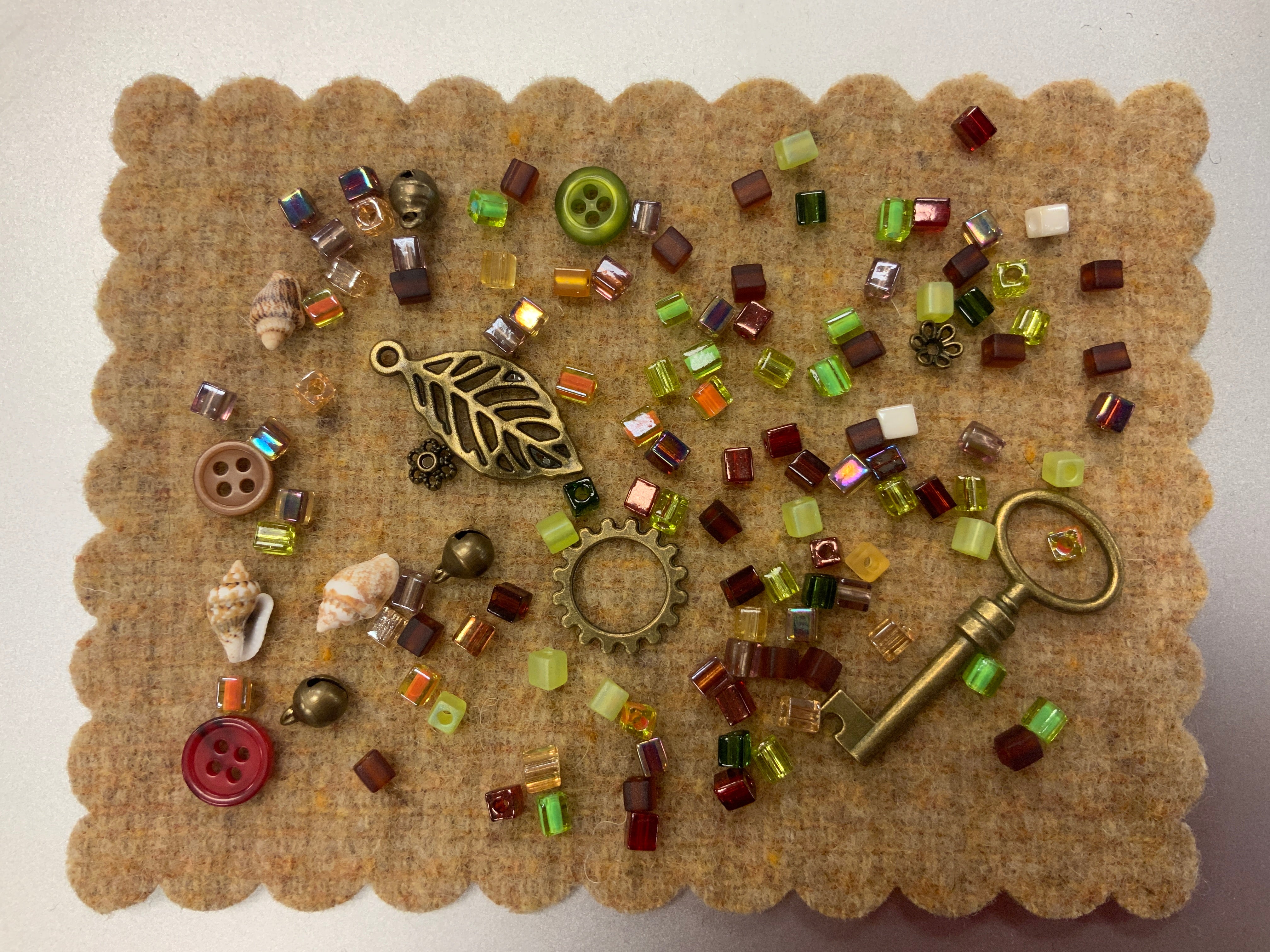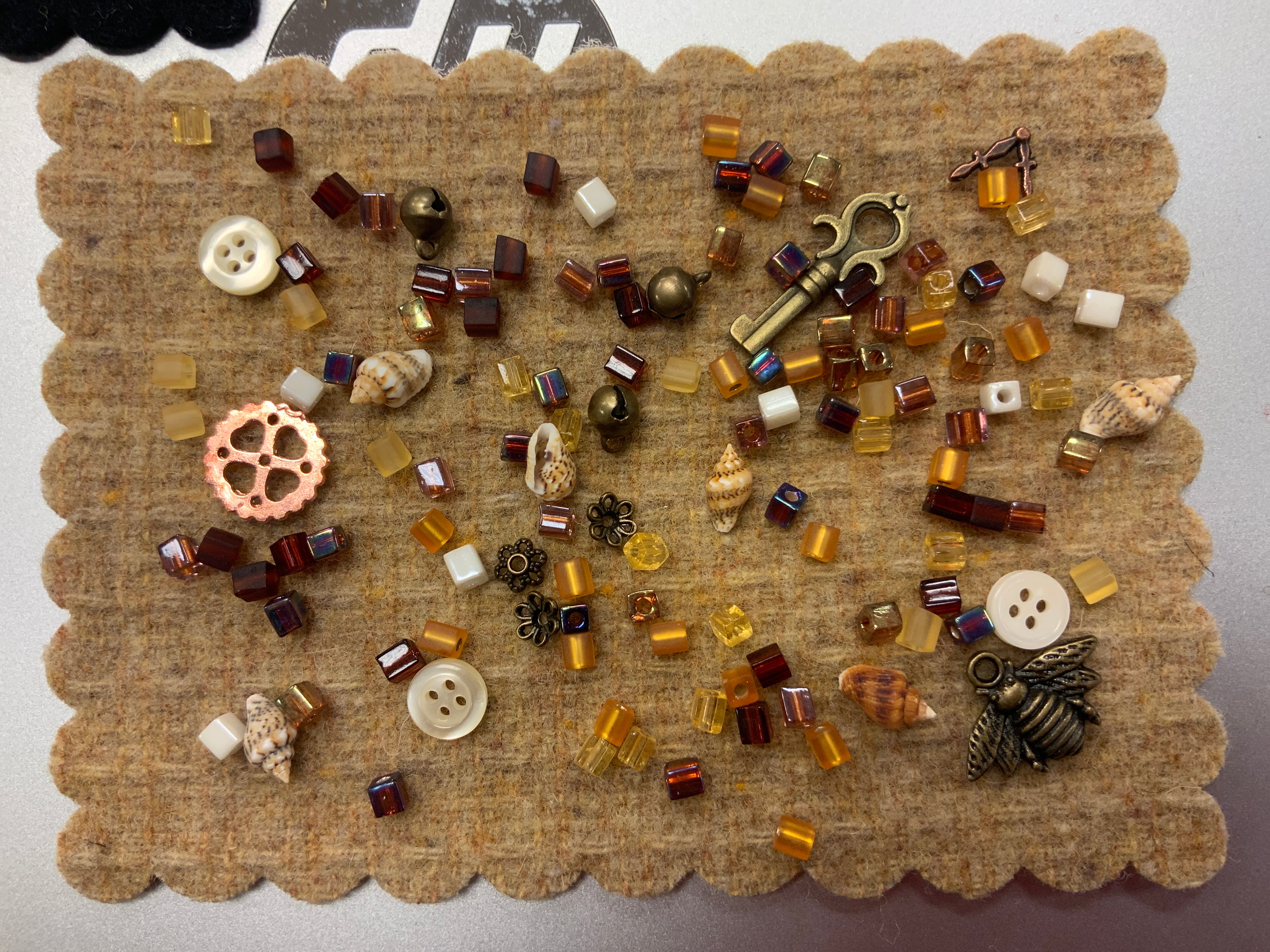 We have had many requests for the embellishments we used in our mini punch on wool kits. we use a large assortment of findings, beads, shells, tiny keys, buttons and more to decorate the small pieces. No two are ever the same, but we have come up with a nice mix based on the styles we used on each piece. We start with our $2.25 bag of beads and add to it. If it's an under the sea pack there are tiny glass fish, tiny beads and larger beads, shells, buttons, bells all are treasures you might find walking the beach. The fall leaves are autumn colors with key charms, beads, gears, buttons and more. the hearts have a mix of everything based on the colors. Each bag will do one heavily embellished or 2 lightly embellished, no two bags will be the same.