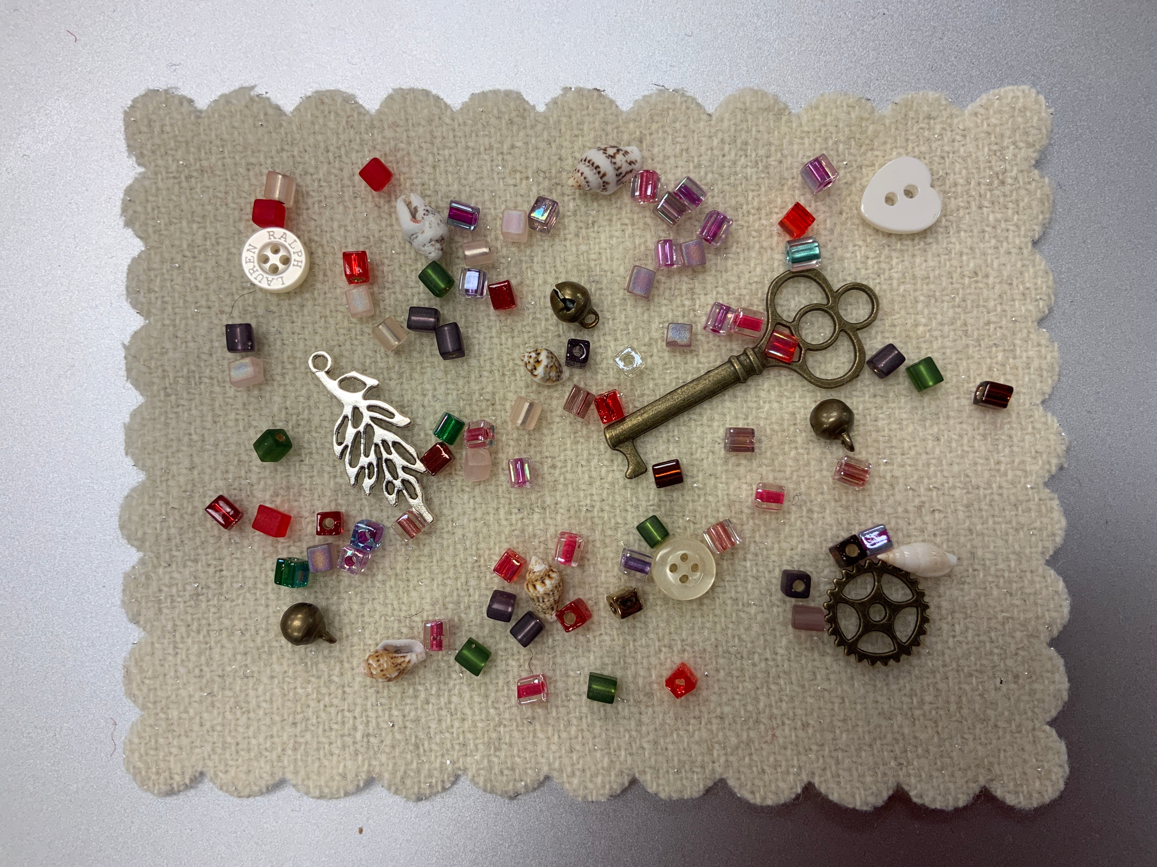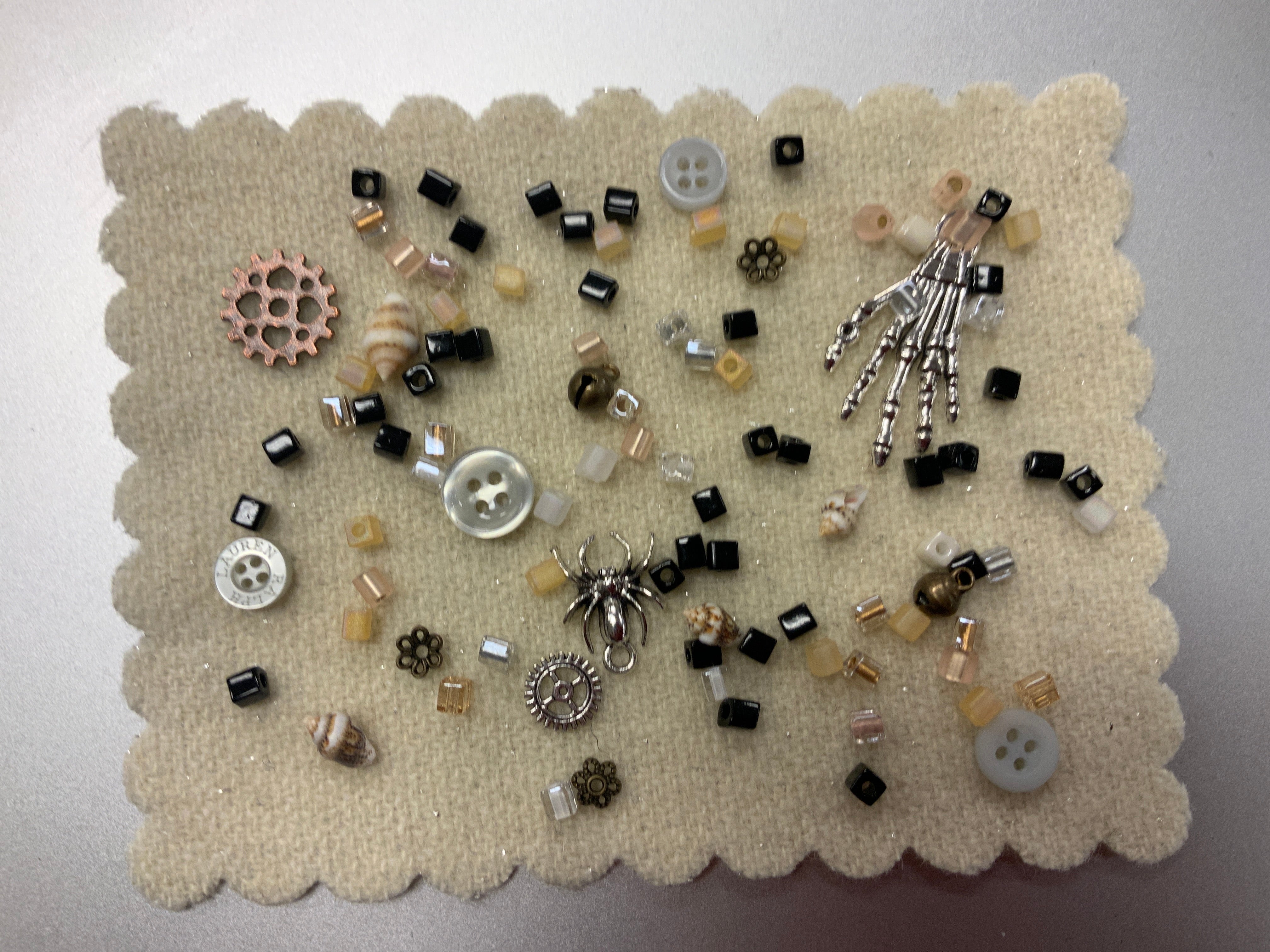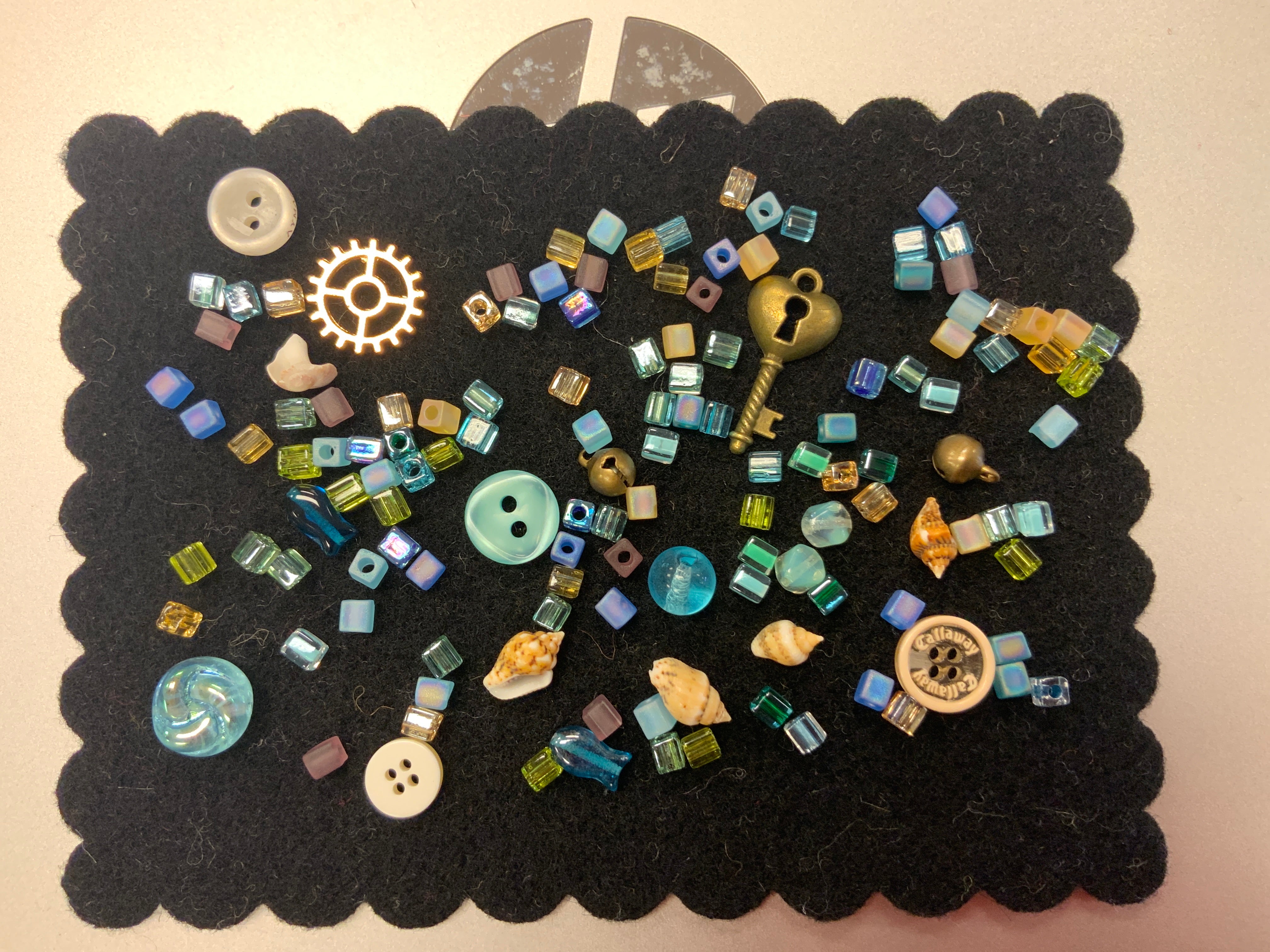 We have had many requests for the embellishments we used in our mini punch on wool kits. we use a large assortment of findings, beads, shells, tiny keys, buttons and more to decorate the small pieces. No two are ever the same, but we have come up with a nice mix based on the styles we used on each piece. We start with our $2.25 bag of beads and add to it. If it's an under the sea pack there are tiny glass fish, tiny beads and larger beads, shells, buttons, bells all are treasures you might find walking the beach. The fall leaves are autumn colors with key charms, beads, gears, buttons and more. the hearts have a mix of everything based on the colors. Each bag will do one heavily embellished or 2 lightly embellished, no two bags will be the same.