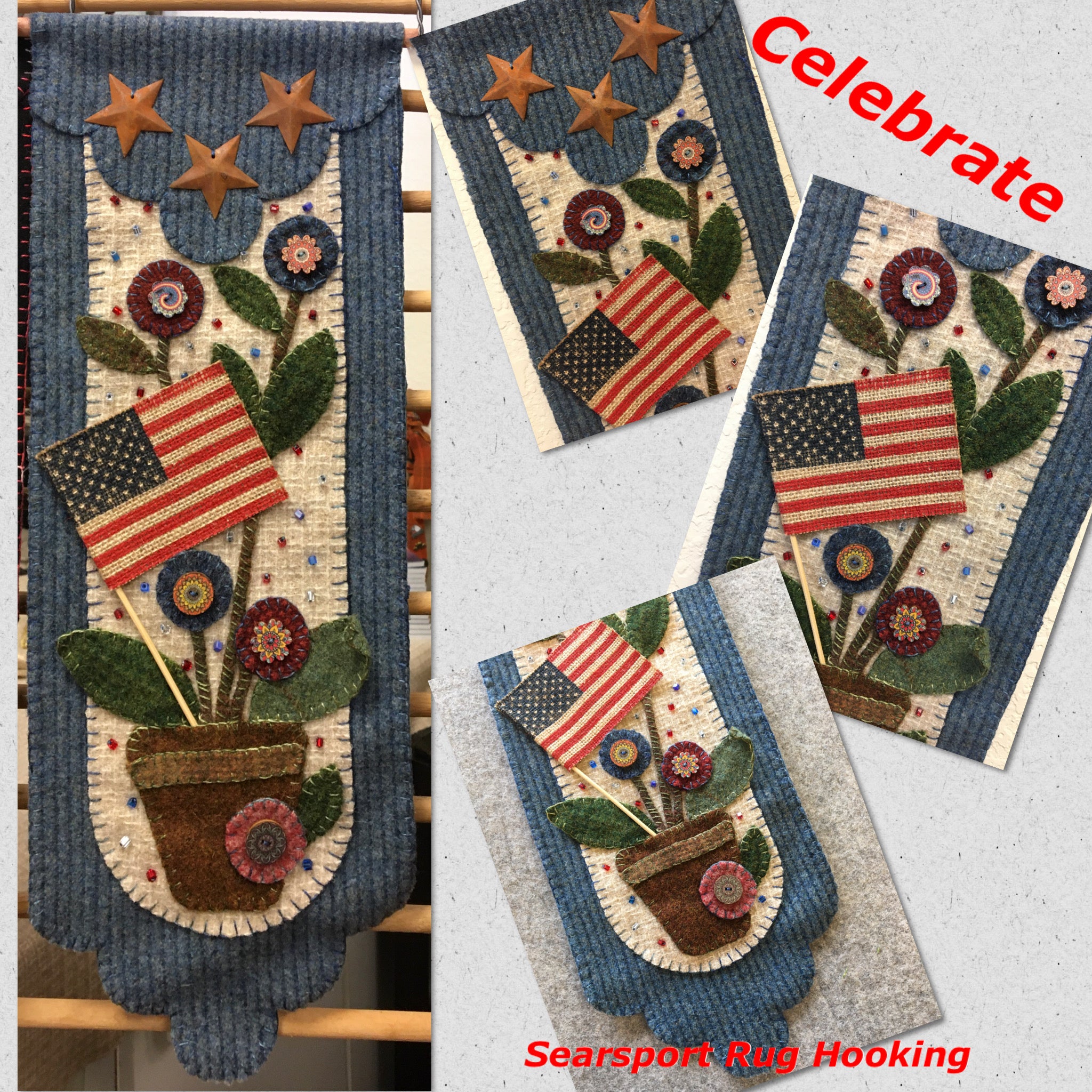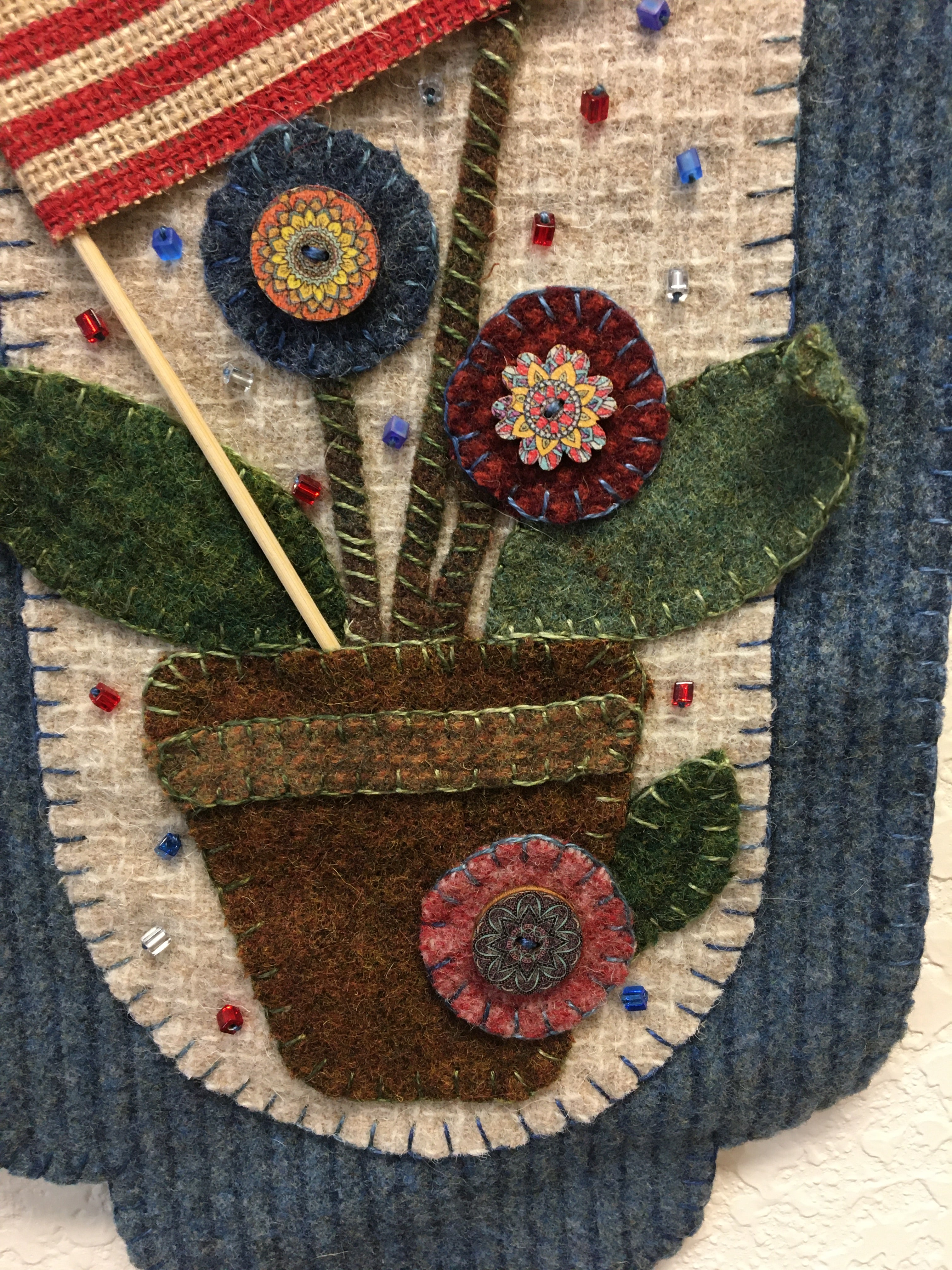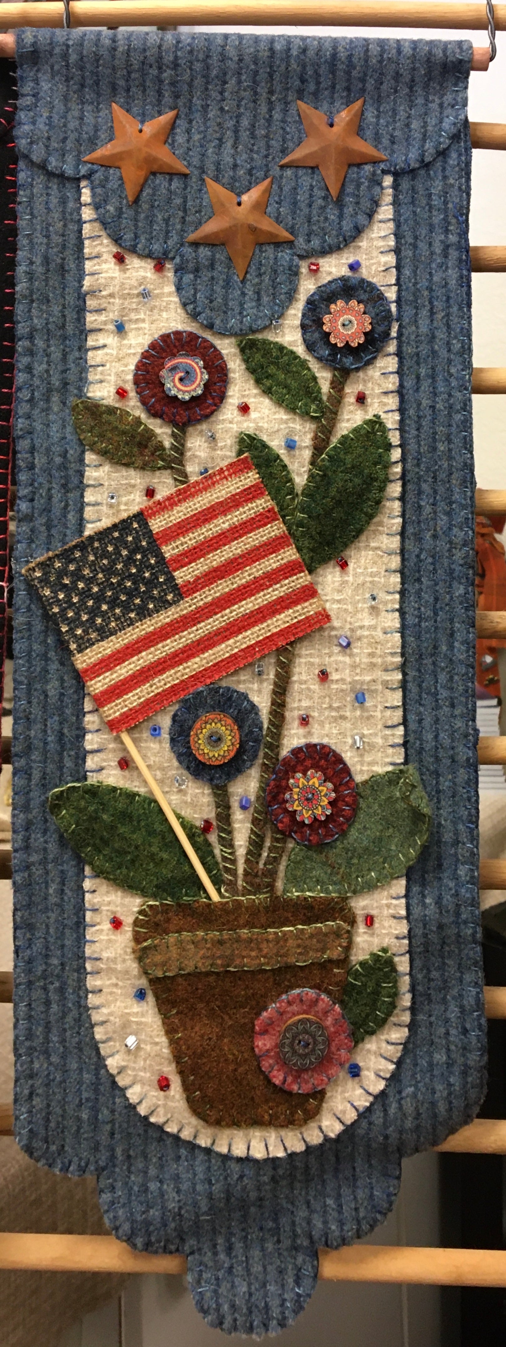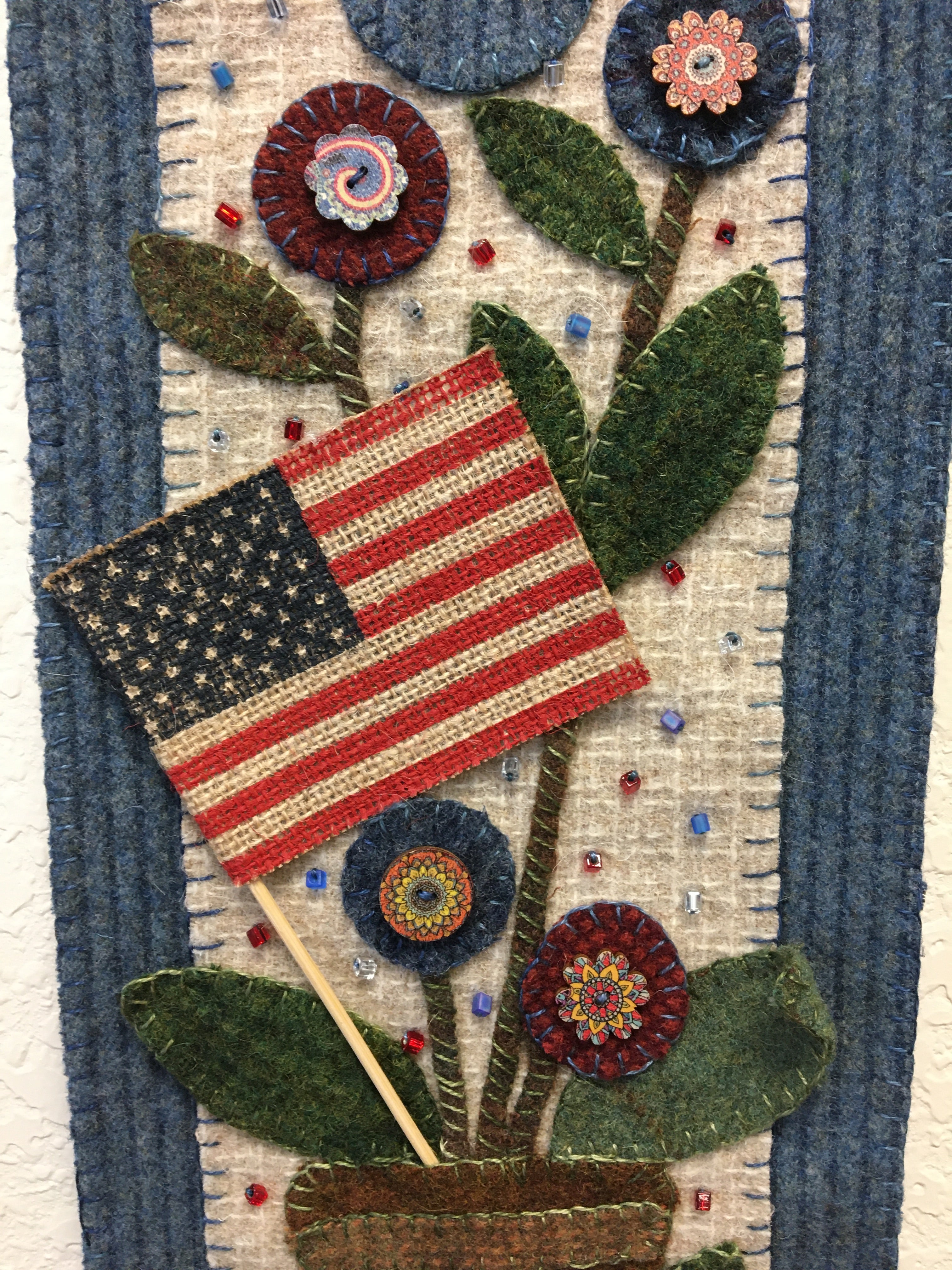Celebrate! It’s suitable for Memorial Day, summer, Fourth of July even on Labor Day this piece will hang with pride! You will have lots of reason to hang this new scalloped banner! Everything is cut out for you to just sit and stitch!