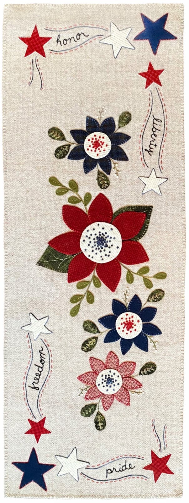 Another wonderful design from Karen Yaffe! A beautiful red, white and blue runner to create a focal point on your table or hang on the wall. Or even a beautiful bolster pillow! Finished Size: 14" x 36"