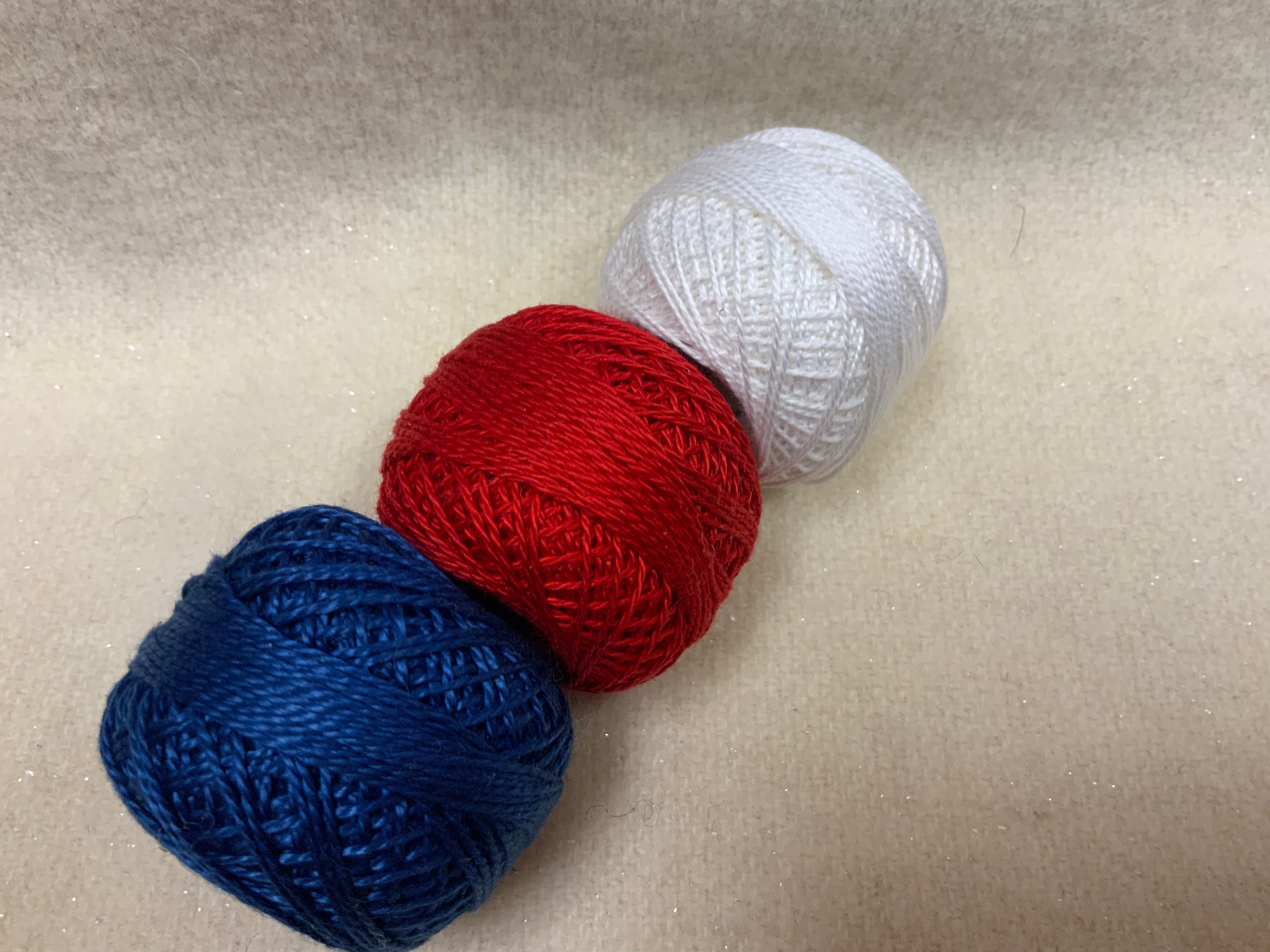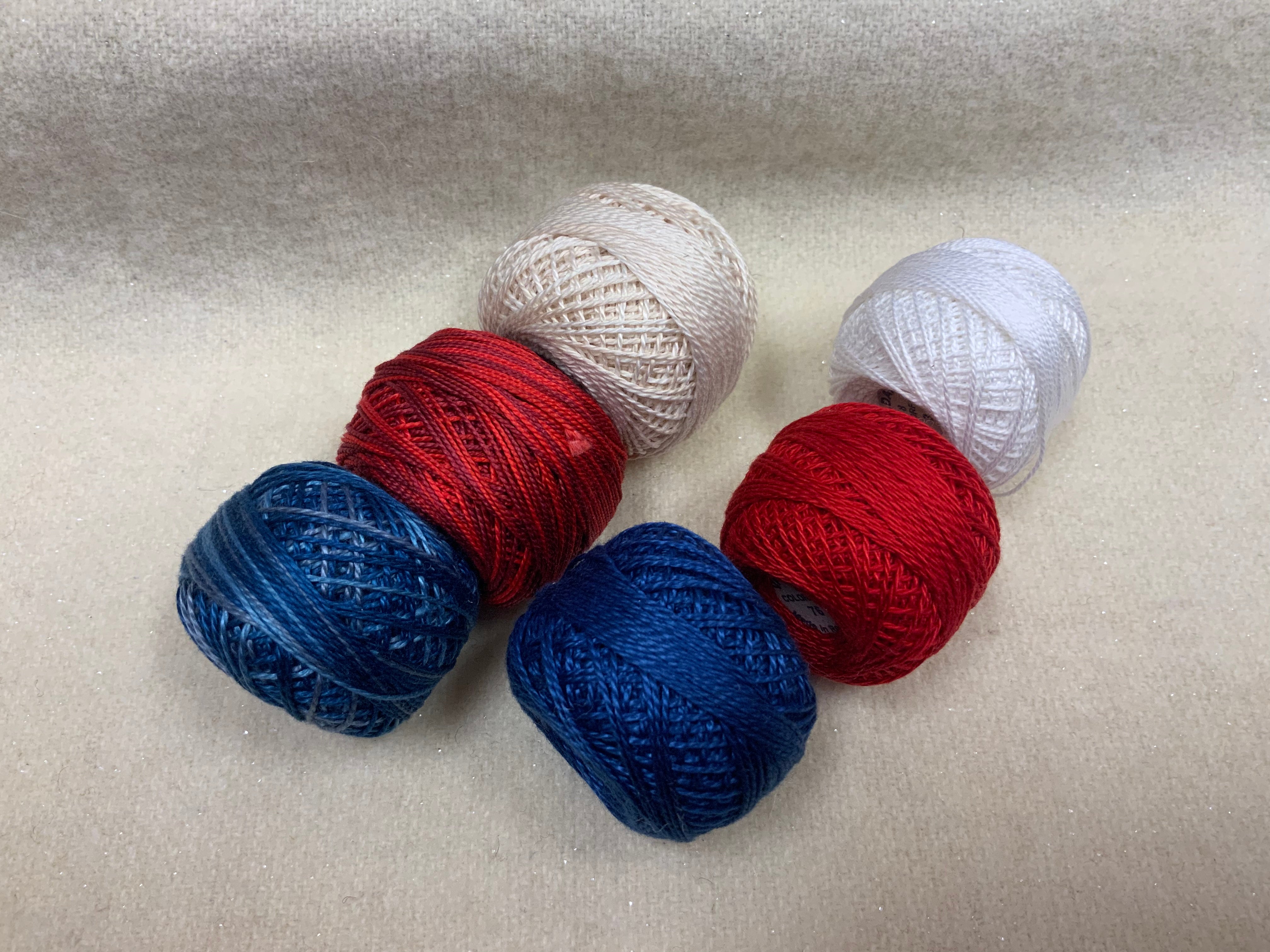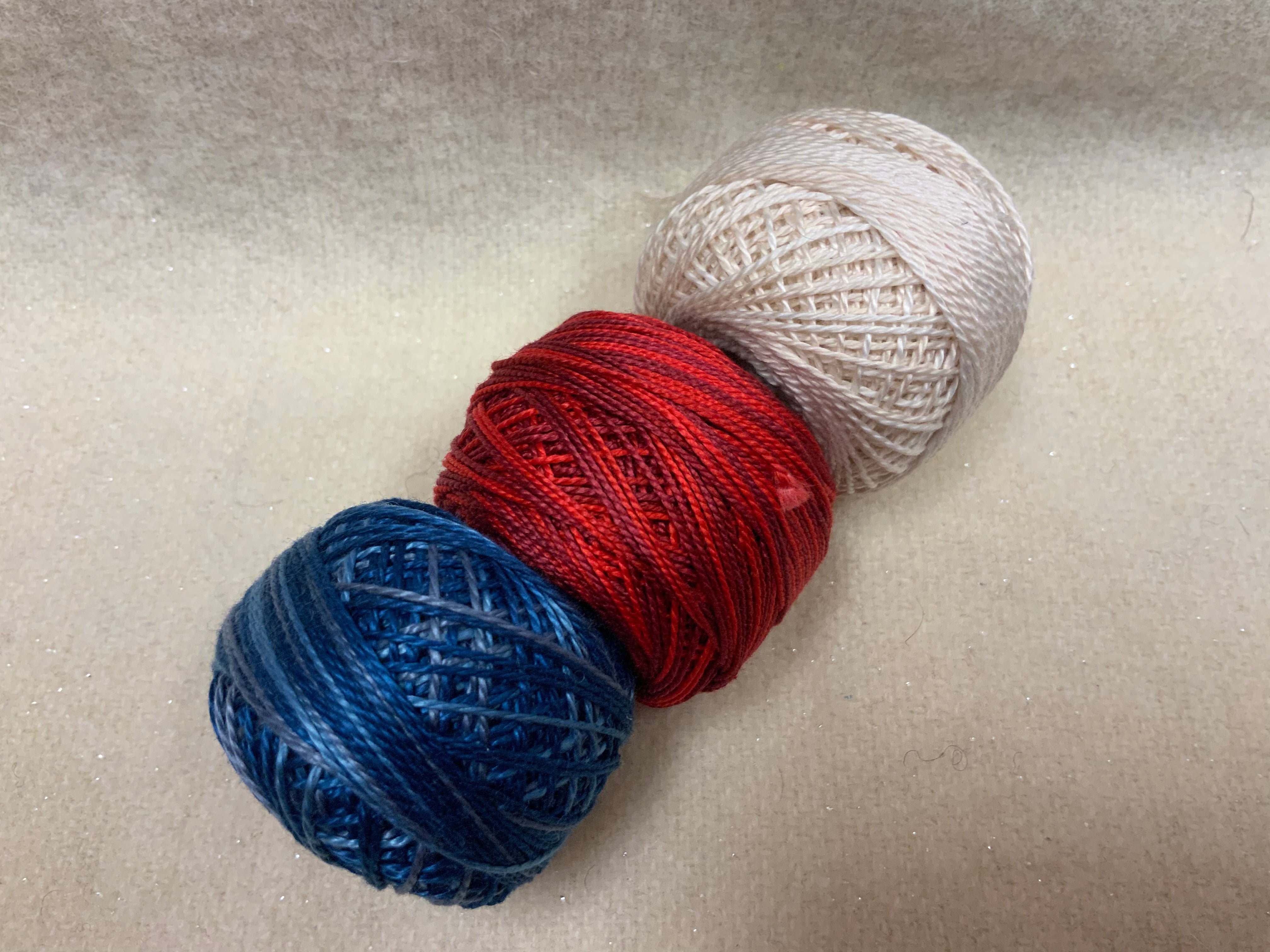 Some fun colors for your holiday stitching pleasures. Choose a single ball of #8 pestle cotton in the red white and blue mix or one of our trios that is either a solid set or a variegated set