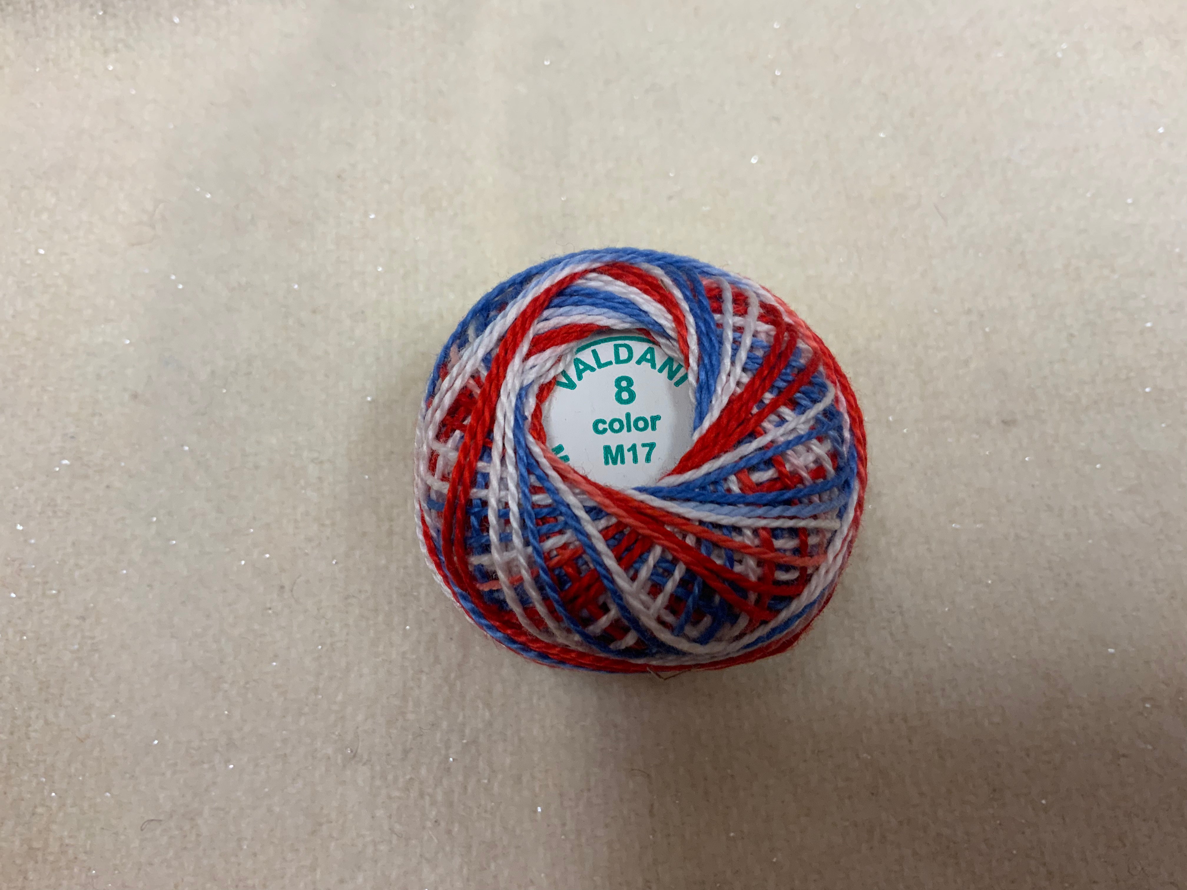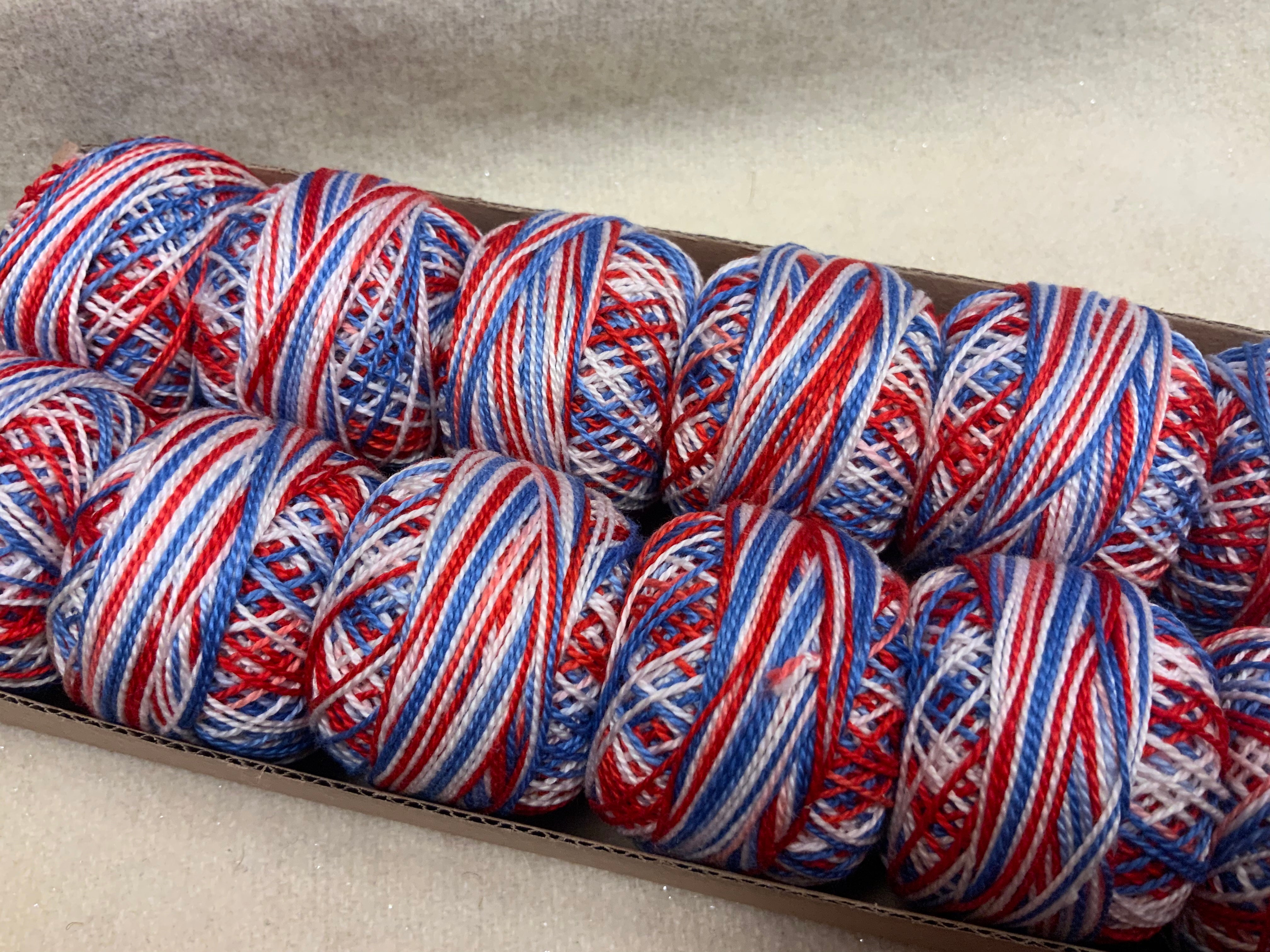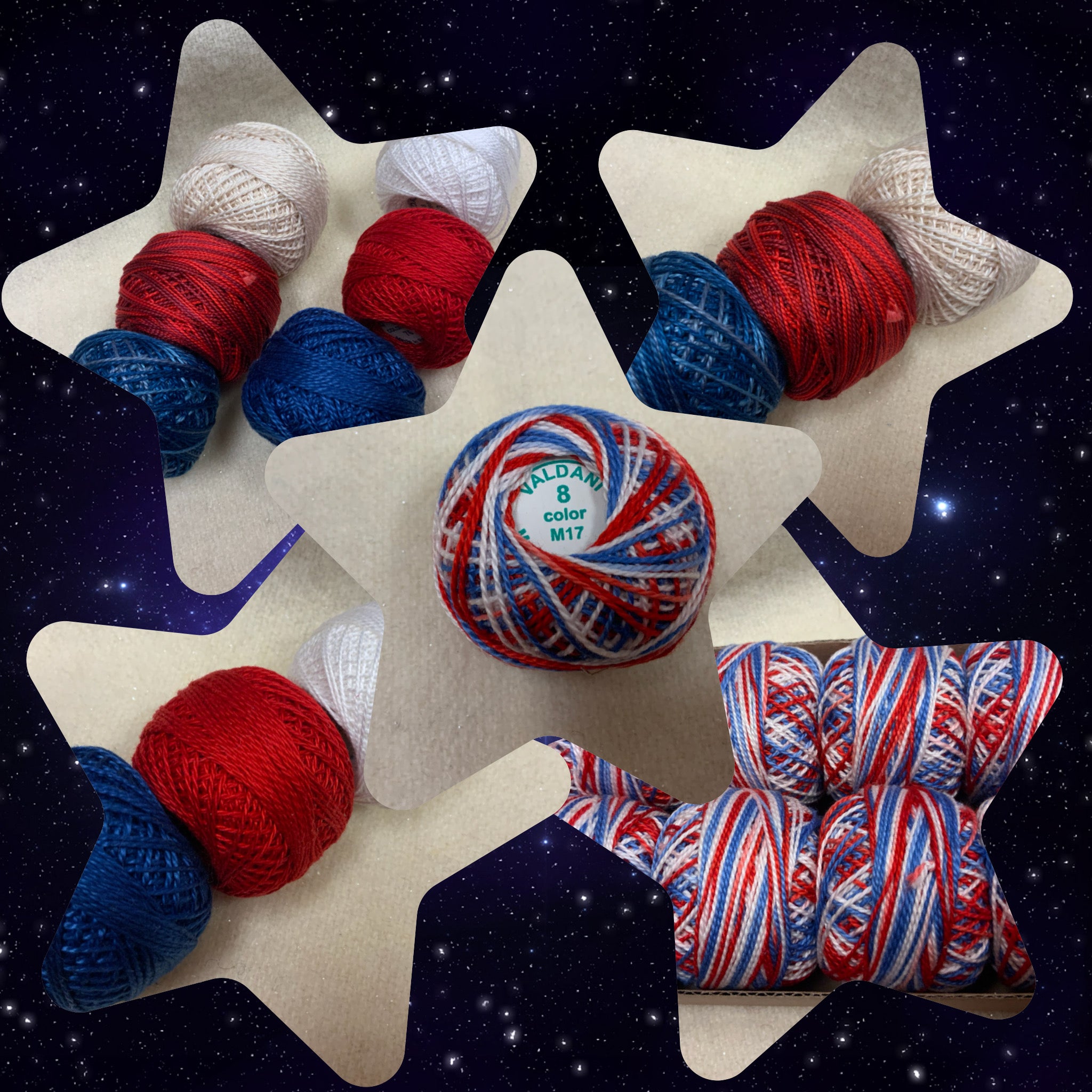 Some fun colors for your holiday stitching pleasures. Choose a single ball of #8 pestle cotton in the red white and blue mix or one of our trios that is either a solid set or a variegated set