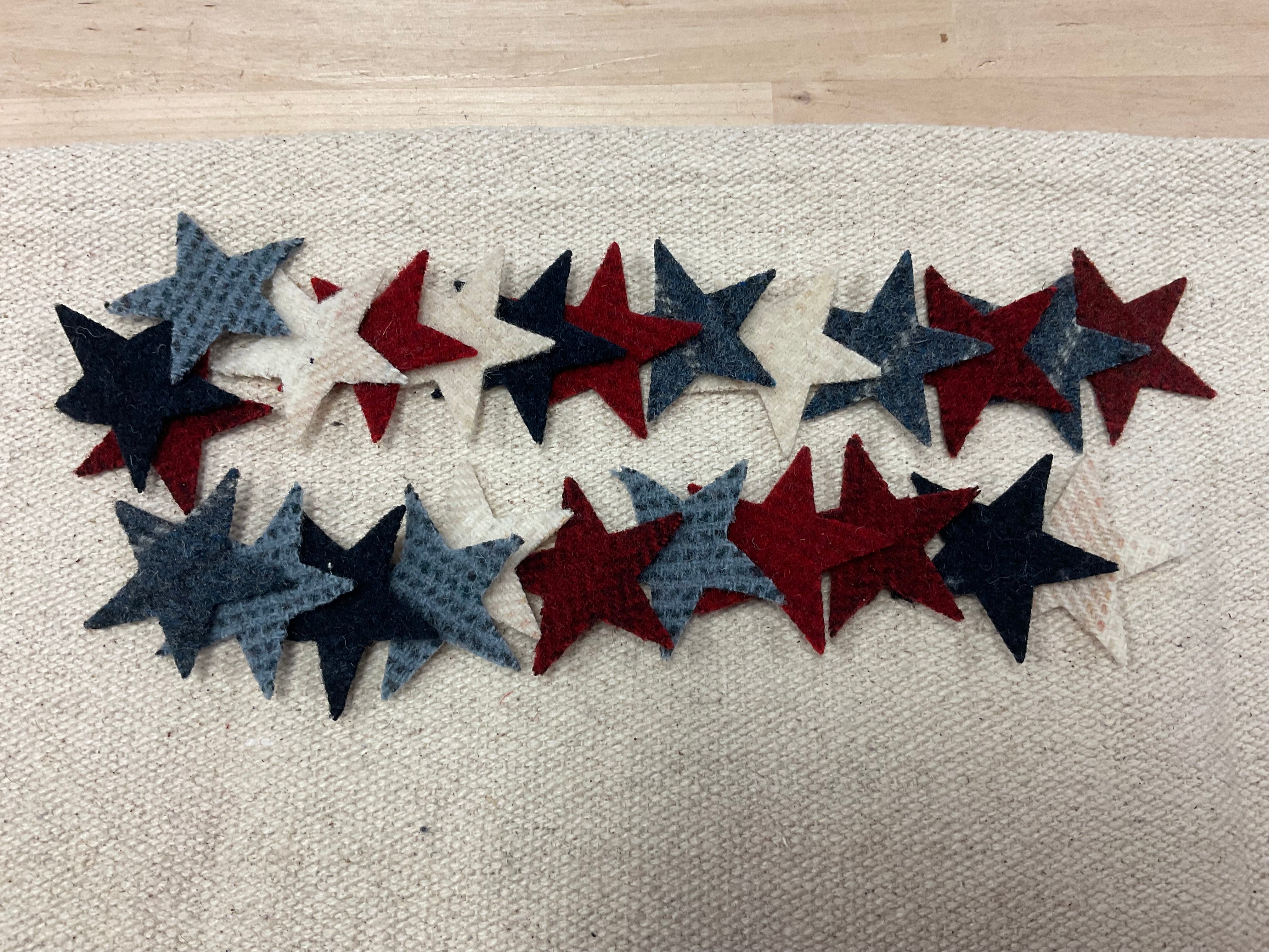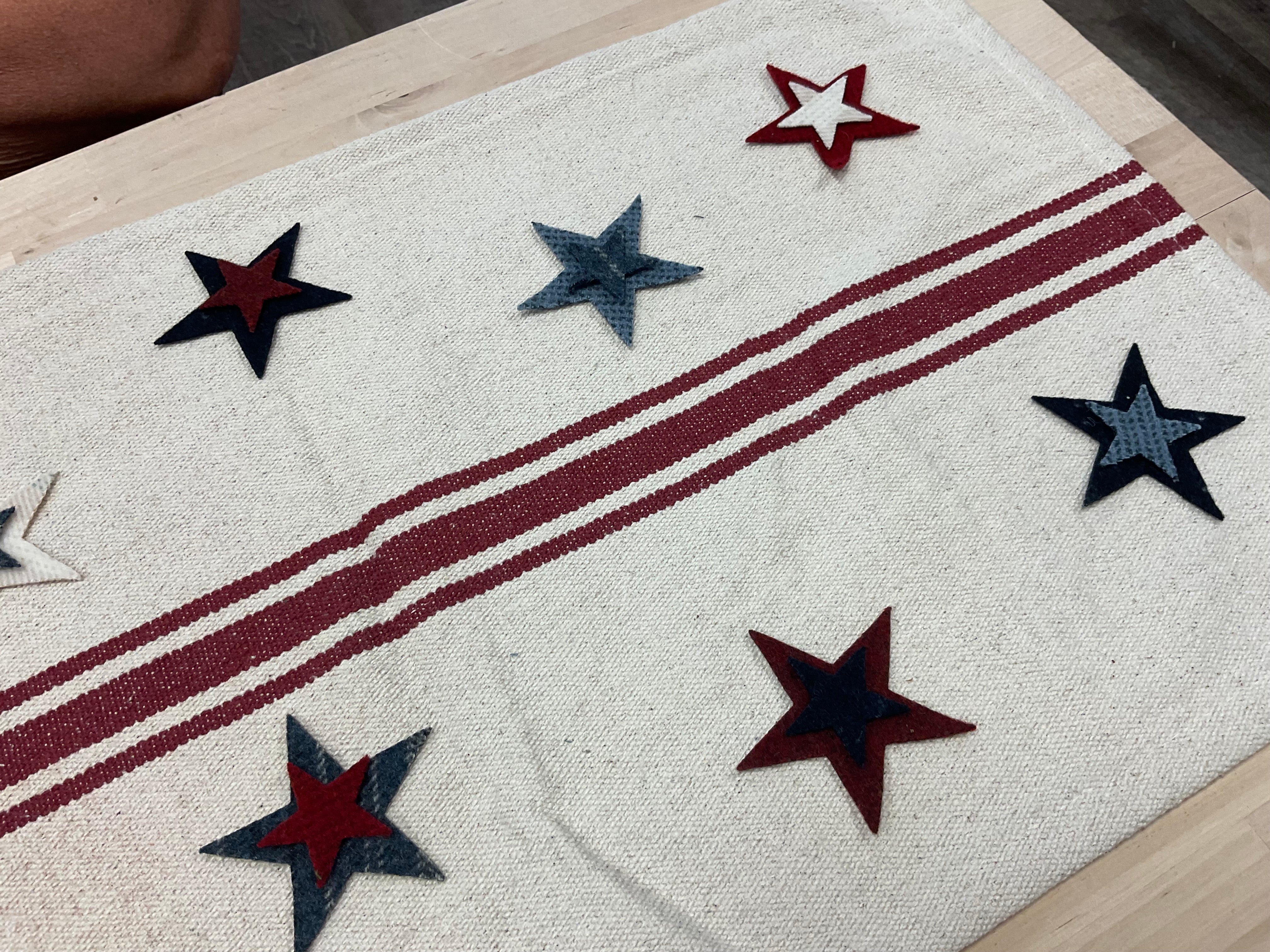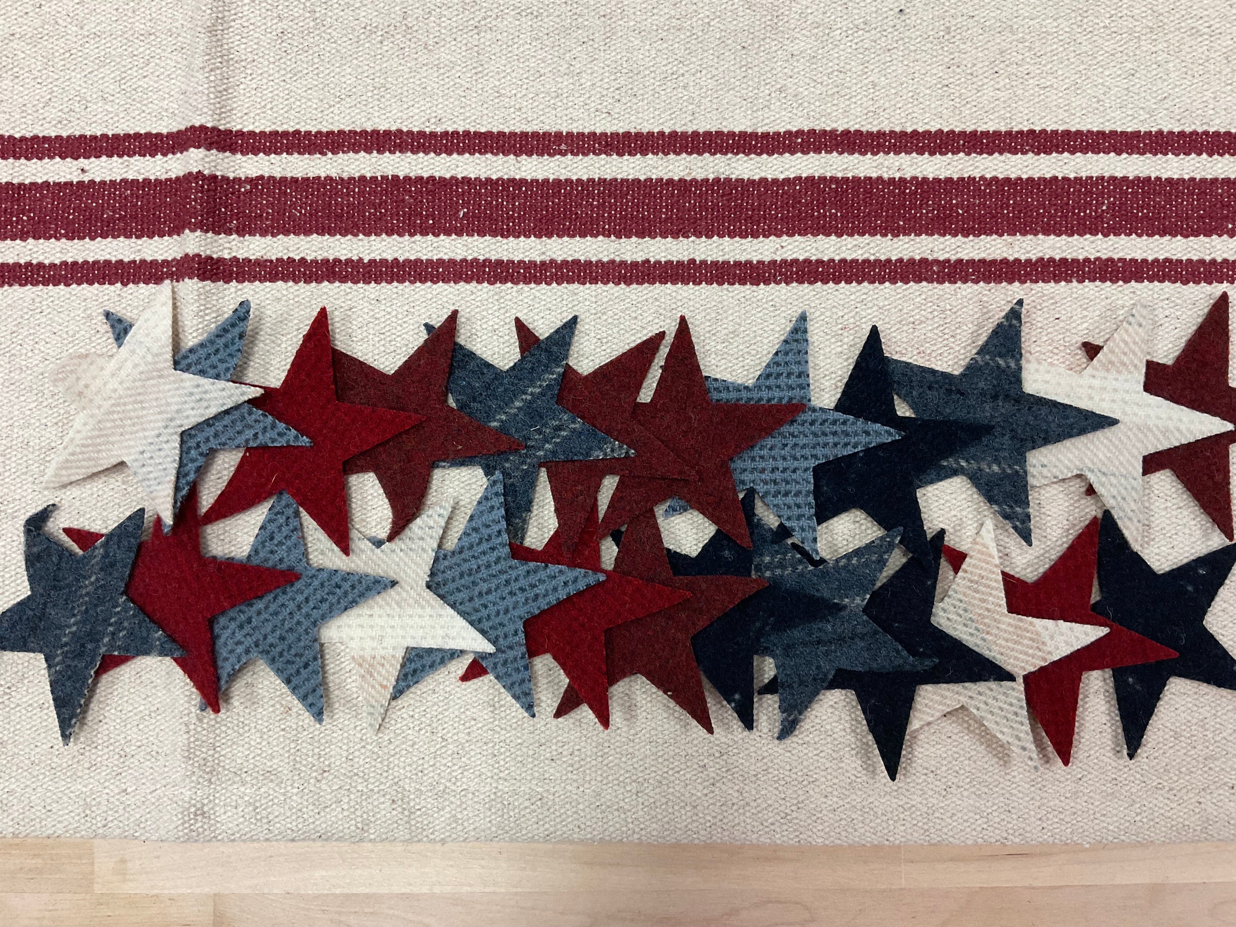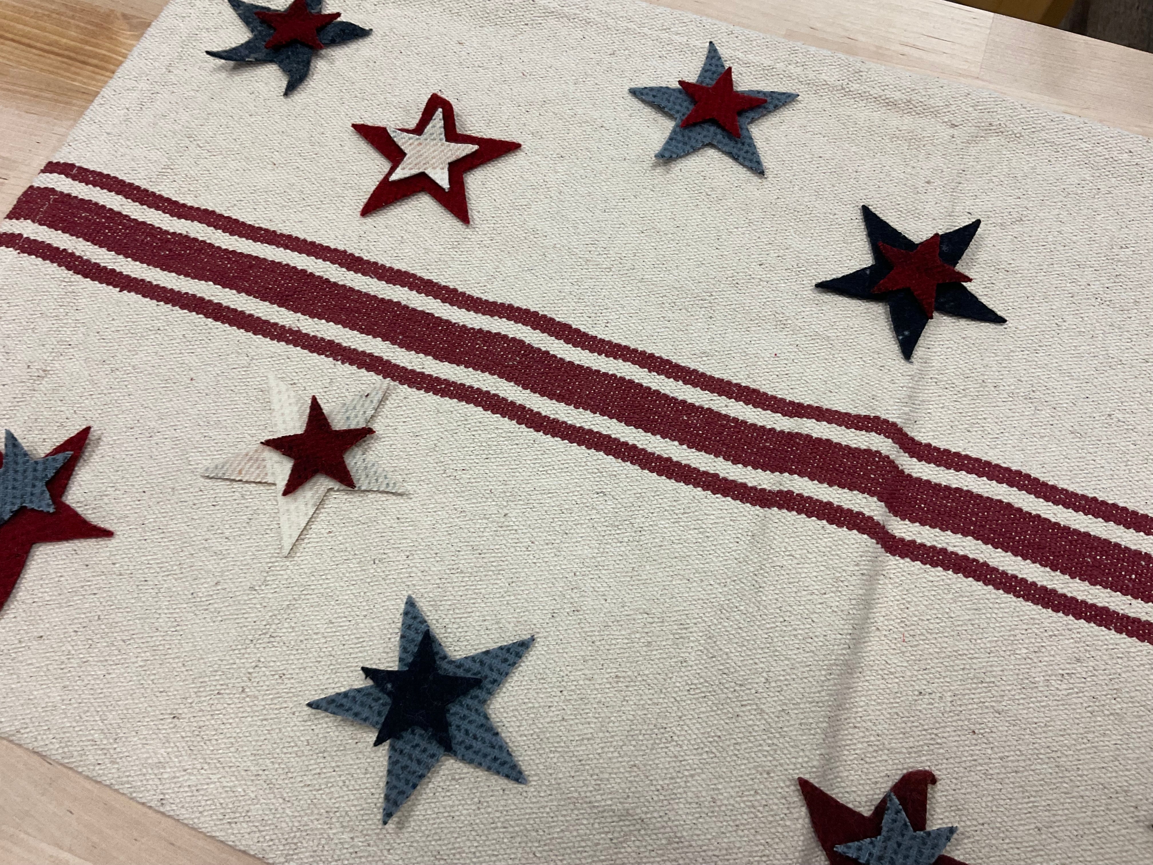 We started with a grain sack style woven runner in oatmeal with rich red stripes, it is a generous 14x56 inches and then added 25, 3 inch stars and 25, 1.5 inch stars and plan on stitching them using the 3 valadani threads in red, white and blue. There’s no plan or design or patterns, everything is all pre cut and you will just layer and stitch down for a festive summer runner.