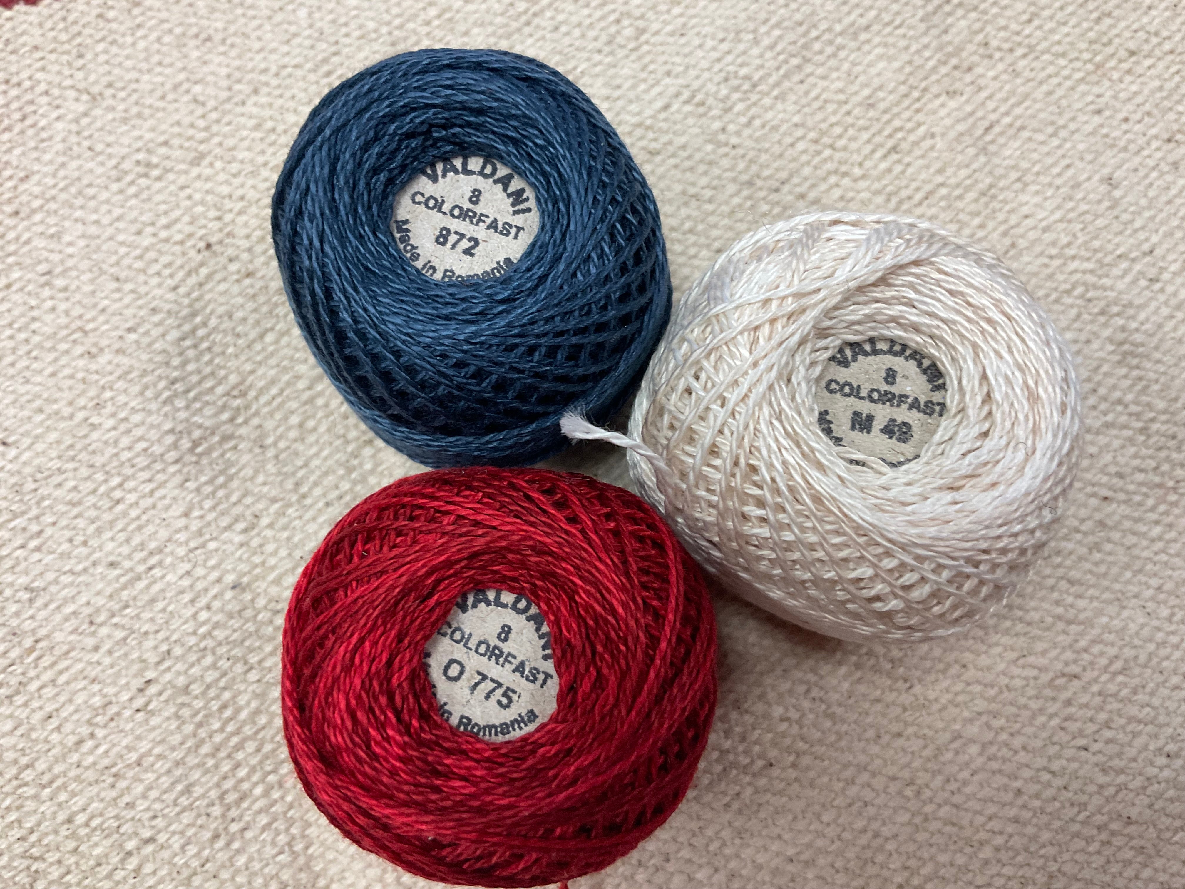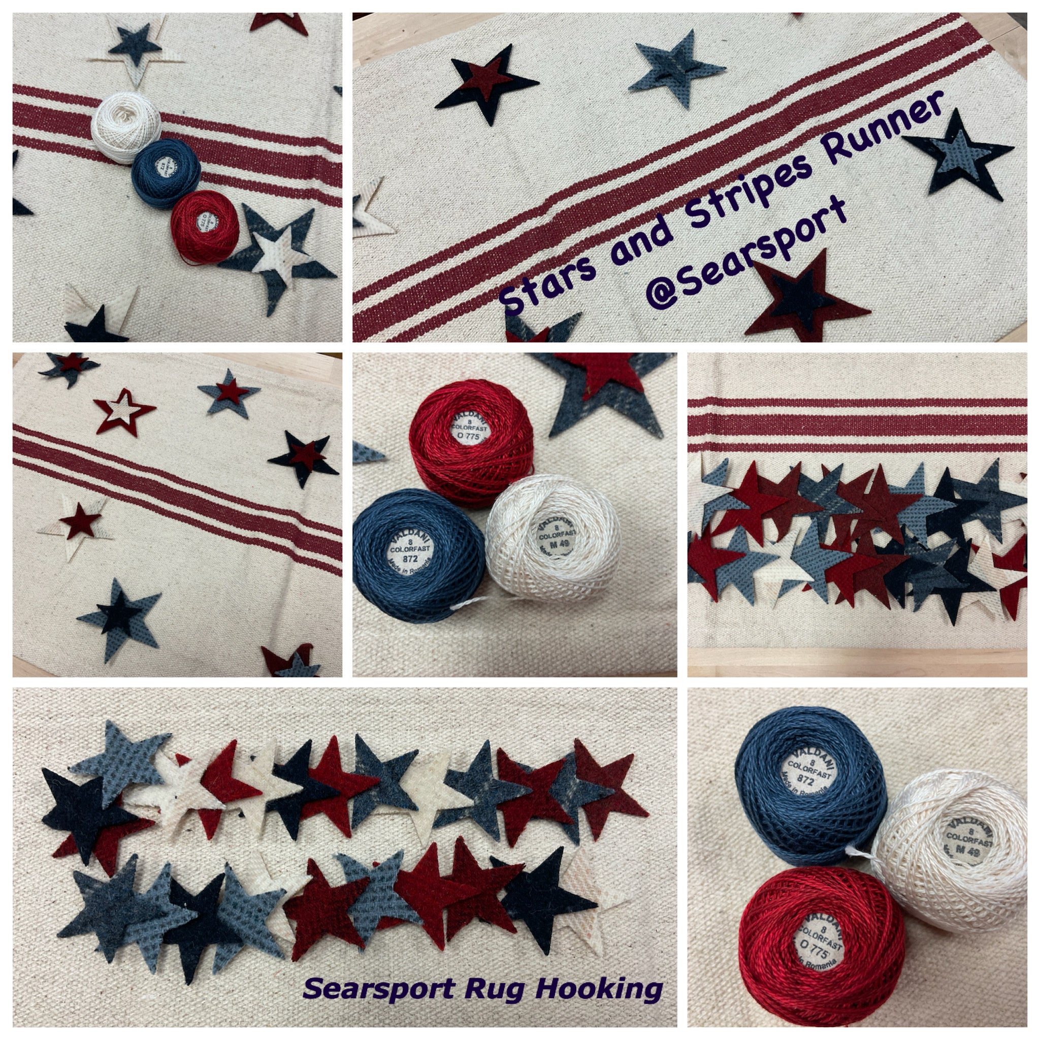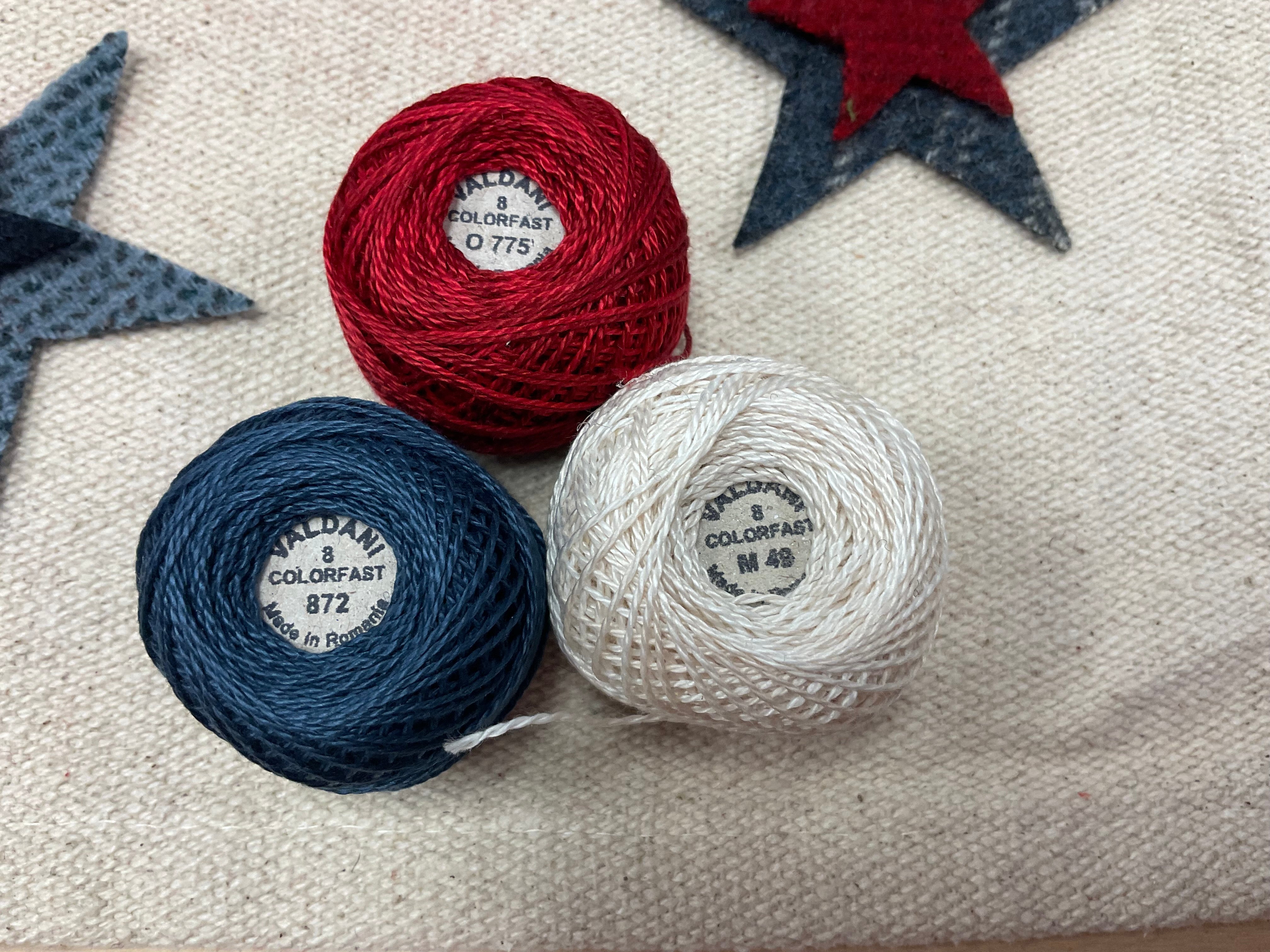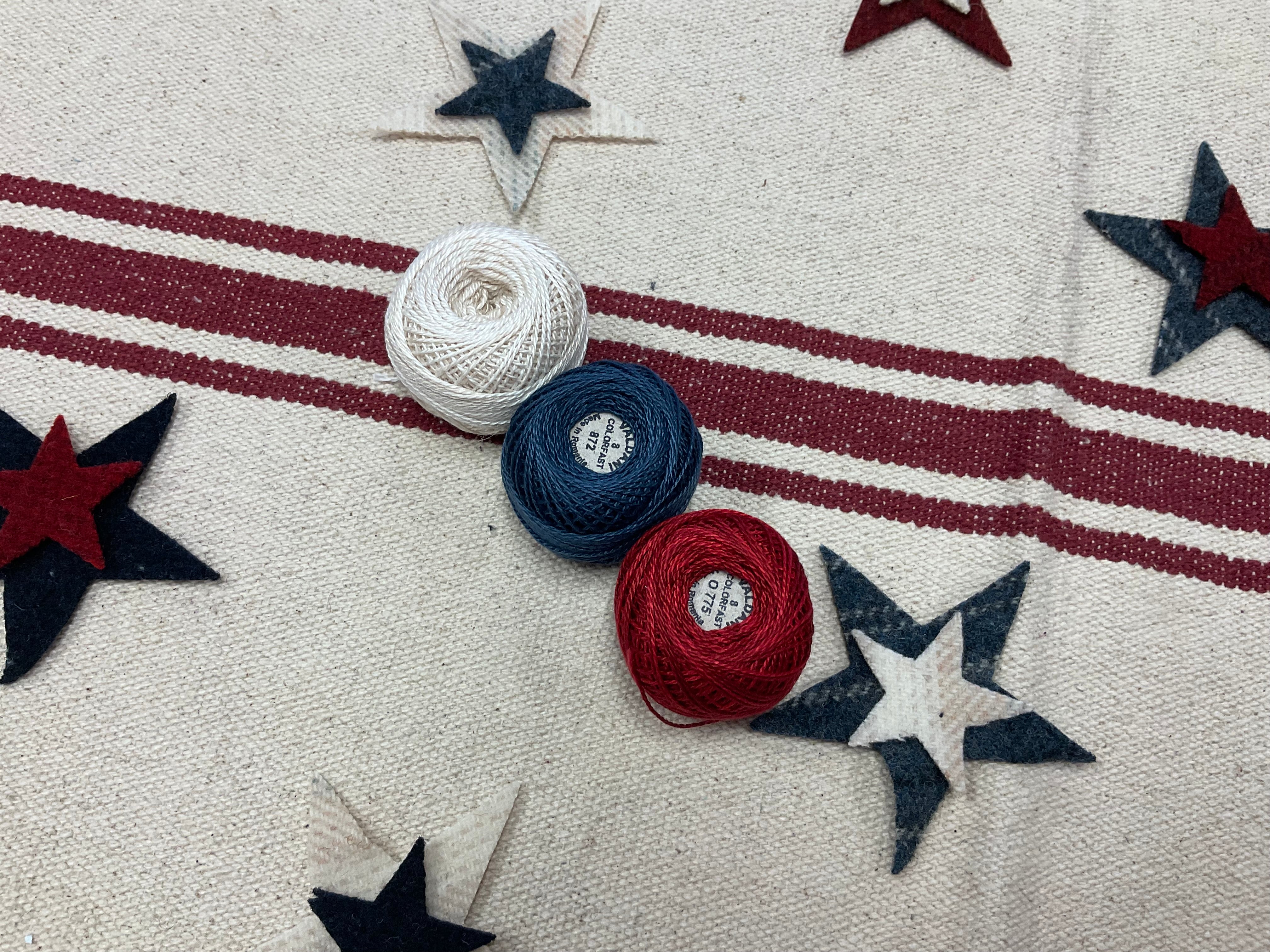 We started with a grain sack style woven runner in oatmeal with rich red stripes, it is a generous 14x56 inches and then added 25, 3 inch stars and 25, 1.5 inch stars and plan on stitching them using the 3 valadani threads in red, white and blue. There’s no plan or design or patterns, everything is all pre cut and you will just layer and stitch down for a festive summer runner.