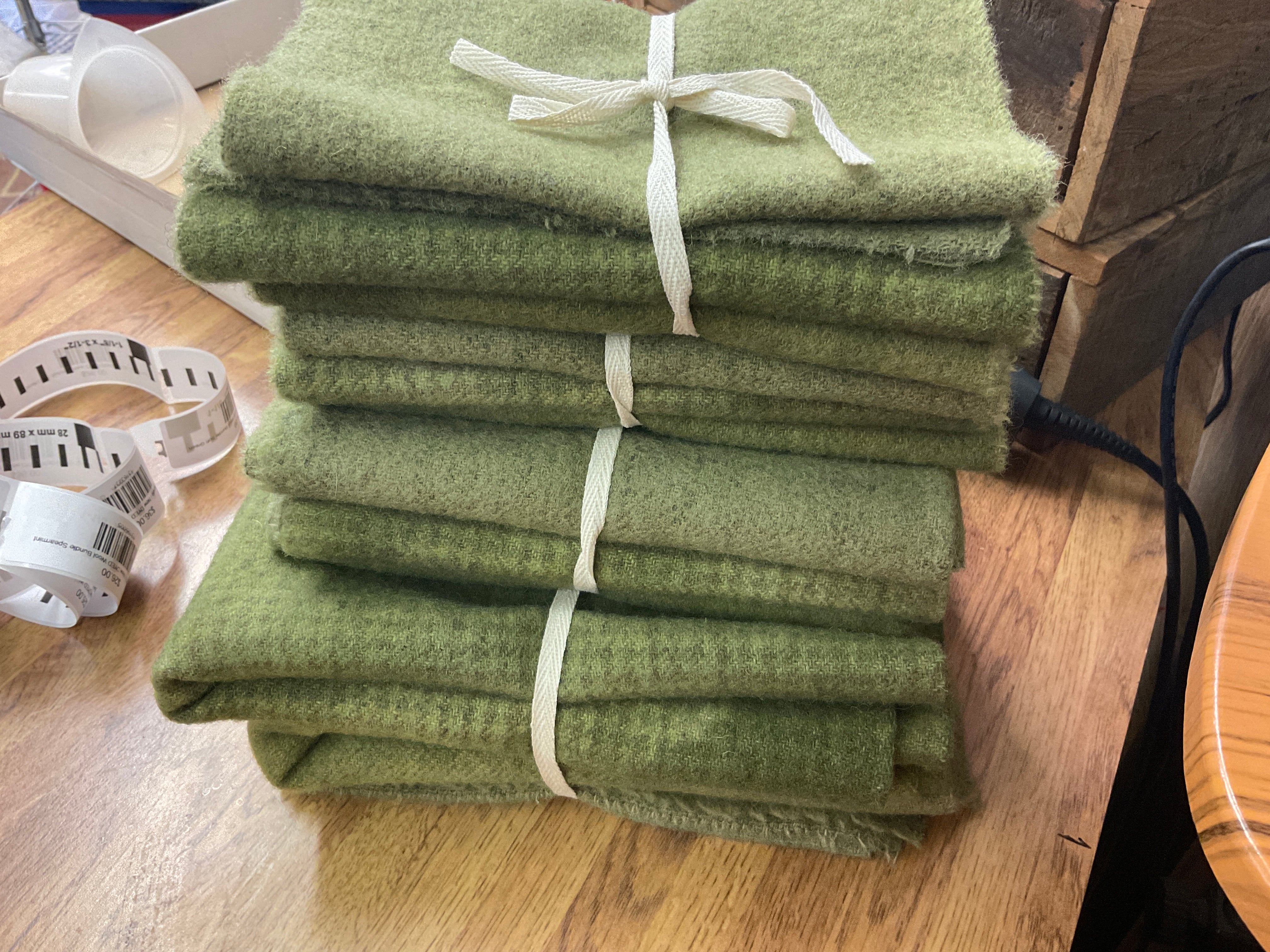 The big bundle is 3 fat quarters, that’s 3/4 of a yard of wool total! Perfect for rug hookers! Pre washing they measure 18x30 and all textures and weaves full differently but expect roughly 16-17x28-29 inches after washing.