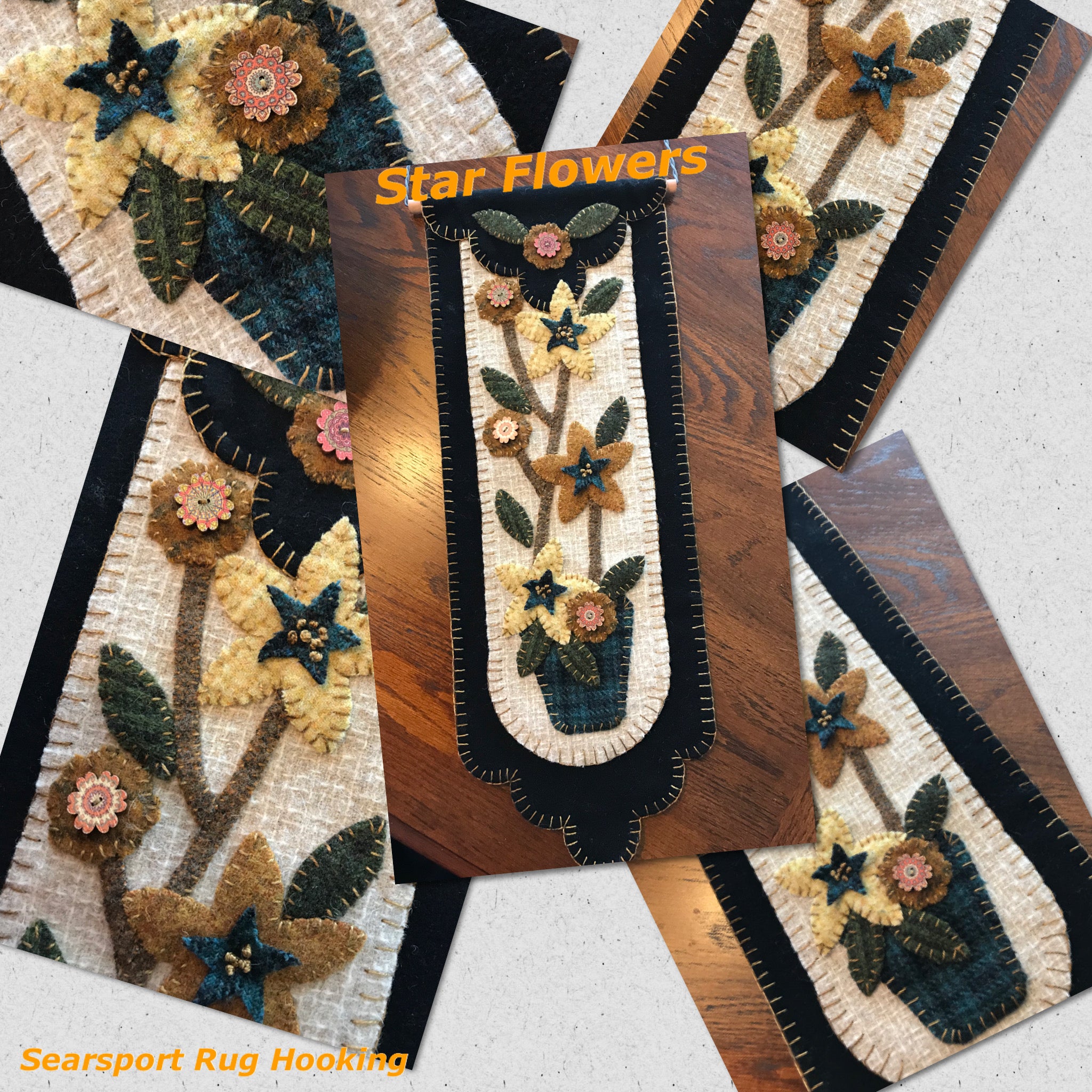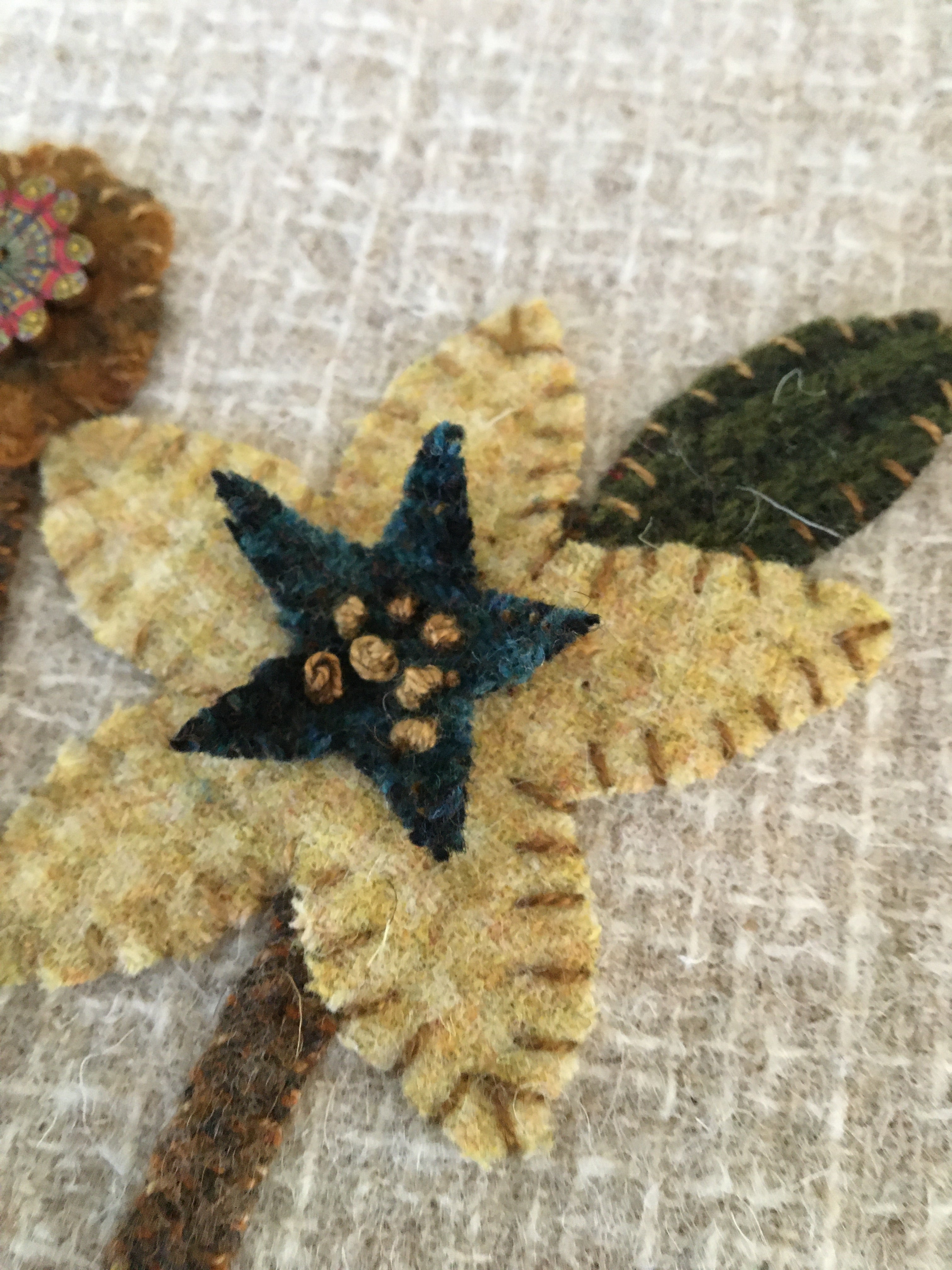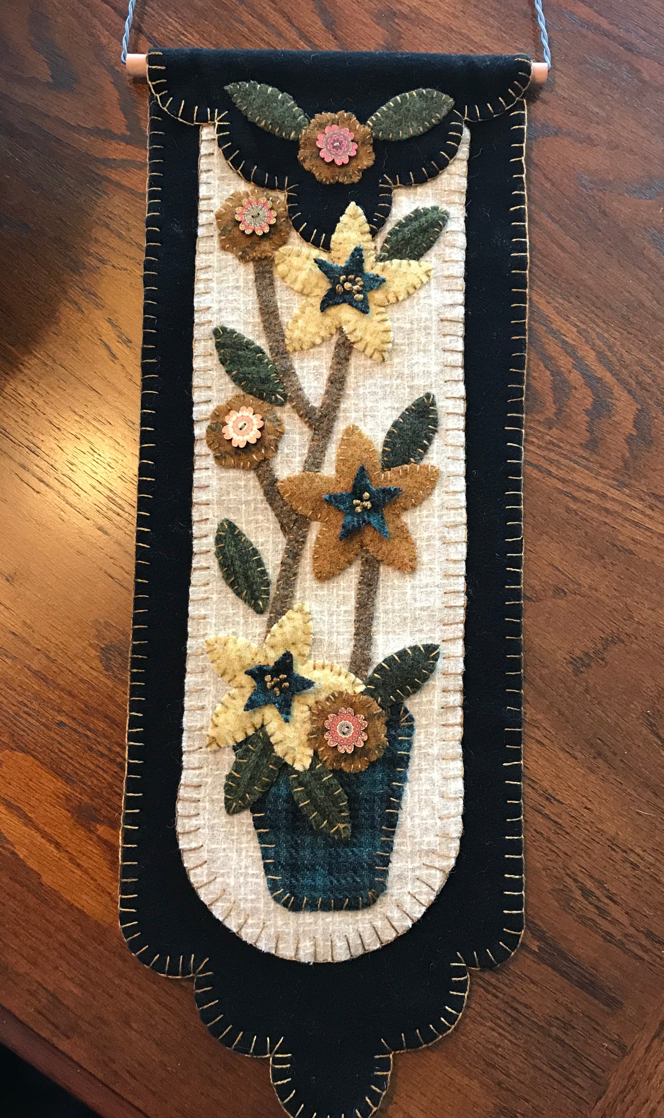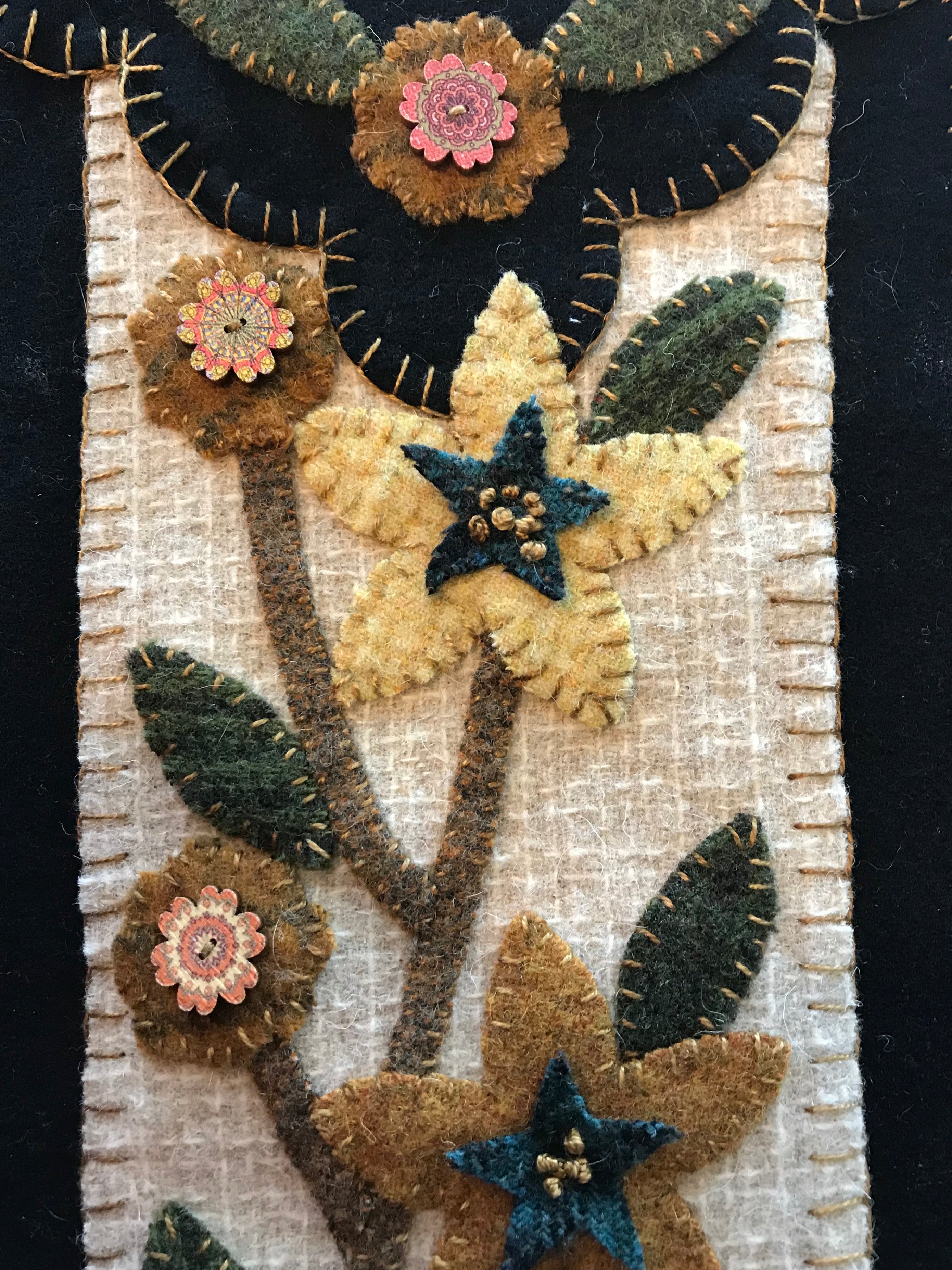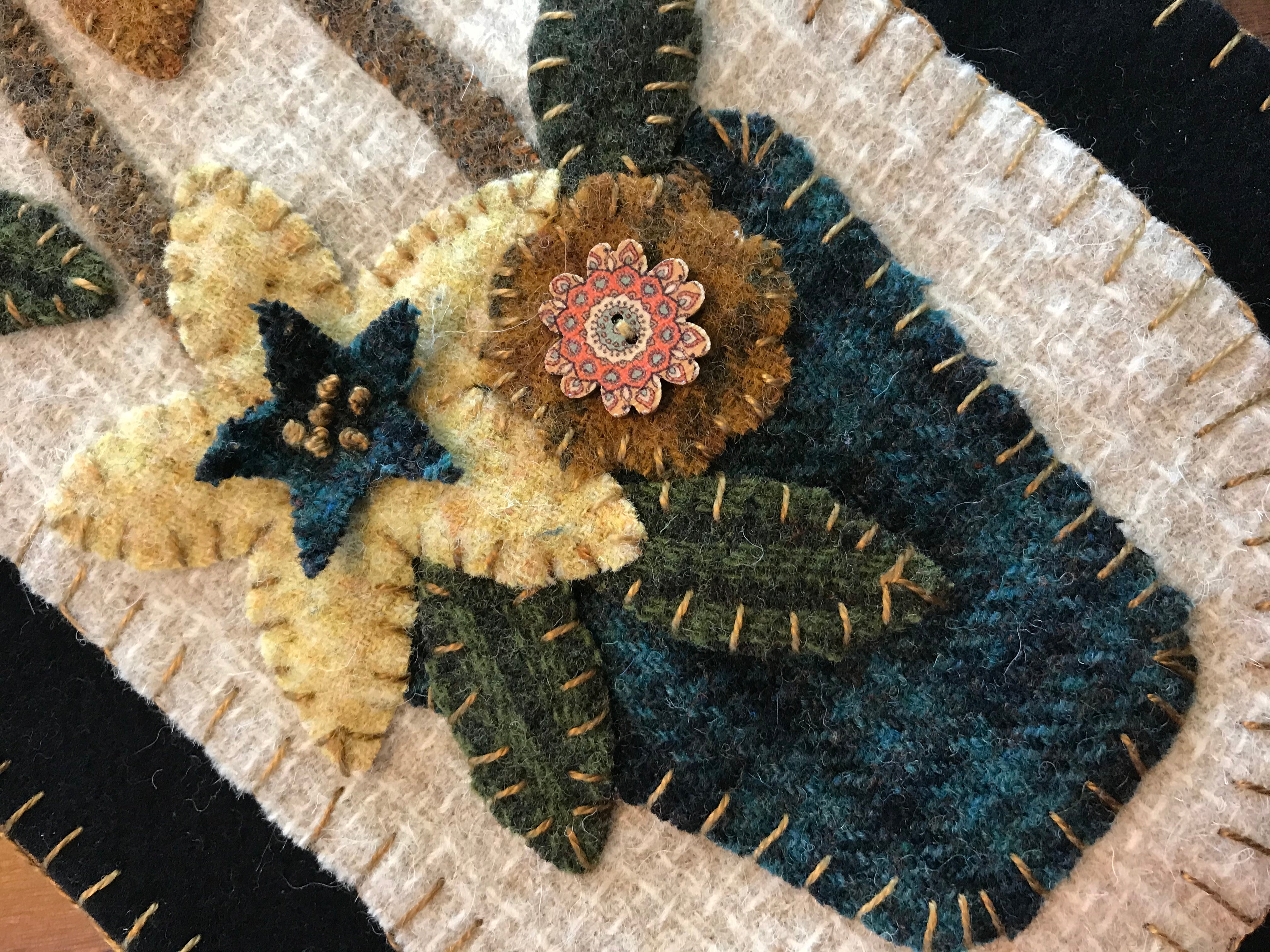 You receive the wool pre cut, this includes the two black Dorr wool backings, the cream wool center panel, All the cut pennies, plant pot, vine, pennies, flowers, stars, leaves and buttons!