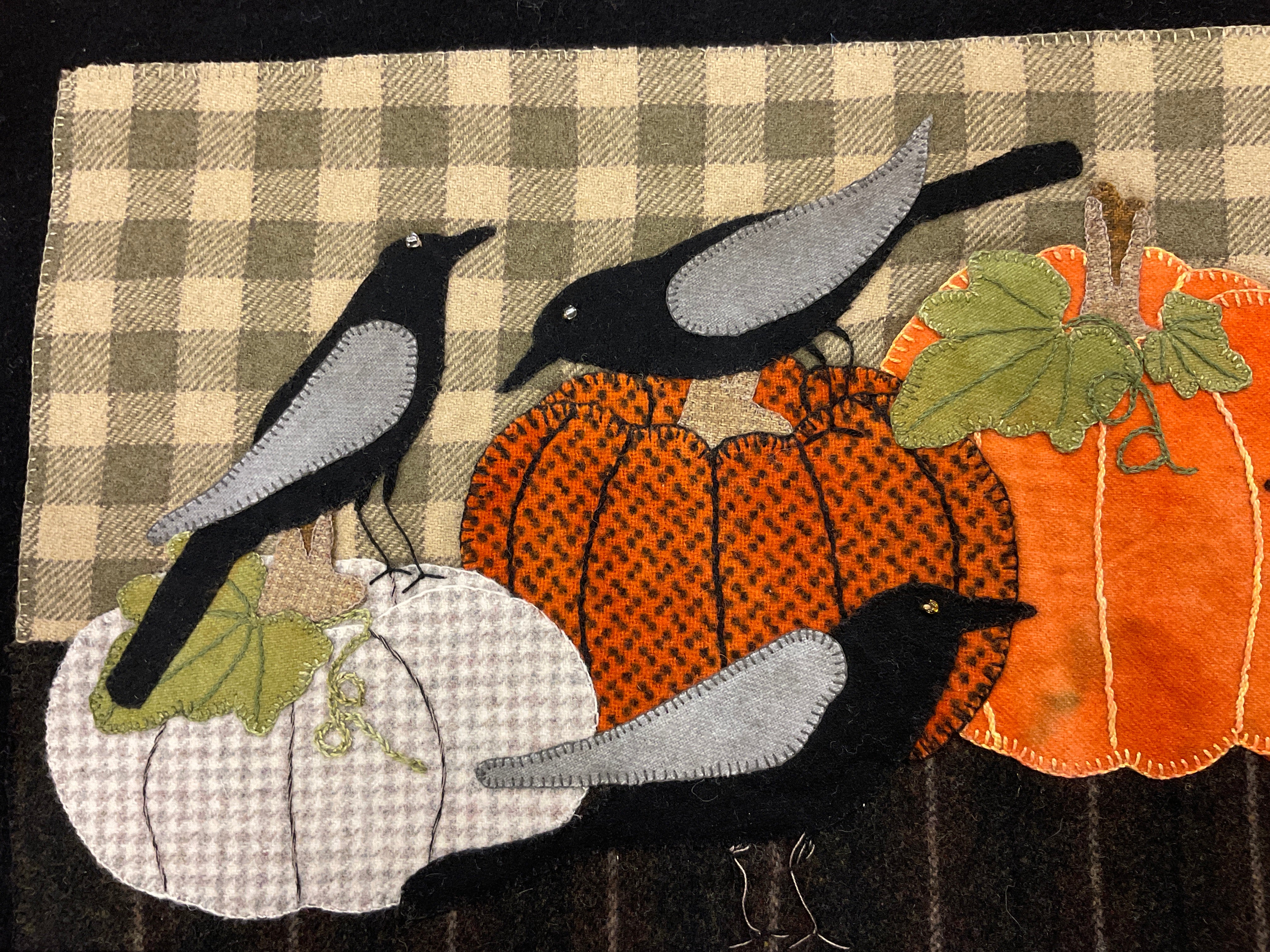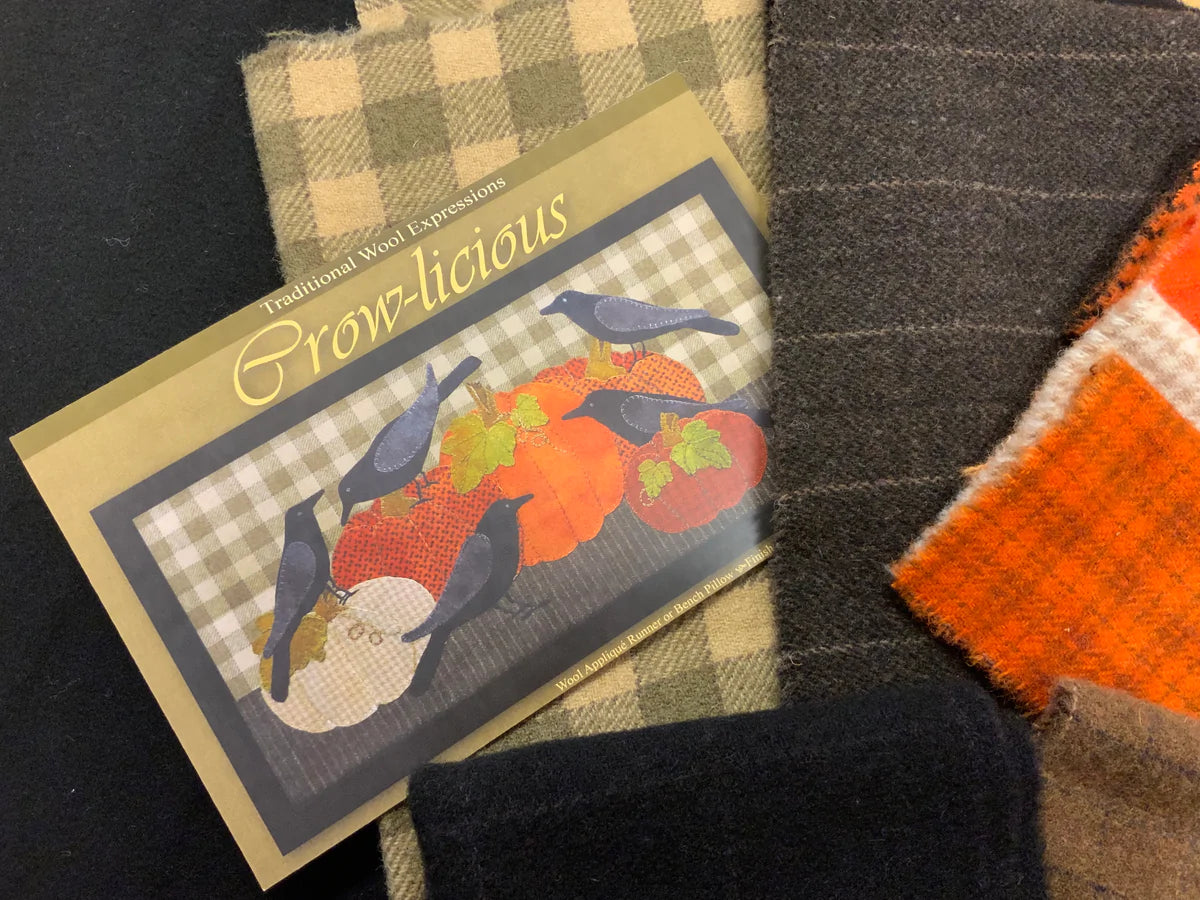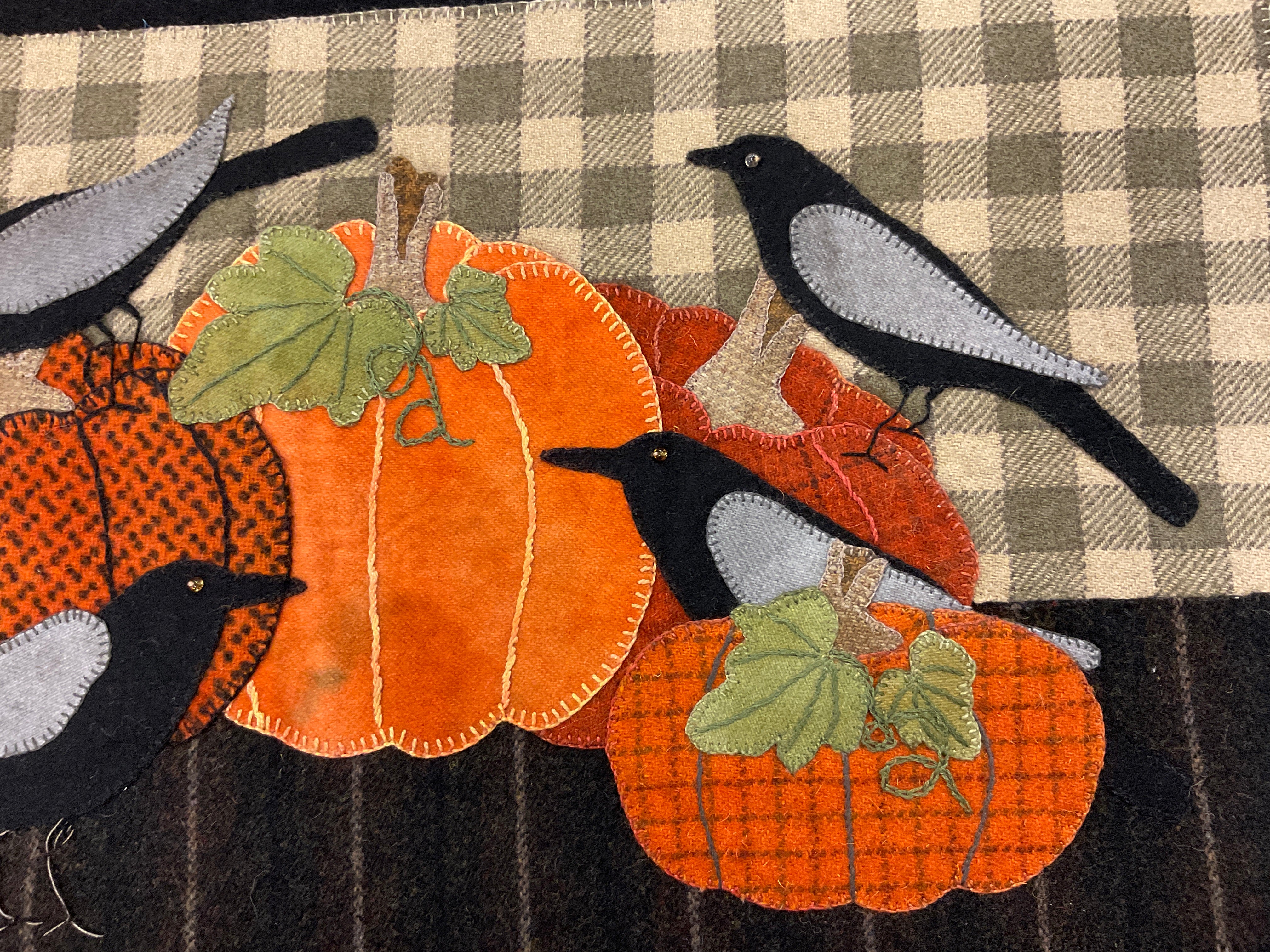 Crane Designs pattern "Crow-licious" is a great fall piece with country charm of big ole Pumpkins and a family of Crows. It was created with texture & hand dyed wools. Perfect of the advance to the beginner stitcher with large pieces and embellished with easy embroidery stitchen.
