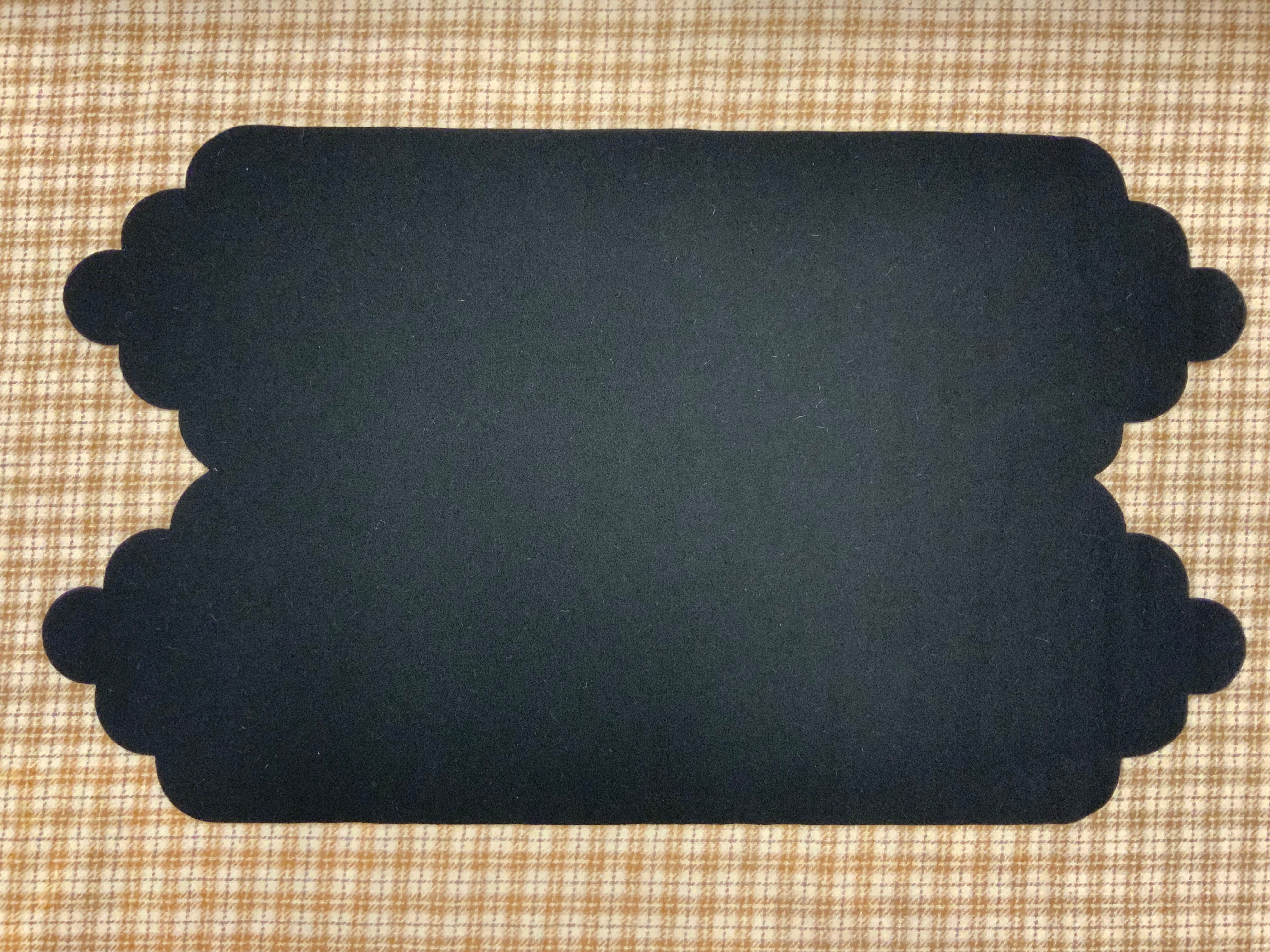 We are now offering our pre cut scalloped bases in your choice of shapes. This is for our Standard black appliqué round scalloped, round and square scalloped and they are 15x25 inches. Black wool with scalloped ends.