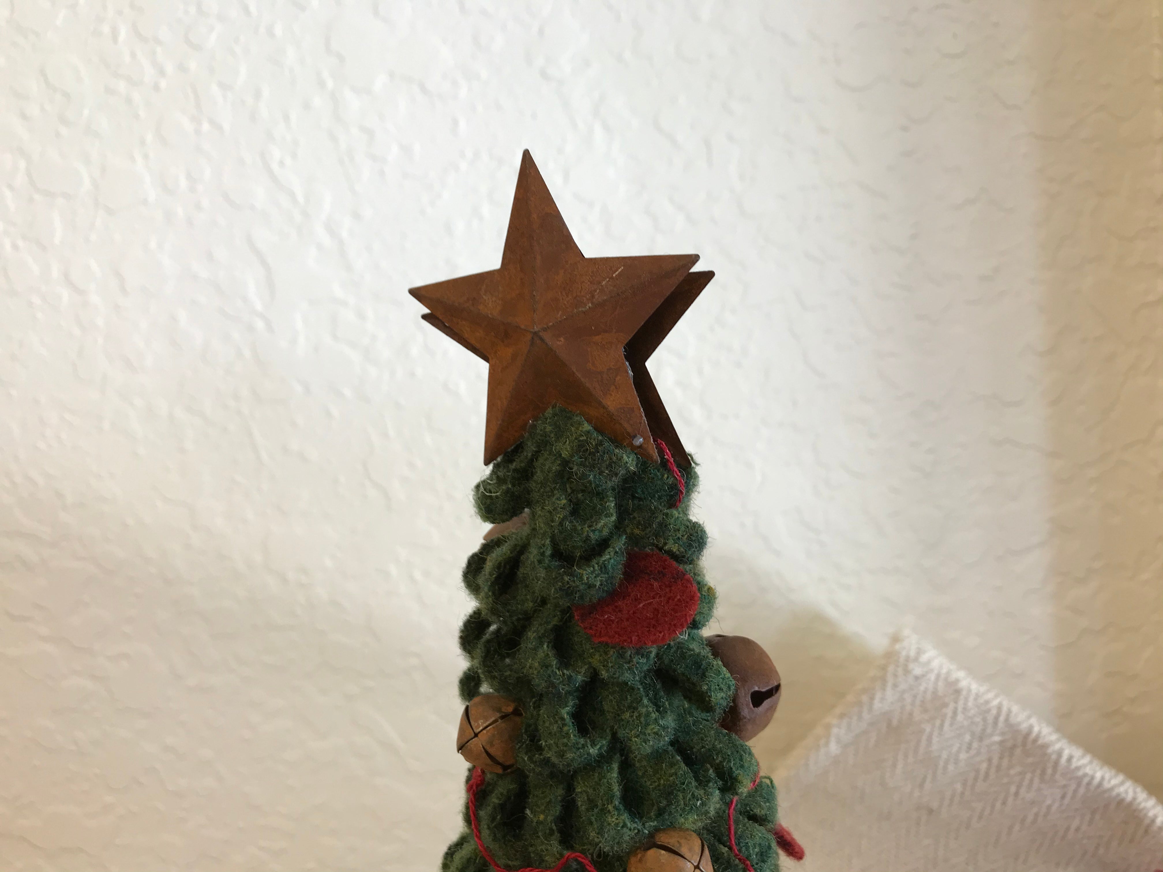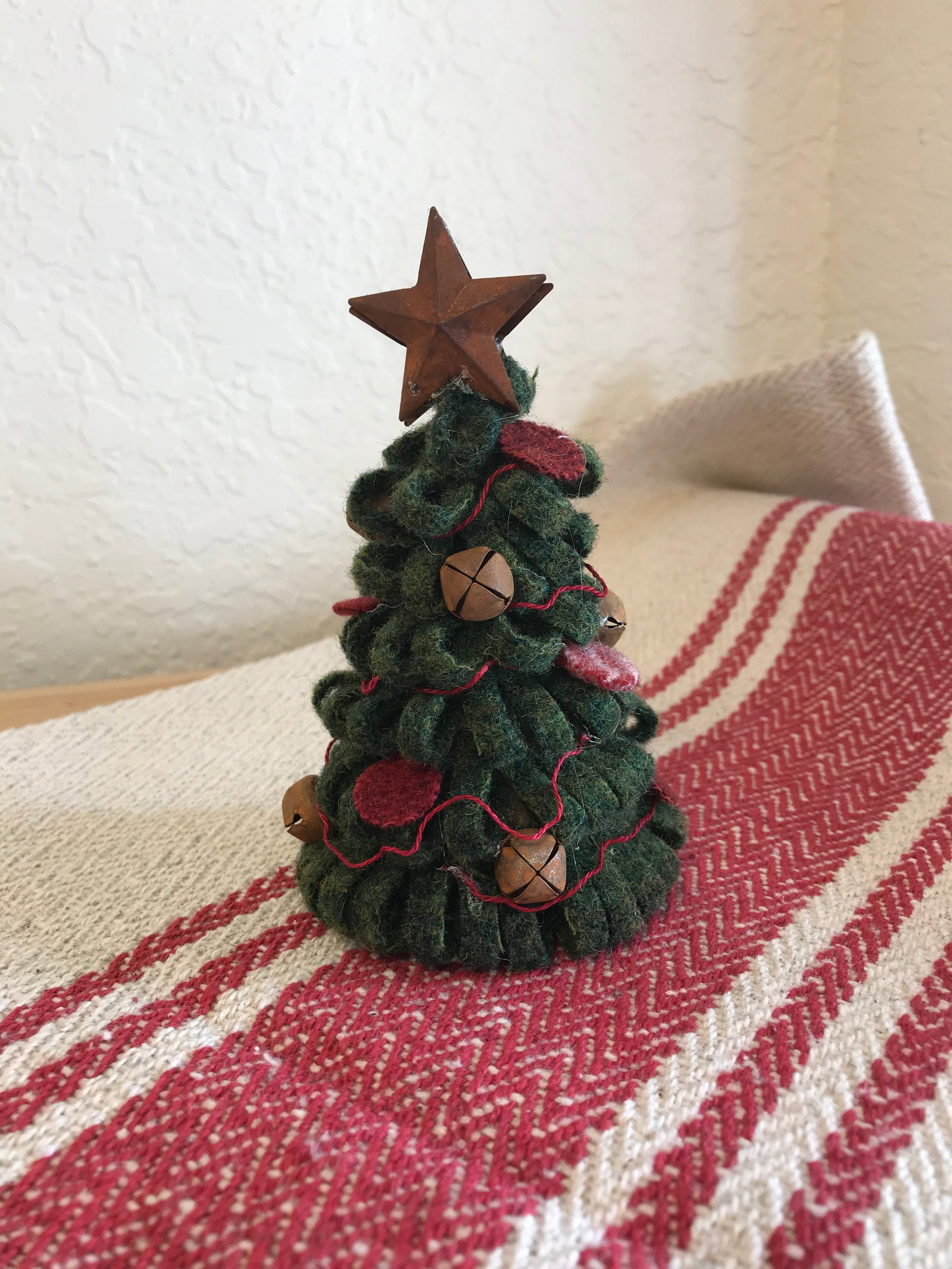 Our most popular trees are our simple cone trees, no cutting wool, no snipping wool feathers, twisting on to wires, no cutting or measuring wires, no tape to wrap or branches to bend and no tree stand needed! It’s cute, primitive, easy to do and will add holiday cheer to any display. Your kit includes all your pre cut green wool, pre cut red pennies, red hand dyed yarn, tiny bells and med bells, rusty stars for the top and your cone. You will need a glue gun and a pair of scissors.
