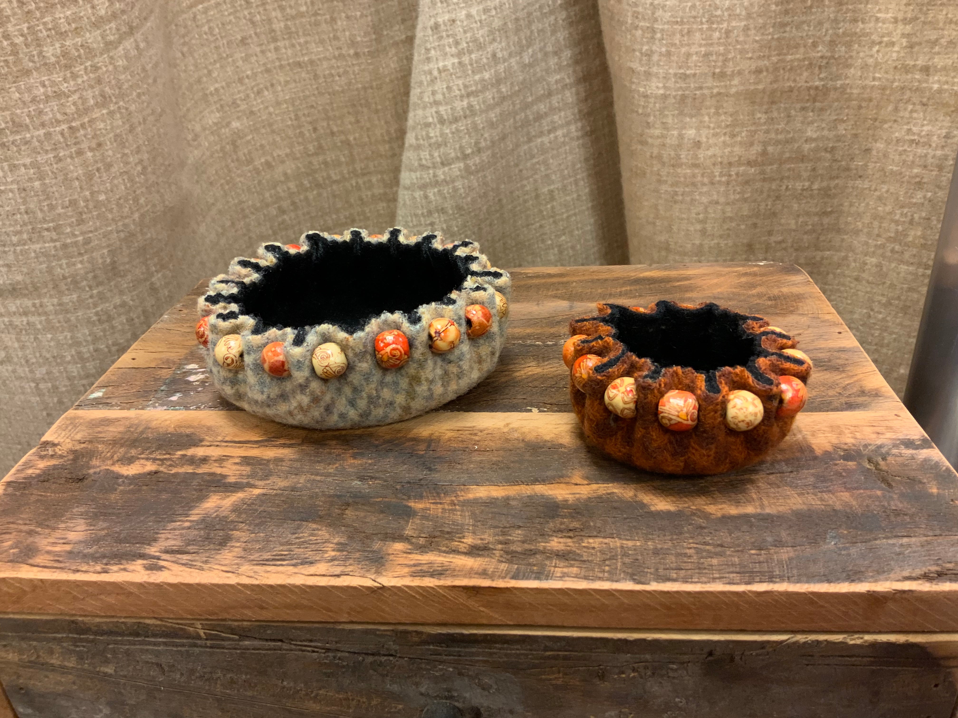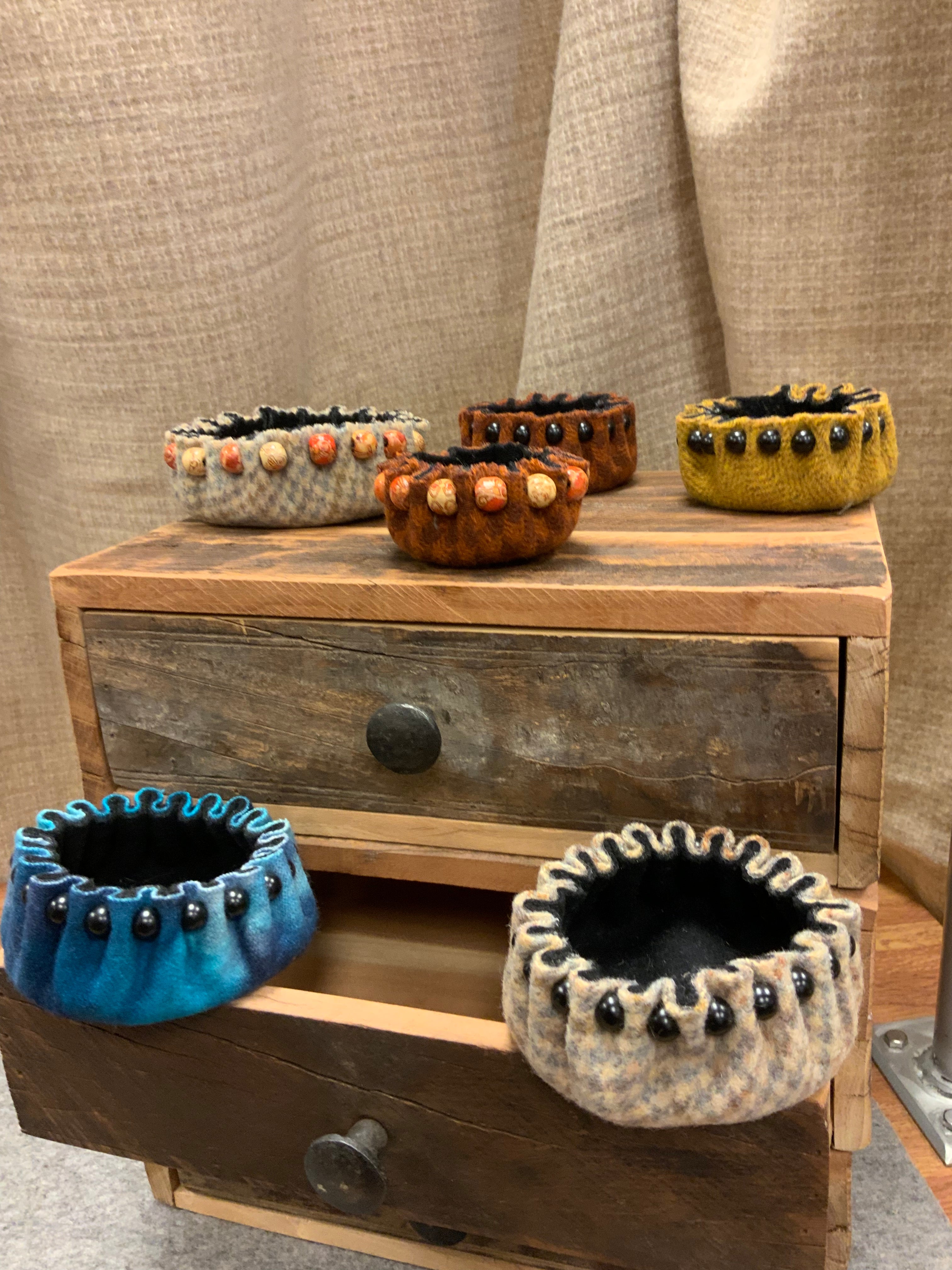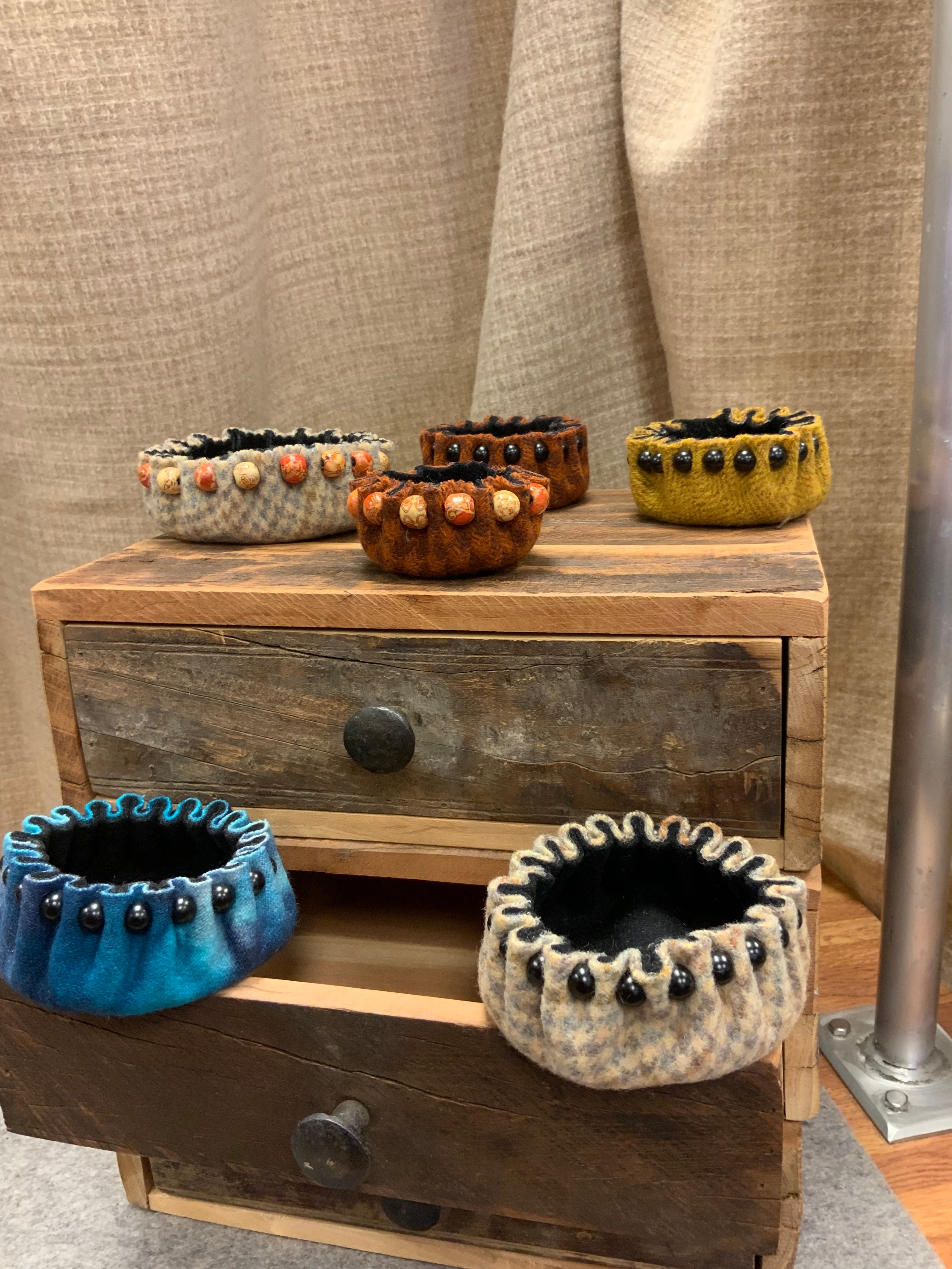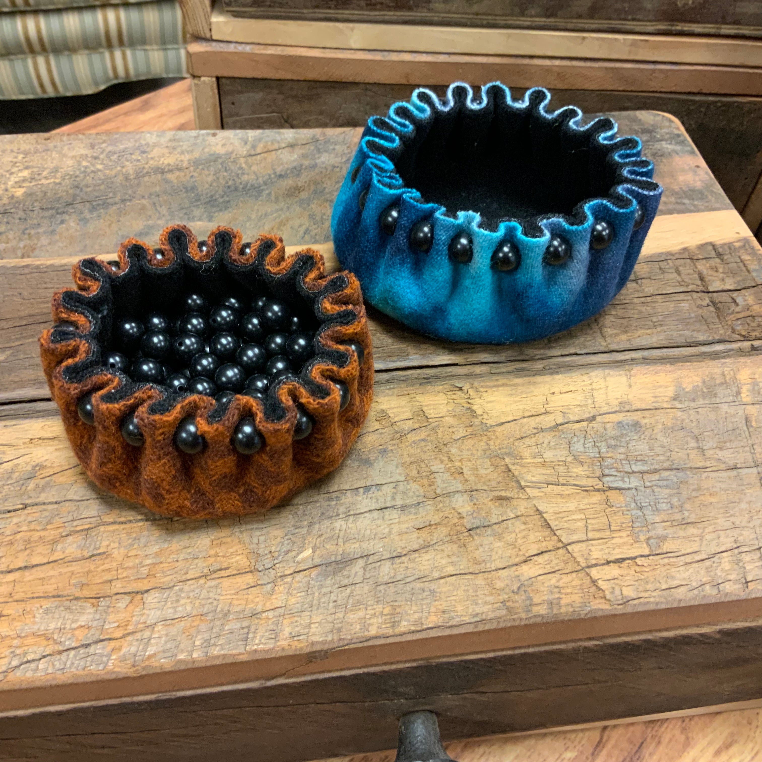 This cool little pot set is easy to whip up in an afternoon. I made mine for wool snippets and thread ends as I'm working, but now i have one at home to put my rings in and one of our knitters is making one for her row markers! What will you put in yours? The finished small pot measures 3.5X1.5 and the large pot measures 4 X2