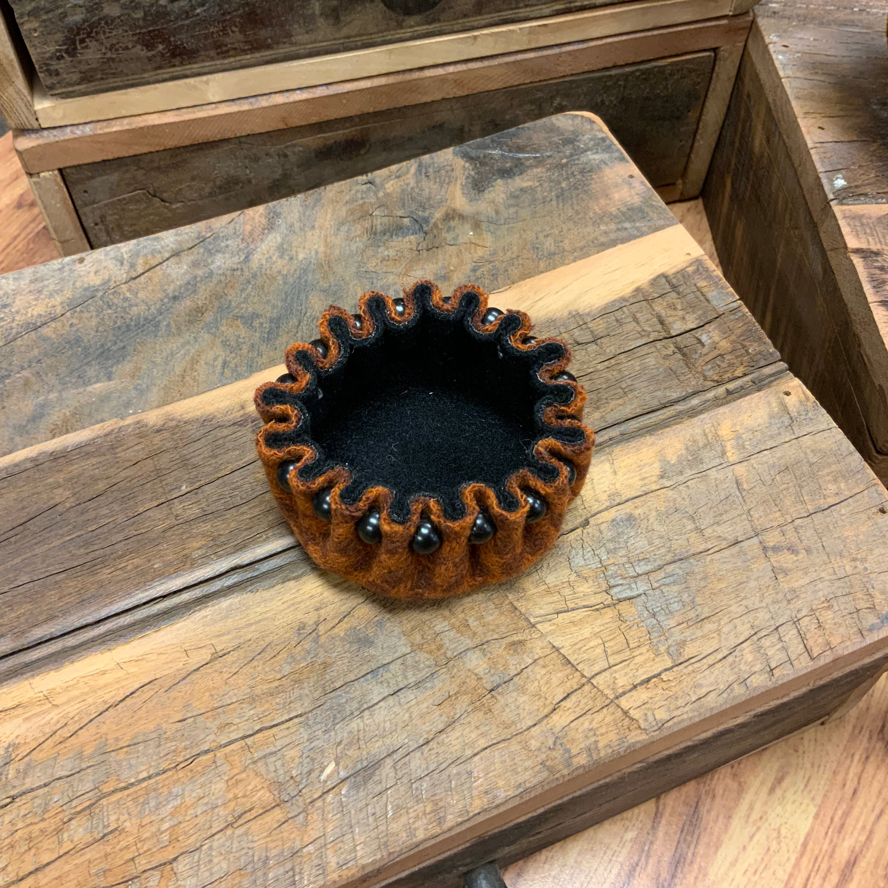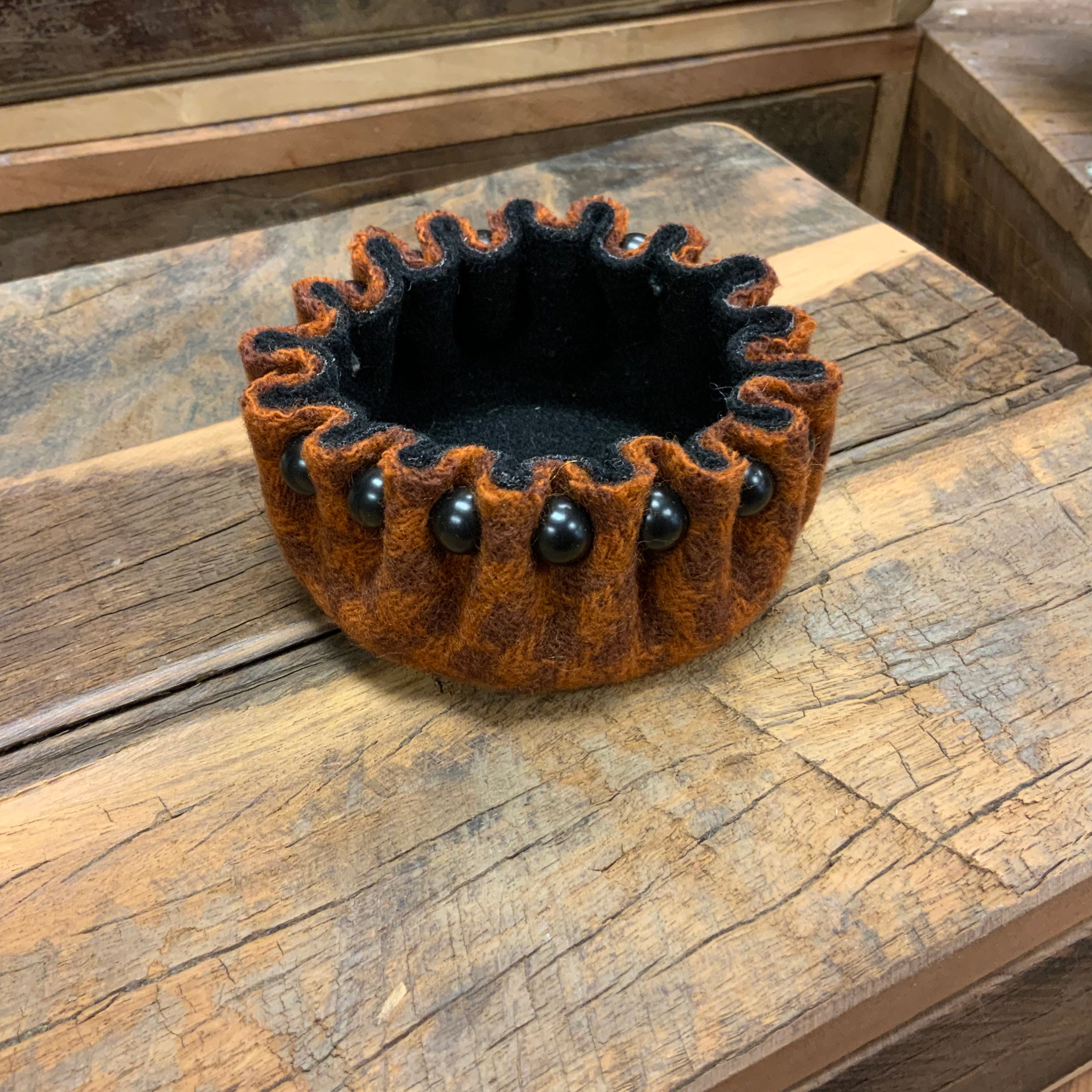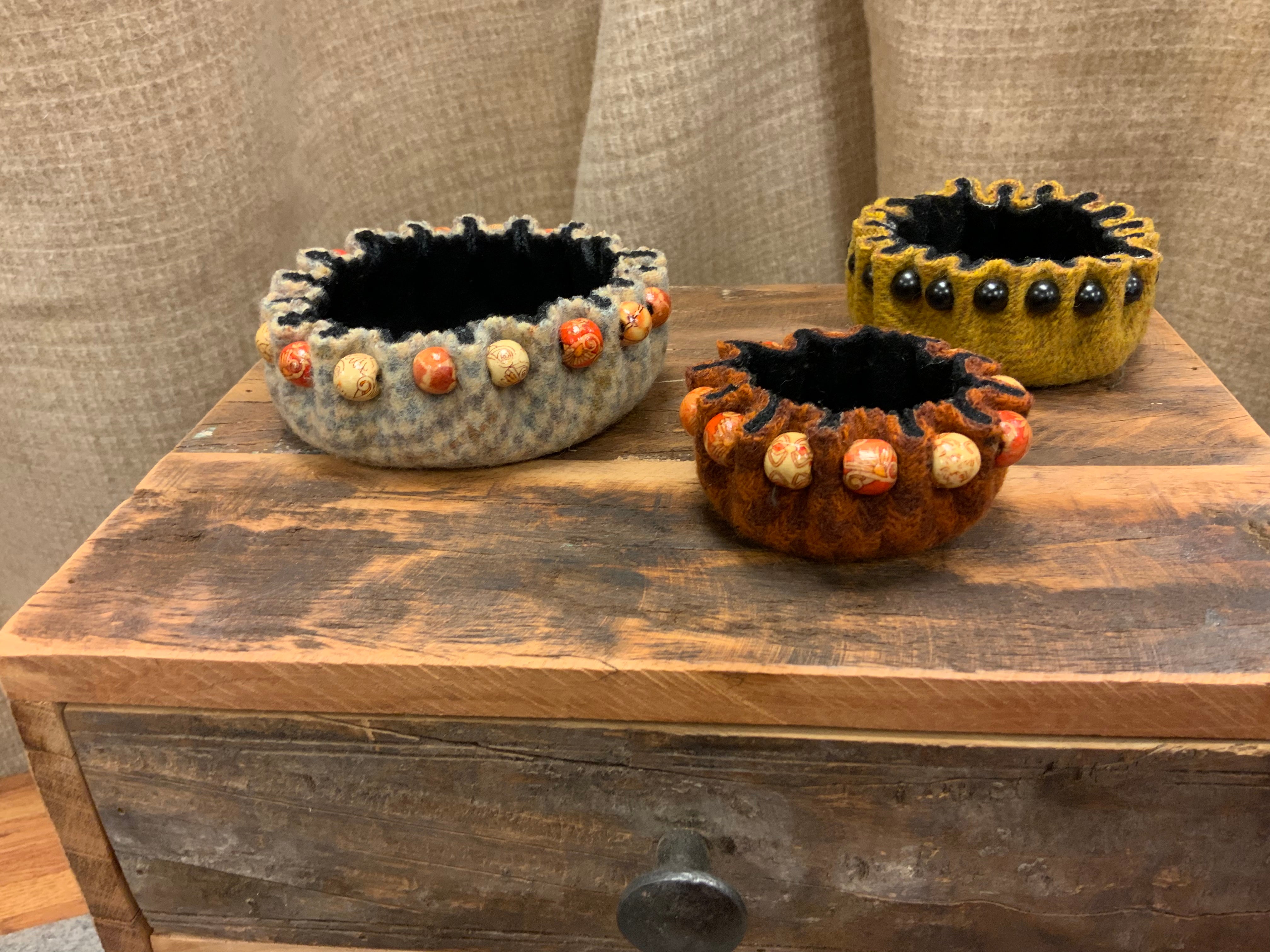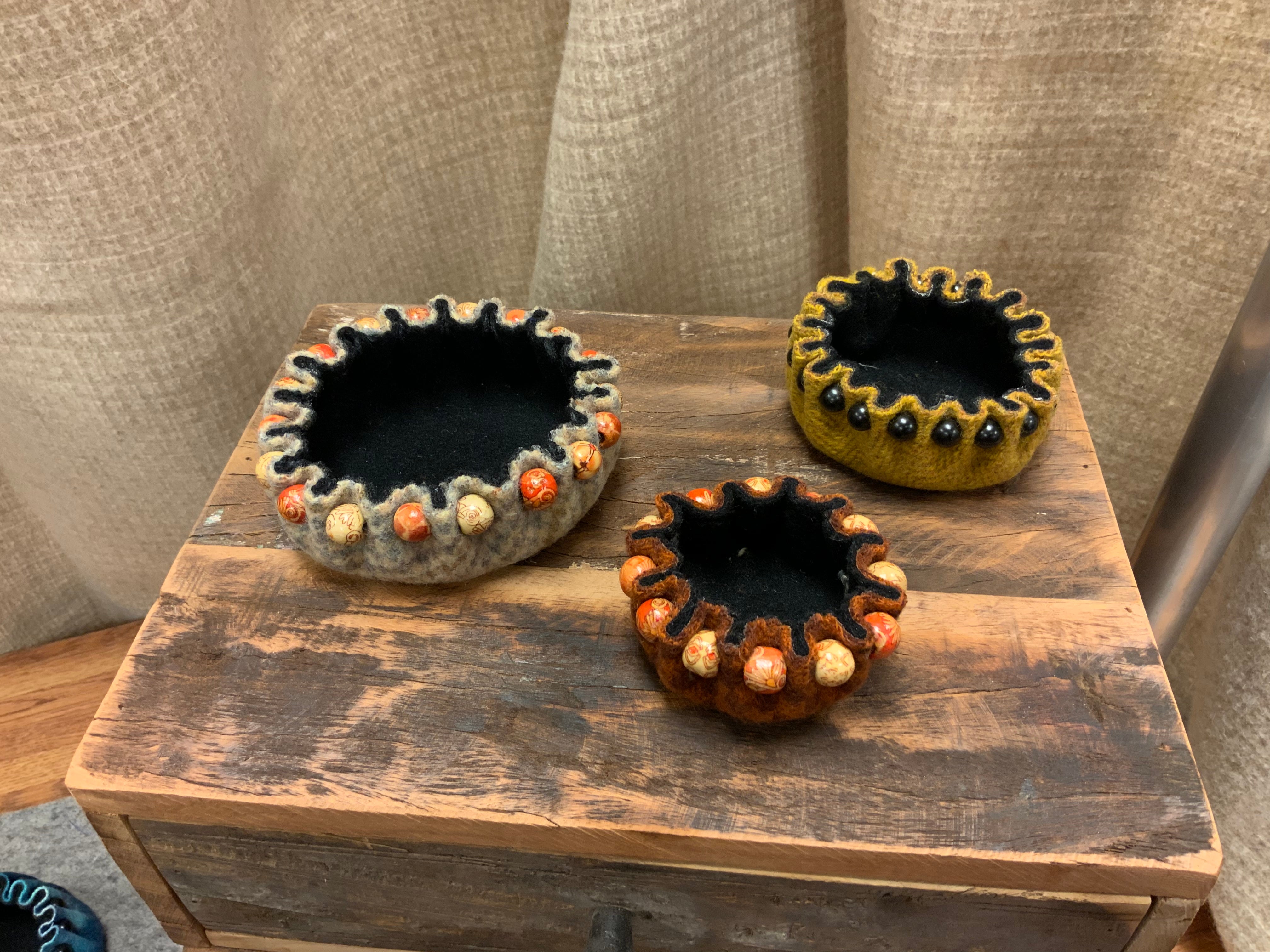 This cool little pot set is easy to whip up in an afternoon. I made mine for wool snippets and thread ends as I'm working, but now i have one at home to put my rings in and one of our knitters is making one for her row markers! What will you put in yours? The finished small pot measures 3.5X1.5 and the large pot measures 4 X2