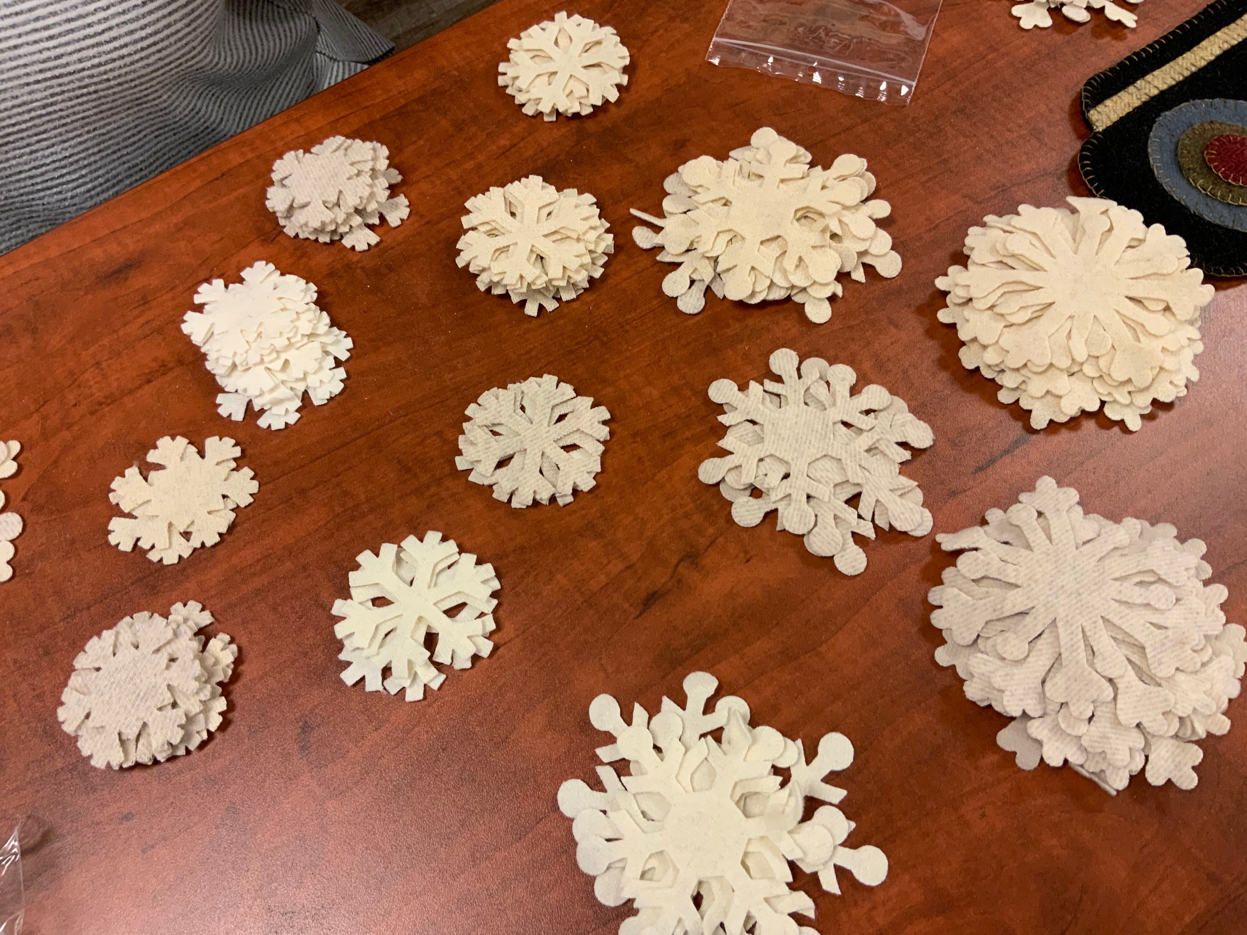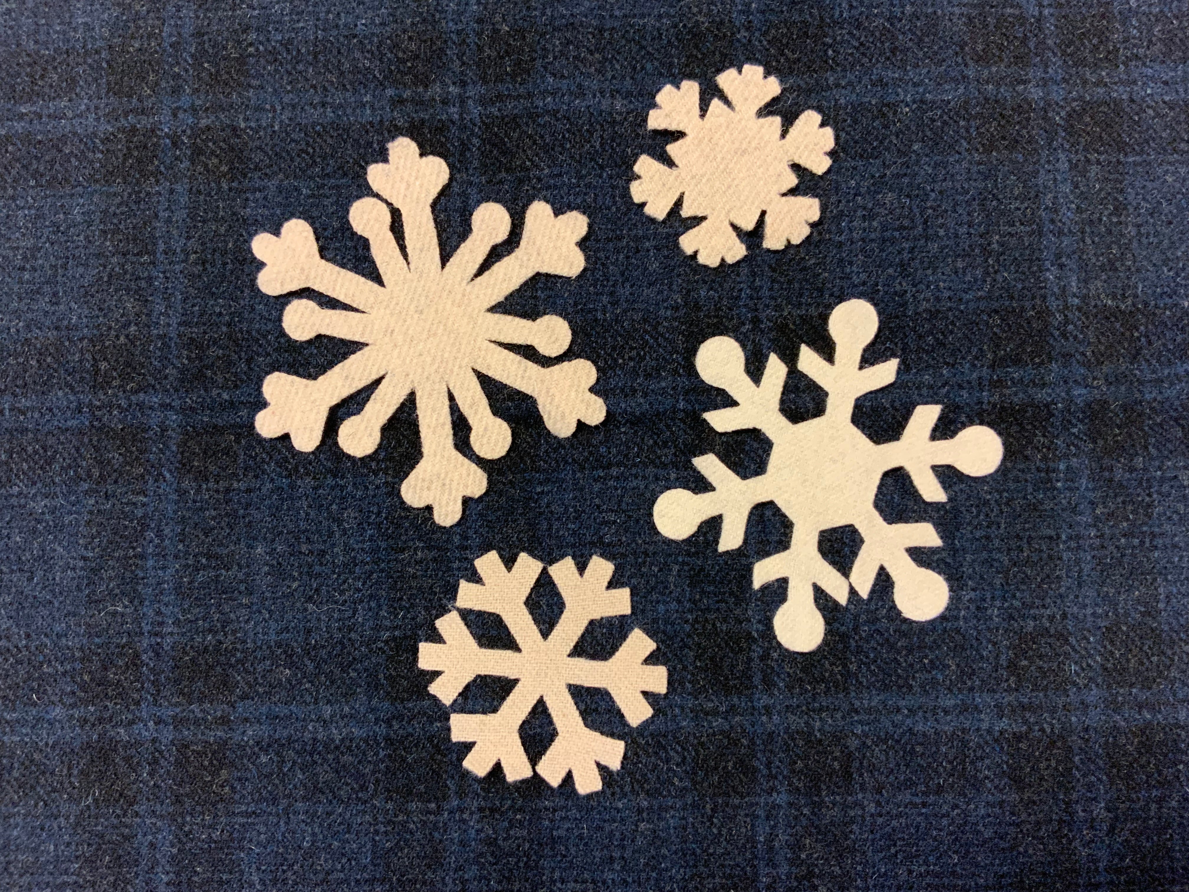 These pretty Flakes in assorted off whites and creams are worth every penny if you have ever spent time cutting them out! You will receive four snow flakes in assorted wools. Add to pillows for a fun winter accents, sweaters, coats, hats, Christmas stockings, runners anyplace you want a pretty wool snowflake!
