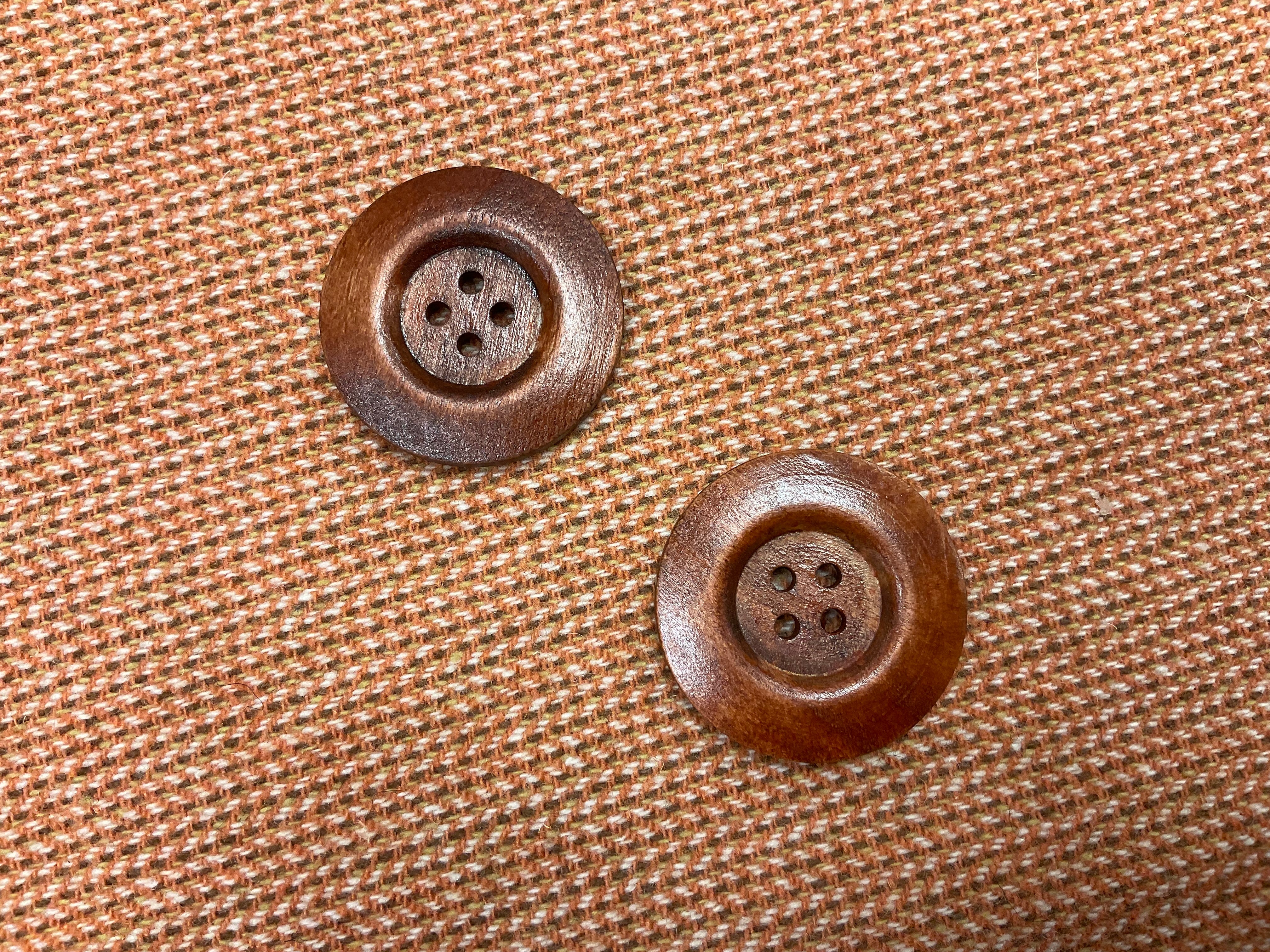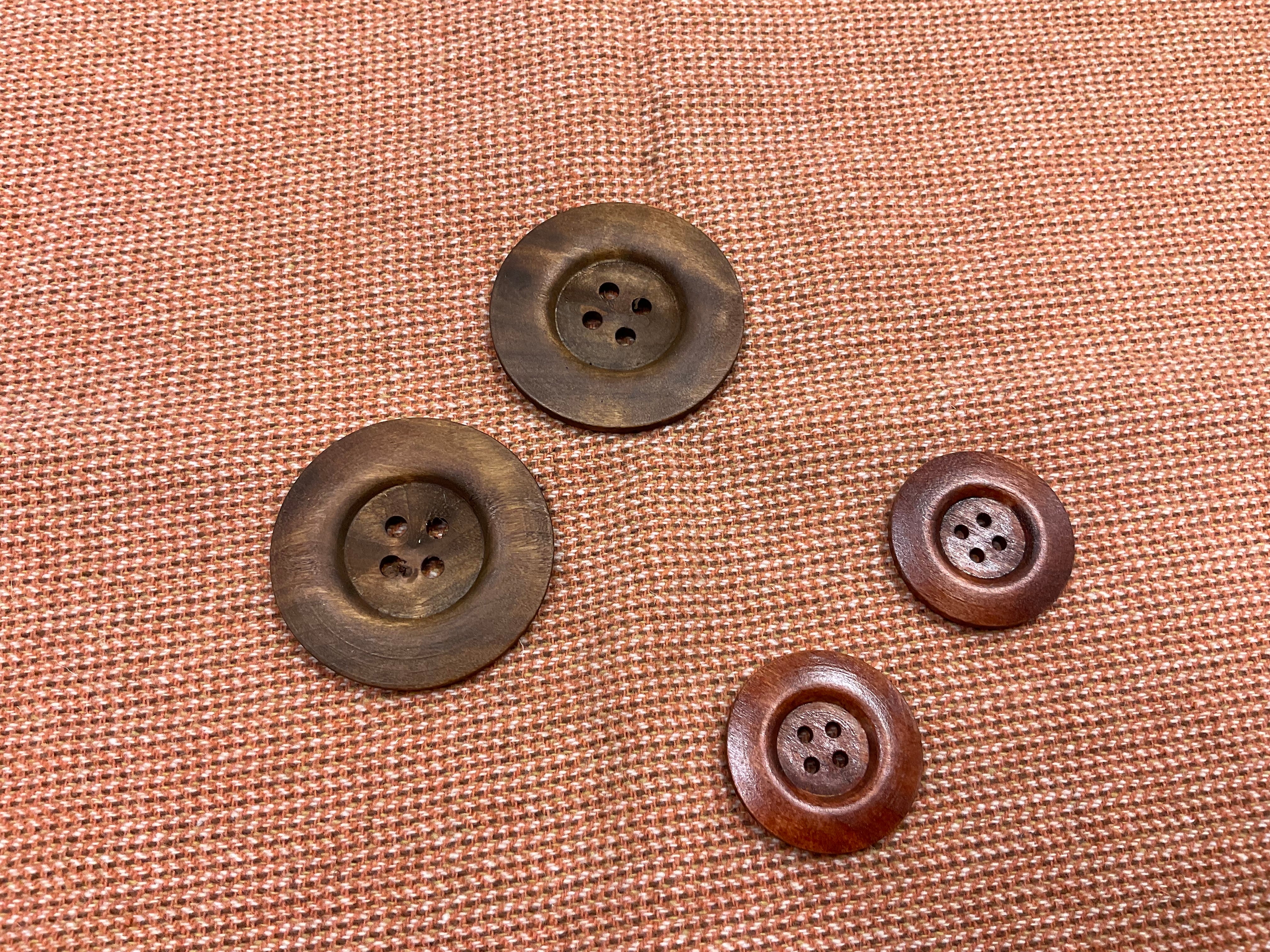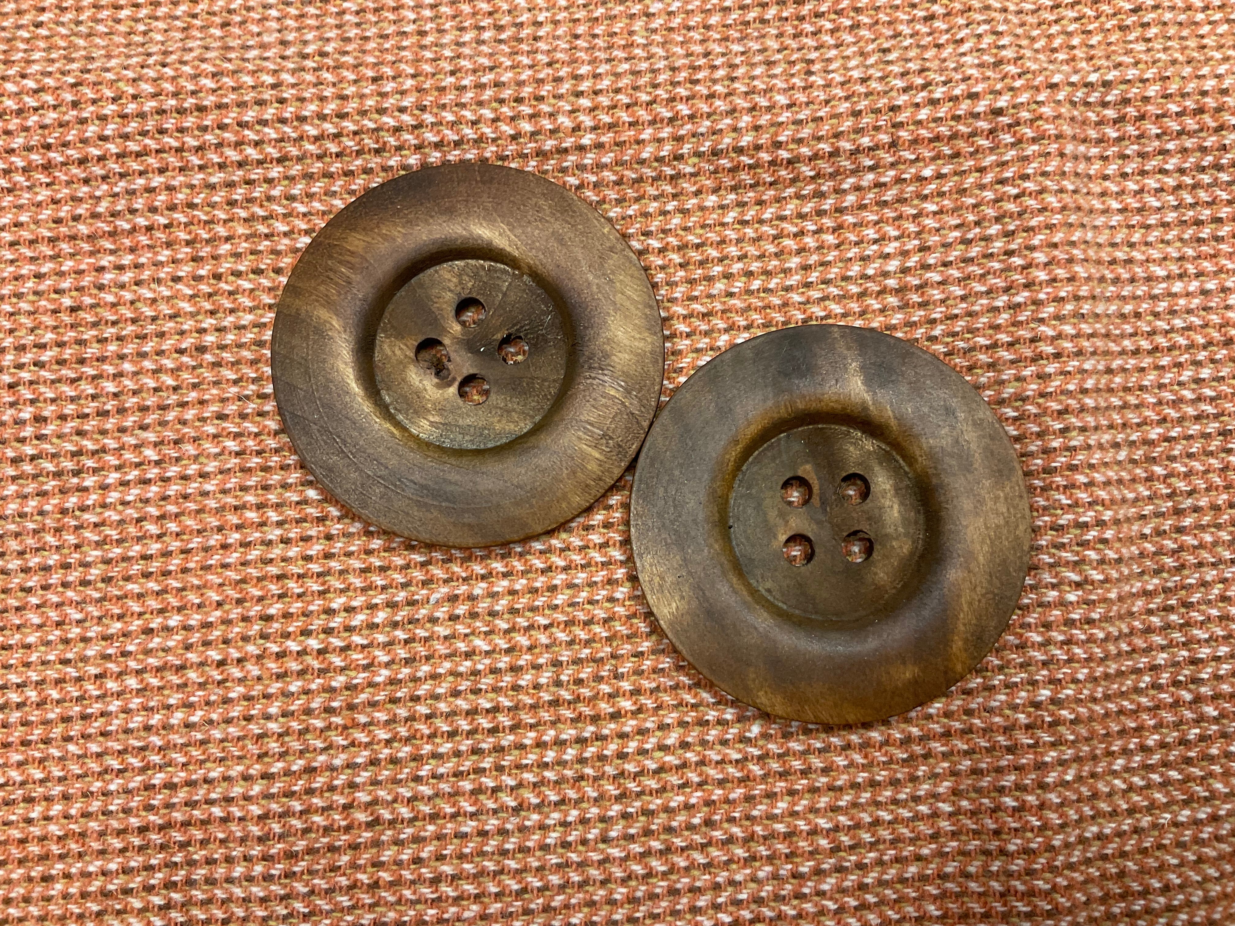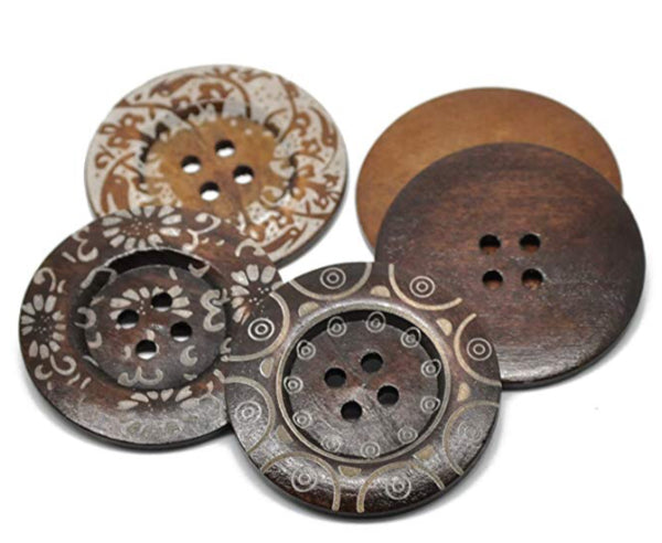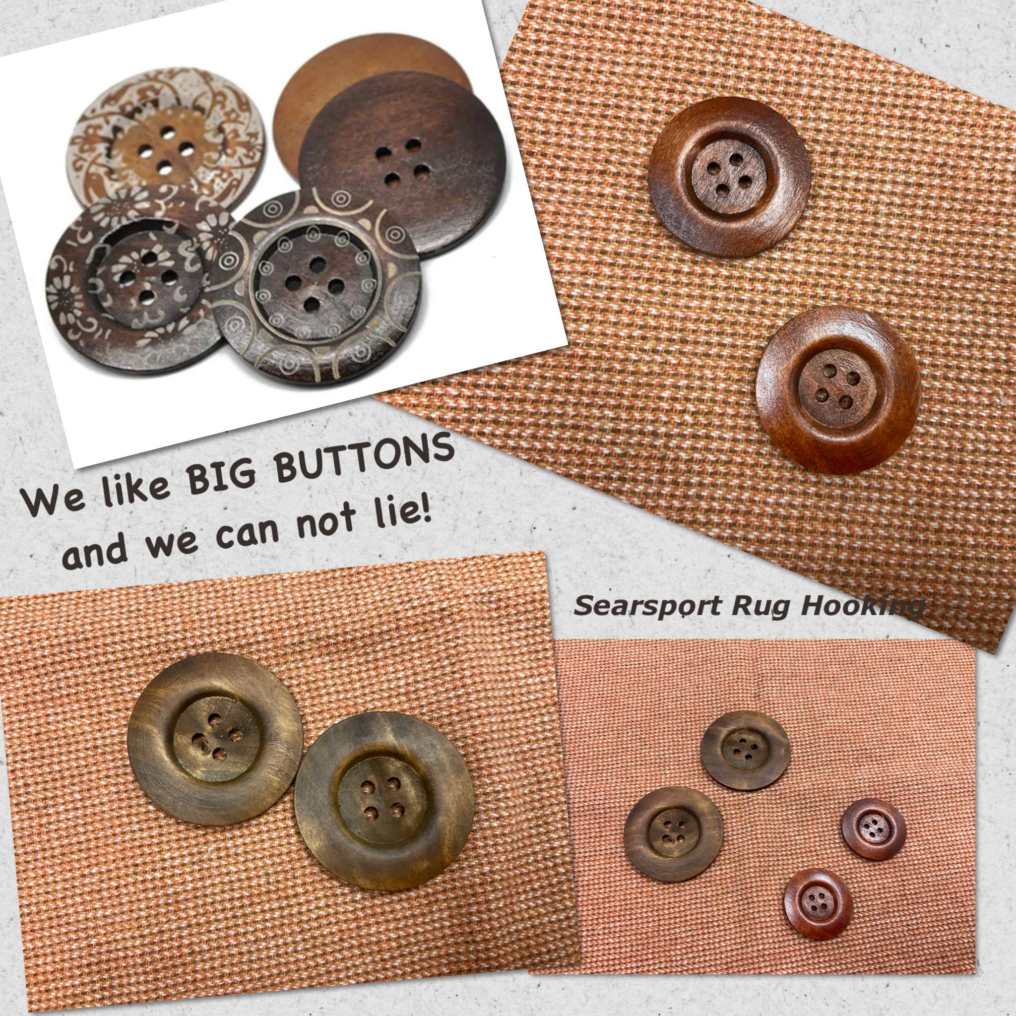 Very cool large wooden buttons. Light or dark finish. Approximately 2.5 inches across. We use these so many ways! The centers for hooked or punched flowers, bases on woven baskets, buttons on big slouchy wool bags.